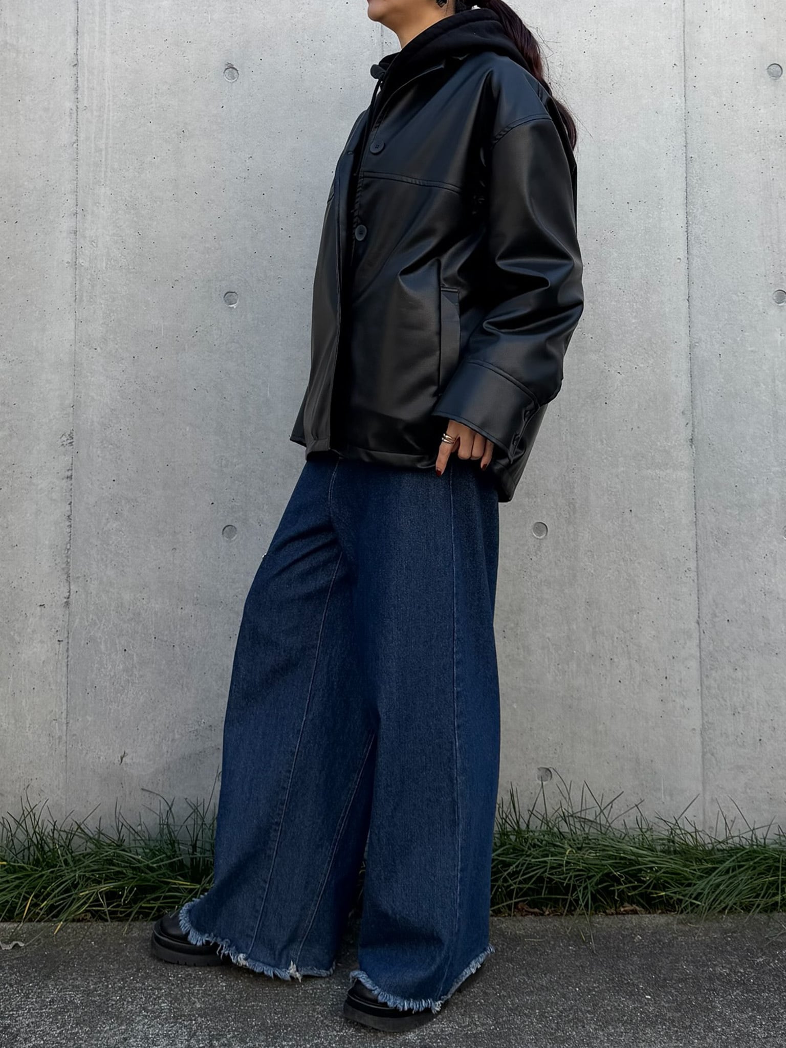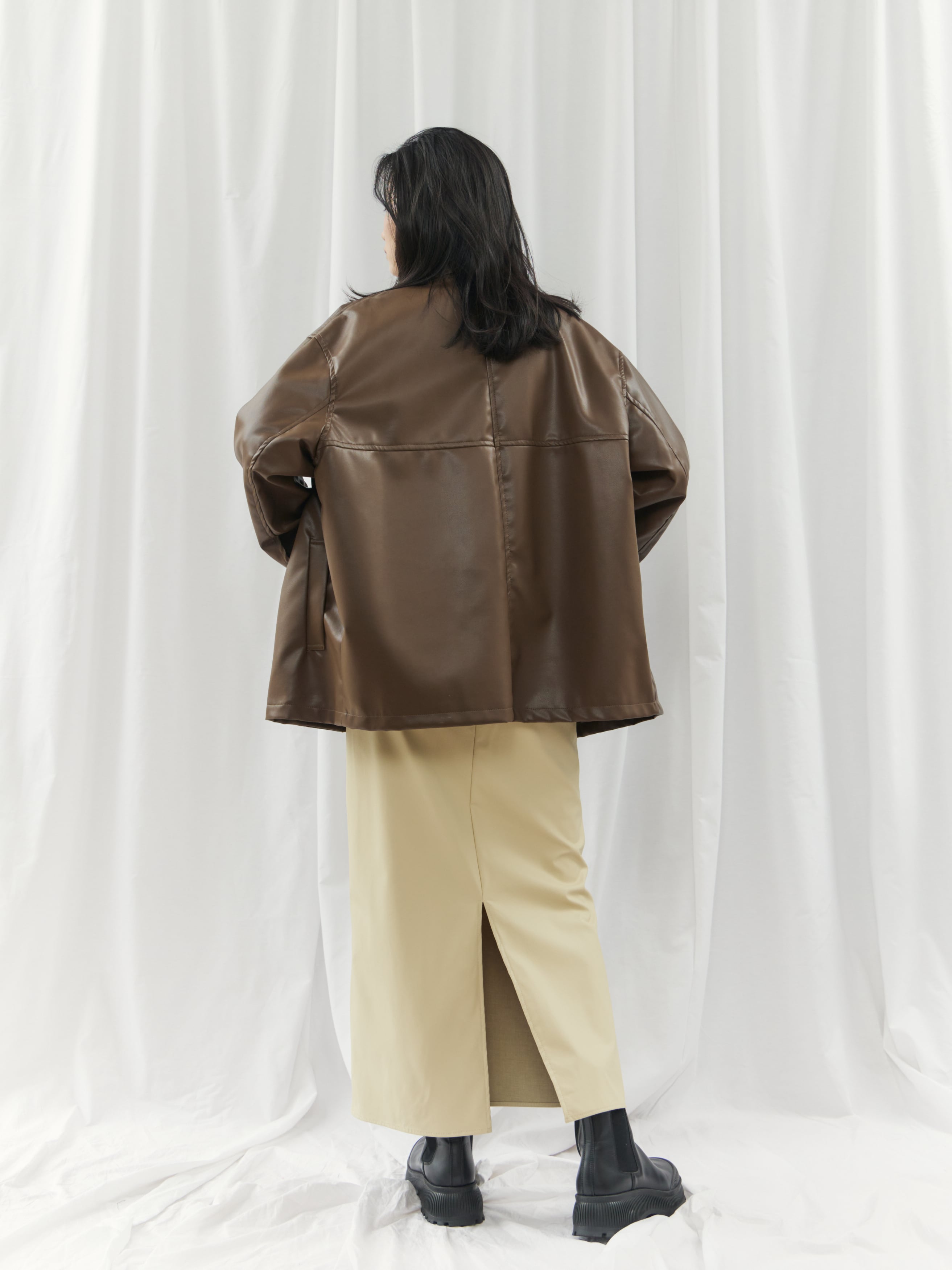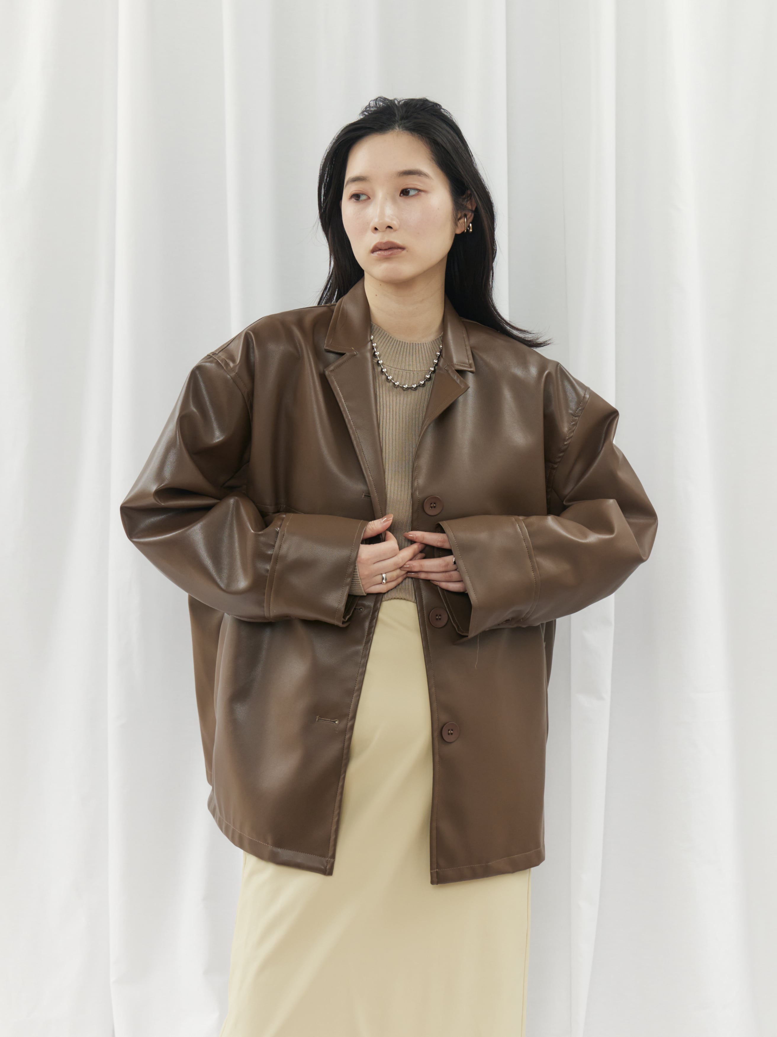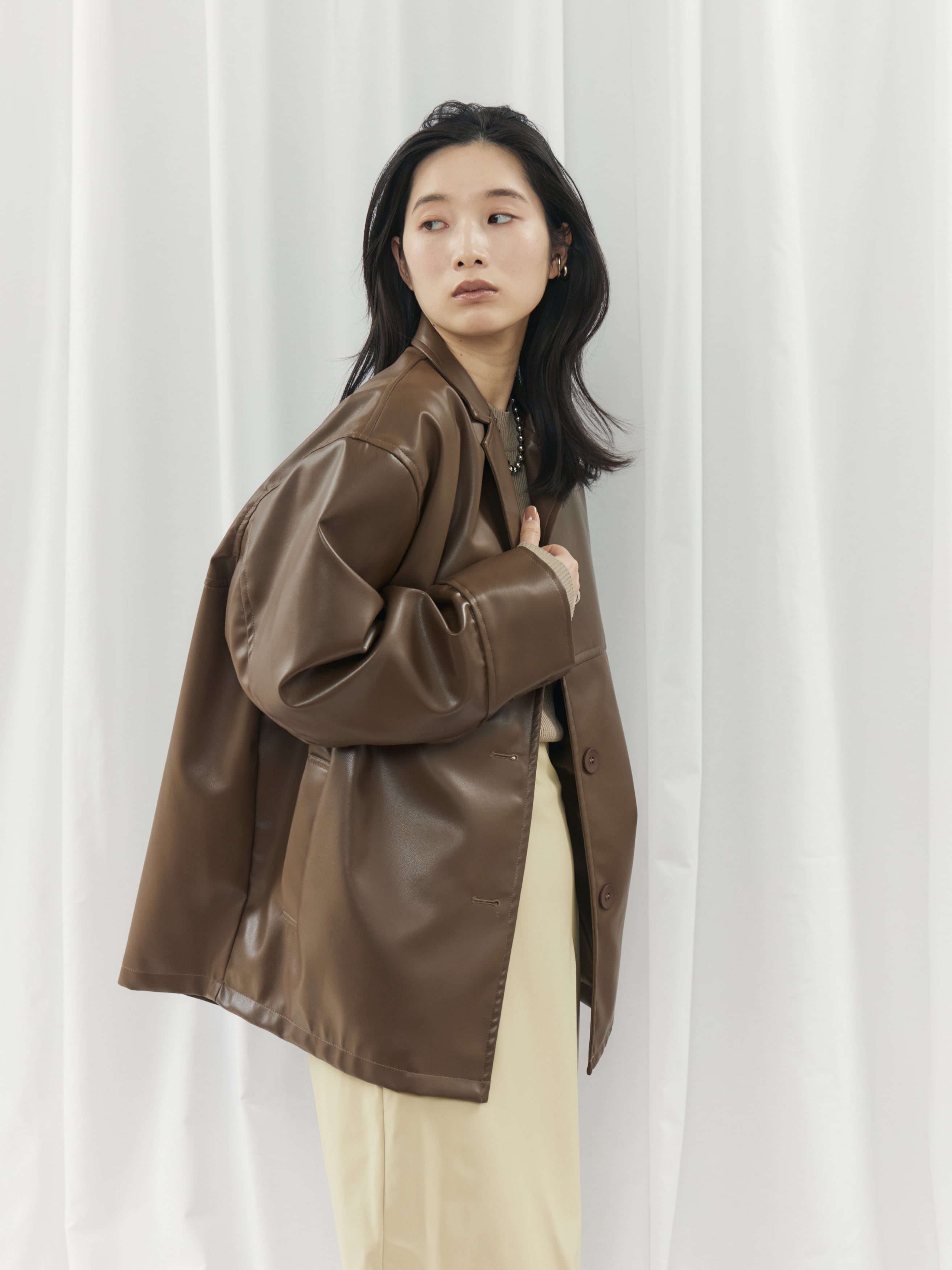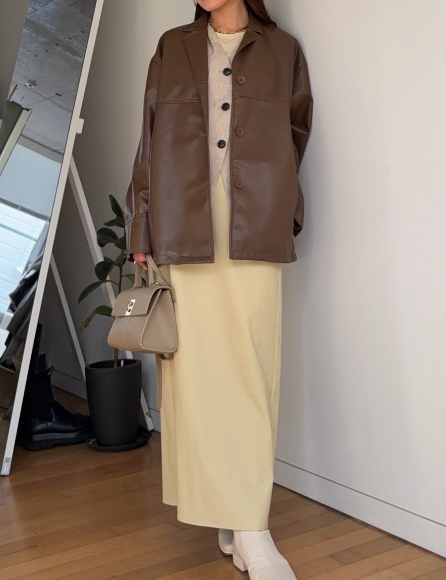 高級感のあるフェイクレザー素材を使用。柔らかくゆったりとしたシルエットで、軽やかな着心地を実現しました。シャツのようにコンパクトな襟デザインが、ジャケット特有の堅苦しさを抑え、デイリーに気軽に羽織れる一着です。