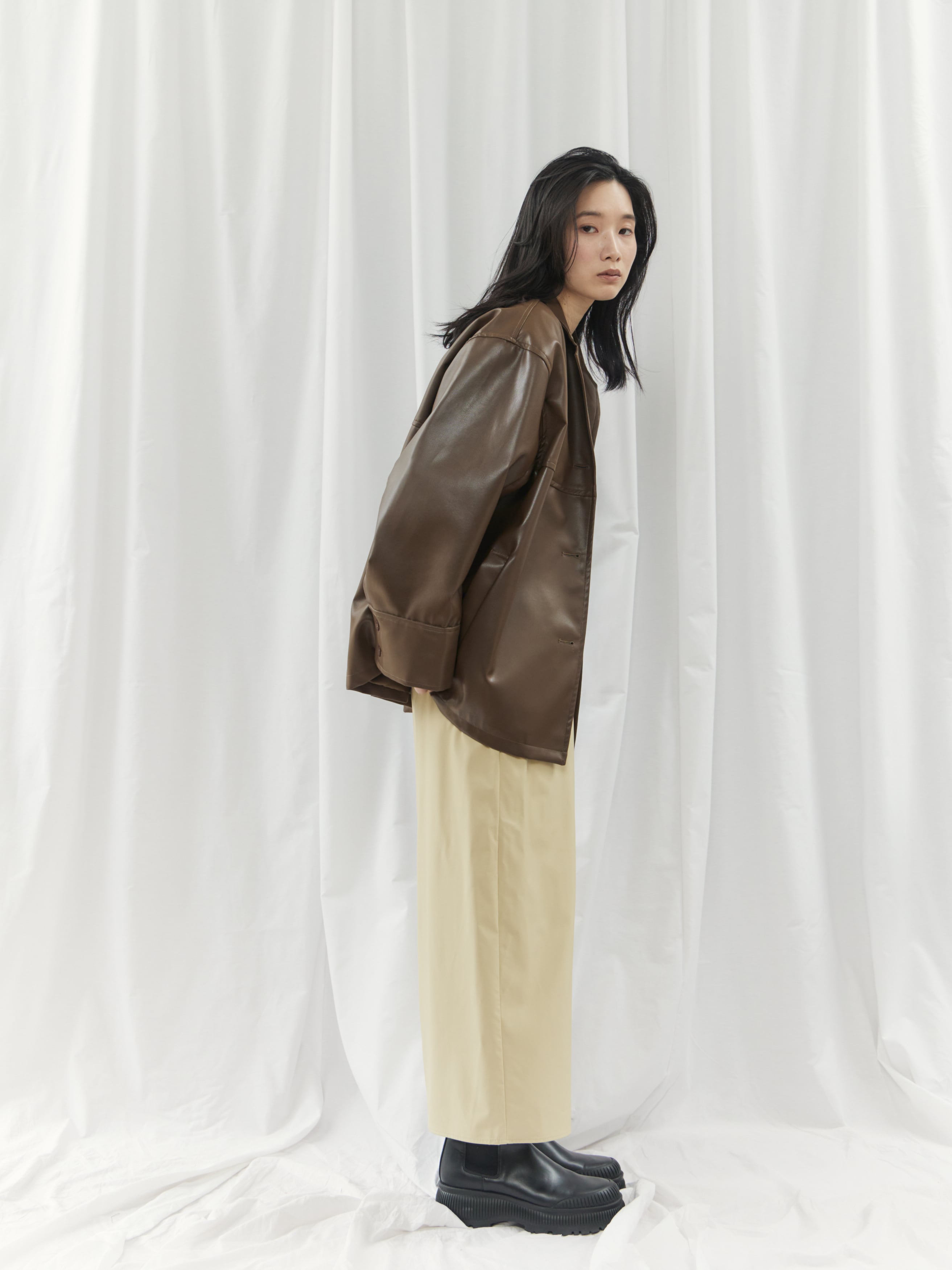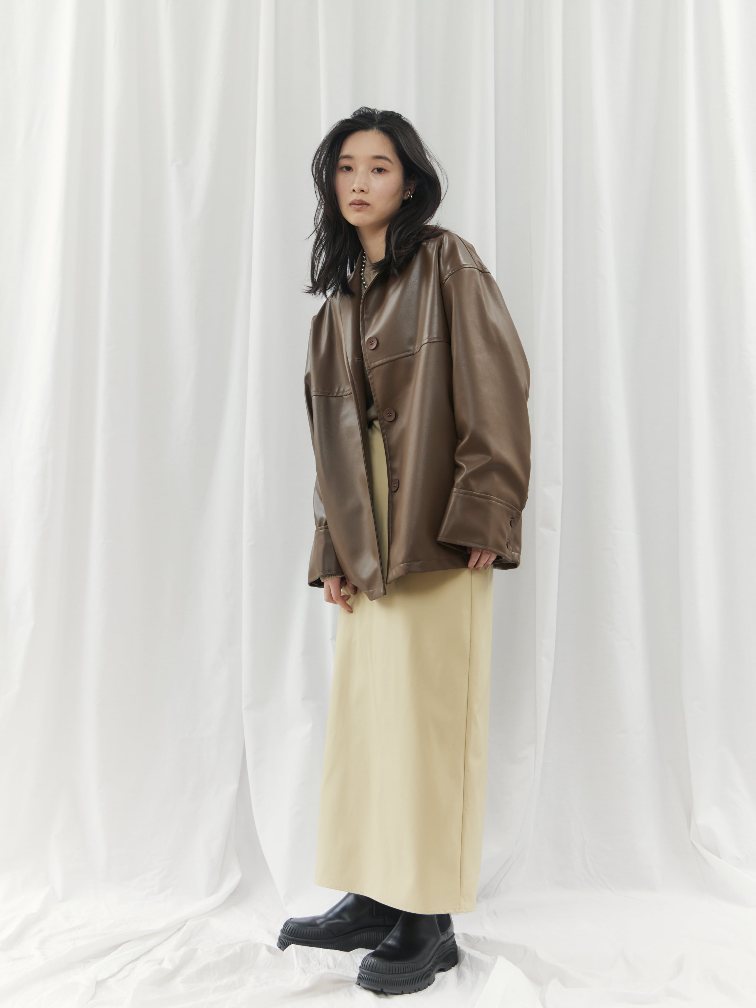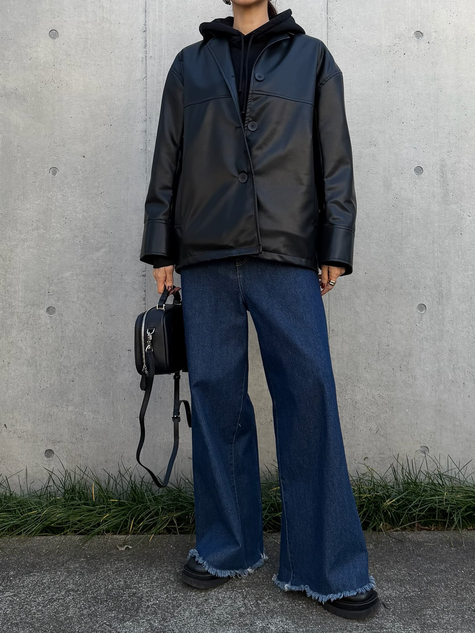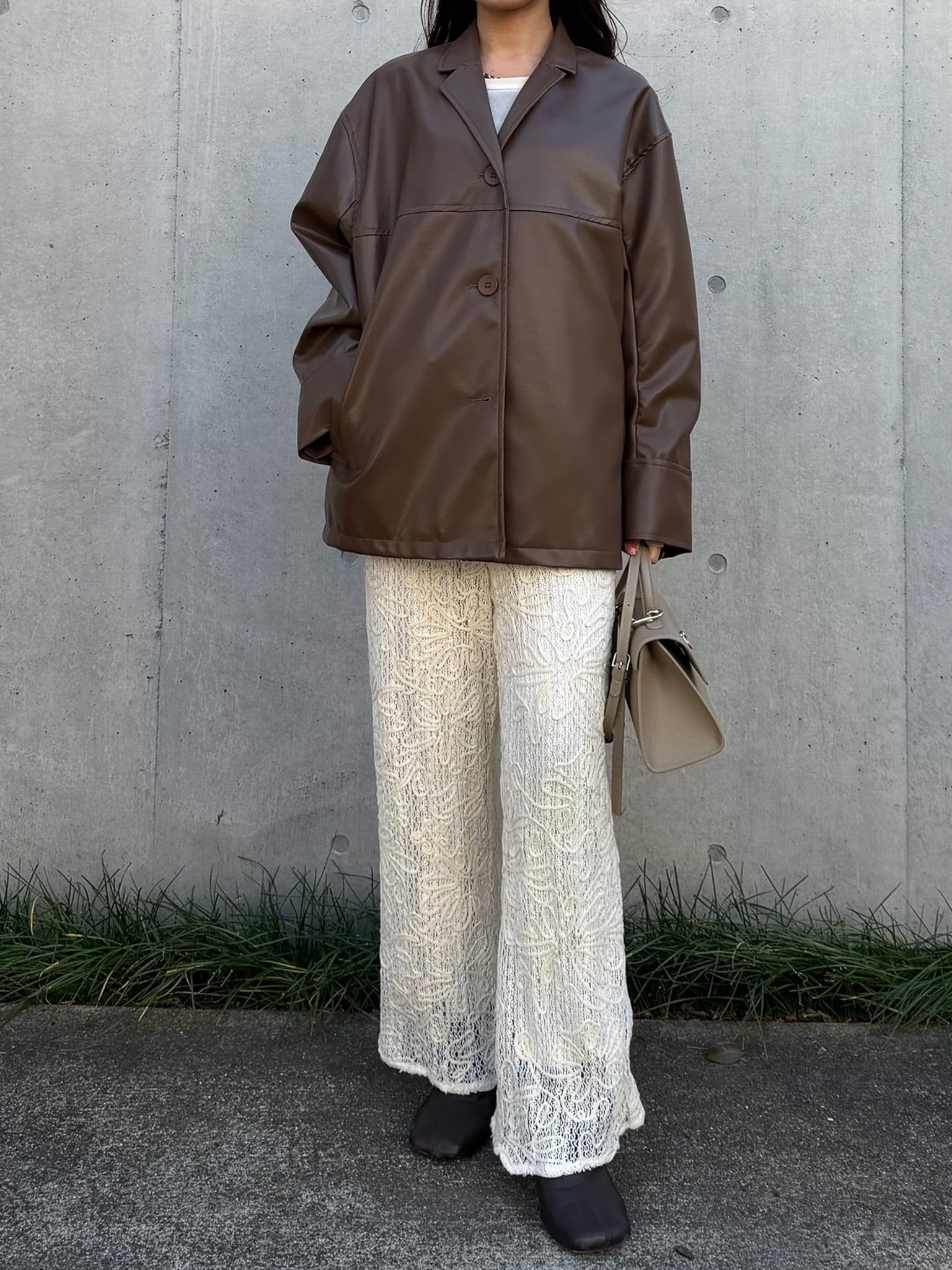 高級感のあるフェイクレザー素材を使用。柔らかくゆったりとしたシルエットで、軽やかな着心地を実現しました。シャツのようにコンパクトな襟デザインが、ジャケット特有の堅苦しさを抑え、デイリーに気軽に羽織れる一着です。