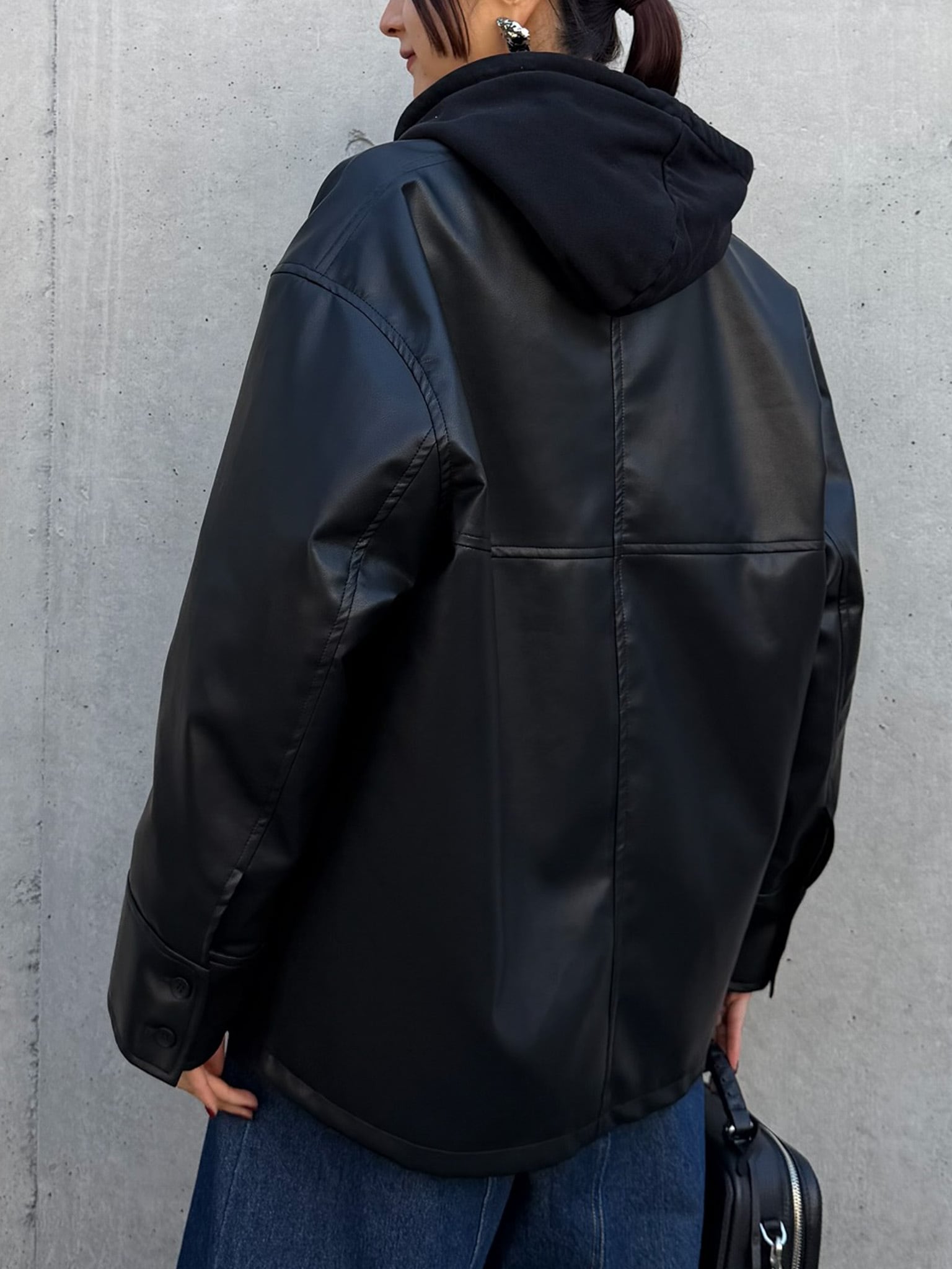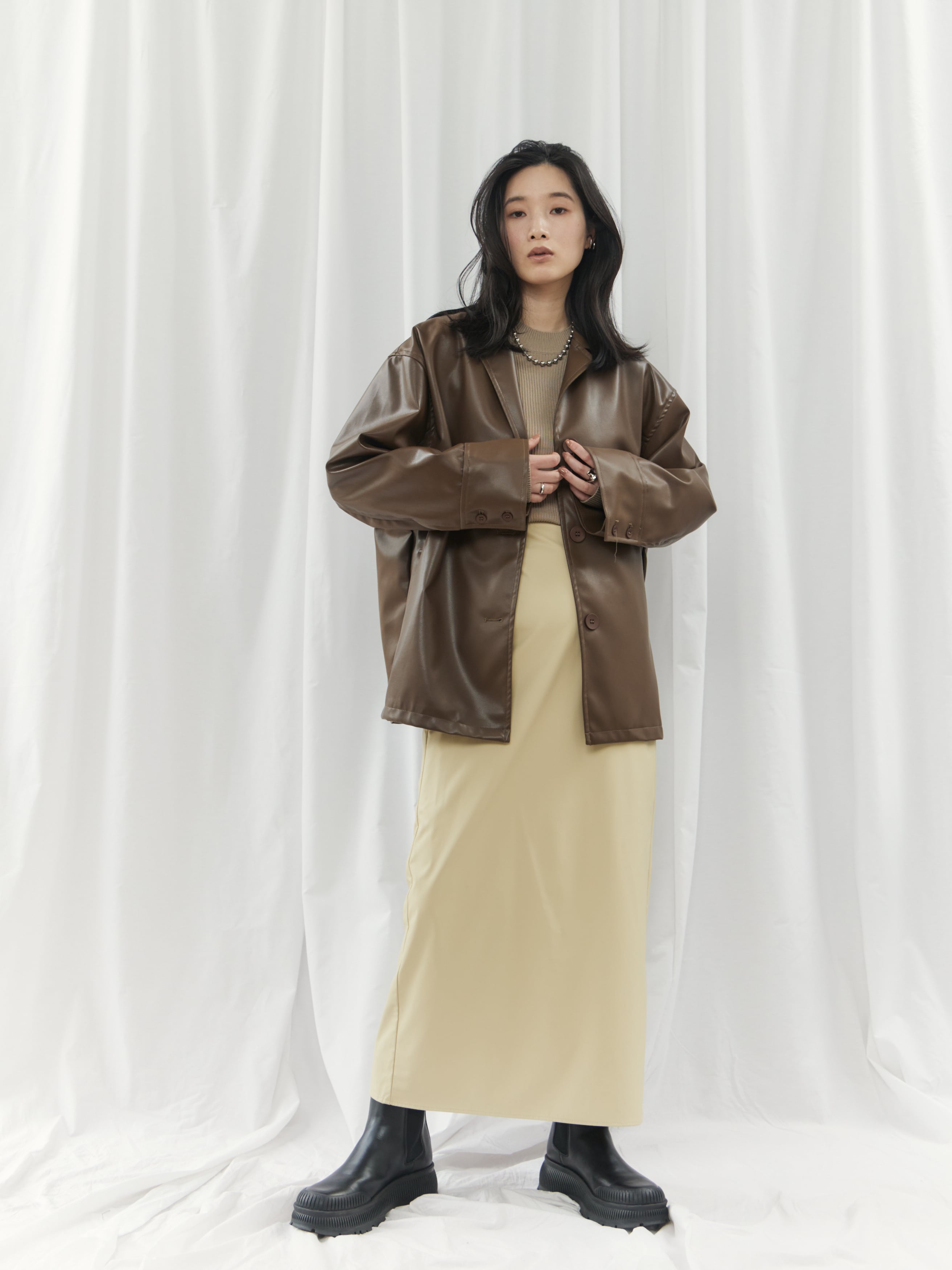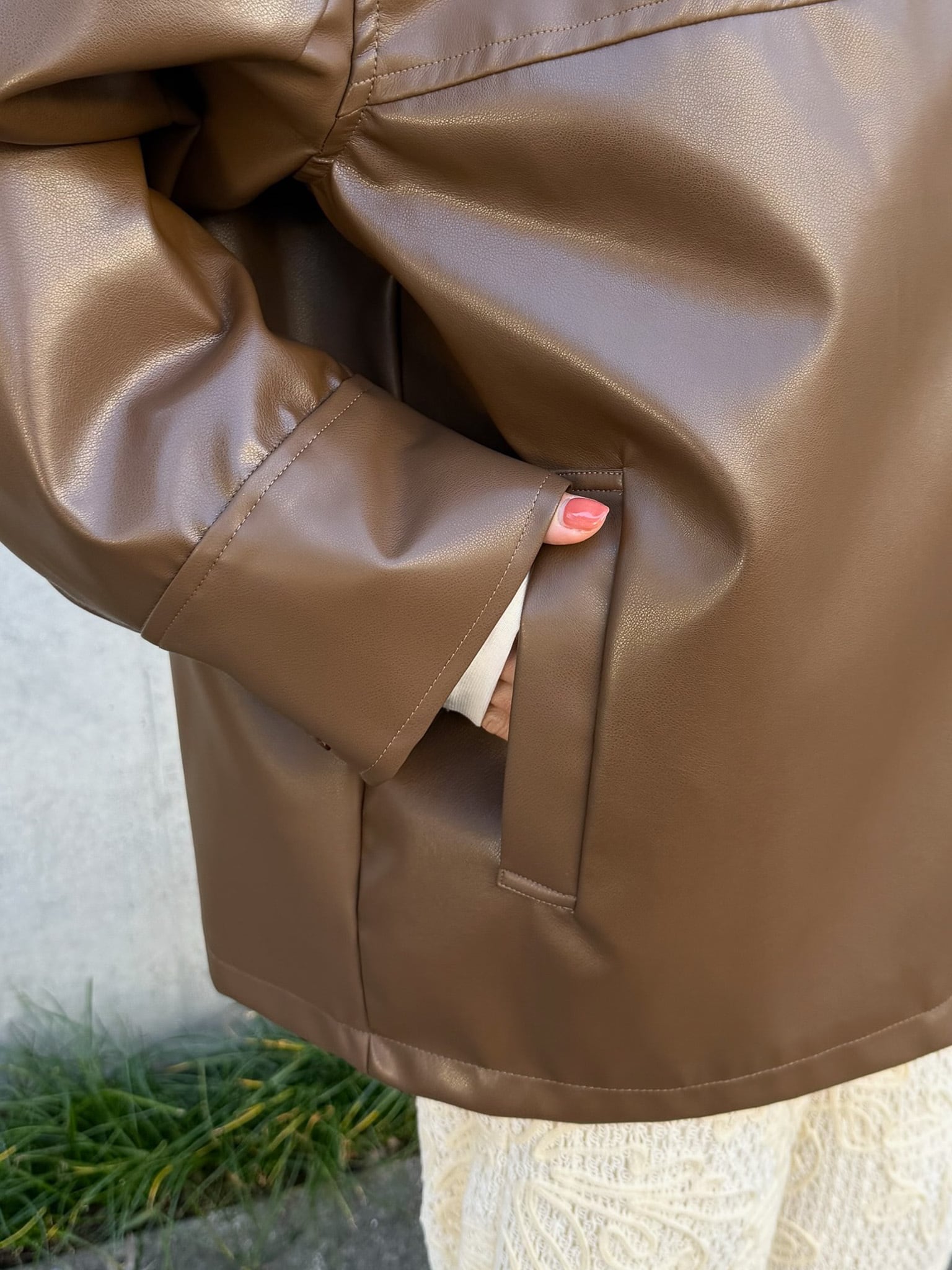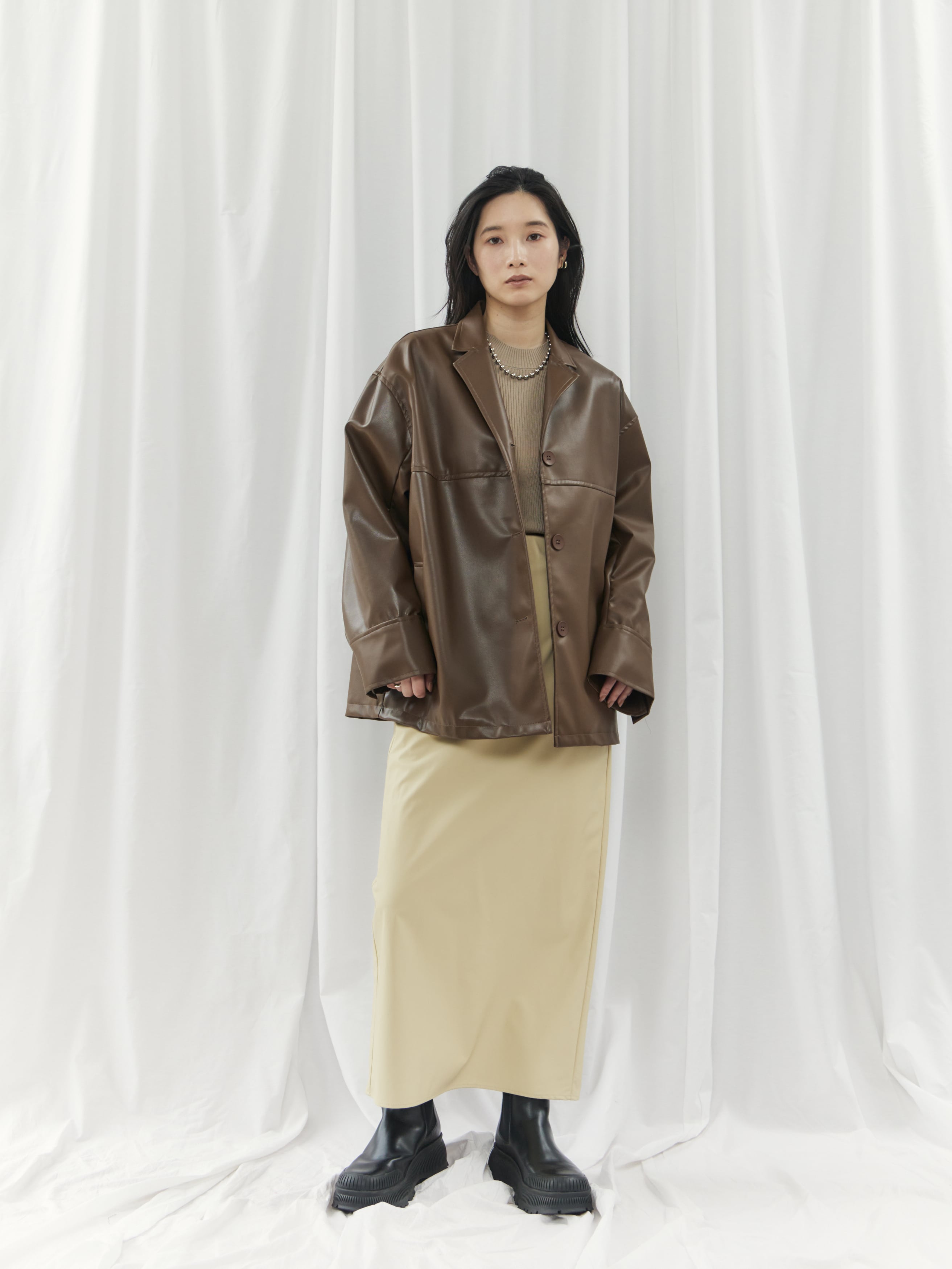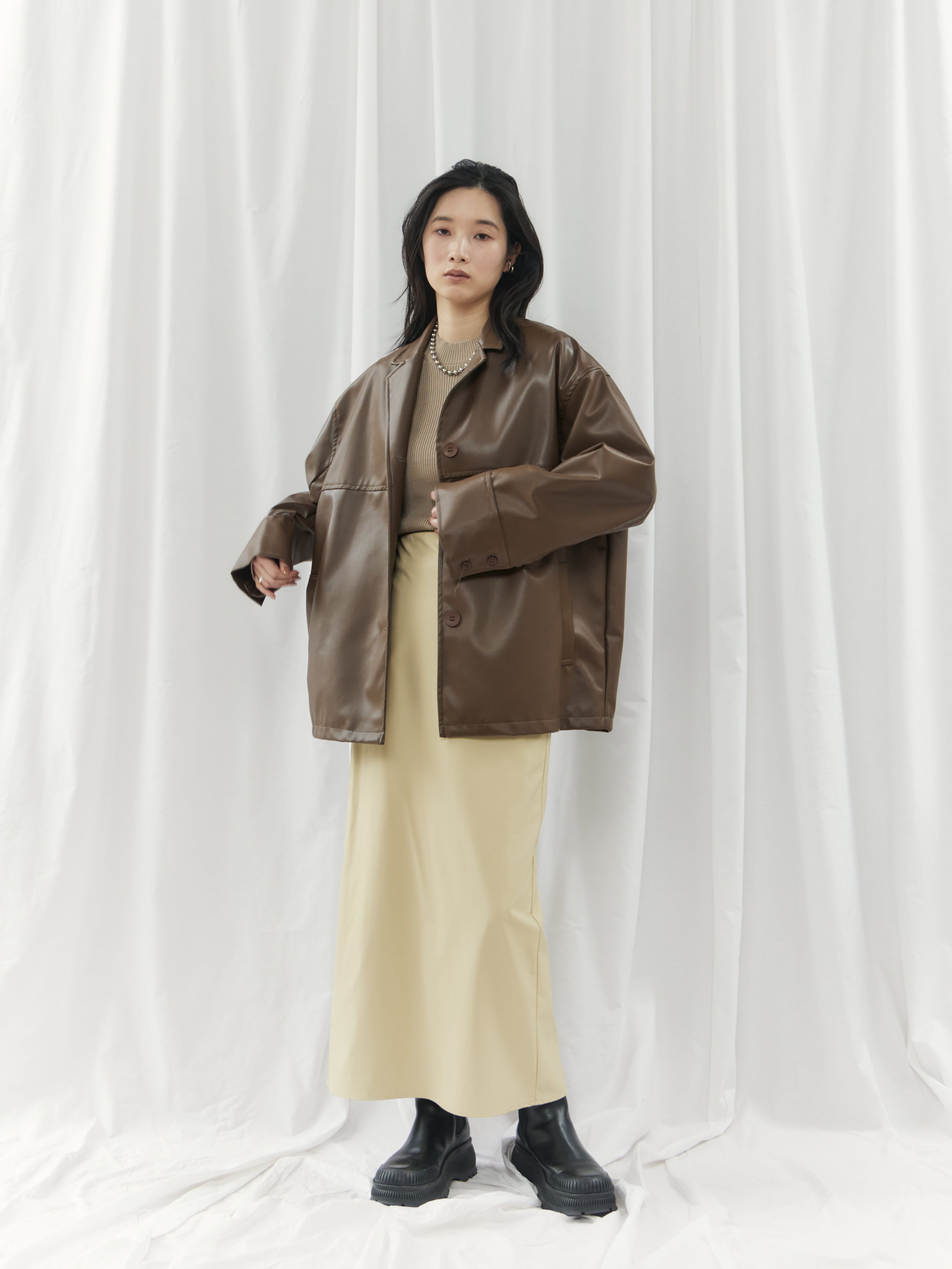高級感のあるフェイクレザー素材を使用。柔らかくゆったりとしたシルエットで、軽やかな着心地を実現しました。シャツのようにコンパクトな襟デザインが、ジャケット特有の堅苦しさを抑え、デイリーに気軽に羽織れる一着です。