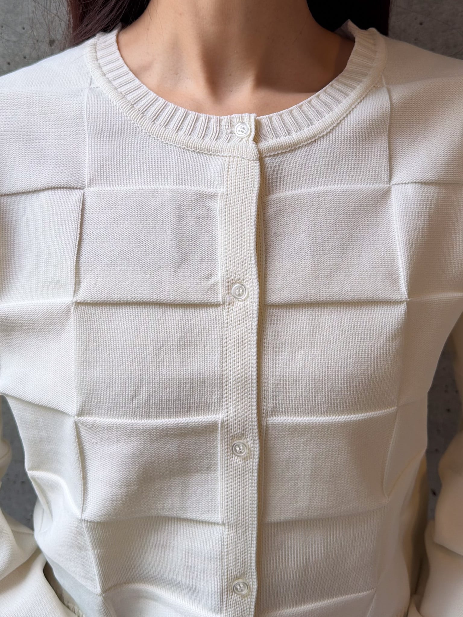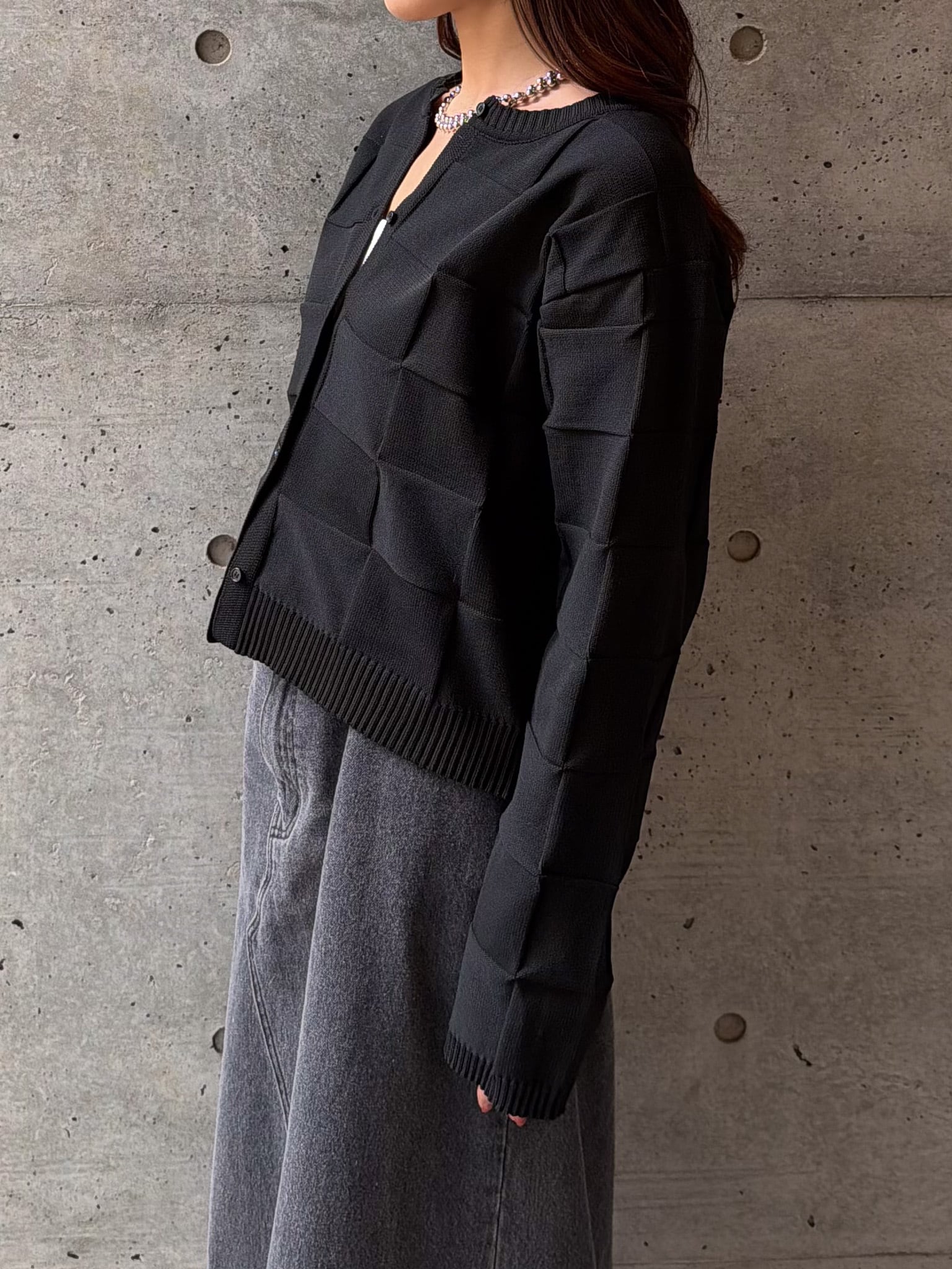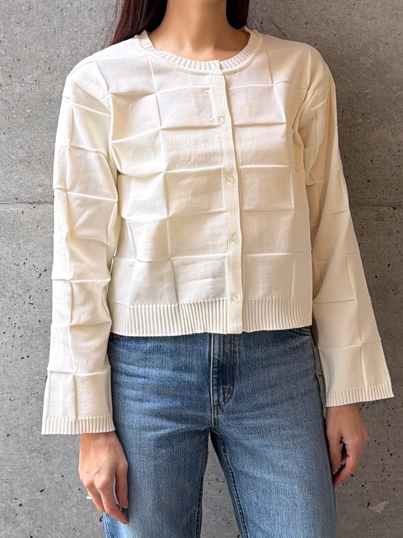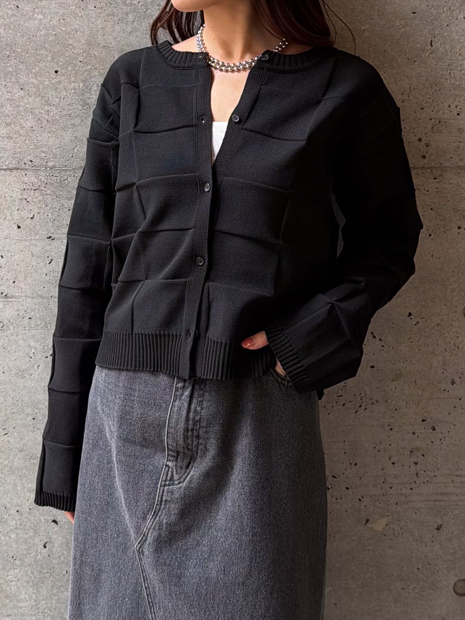 立体感のある切替デザインが目を惹くニットカーディガン。シンプルながらも、パネル状に切り替えた編地がコーディネートにアクセントをプラスしてくれます。程よくゆとりのある身幅で、女性らしさを保ちながらもリラックス感のある着心地に。軽やかなポリエステル素材を使用し、適度なハリ感で美しいシルエットをキープしてくれるのも嬉しいポイント。 カーディガンとしてはもちろん、ボタンを留めてトップス感覚での着用もおすすめです。