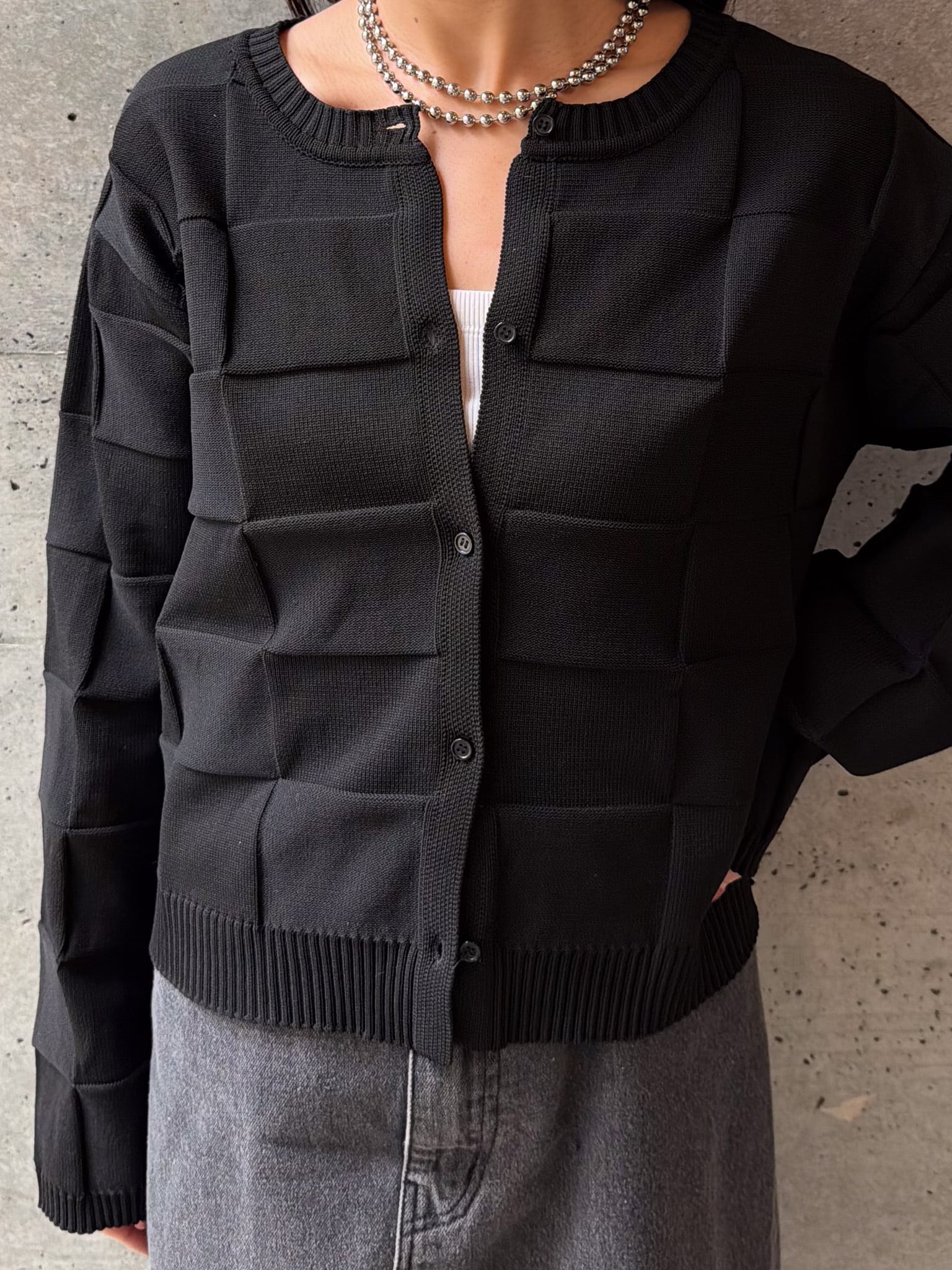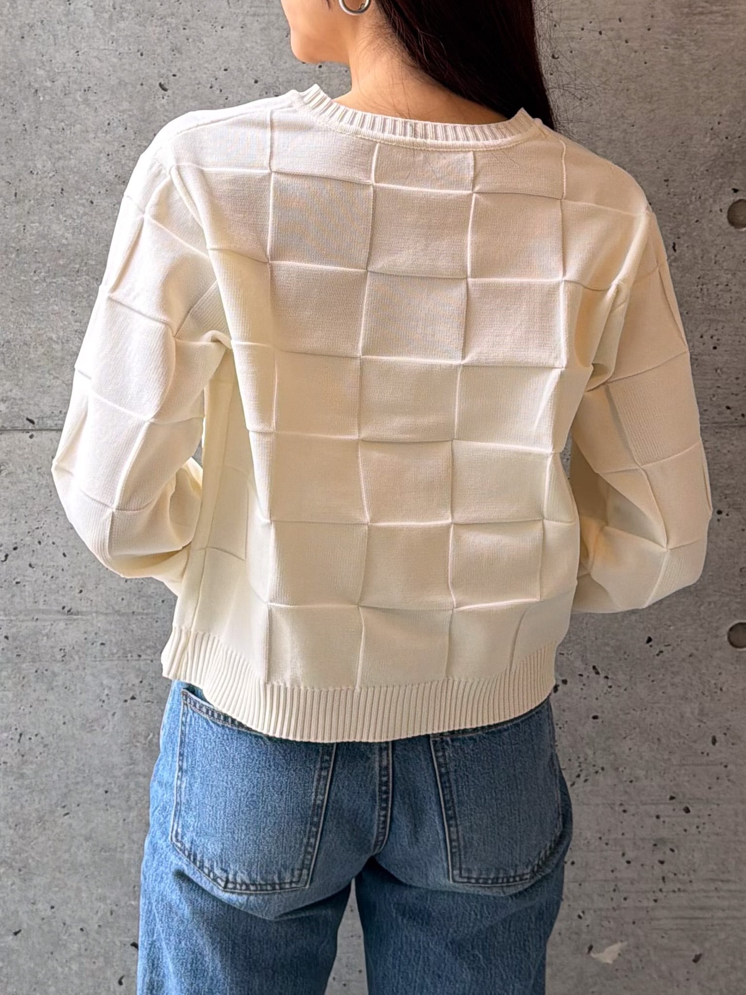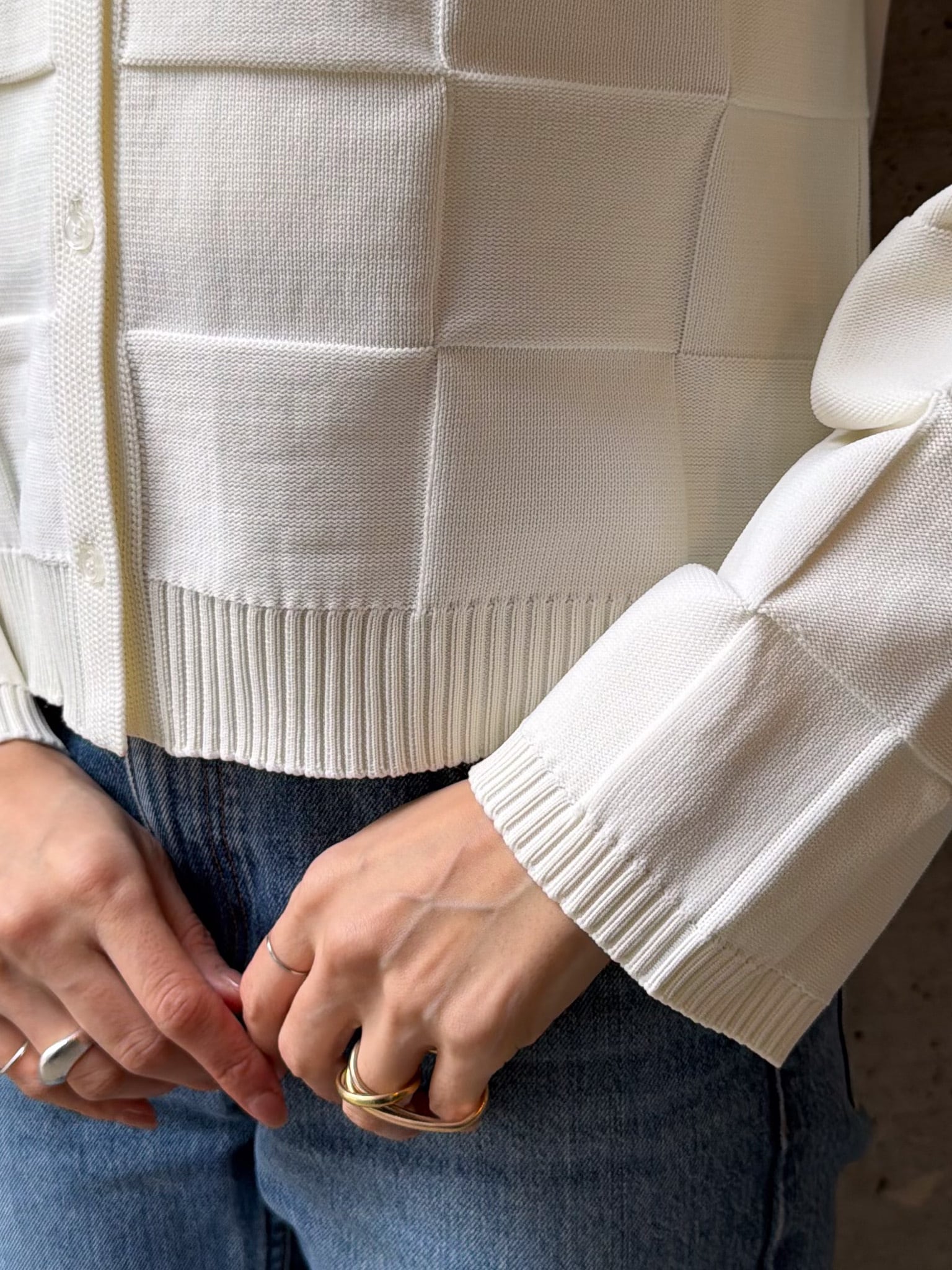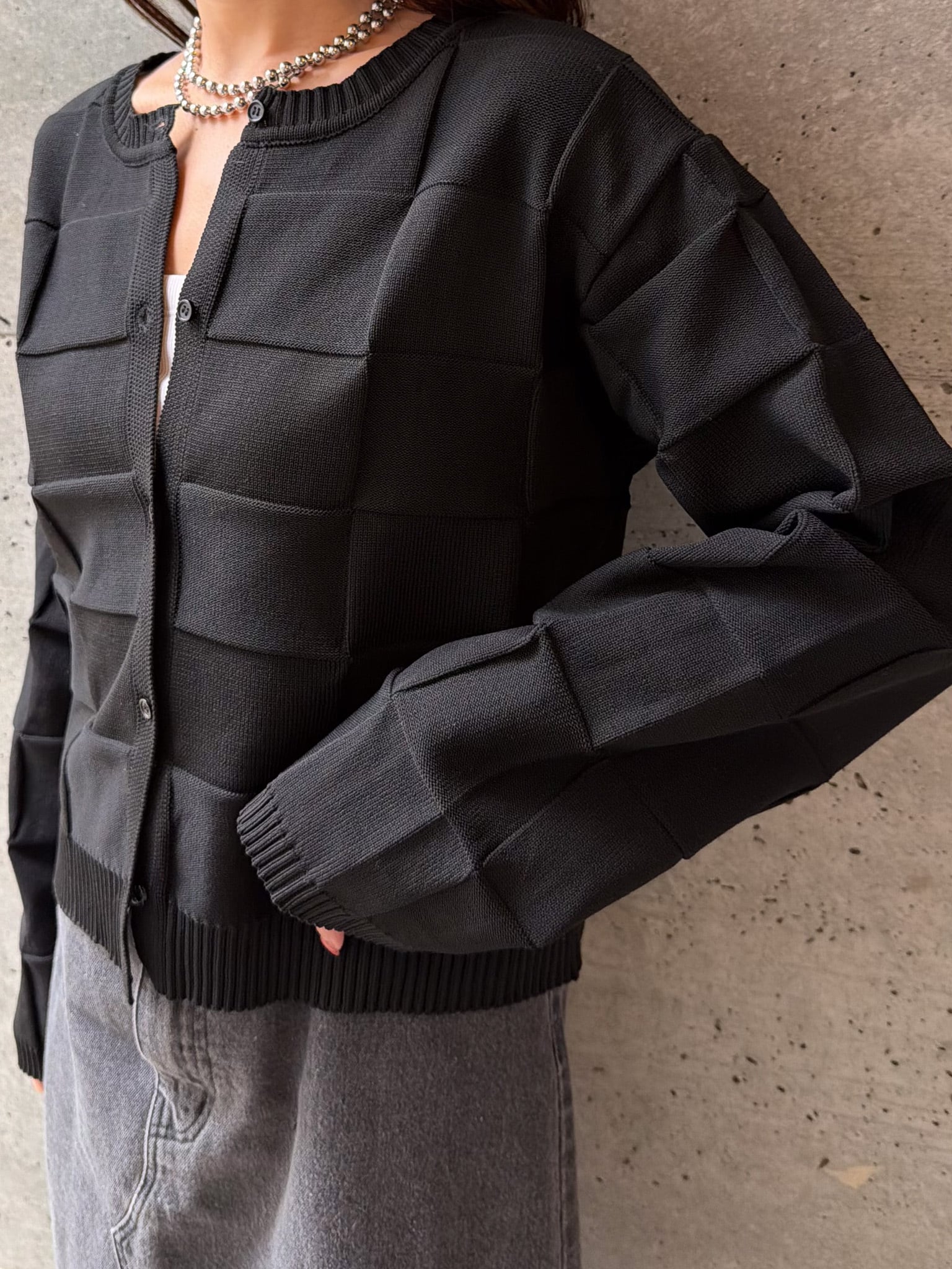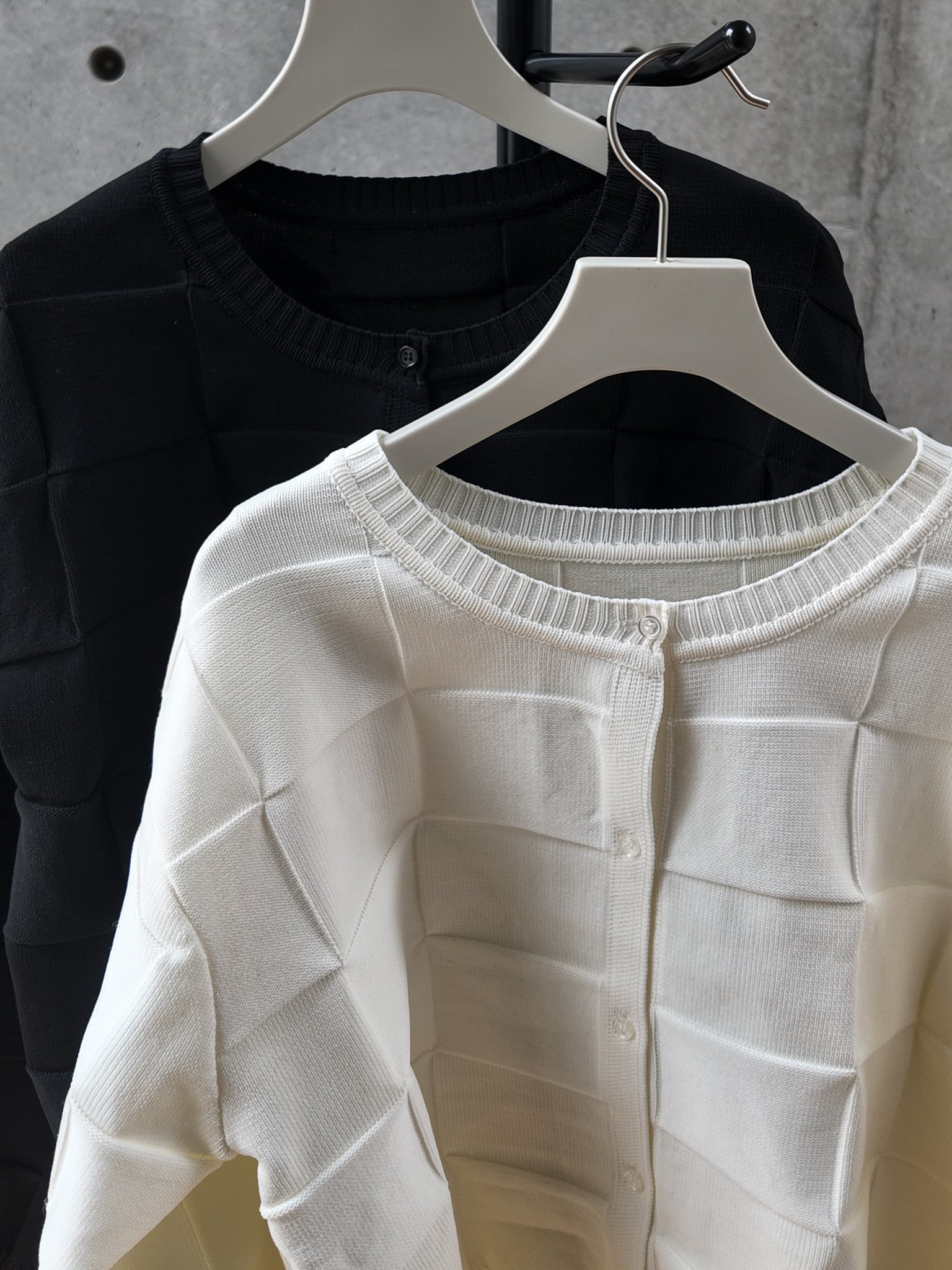 立体感のある切替デザインが目を惹くニットカーディガン。シンプルながらも、パネル状に切り替えた編地がコーディネートにアクセントをプラスしてくれます。程よくゆとりのある身幅で、女性らしさを保ちながらもリラックス感のある着心地に。軽やかなポリエステル素材を使用し、適度なハリ感で美しいシルエットをキープしてくれるのも嬉しいポイント。 カーディガンとしてはもちろん、ボタンを留めてトップス感覚での着用もおすすめです。