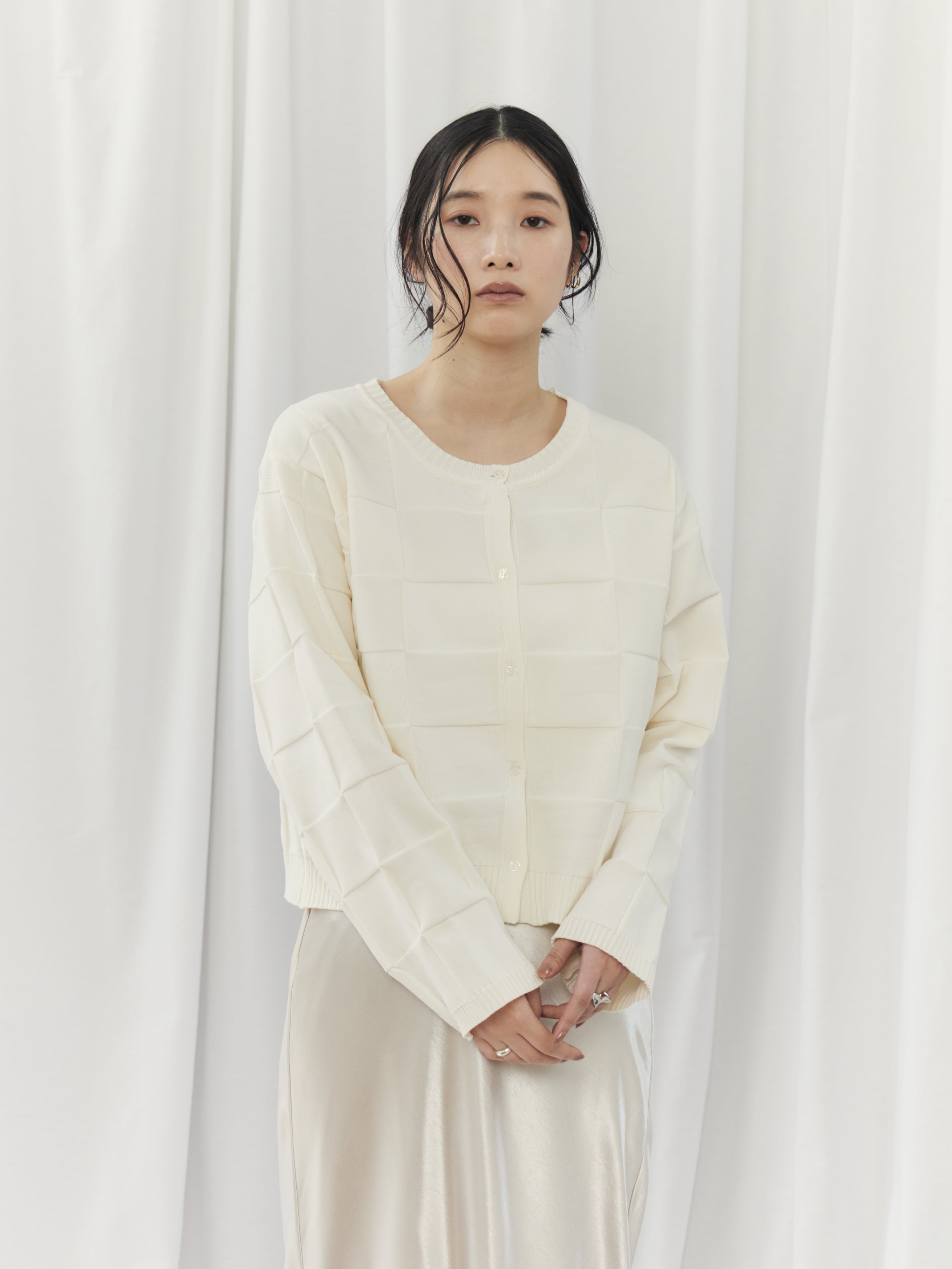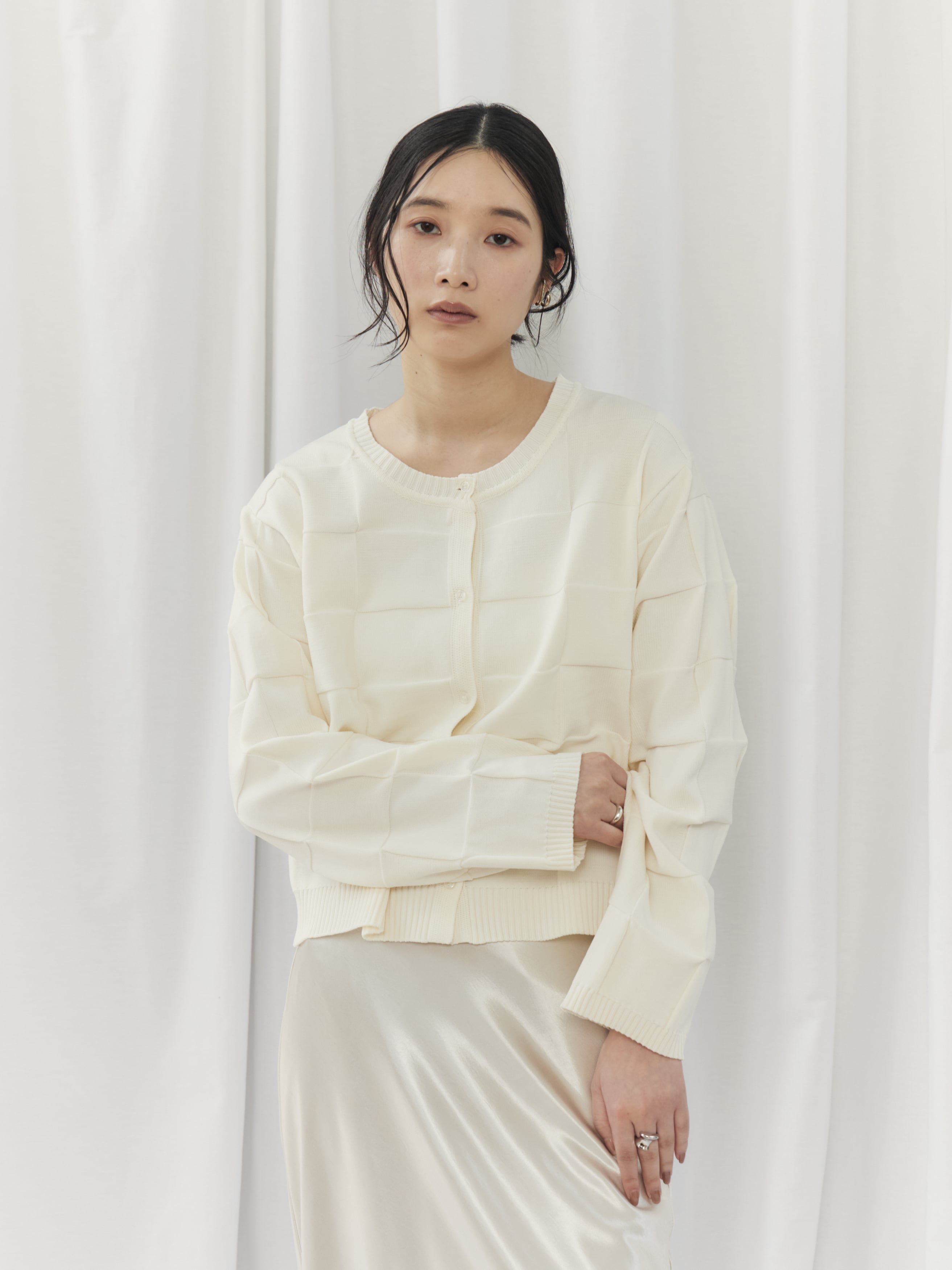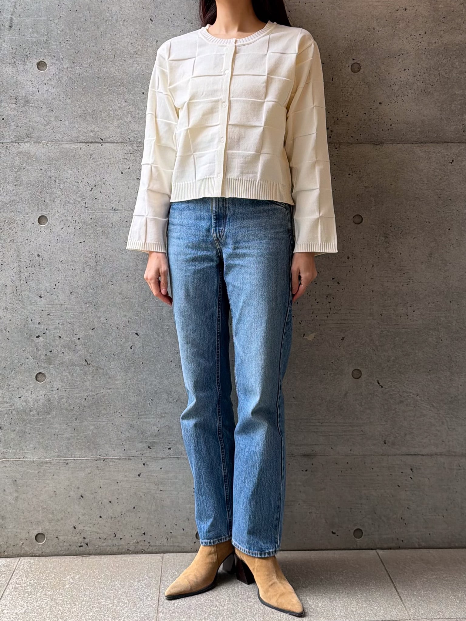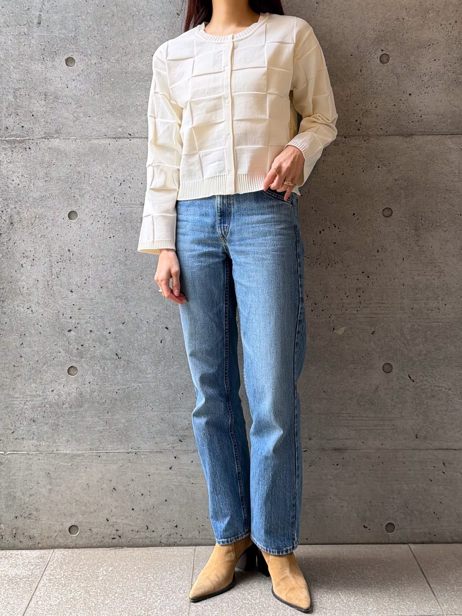 上半身が寂しく見えがちで、ハリのある素材は浮いて見えることがあるウェーブタイプさん。このカーディガンは切替デザインが自然な立体感をプラスし、ゆとりのある身幅で華奢見えをサポートしてくれます。ボタンを留めてコンパクトに着用し、ハイウエストボトムやスカートで重心をアップさせましょう。