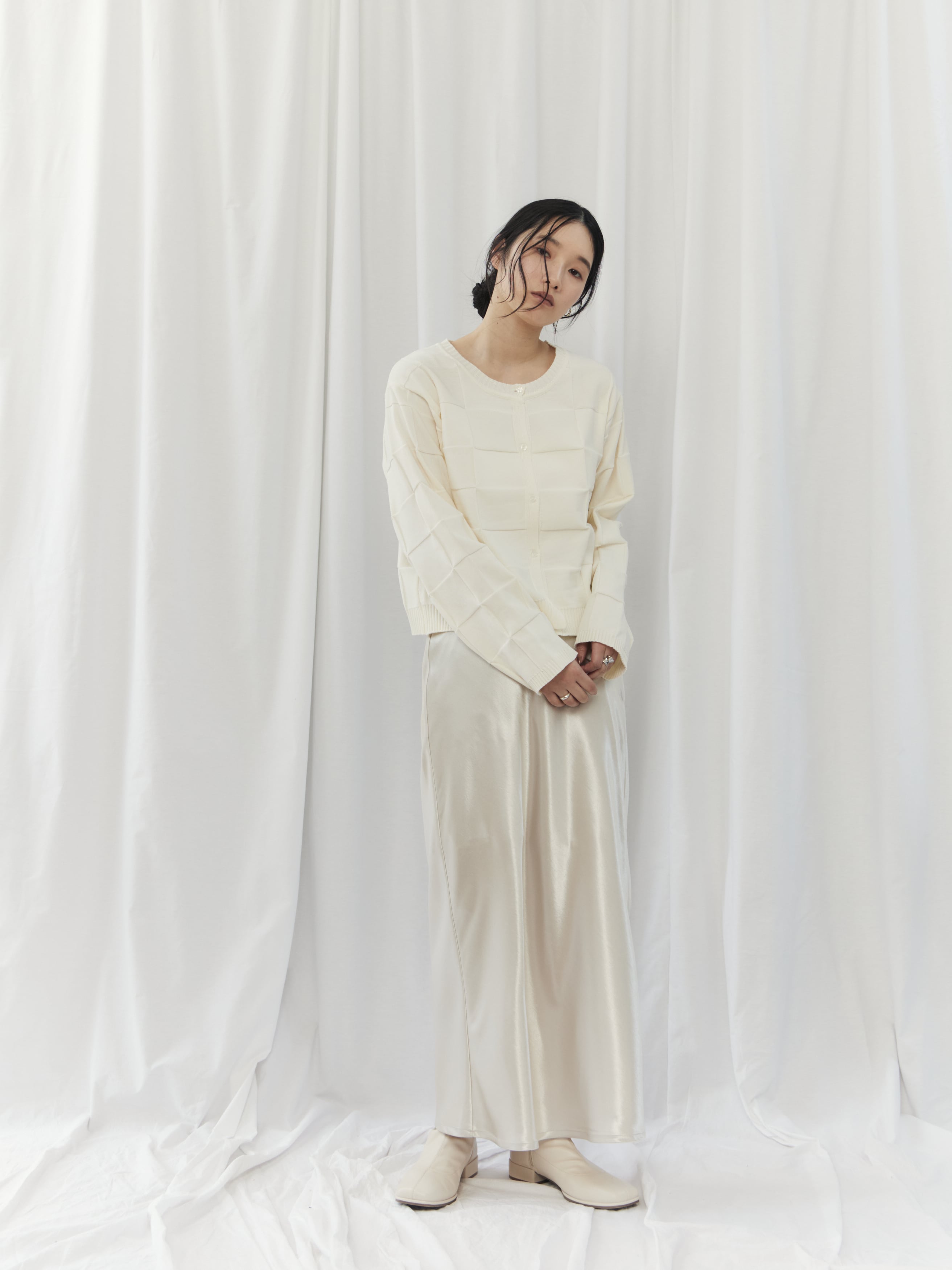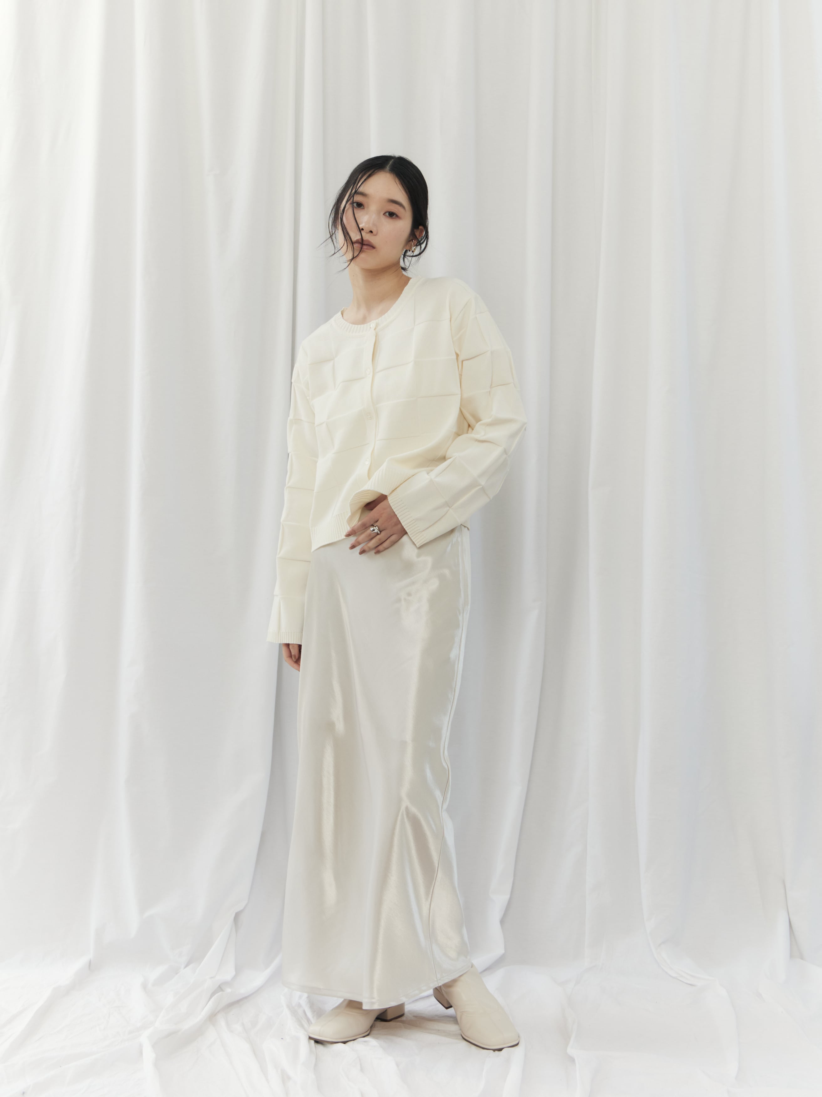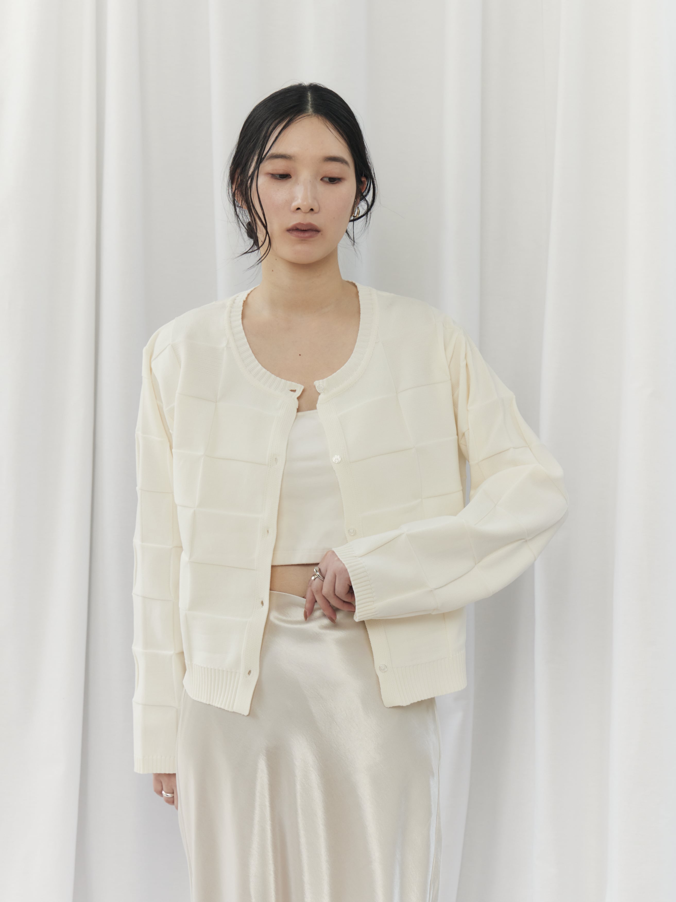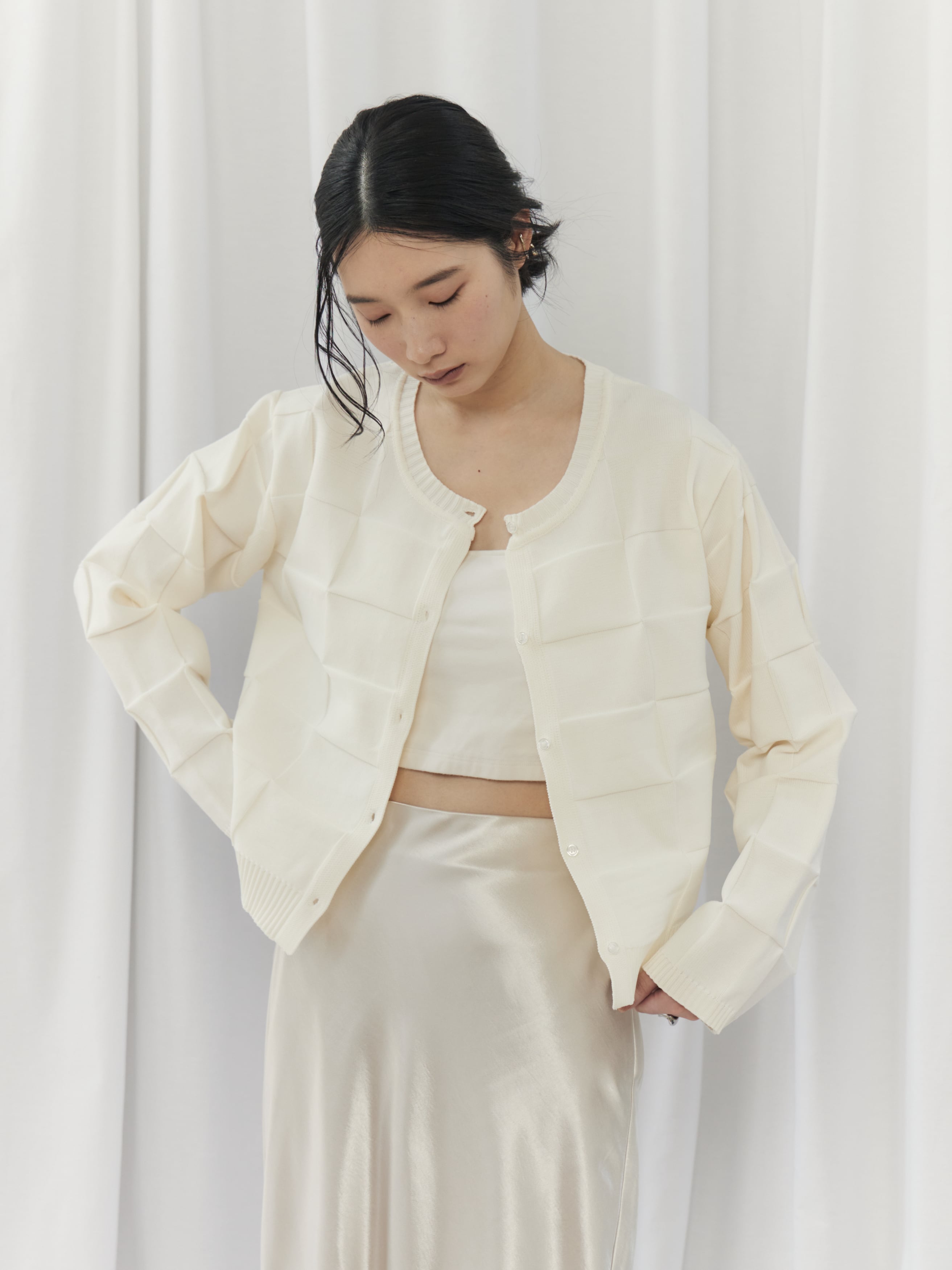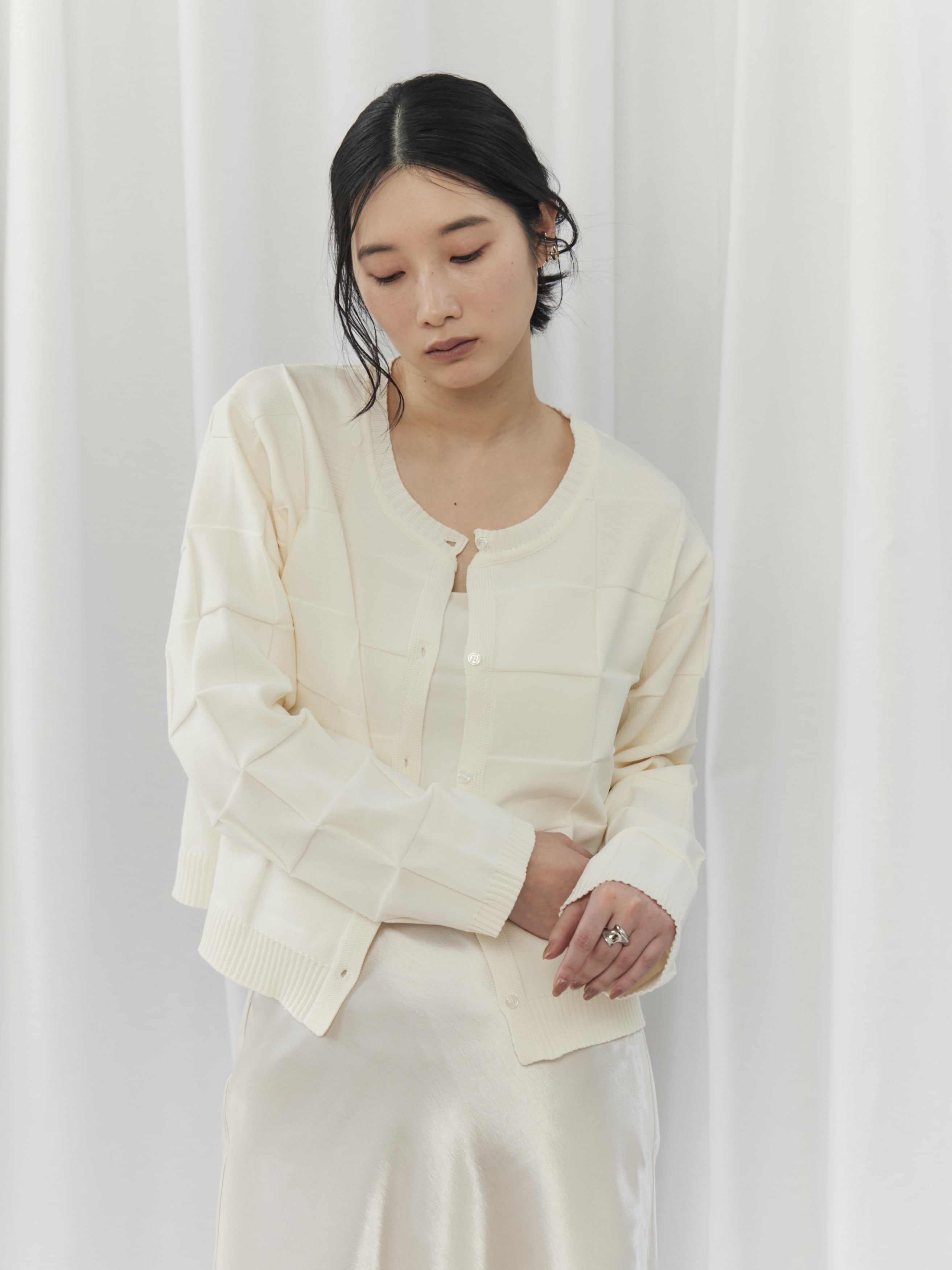 上半身が寂しく見えがちで、ハリのある素材は浮いて見えることがあるウェーブタイプさん。このカーディガンは切替デザインが自然な立体感をプラスし、ゆとりのある身幅で華奢見えをサポートしてくれます。ボタンを留めてコンパクトに着用し、ハイウエストボトムやスカートで重心をアップさせましょう。