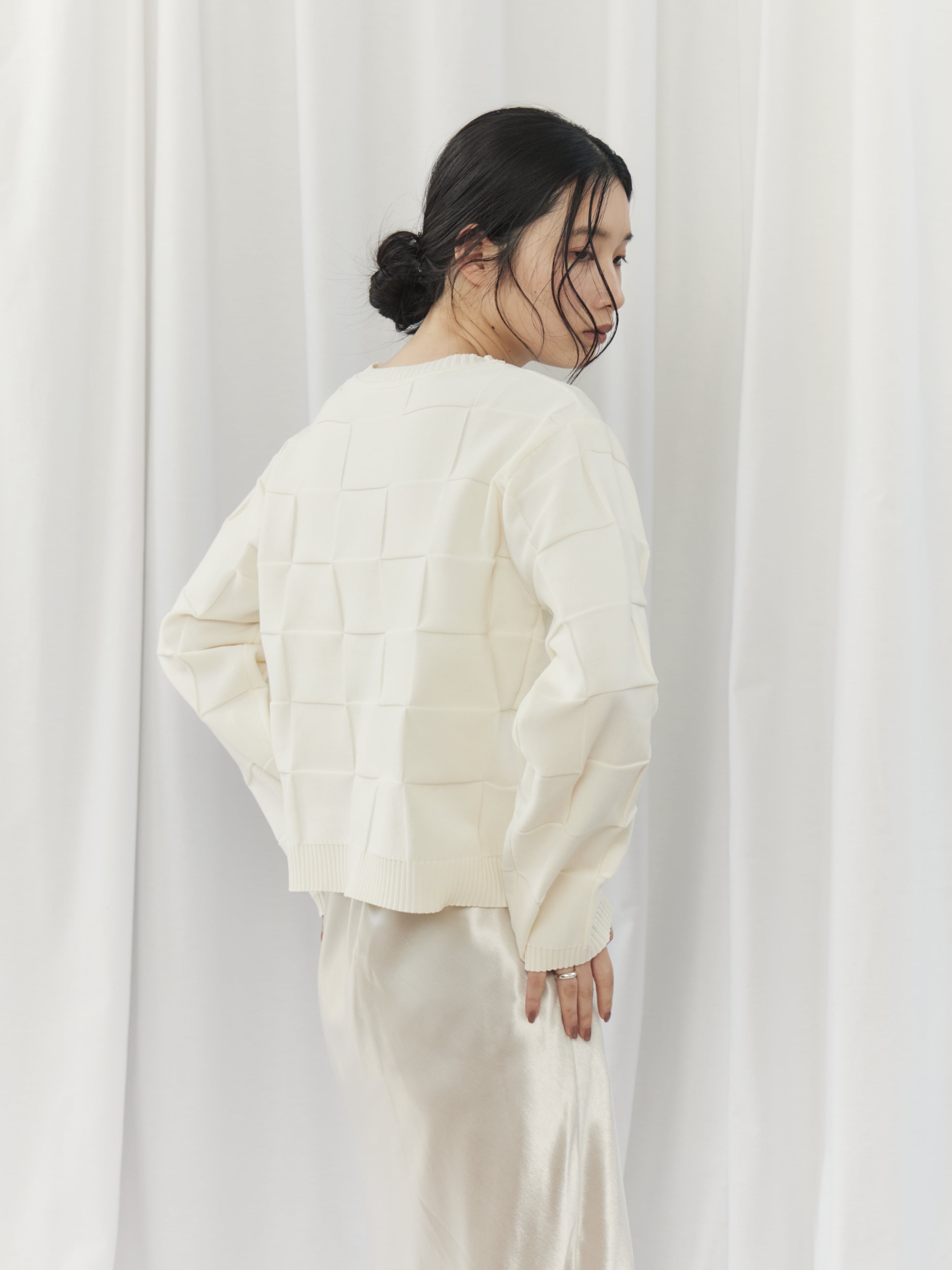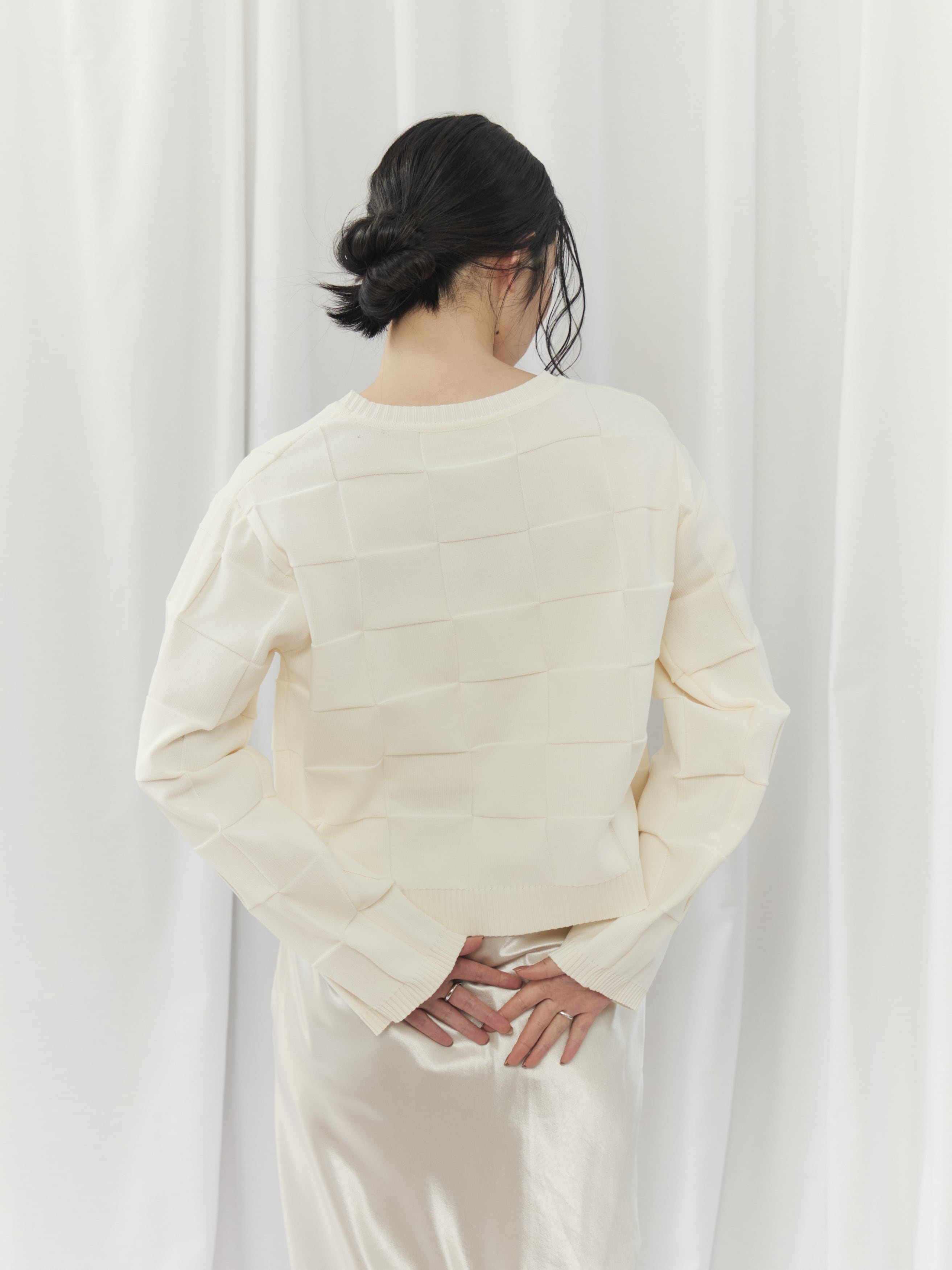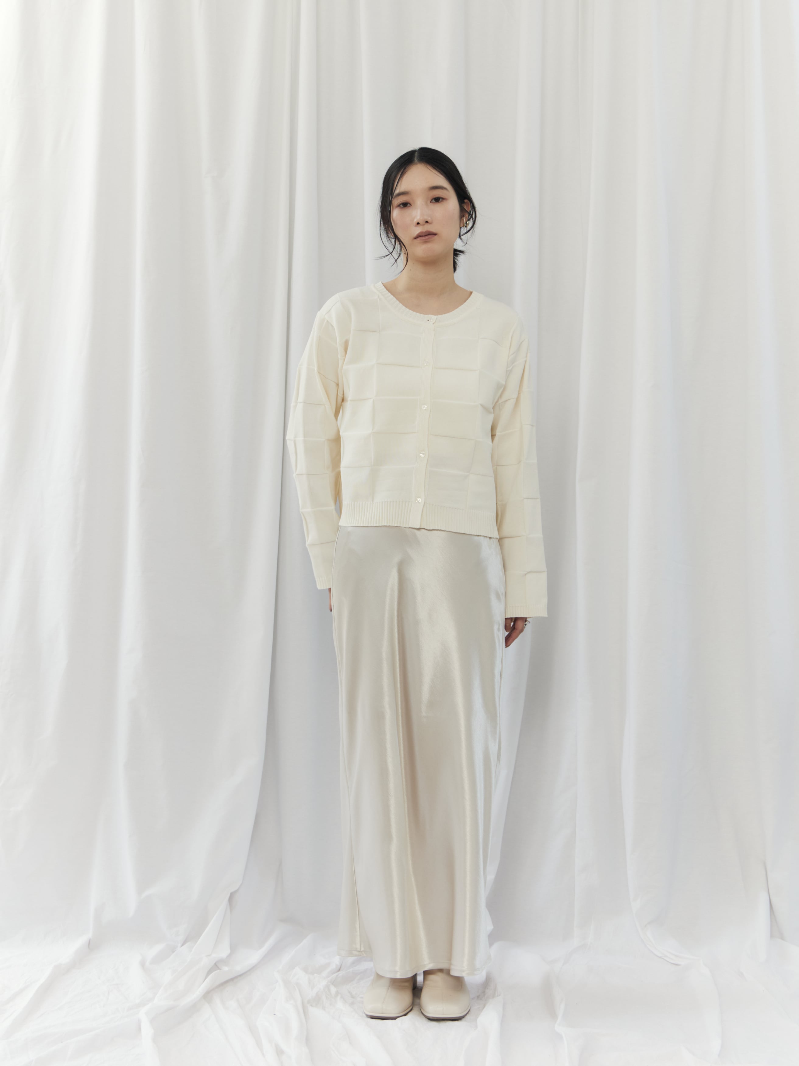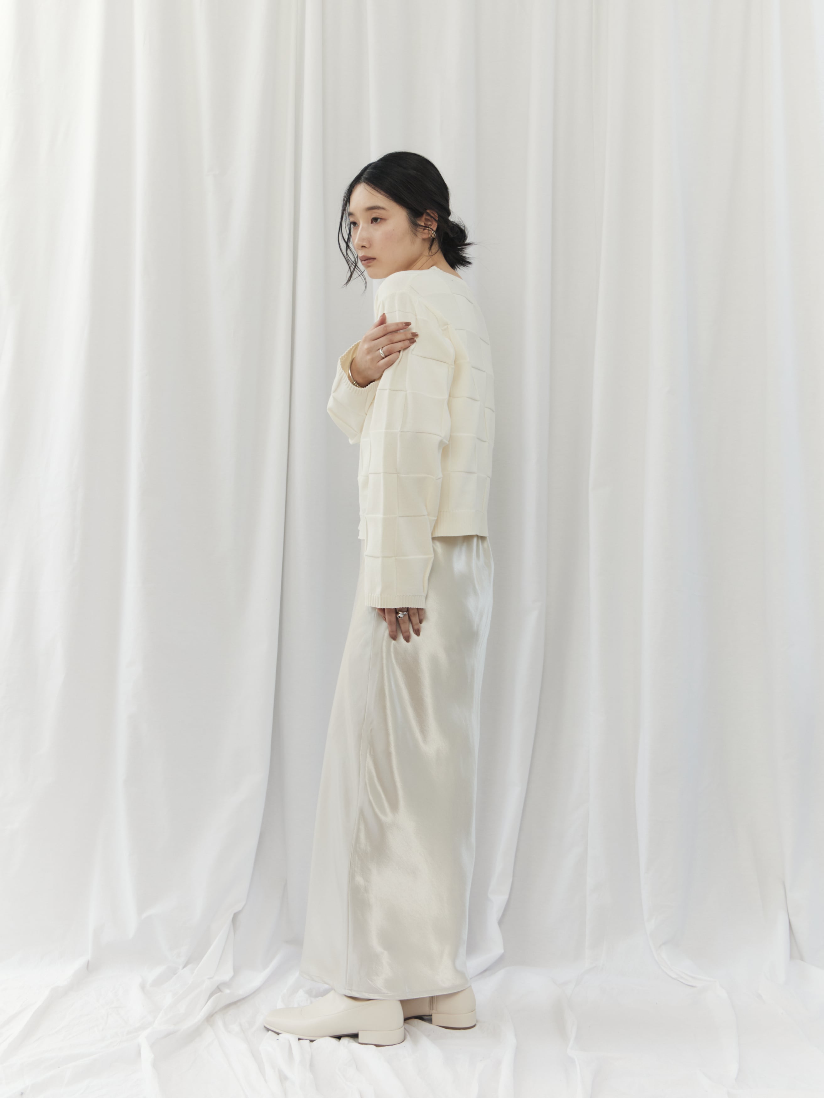 上半身が寂しく見えがちで、ハリのある素材は浮いて見えることがあるウェーブタイプさん。このカーディガンは切替デザインが自然な立体感をプラスし、ゆとりのある身幅で華奢見えをサポートしてくれます。ボタンを留めてコンパクトに着用し、ハイウエストボトムやスカートで重心をアップさせましょう。