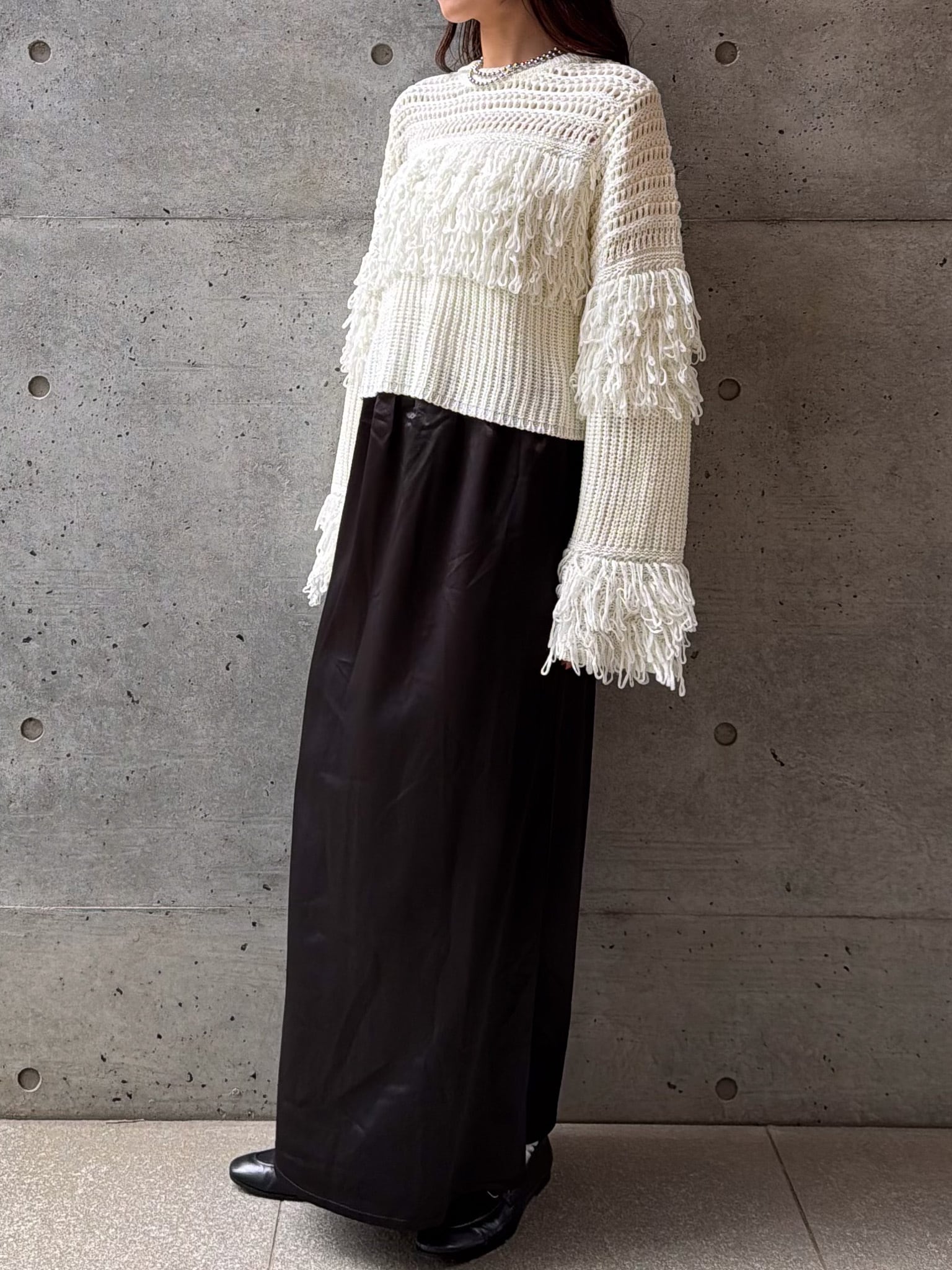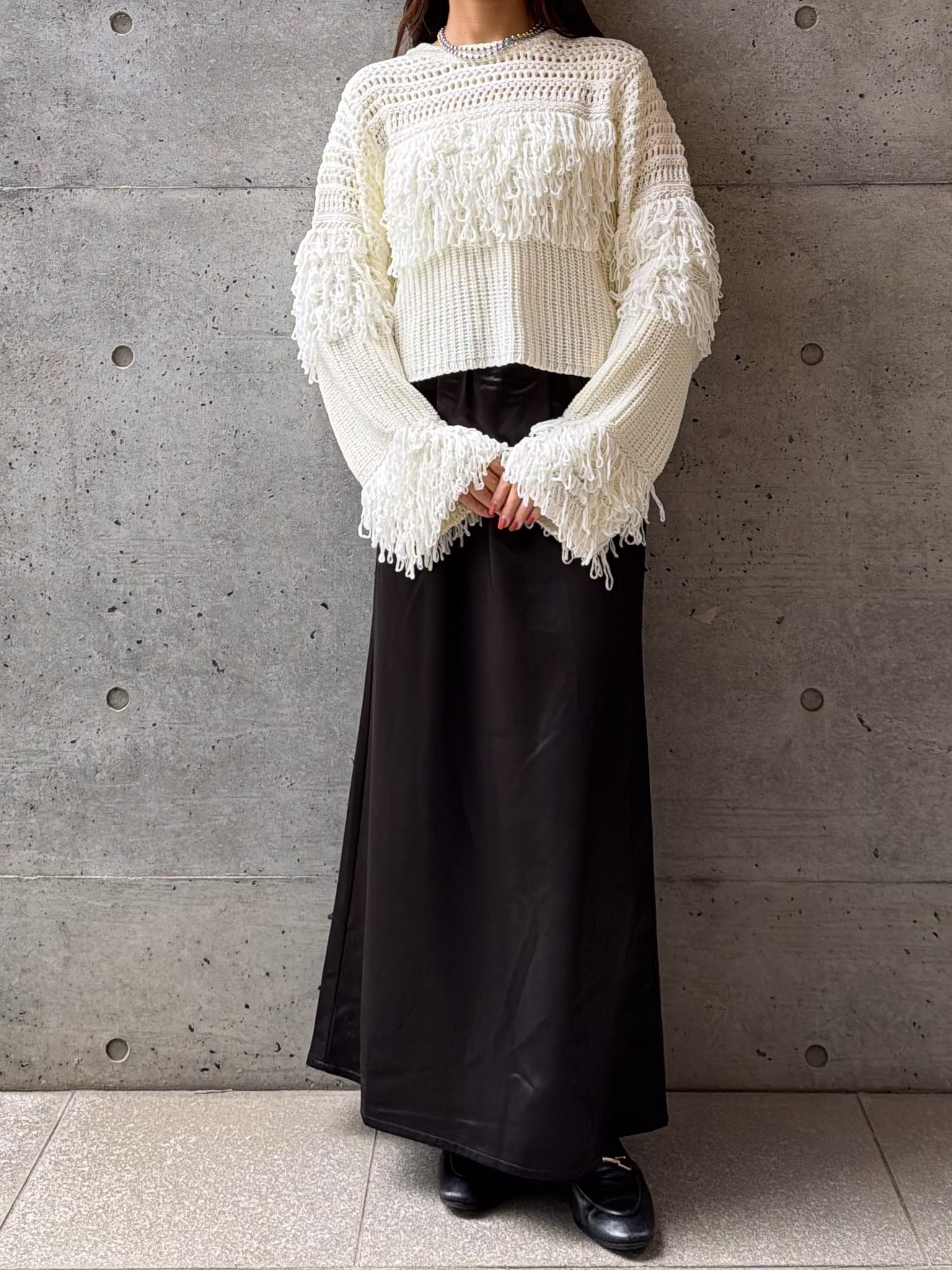 フリンジの立体感と柔らかい編み地がウェーブタイプさんと好相性。ハイウエストのスカートや揺れ感のあるボトムと合わせることで、スタイルアップが叶います。