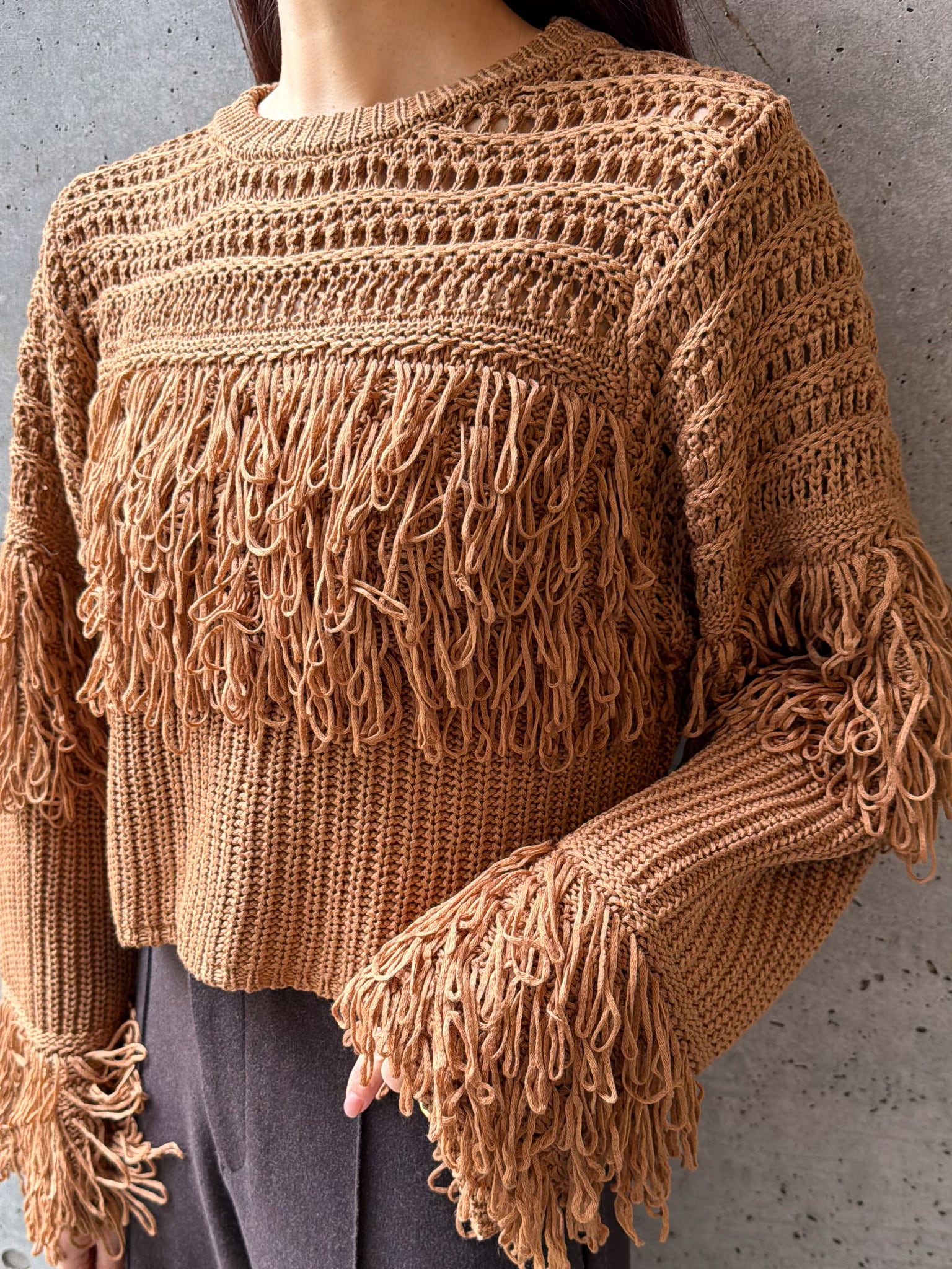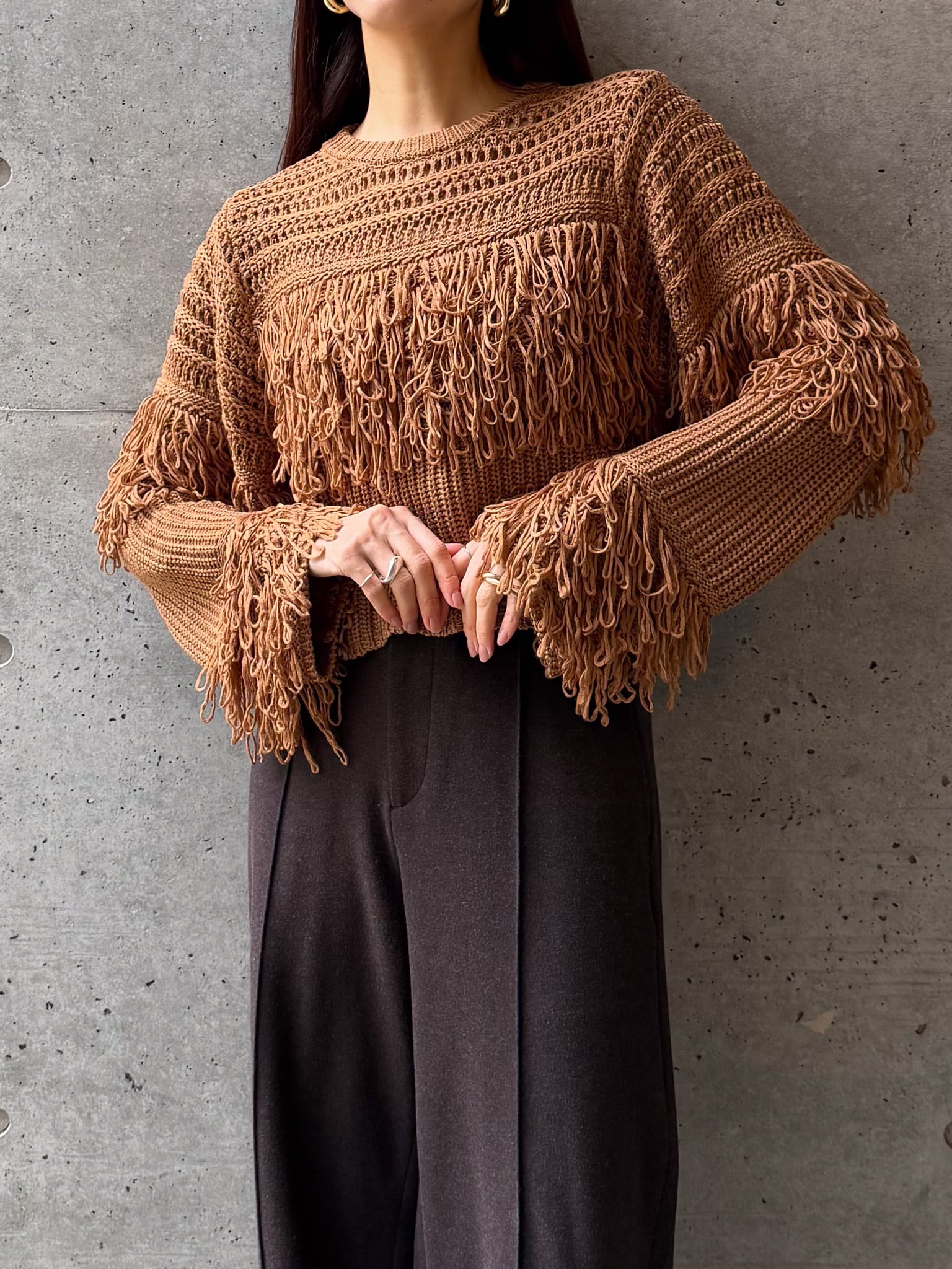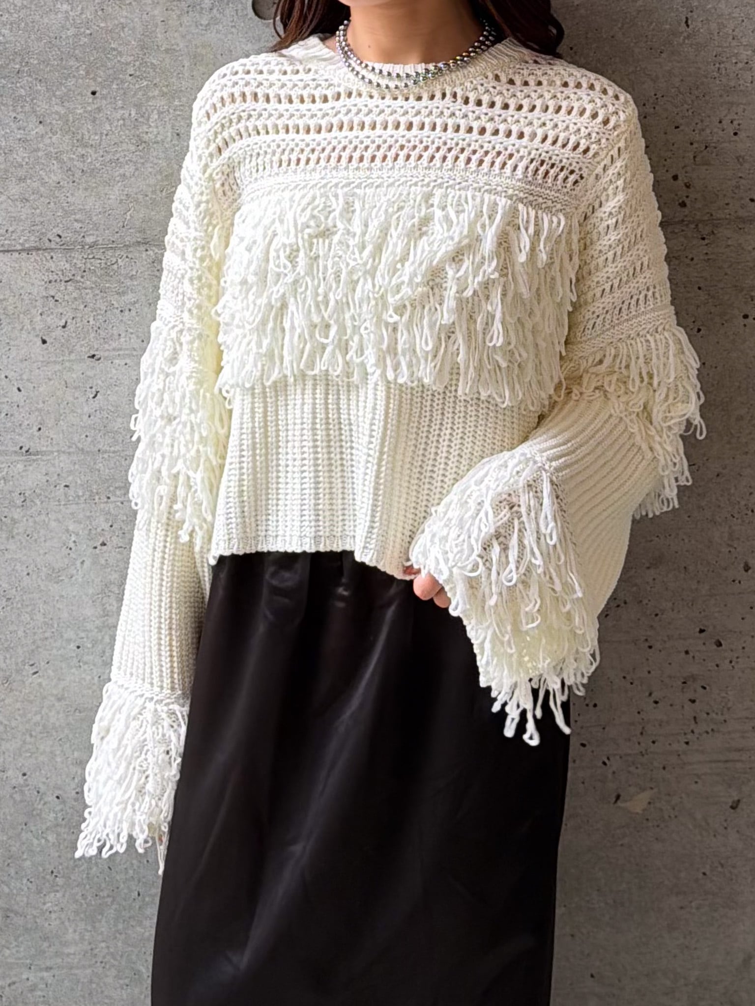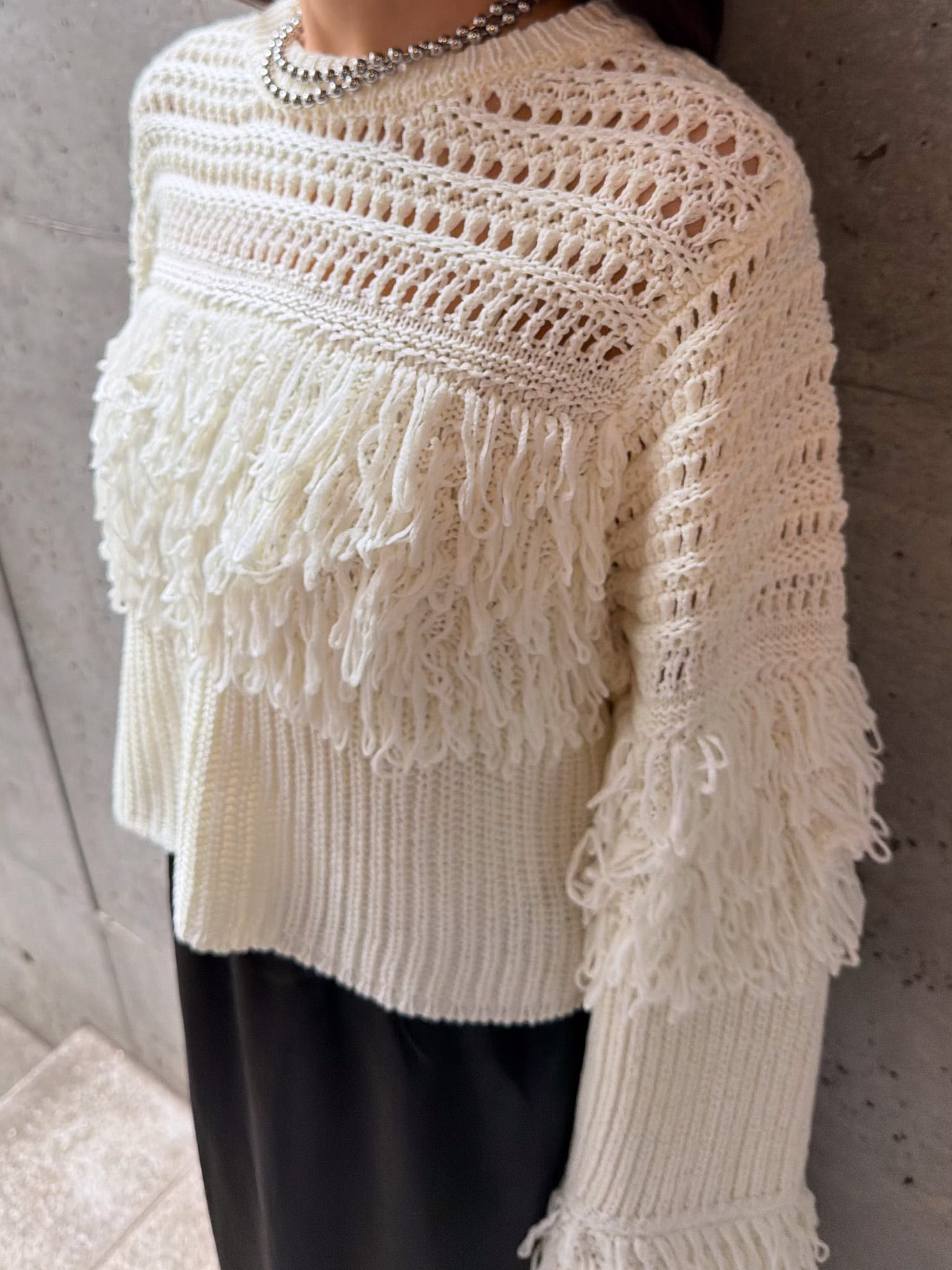 繊細なフリンジディテールが目を惹く、主役級ニットトップス。表情のある編み地切り替えと、胸元に施されたフリンジがコーディネートに動きと華やかさをプラスします。程よくゆとりのあるシルエットで、体のラインを拾いにくく、リラックス感のある着心地。ショート〜ミドル丈のバランスで、パンツ・スカート問わず合わせやすい一枚です。