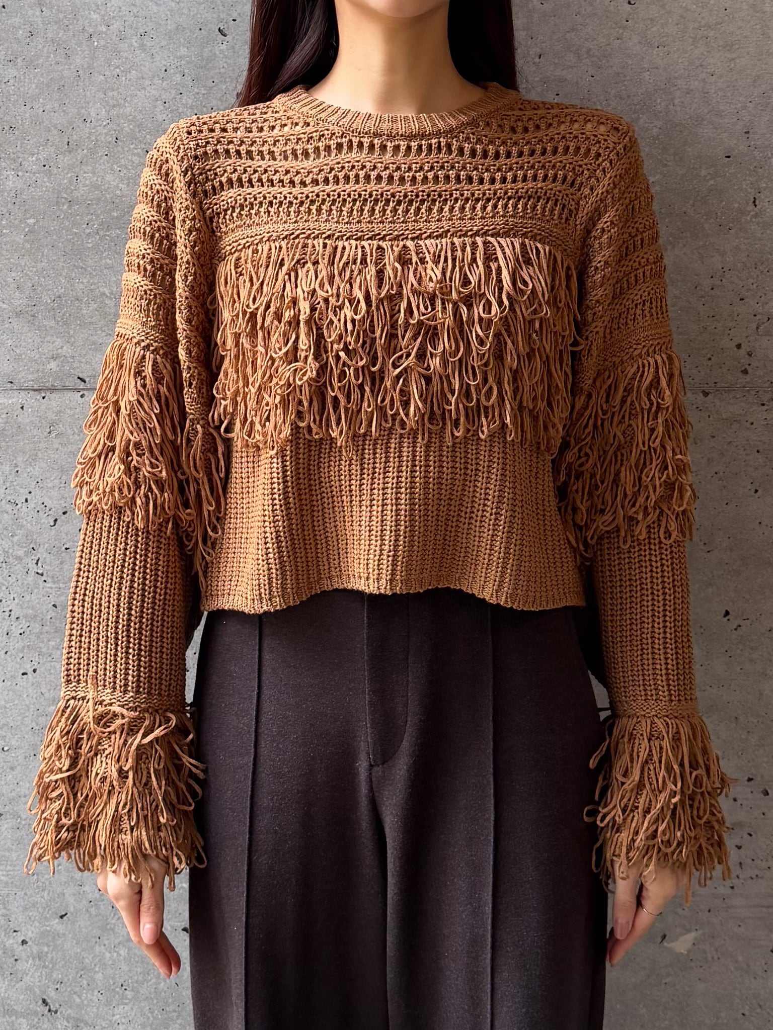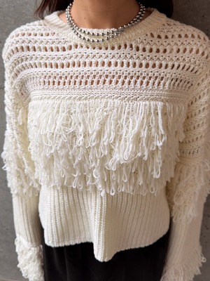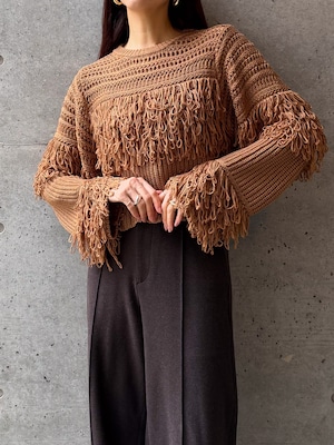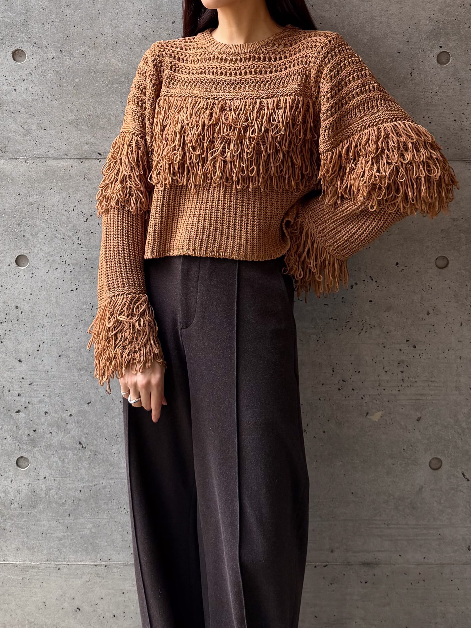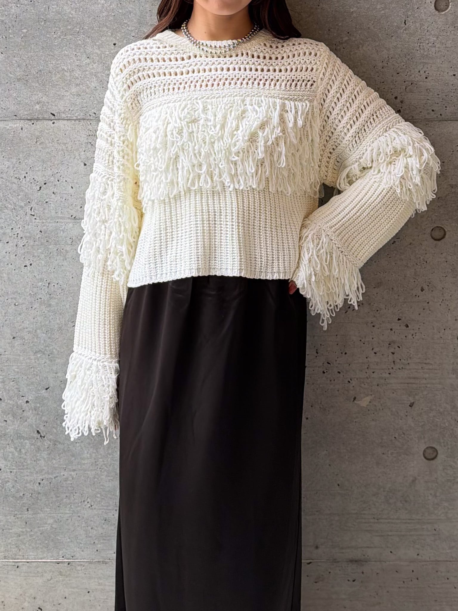 繊細なフリンジディテールが目を惹く、主役級ニットトップス。表情のある編み地切り替えと、胸元に施されたフリンジがコーディネートに動きと華やかさをプラスします。程よくゆとりのあるシルエットで、体のラインを拾いにくく、リラックス感のある着心地。ショート〜ミドル丈のバランスで、パンツ・スカート問わず合わせやすい一枚です。