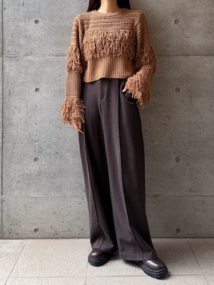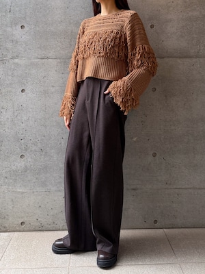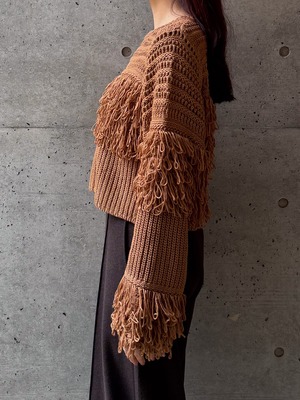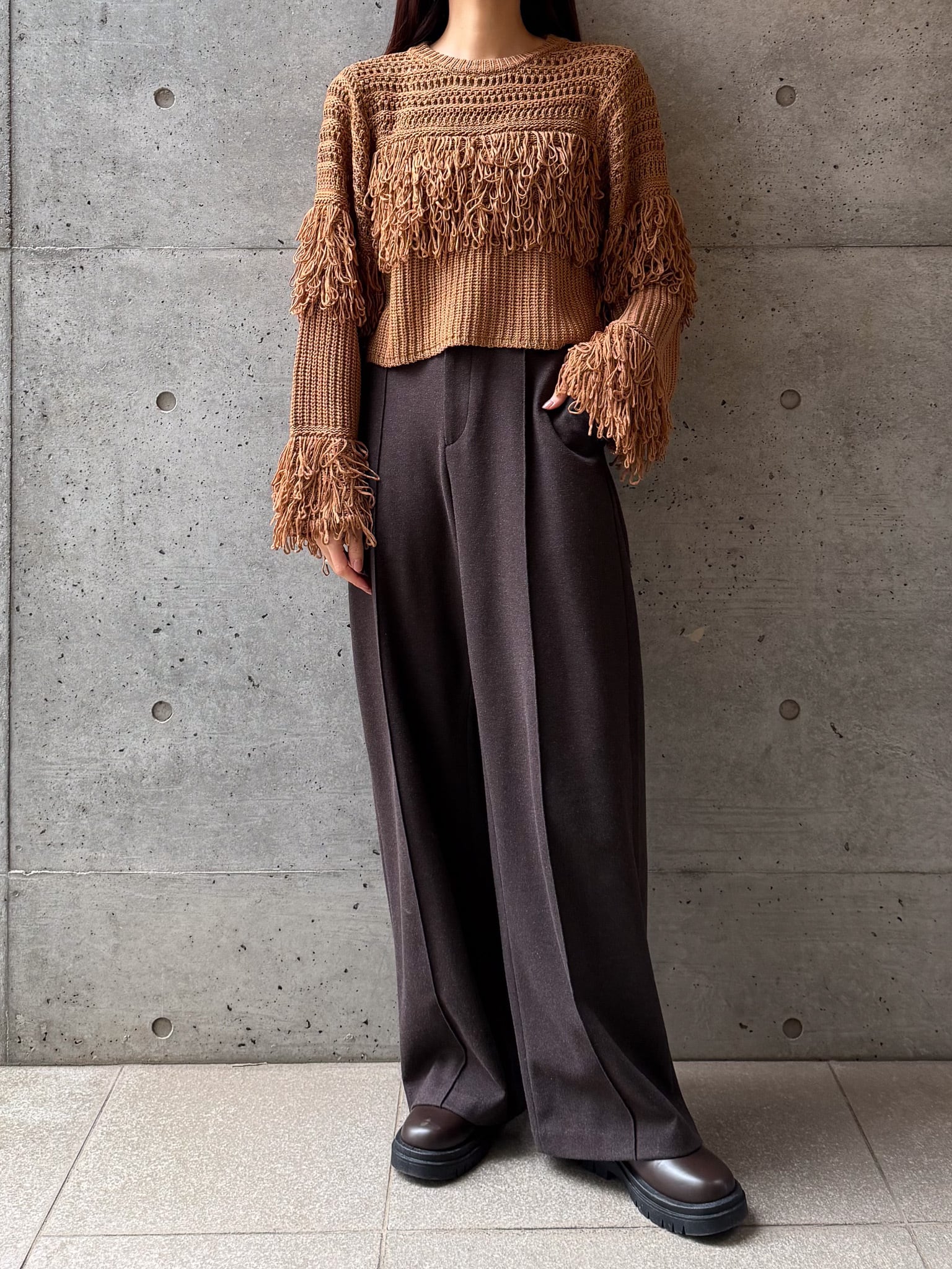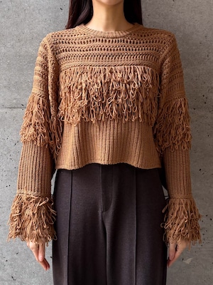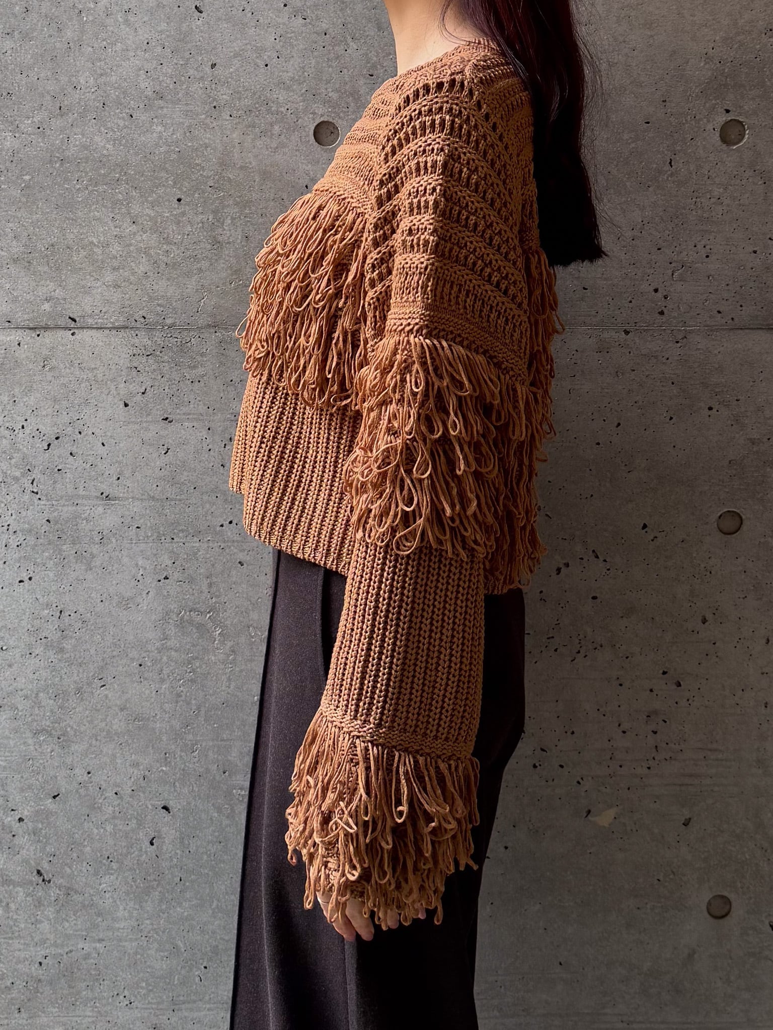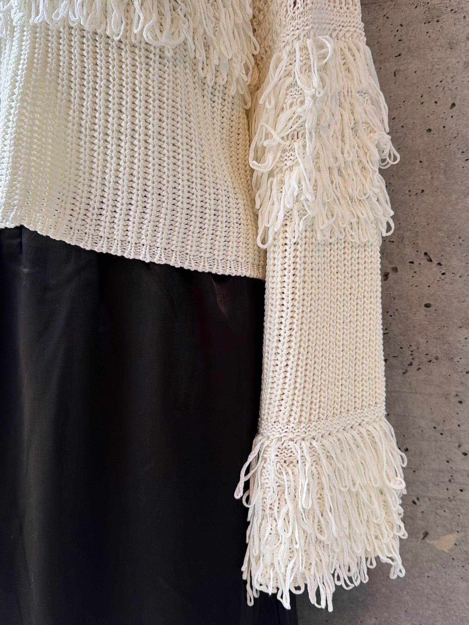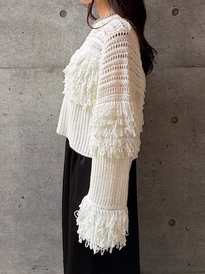 繊細なフリンジディテールが目を惹く、主役級ニットトップス。表情のある編み地切り替えと、胸元に施されたフリンジがコーディネートに動きと華やかさをプラスします。程よくゆとりのあるシルエットで、体のラインを拾いにくく、リラックス感のある着心地。ショート〜ミドル丈のバランスで、パンツ・スカート問わず合わせやすい一枚です。