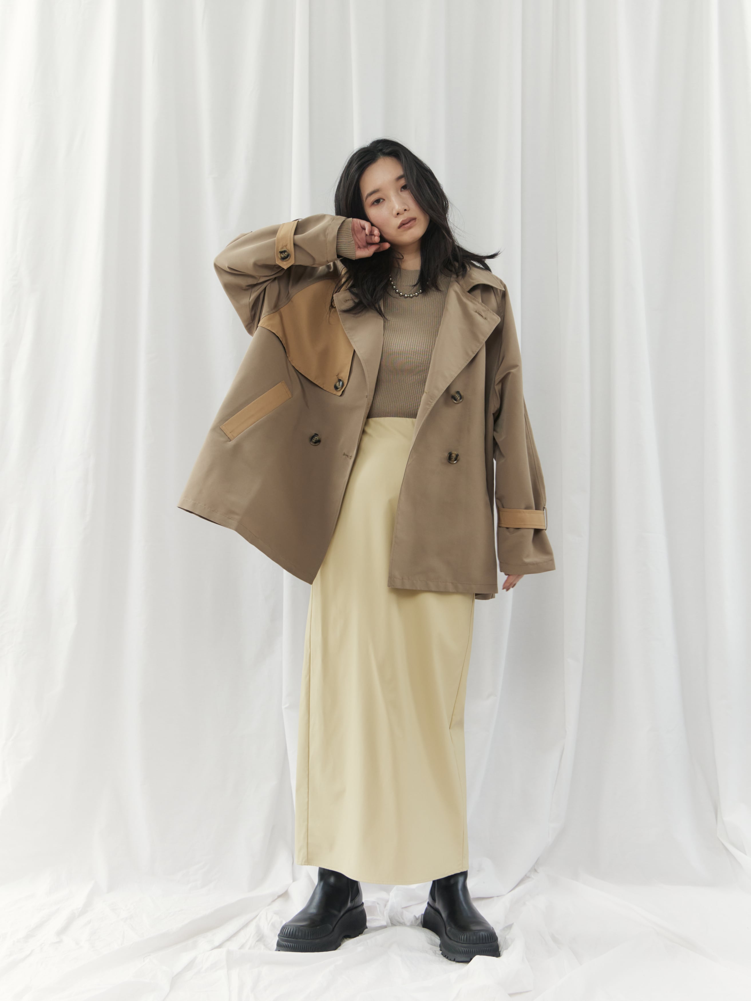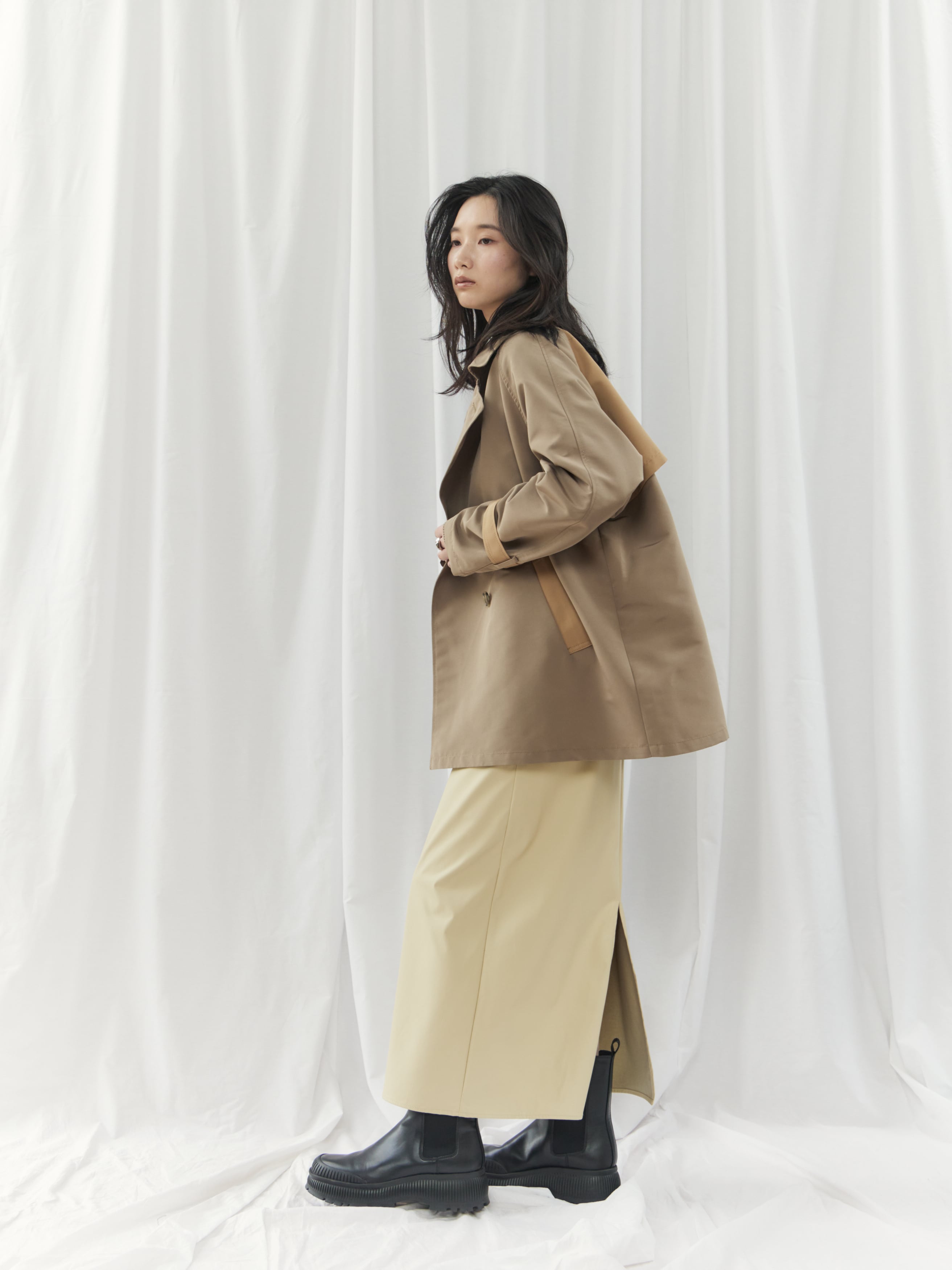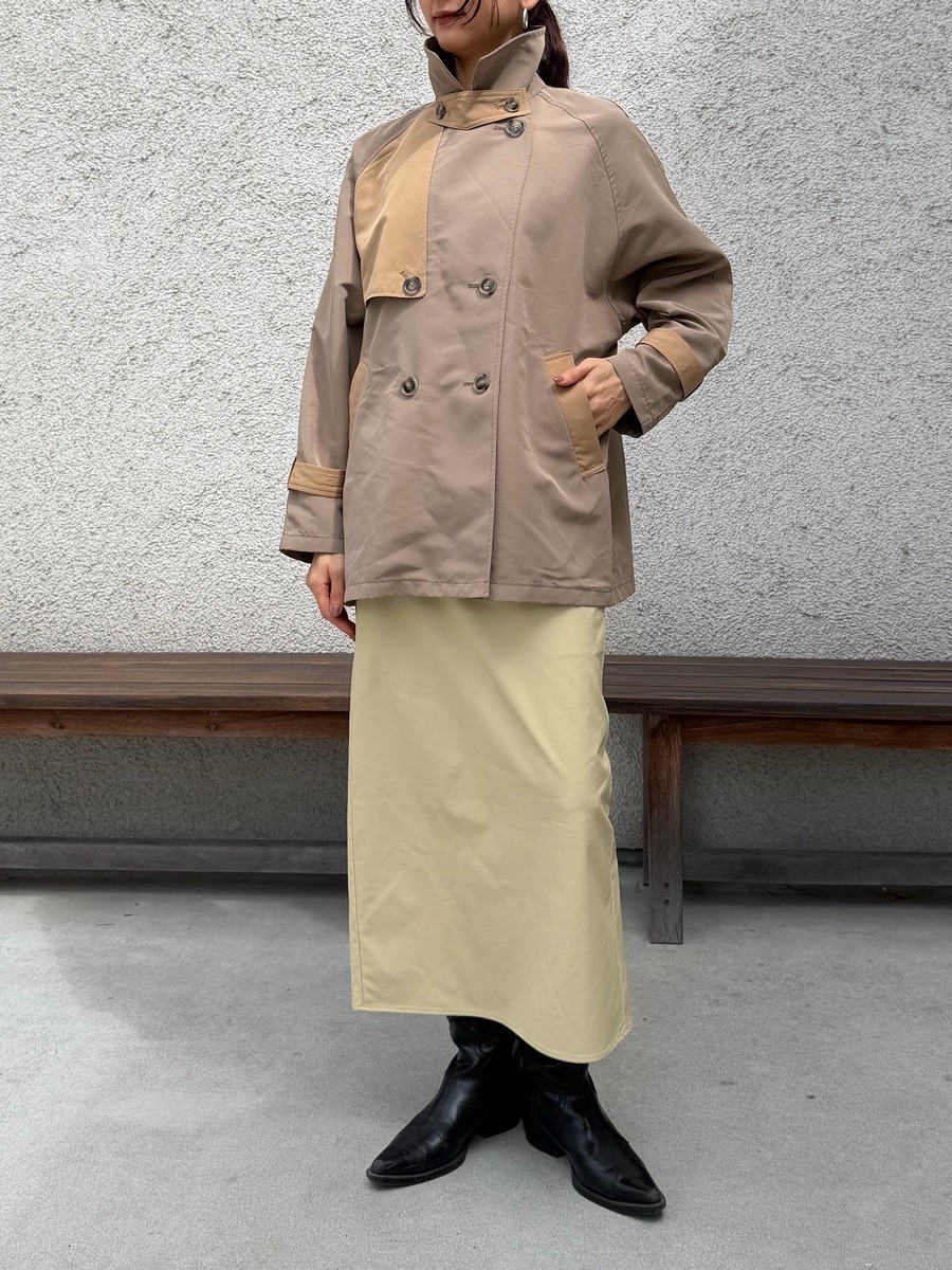 ハリのある素材感とIラインシルエットがストレートタイプさんと好相性◎ トップスはジャストサイズやシンプルなデザインを合わせると、全体がバランス良くまとまります。