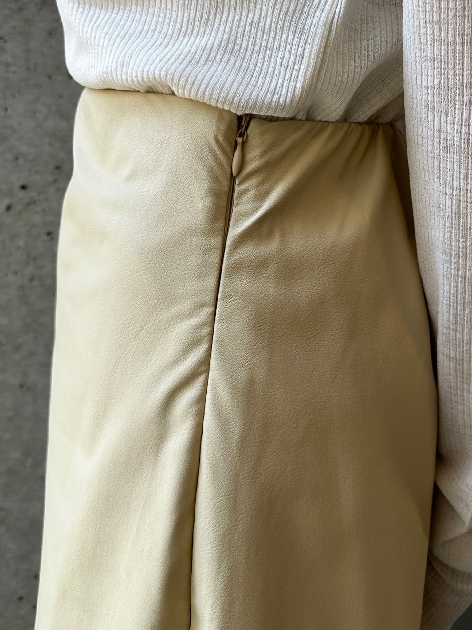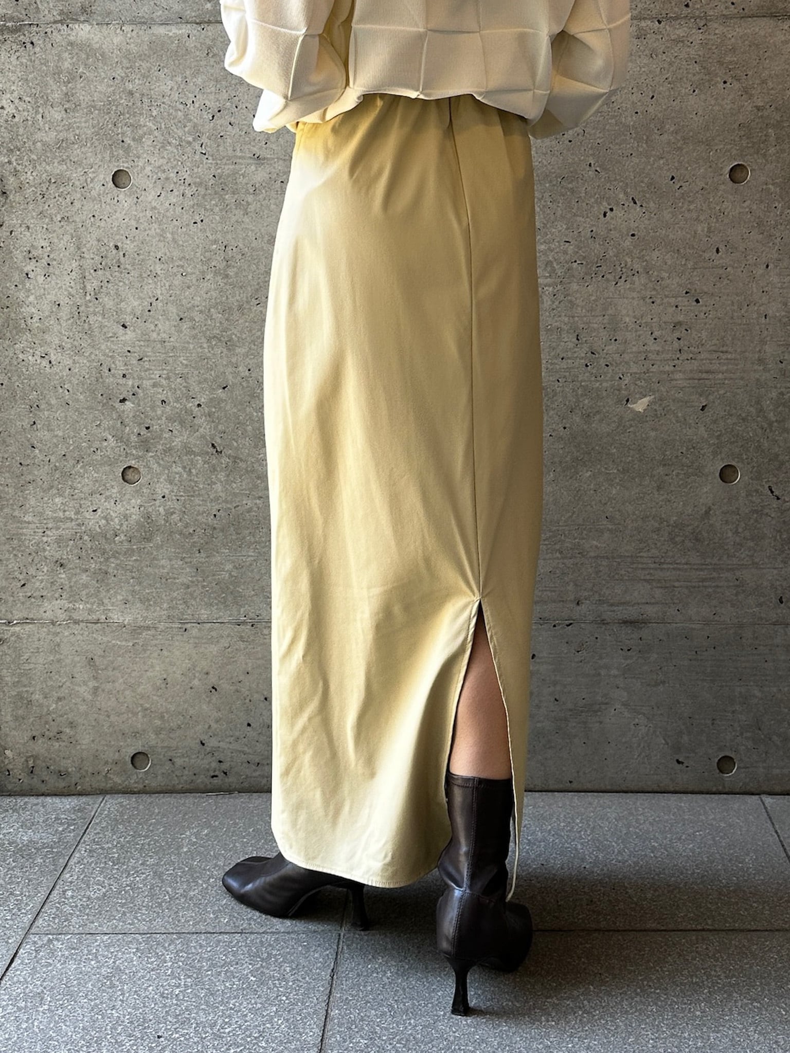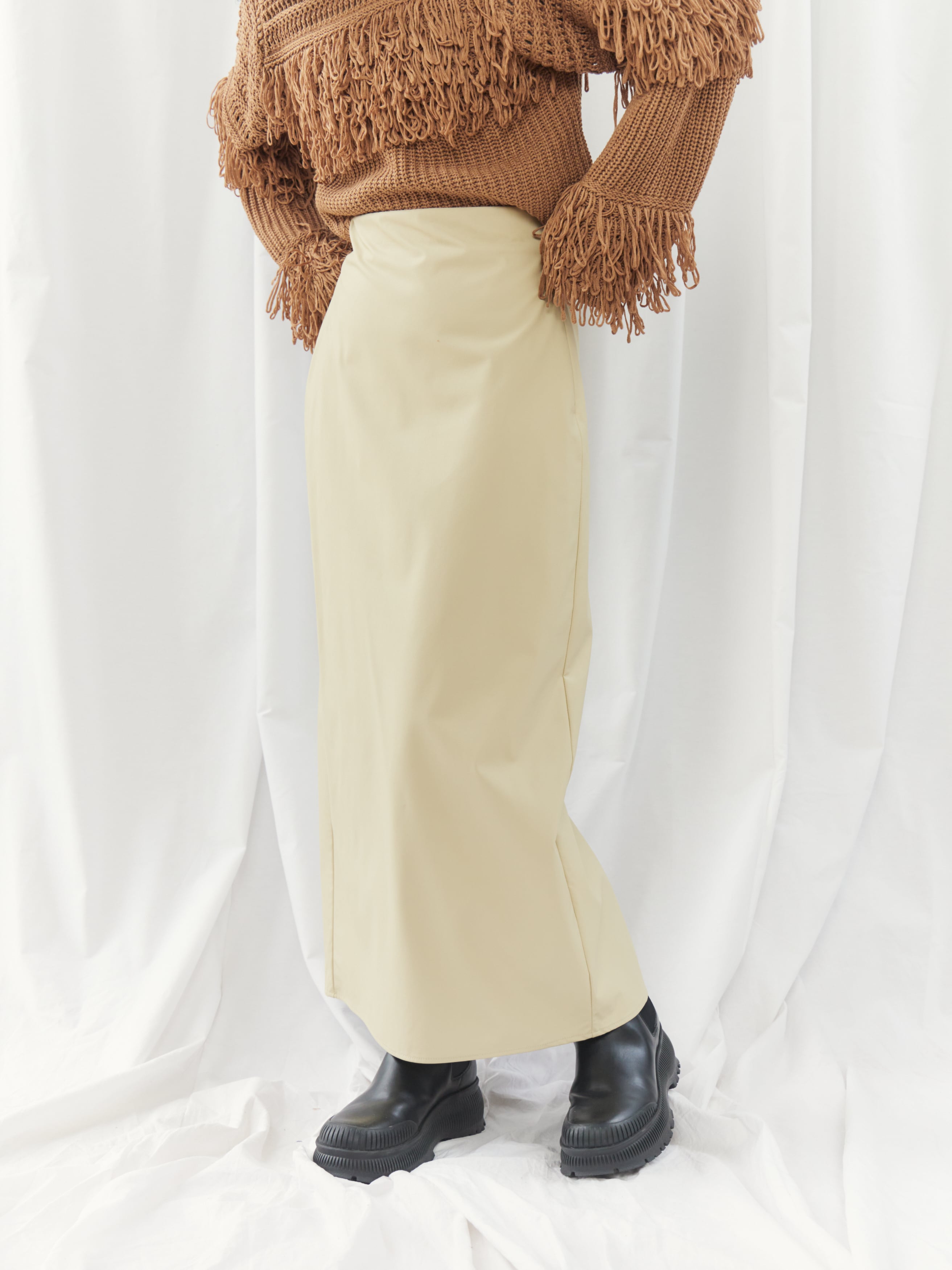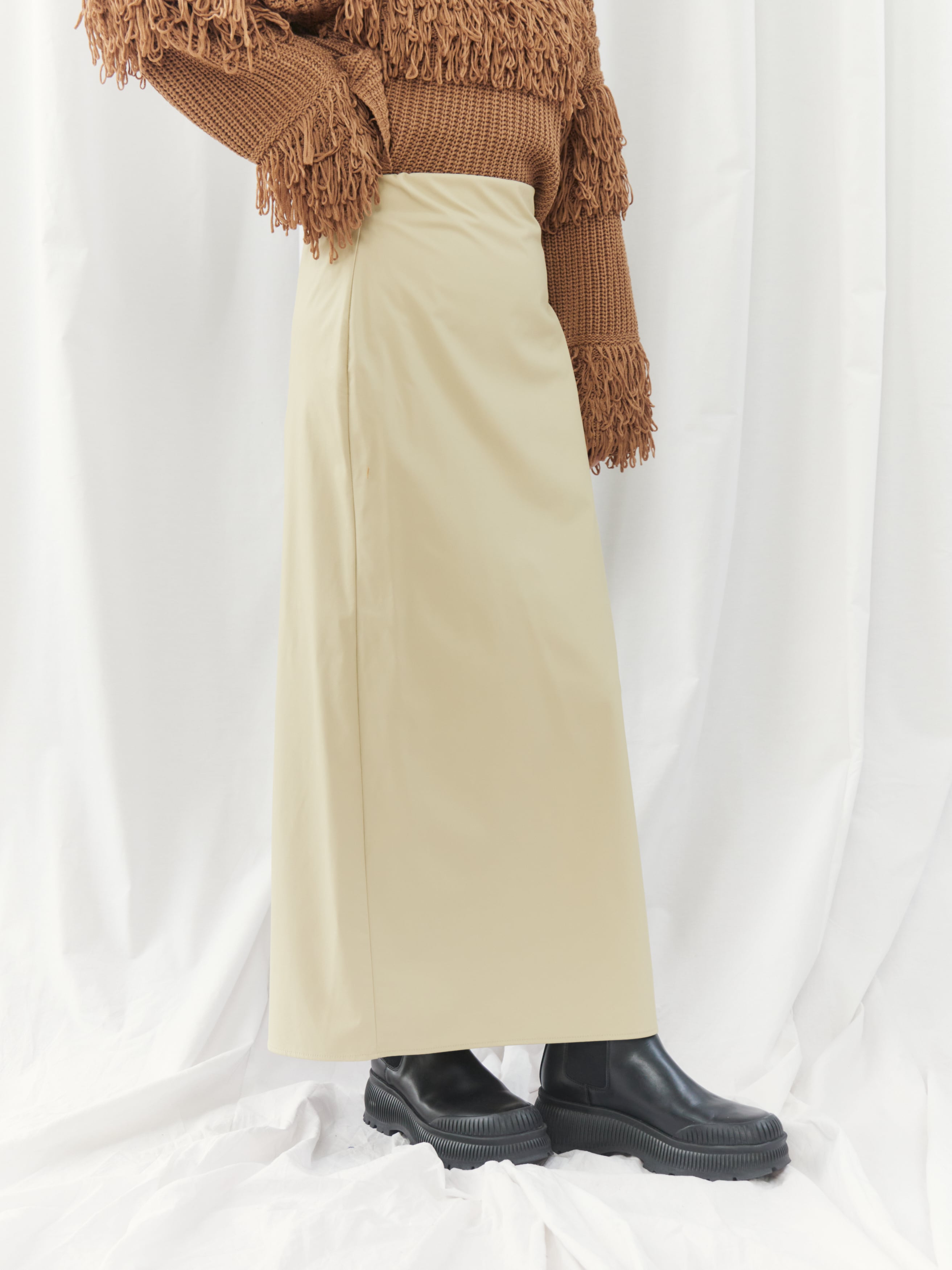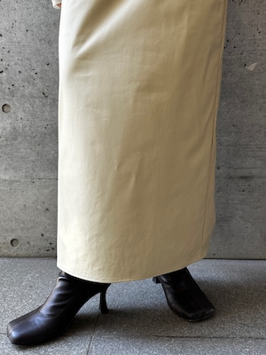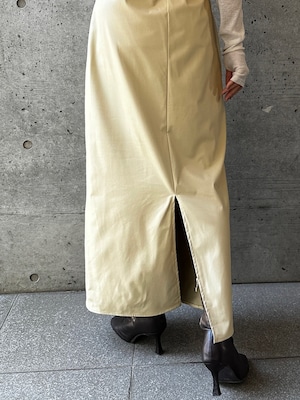 程よくマットな質感のウォッシャブルフェイクレザーを使用した、上品なIラインスカート。身体に沿いすぎないシルエットで、ボディラインを拾いすぎず安心感のある穿き心地です。バックスリット入りで足さばきが良く、女性らしい抜け感もプラスしています。ウエストはゴム仕様で、見た目以上にリラックスした着用感。サイドのコンシールファスナーが、ウエストやヒップ周りをすっきりと見せながら、着脱のしやすさも兼ね備えています。シーズンレスで活躍する、ワードローブに取り入れたい万能スカートです。