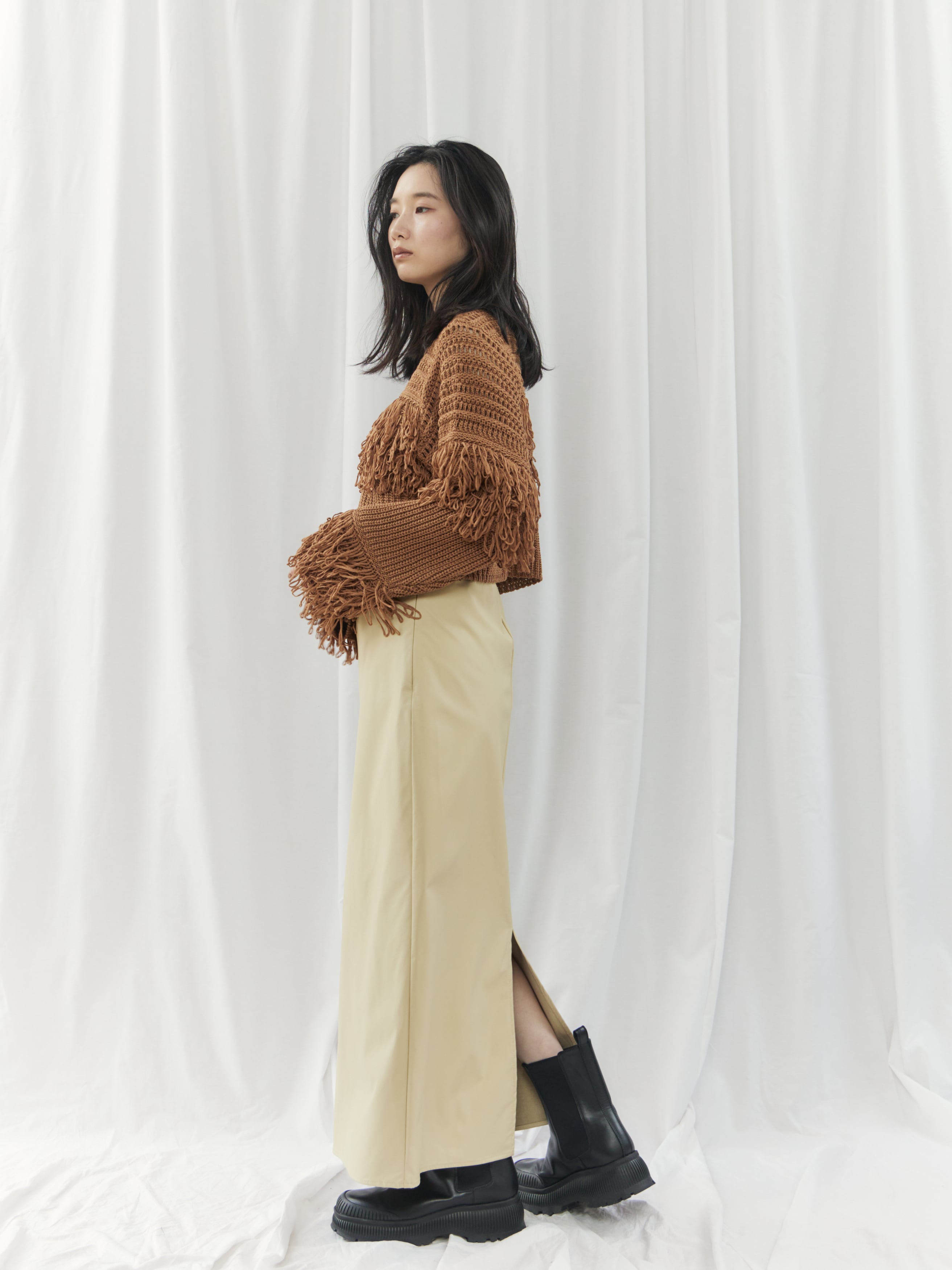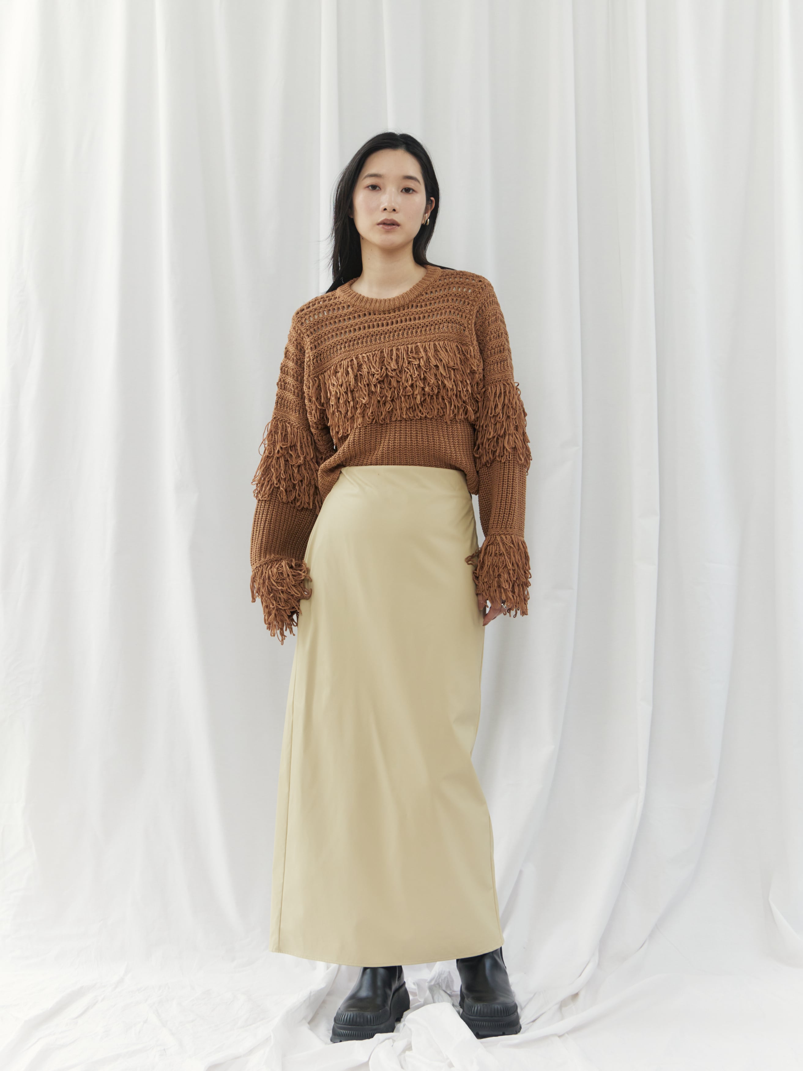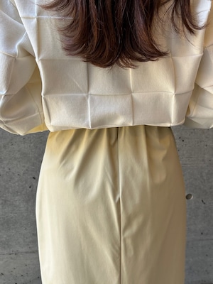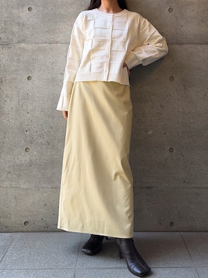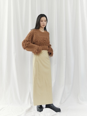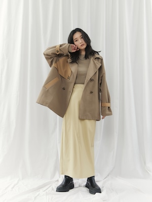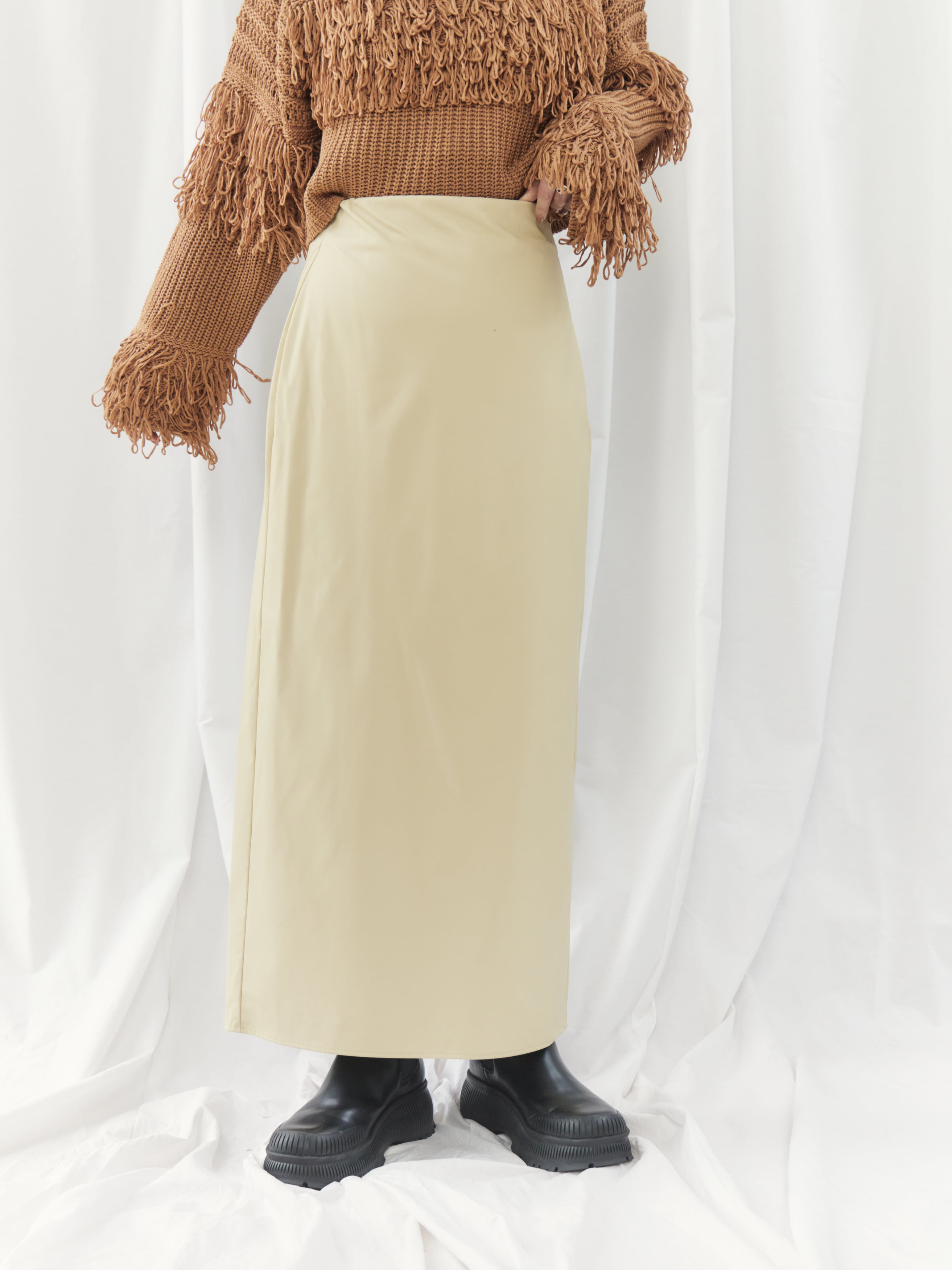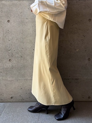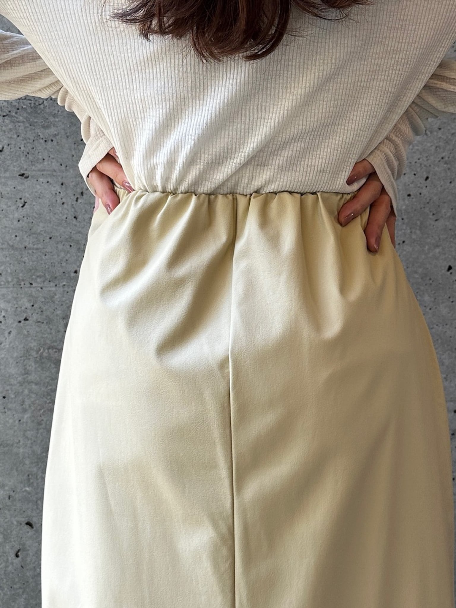 程よくマットな質感のウォッシャブルフェイクレザーを使用した、上品なIラインスカート。身体に沿いすぎないシルエットで、ボディラインを拾いすぎず安心感のある穿き心地です。バックスリット入りで足さばきが良く、女性らしい抜け感もプラスしています。ウエストはゴム仕様で、見た目以上にリラックスした着用感。サイドのコンシールファスナーが、ウエストやヒップ周りをすっきりと見せながら、着脱のしやすさも兼ね備えています。シーズンレスで活躍する、ワードローブに取り入れたい万能スカートです。