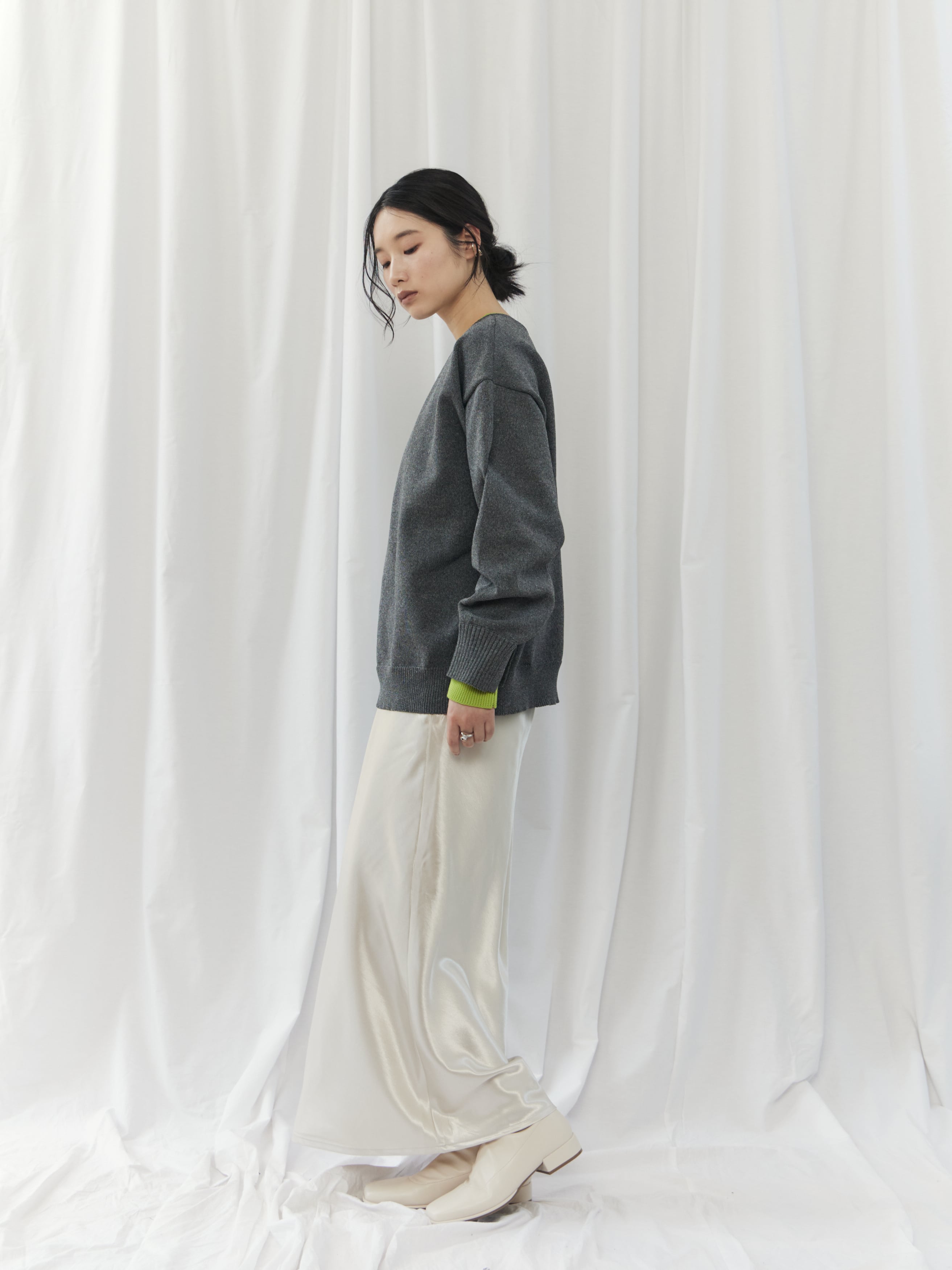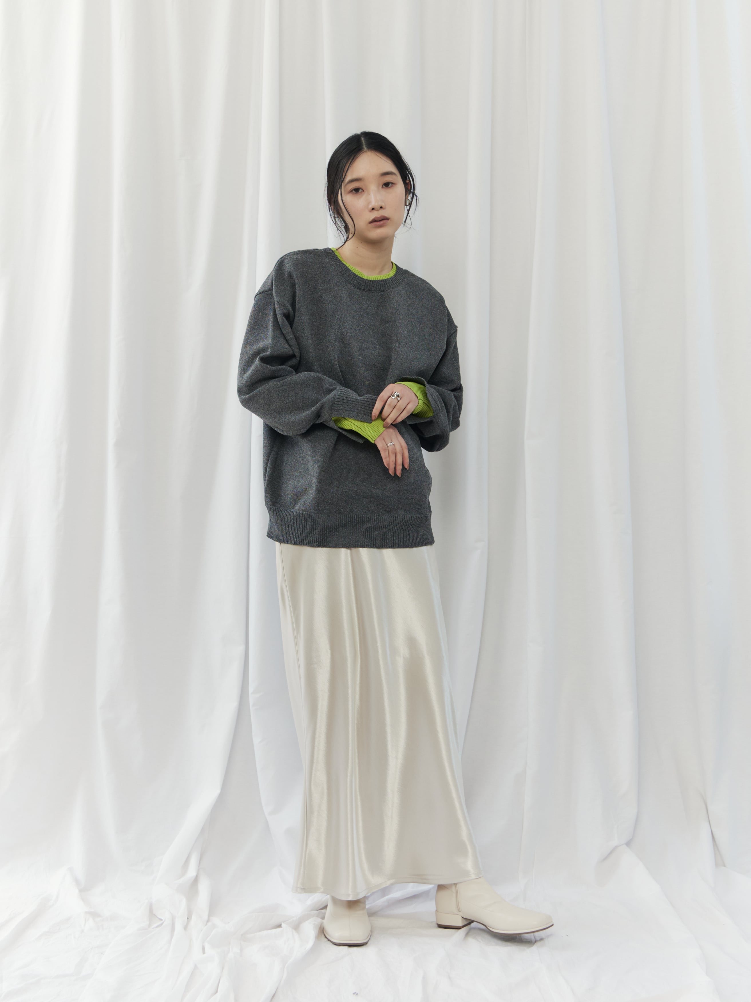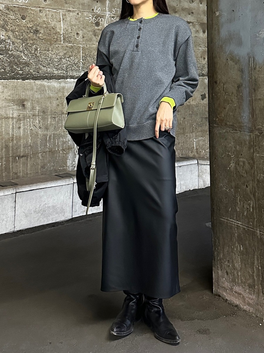 ややゆとりのあるシルエットなので、ウエストインやショート丈ボトムで重心アップを。レイヤードで柔らかさをプラスすると、よりバランス良く着こなせます。