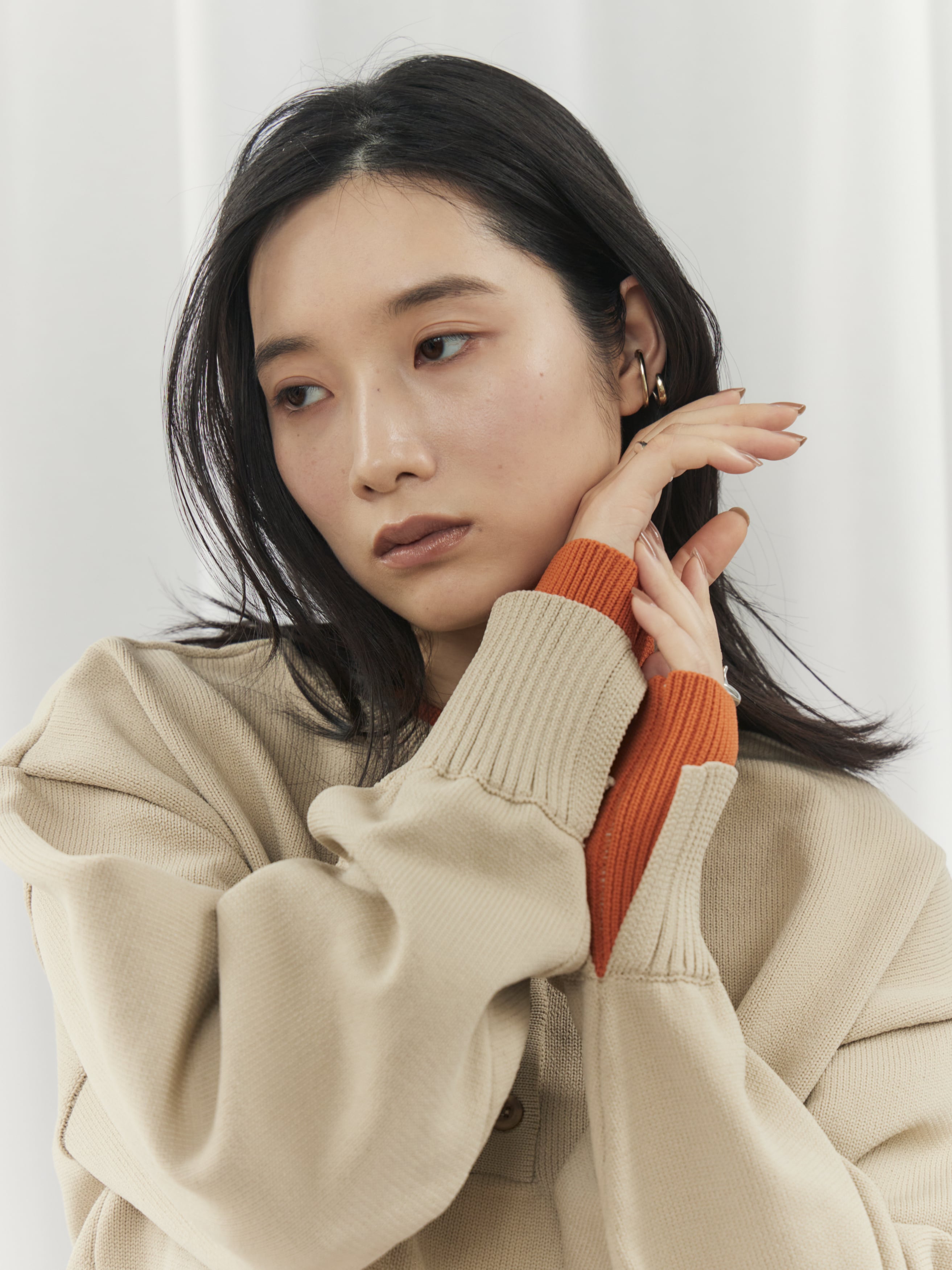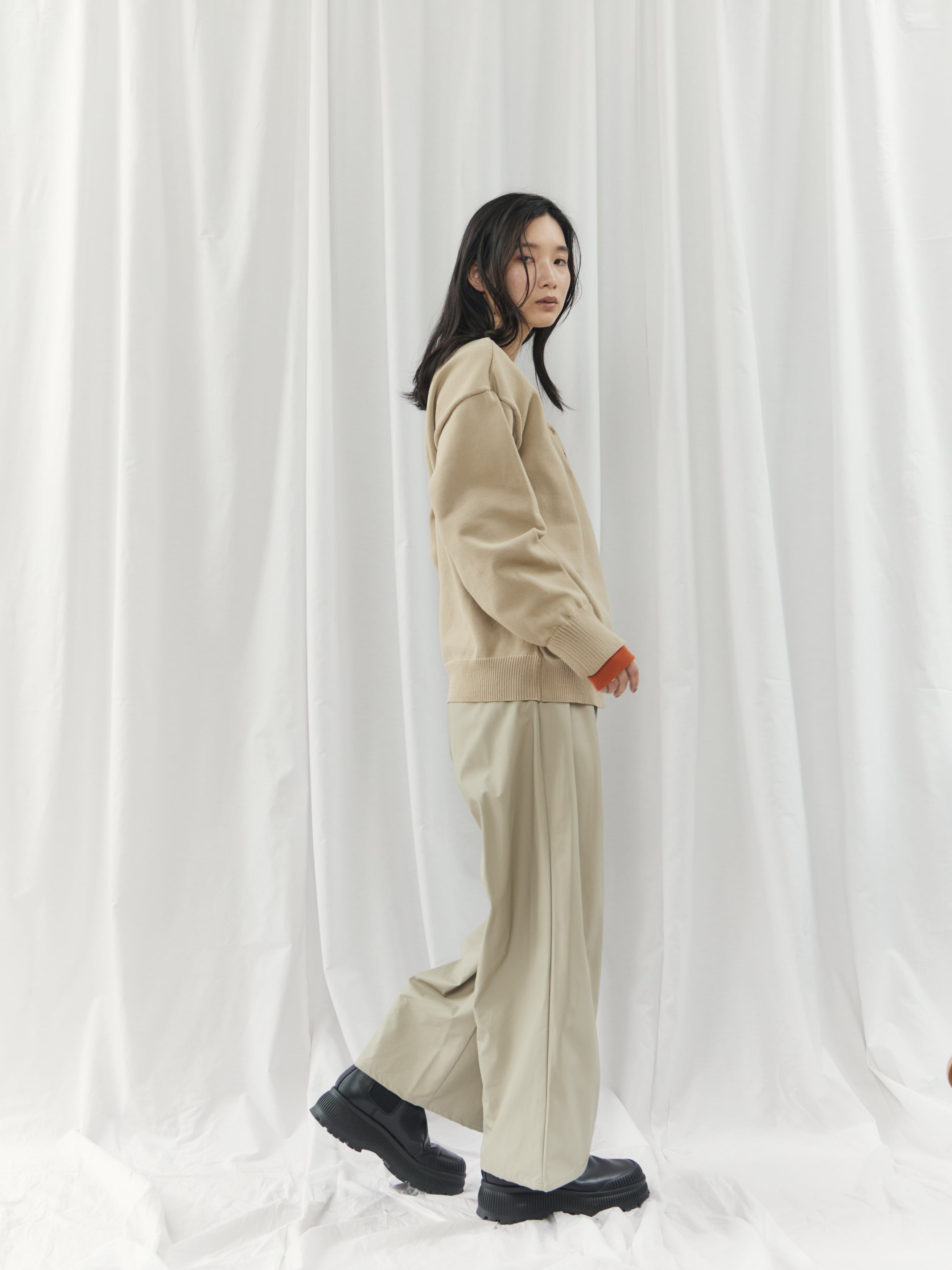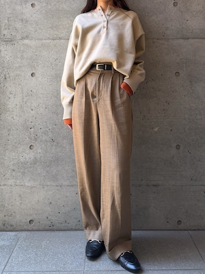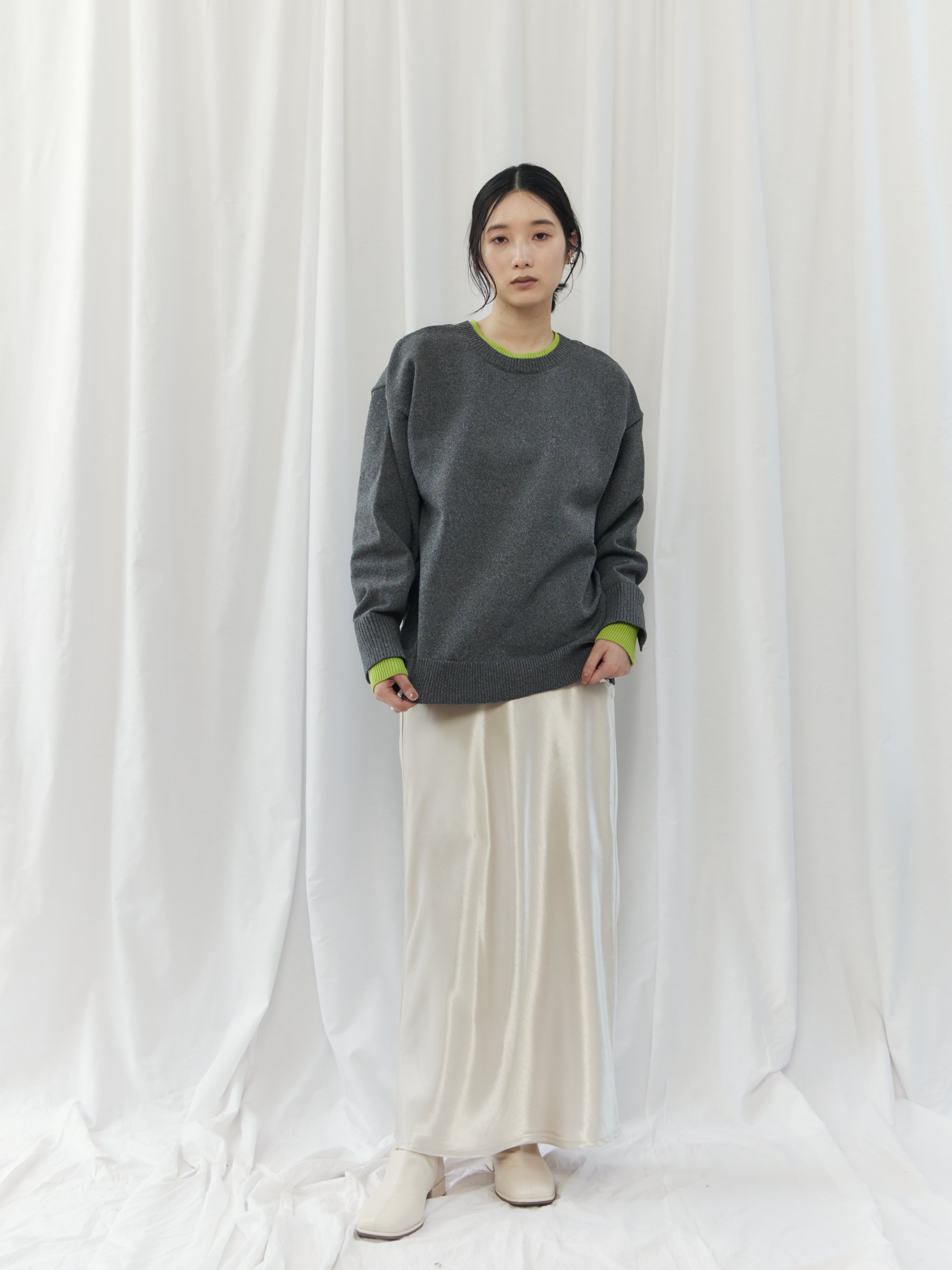 ややゆとりのあるシルエットなので、ウエストインやショート丈ボトムで重心アップを。レイヤードで柔らかさをプラスすると、よりバランス良く着こなせます。