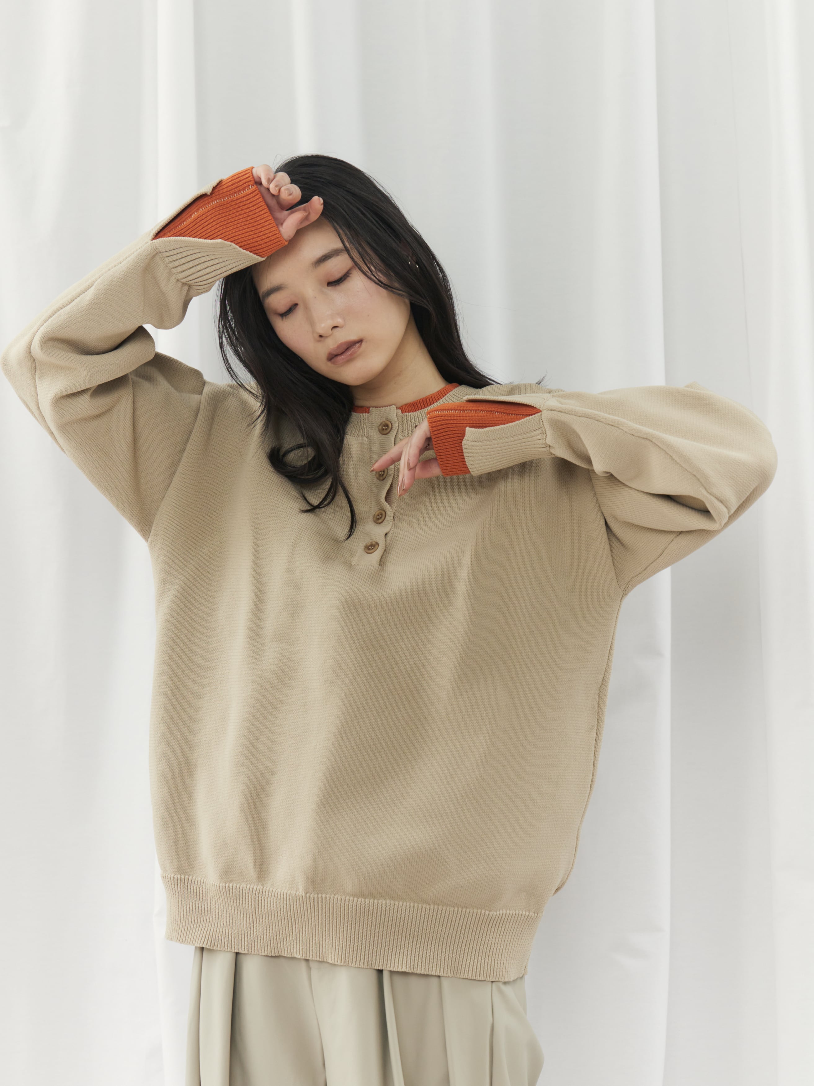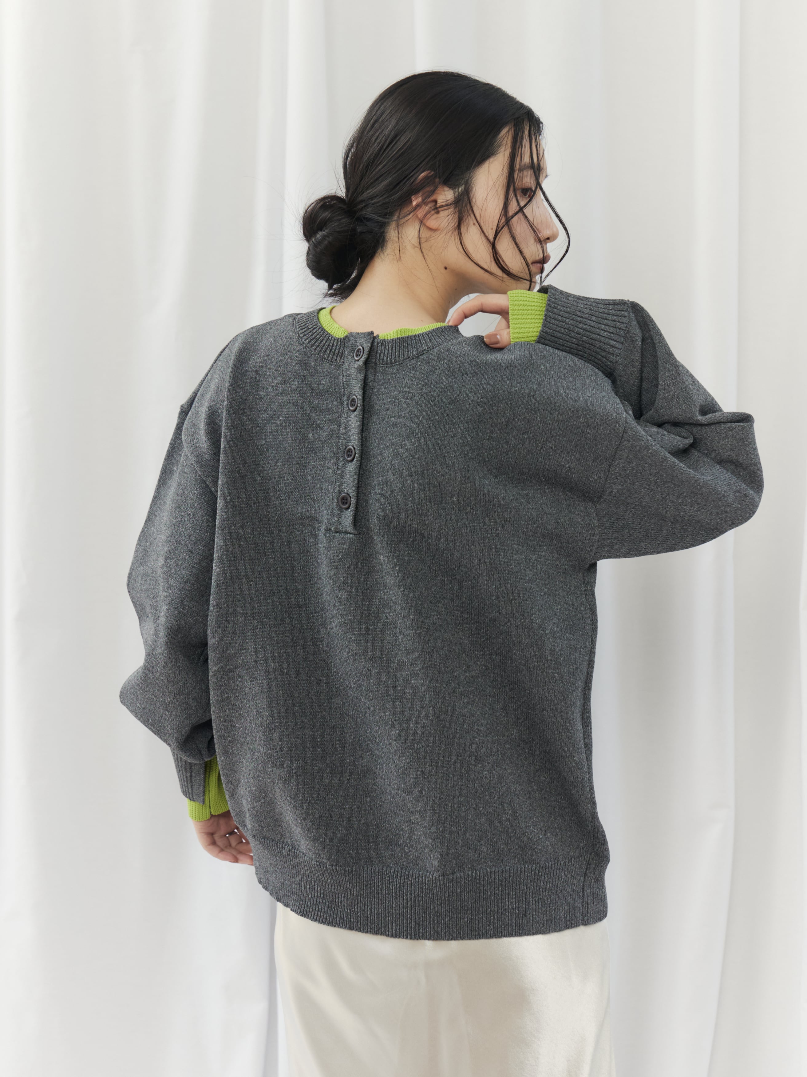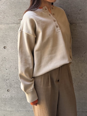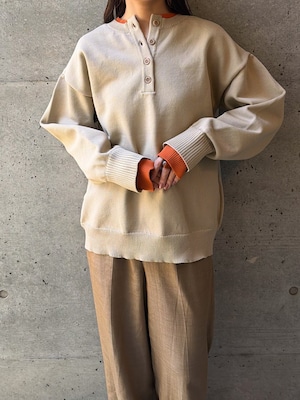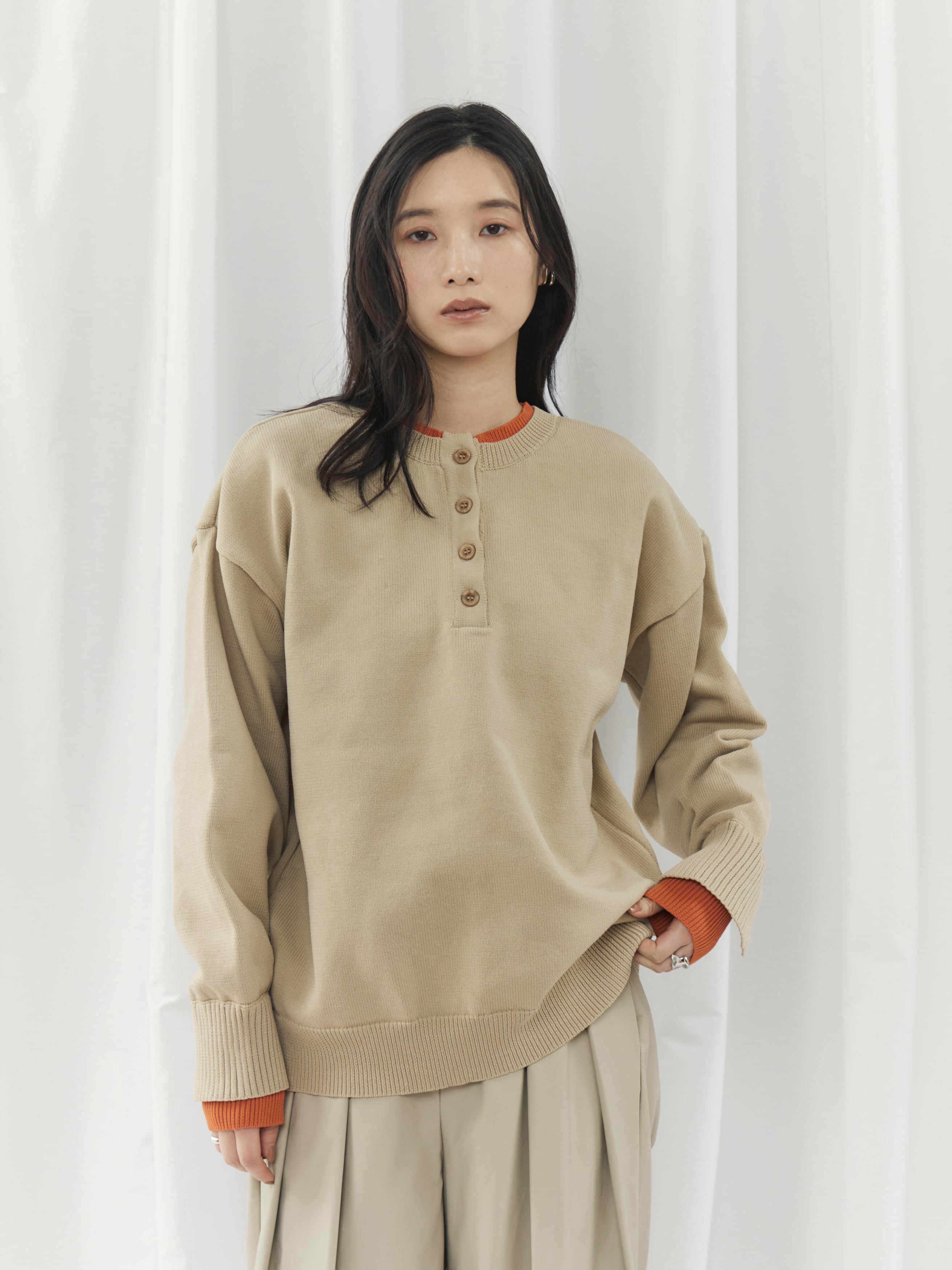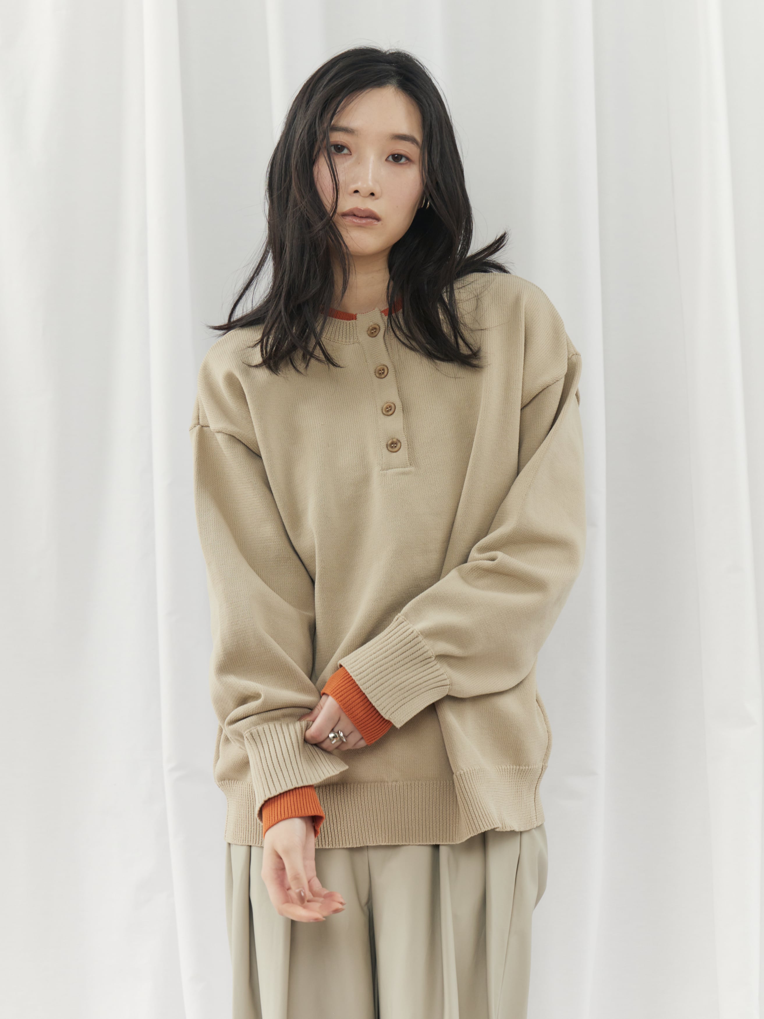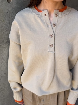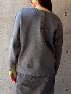 程よく力の抜けた雰囲気が魅力の、ヘンリーネックニットトップス。フロントにあしらったボタンデザインが、シンプルな中にさりげないアクセントを添えます。ややゆとりのあるシルエットで身体のラインを拾いにくく、リラックス感のある着心地。ベーシックなデザインながら、インナーの配色がさりげなく覗くネックラインと袖口で、一枚着として重宝します。ボタンをバックにして前後2wayでの着用も可能。デイリーに取り入れやすく、ロングシーズン活躍してくれるニットトップスです。