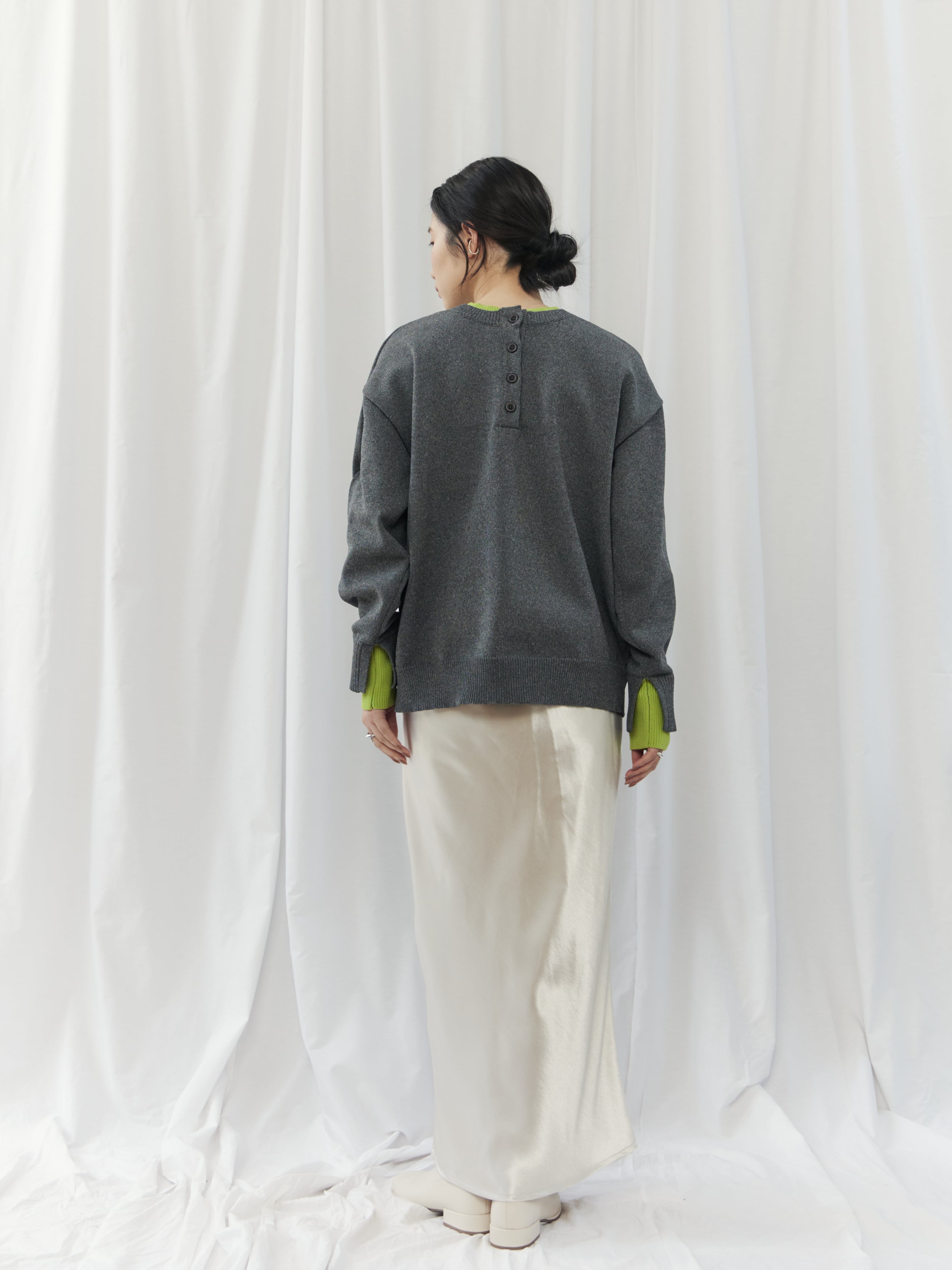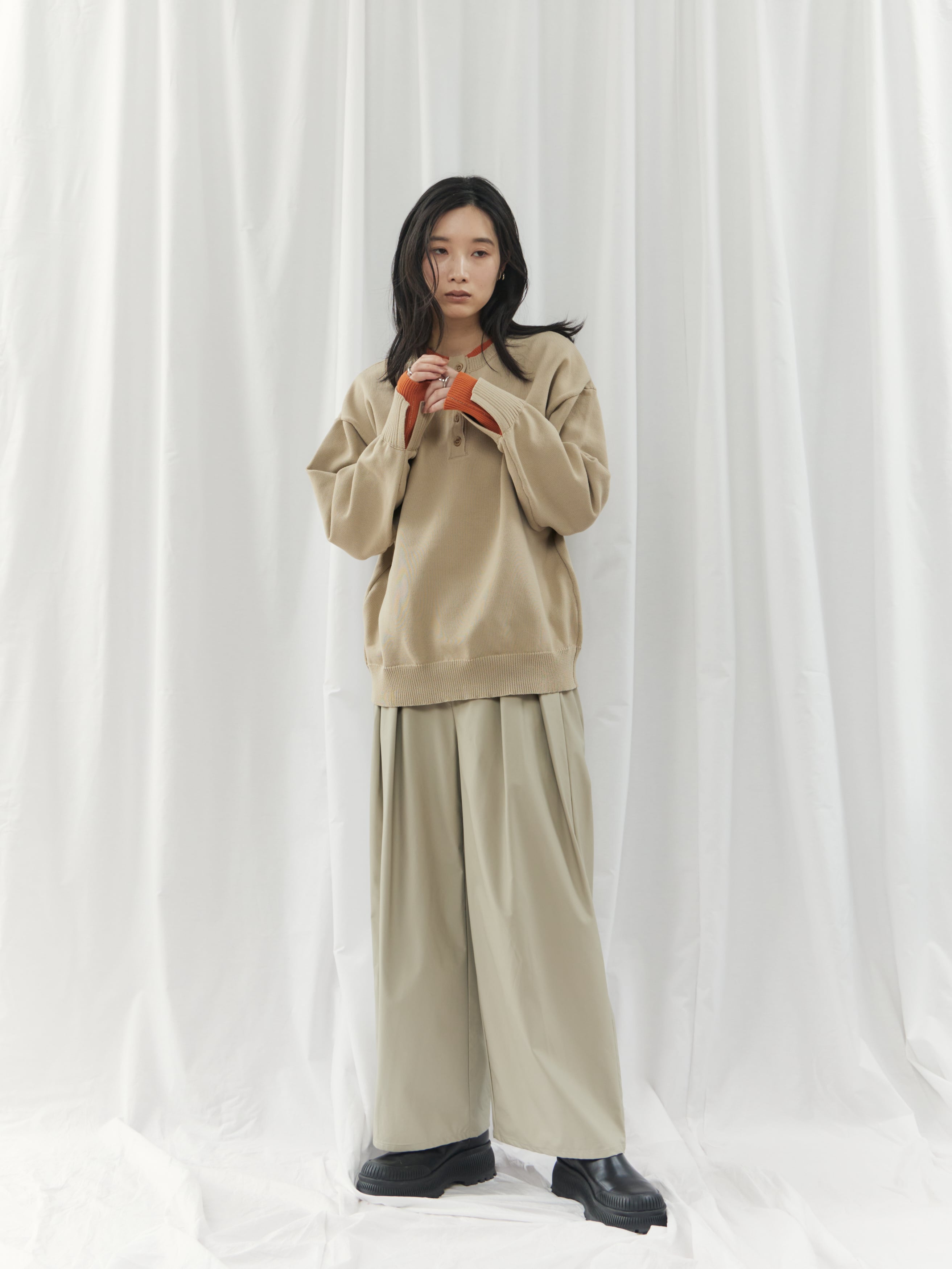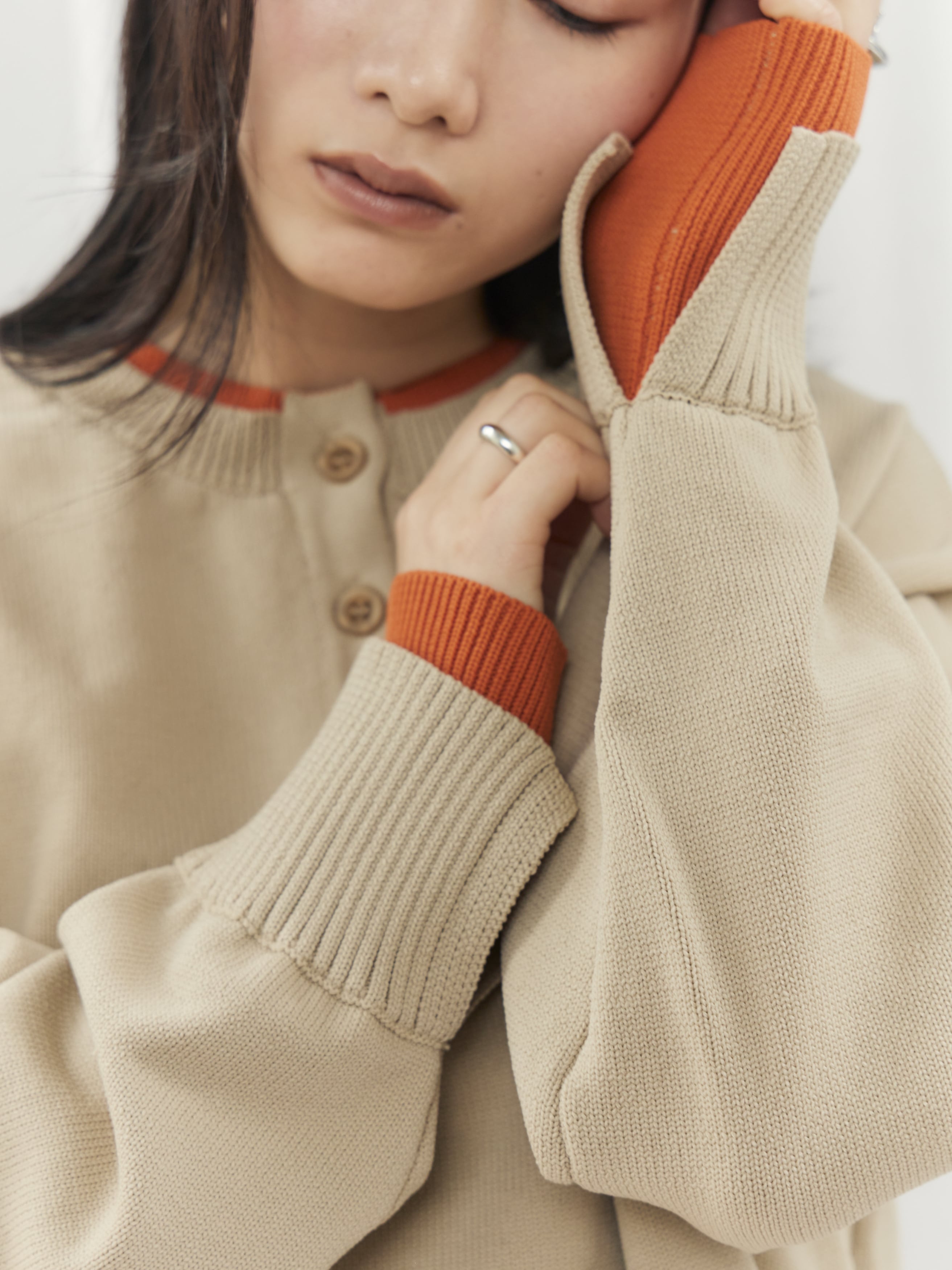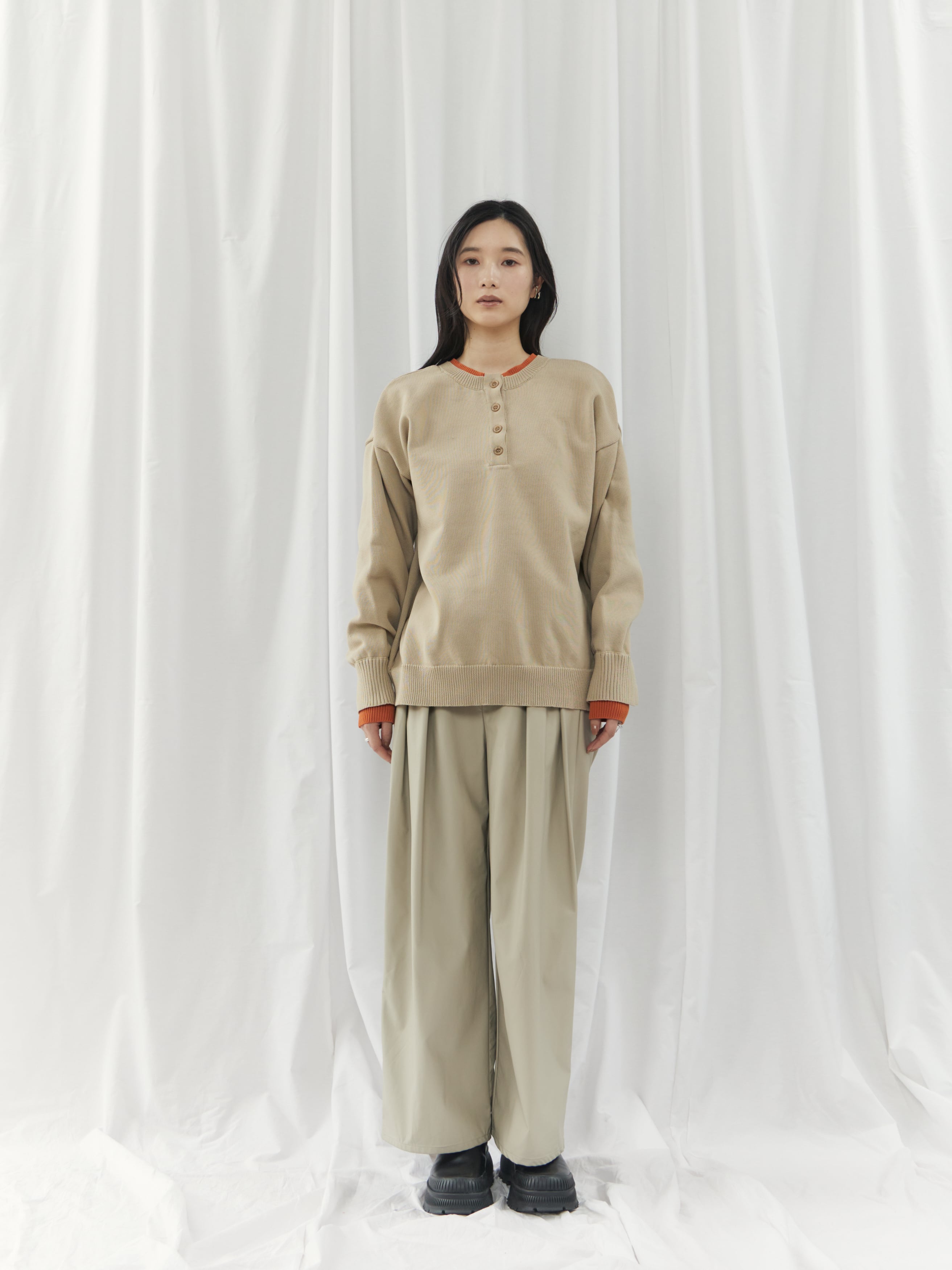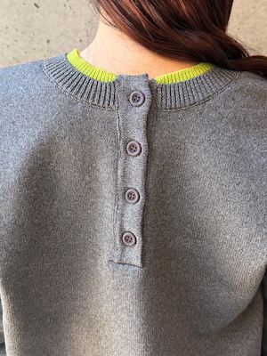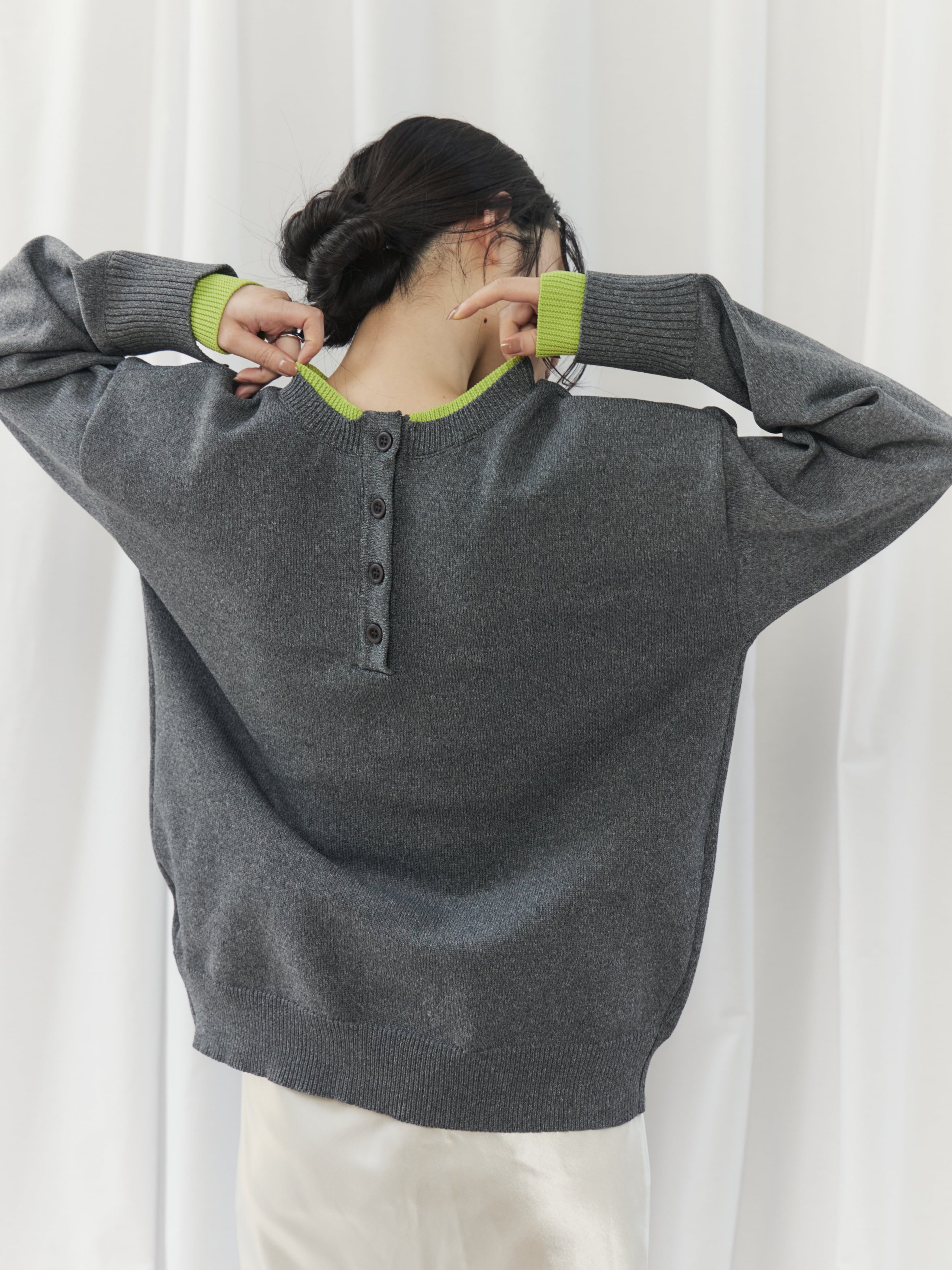 程よく力の抜けた雰囲気が魅力の、ヘンリーネックニットトップス。フロントにあしらったボタンデザインが、シンプルな中にさりげないアクセントを添えます。ややゆとりのあるシルエットで身体のラインを拾いにくく、リラックス感のある着心地。ベーシックなデザインながら、インナーの配色がさりげなく覗くネックラインと袖口で、一枚着として重宝します。ボタンをバックにして前後2wayでの着用も可能。デイリーに取り入れやすく、ロングシーズン活躍してくれるニットトップスです。