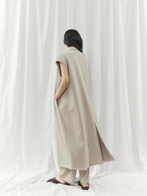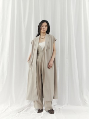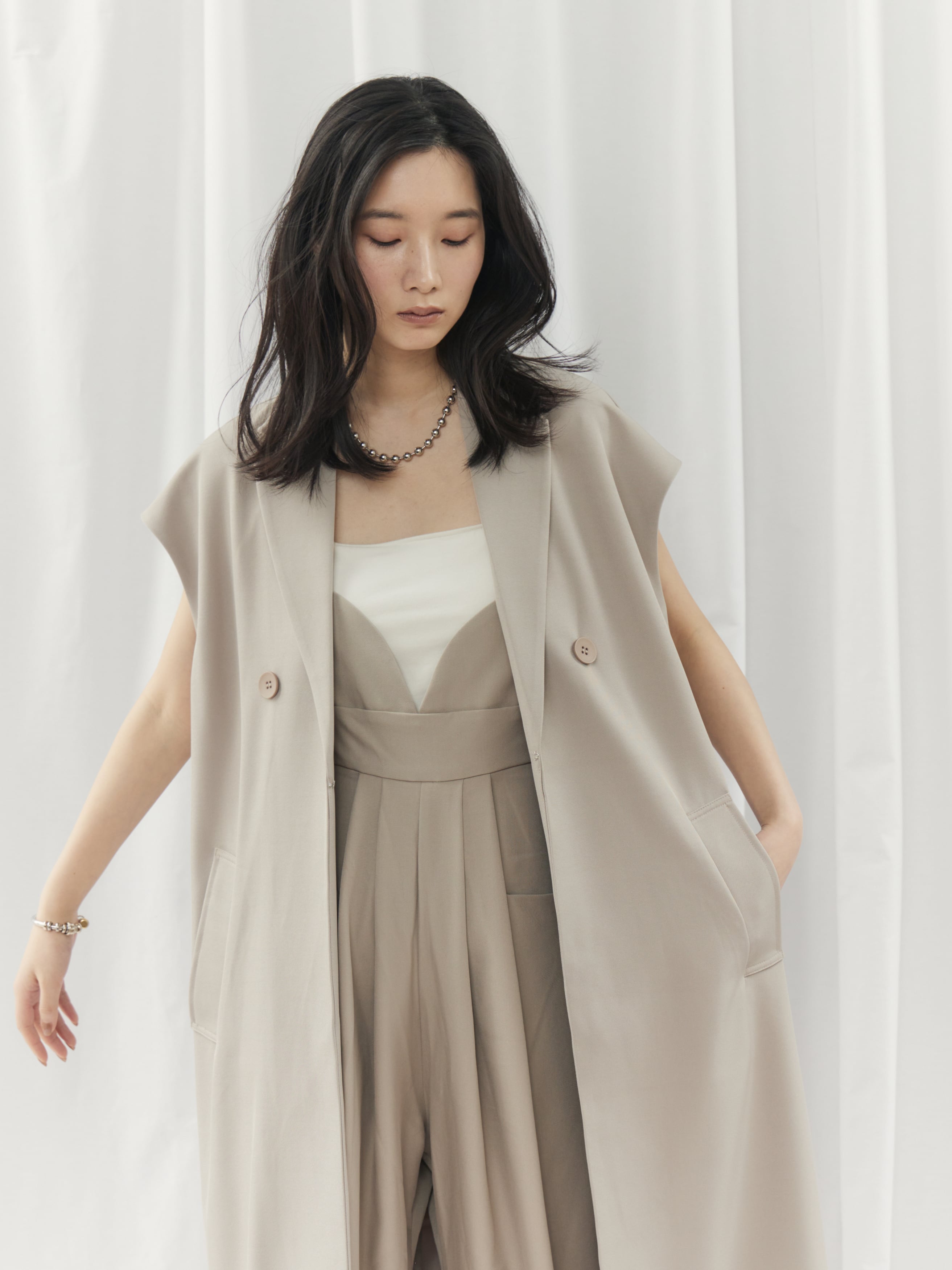CAMI ALL IN ONE(キャミオールインワン)【3776103】とのセットアップ着用で、オケージョン用としてもおすすめです。インナーにシアートップスやハイゲージニット、センタープレスパンツを合わせたオフィスコーデも◎ 足元はヒールやレザーシューズで、都会的な印象に。OFFコーデはロングTシャツや薄手スウェット、デニムと合わせて程よくラフなスタイリングに。ジレの縦ラインがカジュアルアイテムを大人顔にまとめてくれます。