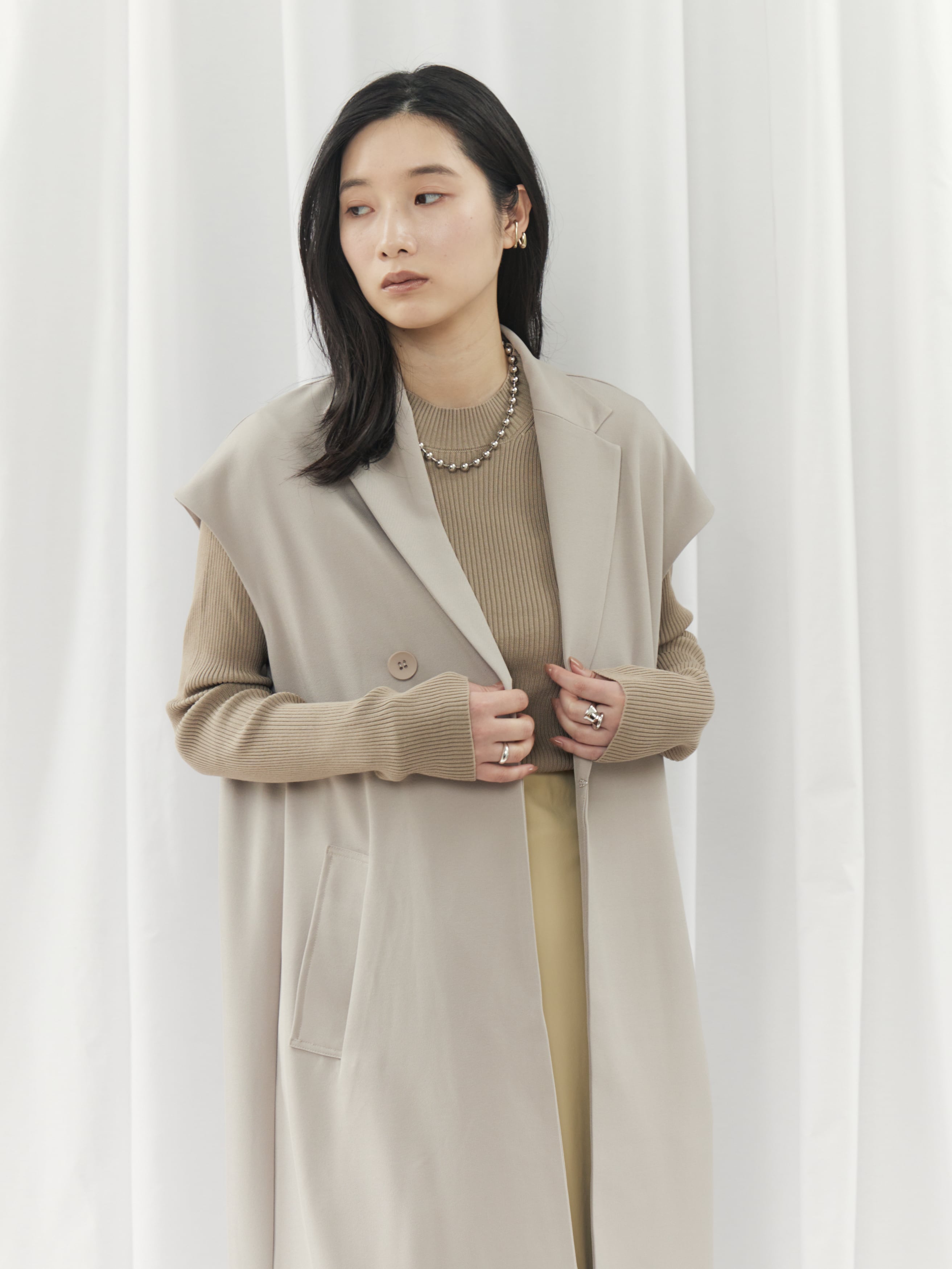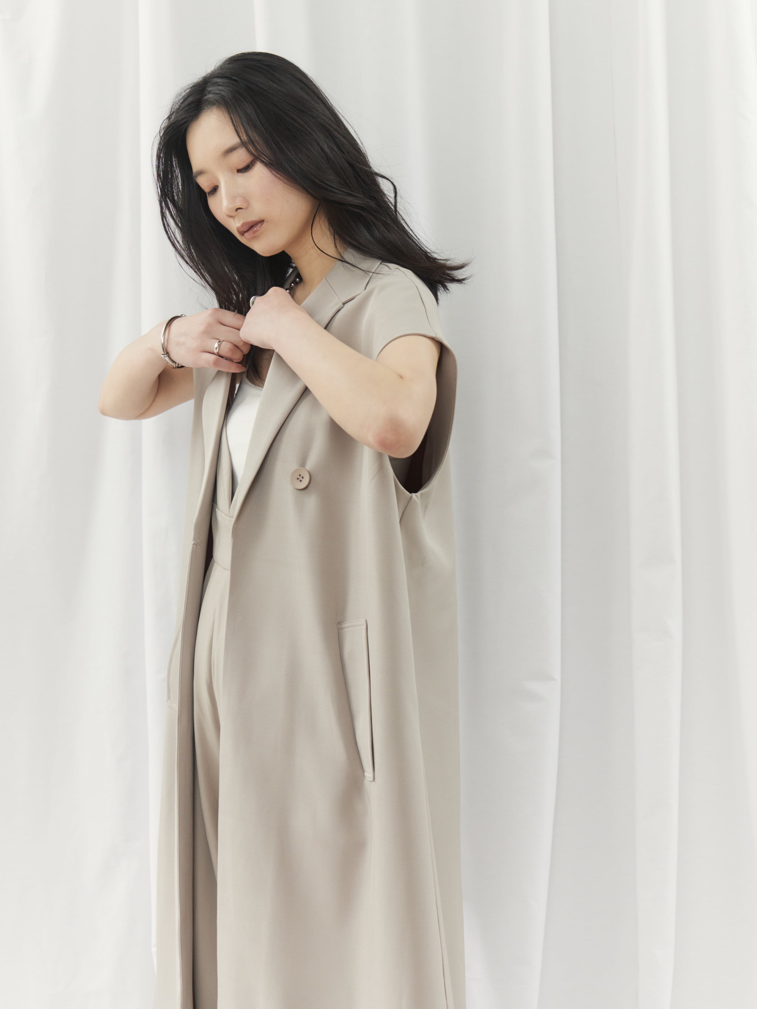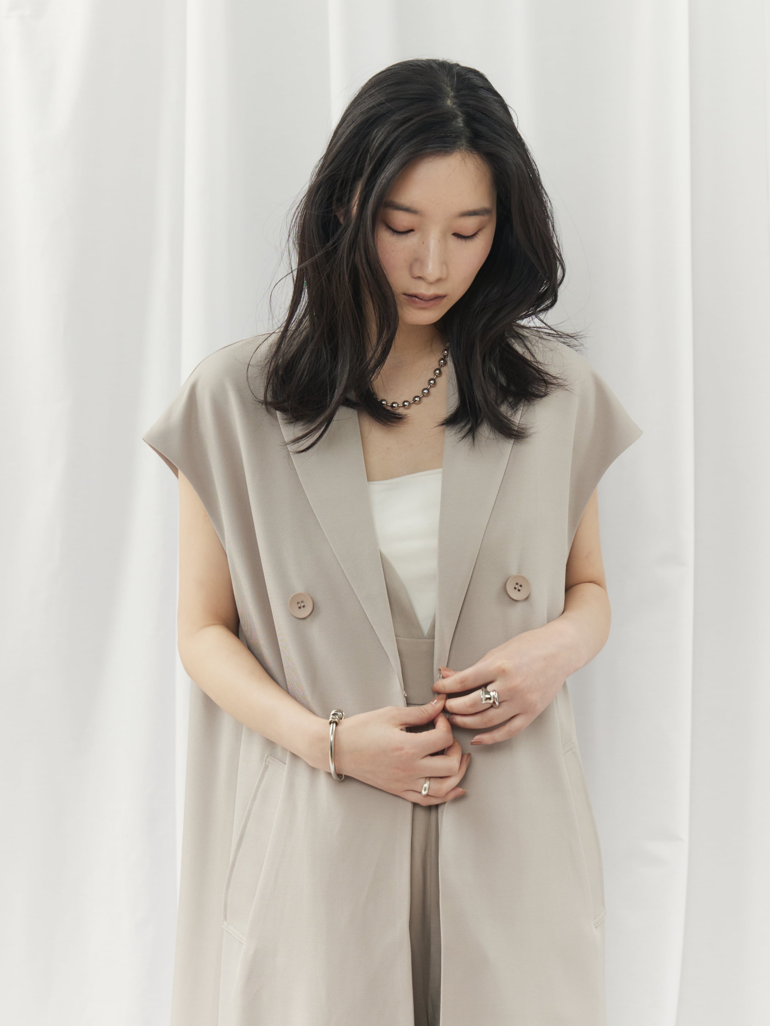 フロントはダブル仕様で、きちんと感がありながらも、ジレならではの抜け感で堅くなりすぎないのが魅力。さらっとした落ち感のある素材を使用しているため、重ね着してもすっきりと着こなせます。季節の変わり目にはアウター代わりとして、寒い時期にはコートインとしても活躍。いつものコーディネートにプラスするだけで、スタイリングを格上げしてくれる一着です。
