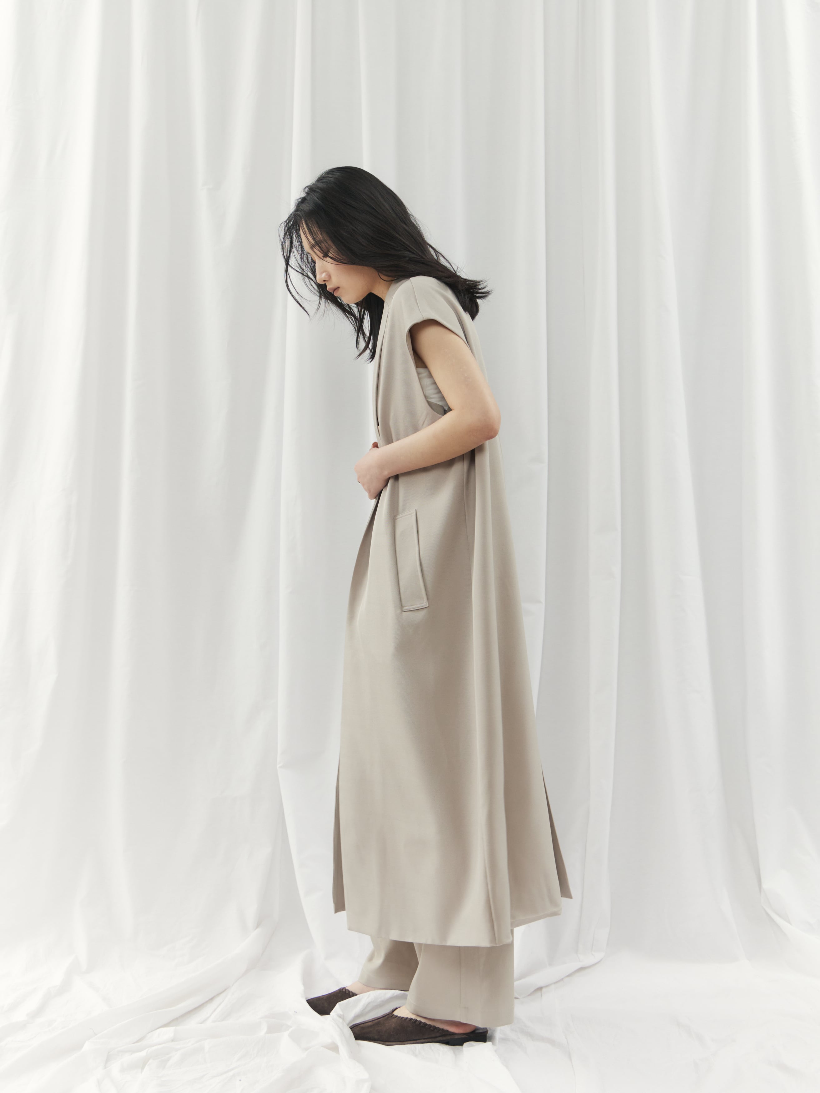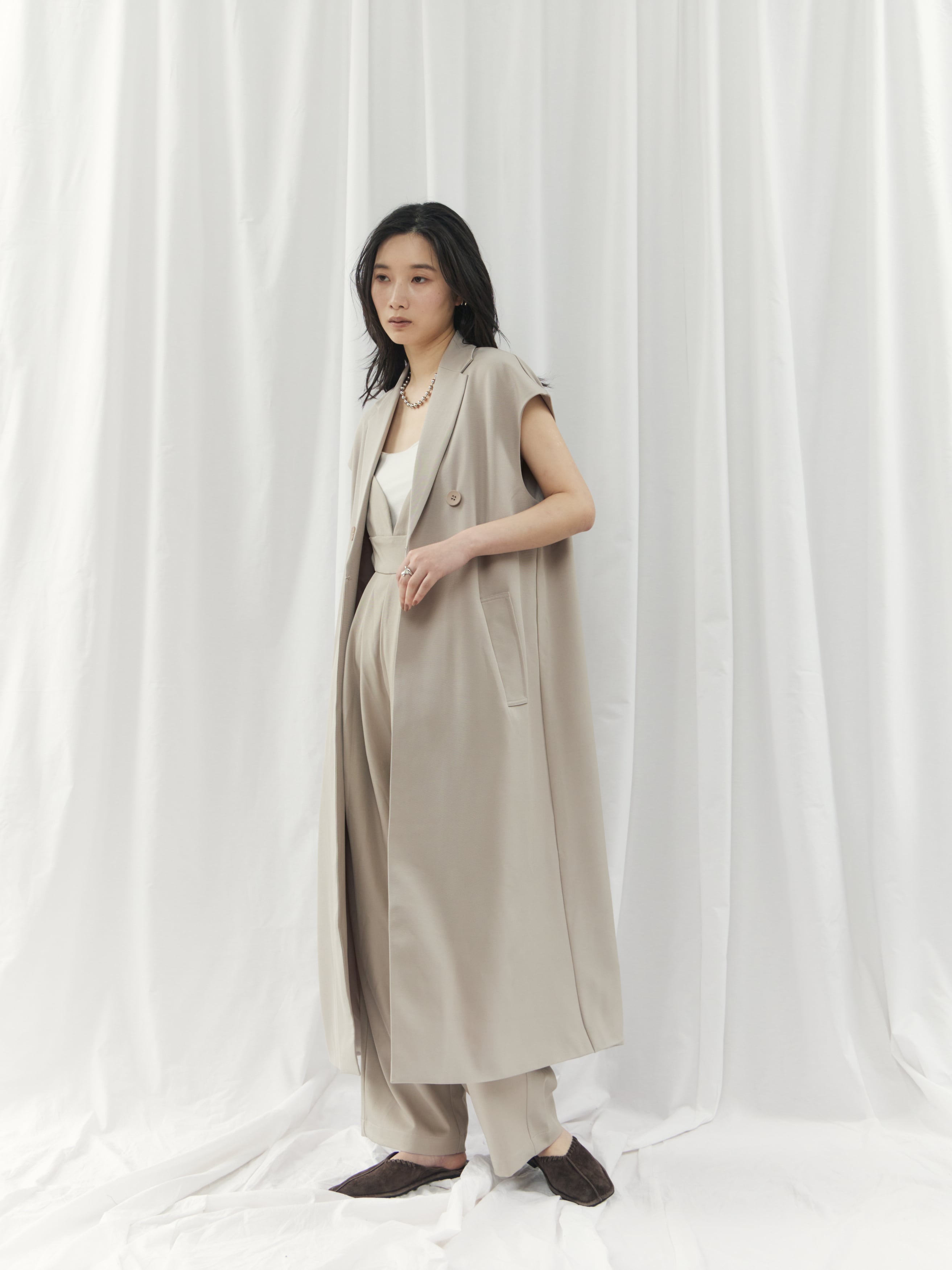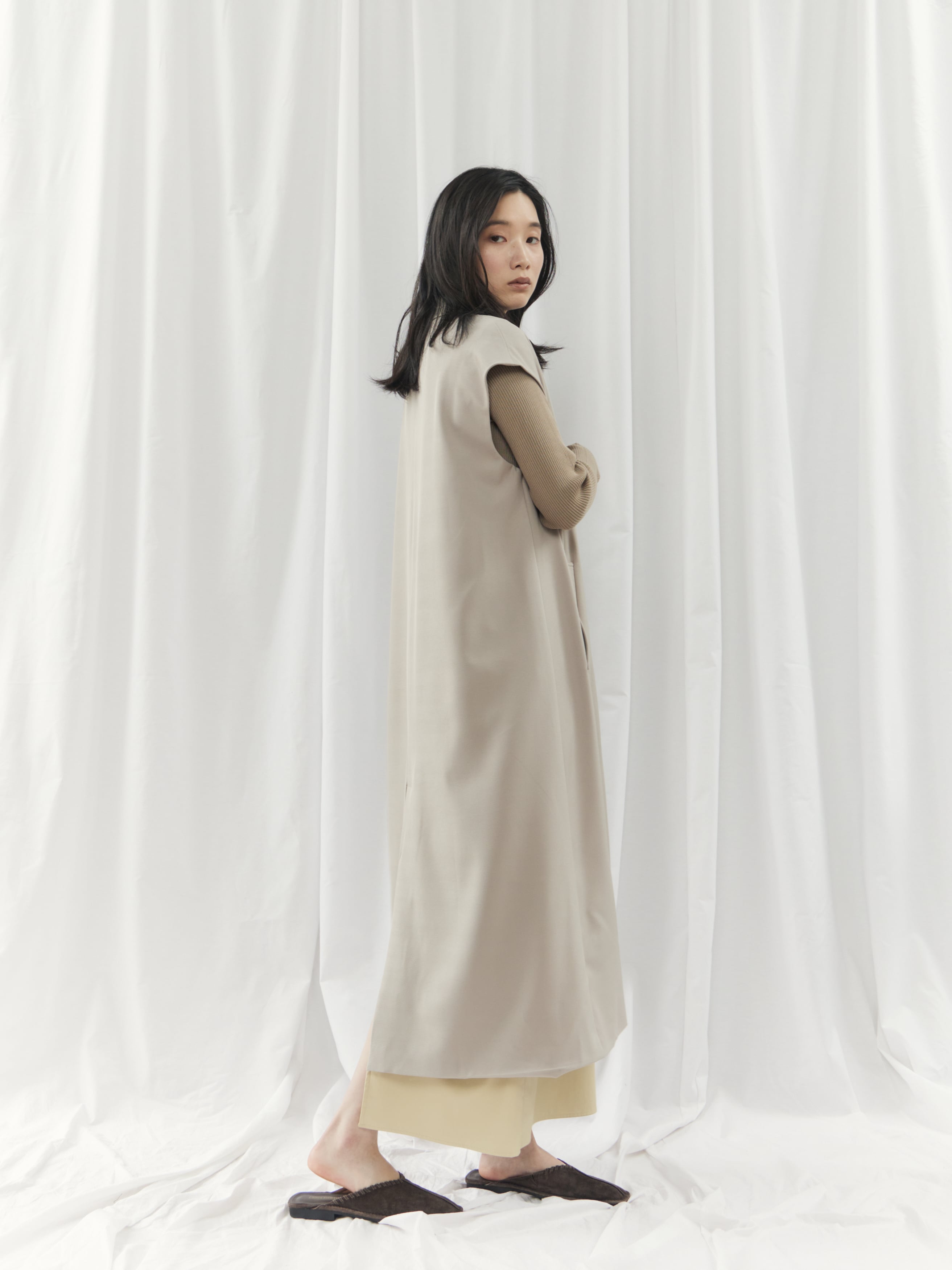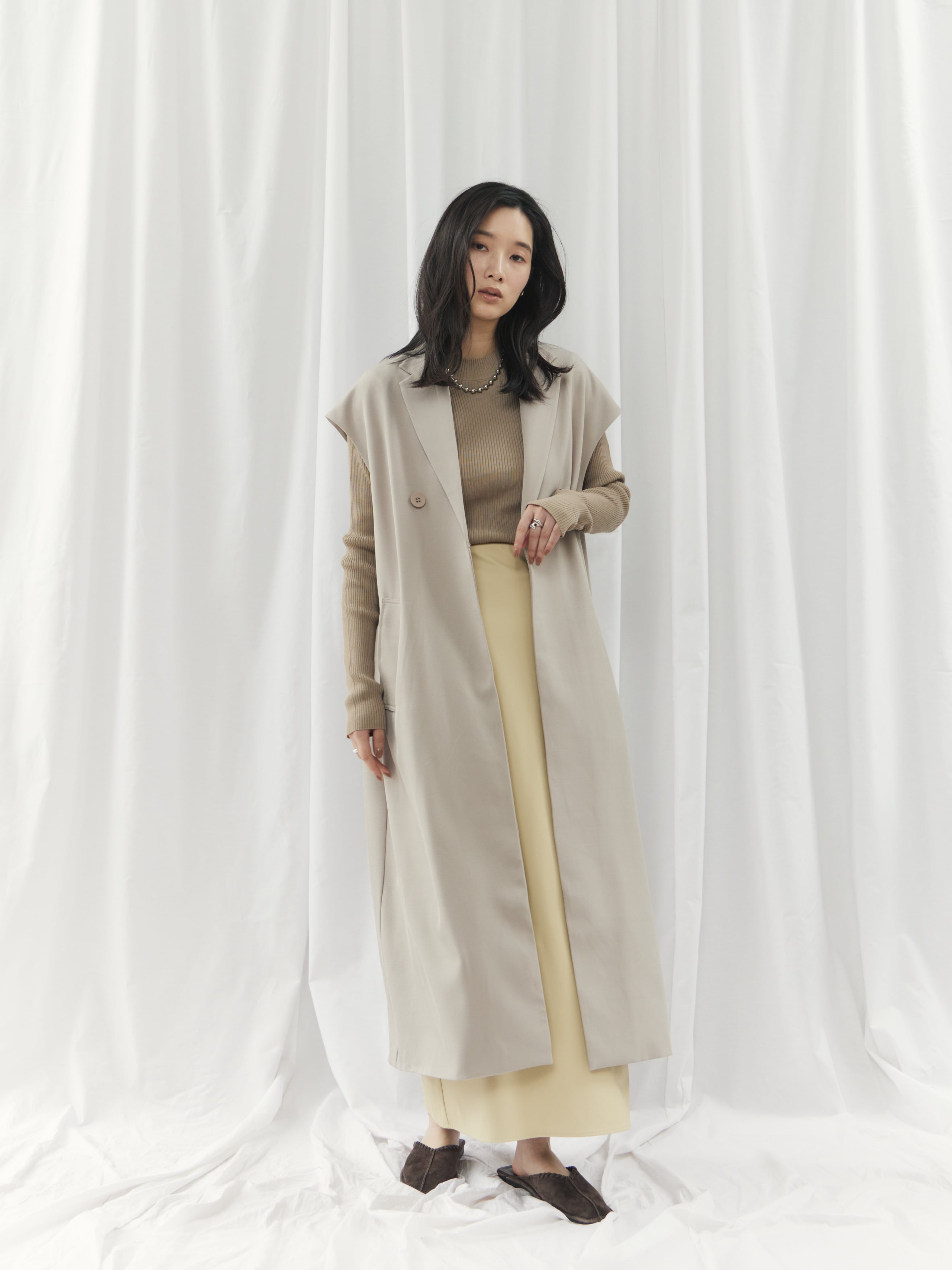 フロントはダブル仕様で、きちんと感がありながらも、ジレならではの抜け感で堅くなりすぎないのが魅力。さらっとした落ち感のある素材を使用しているため、重ね着してもすっきりと着こなせます。季節の変わり目にはアウター代わりとして、寒い時期にはコートインとしても活躍。いつものコーディネートにプラスするだけで、スタイリングを格上げしてくれる一着です。