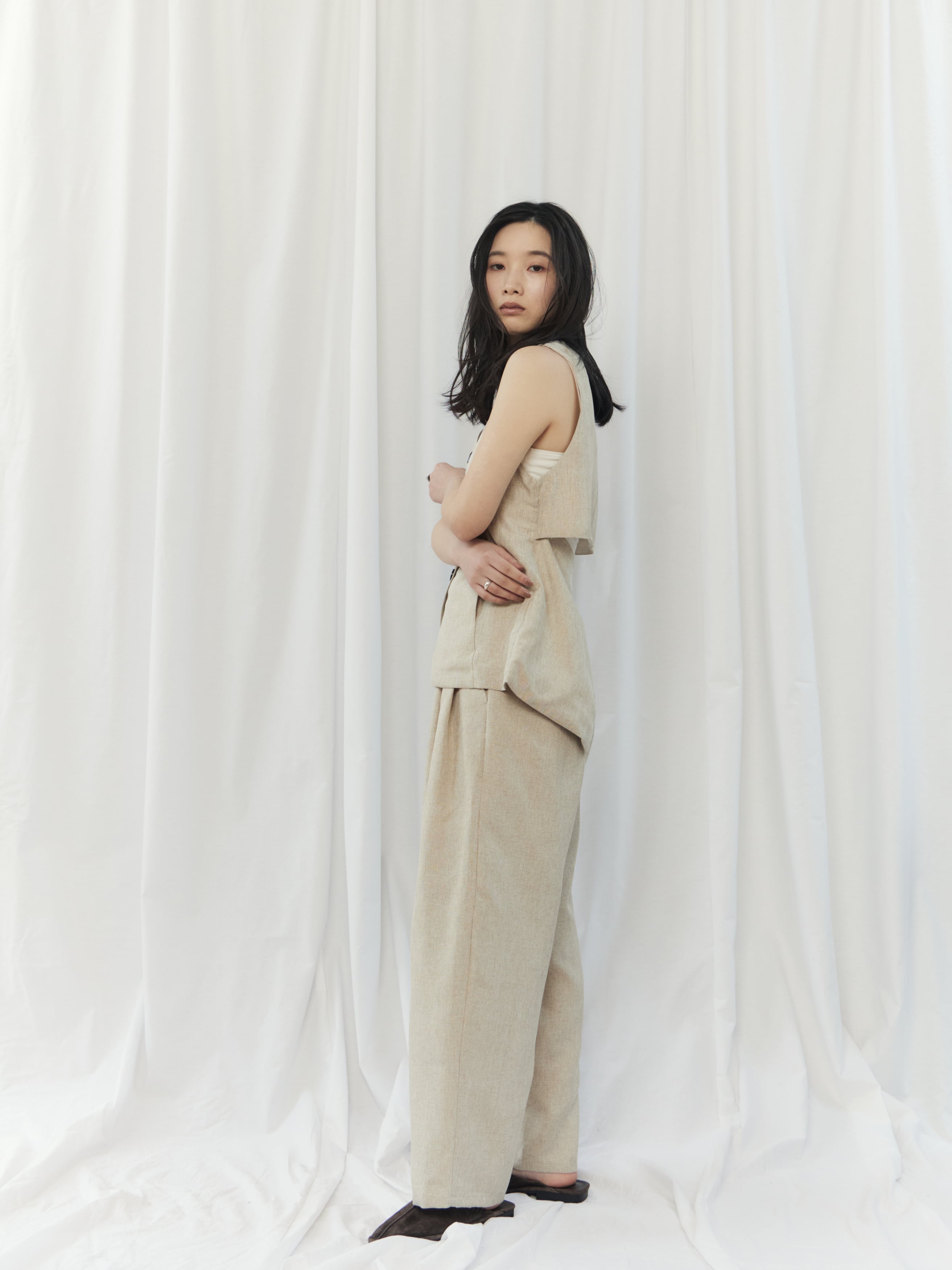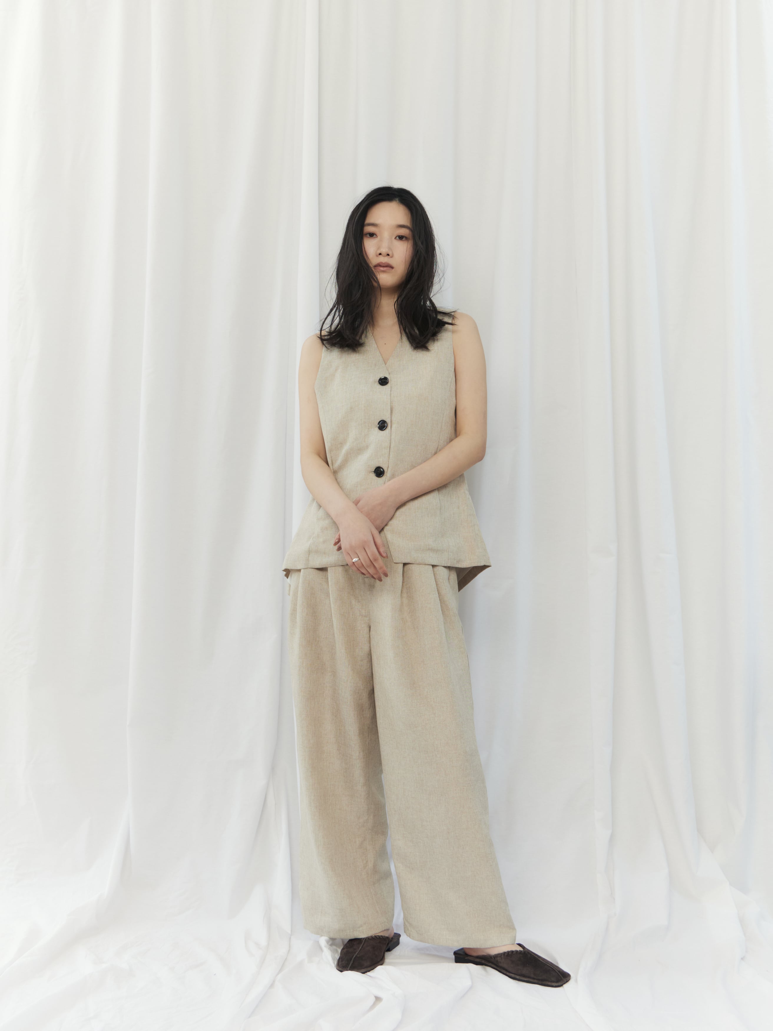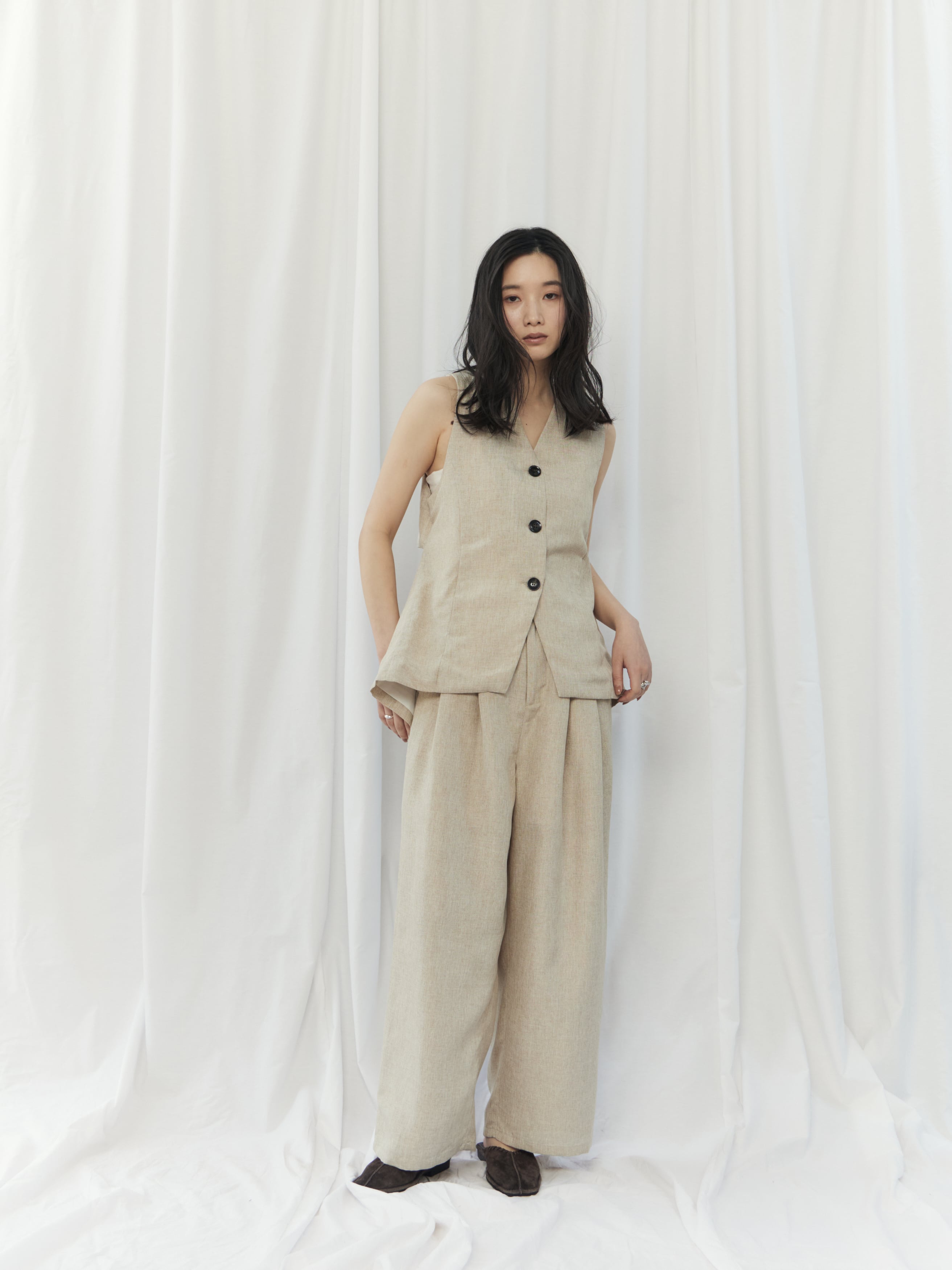 LINEN LIKE TWO-TUCK PANTS(リネンライクツータックパンツ)【3776100】とのセット着用がおすすめ。コンパクトなトップスやシアーインナーの上から重ねるだけで、スタイリングに立体感が生まれます。ワイドパンツやIラインスカートと合わせるとバランスが取りやすく、きれいめからモード寄りまで幅広い雰囲気に対応。インナーを変えることでロングシーズン活躍し、同素材パンツと合わせれば統一感のある洗練された着こなしが完成します。
