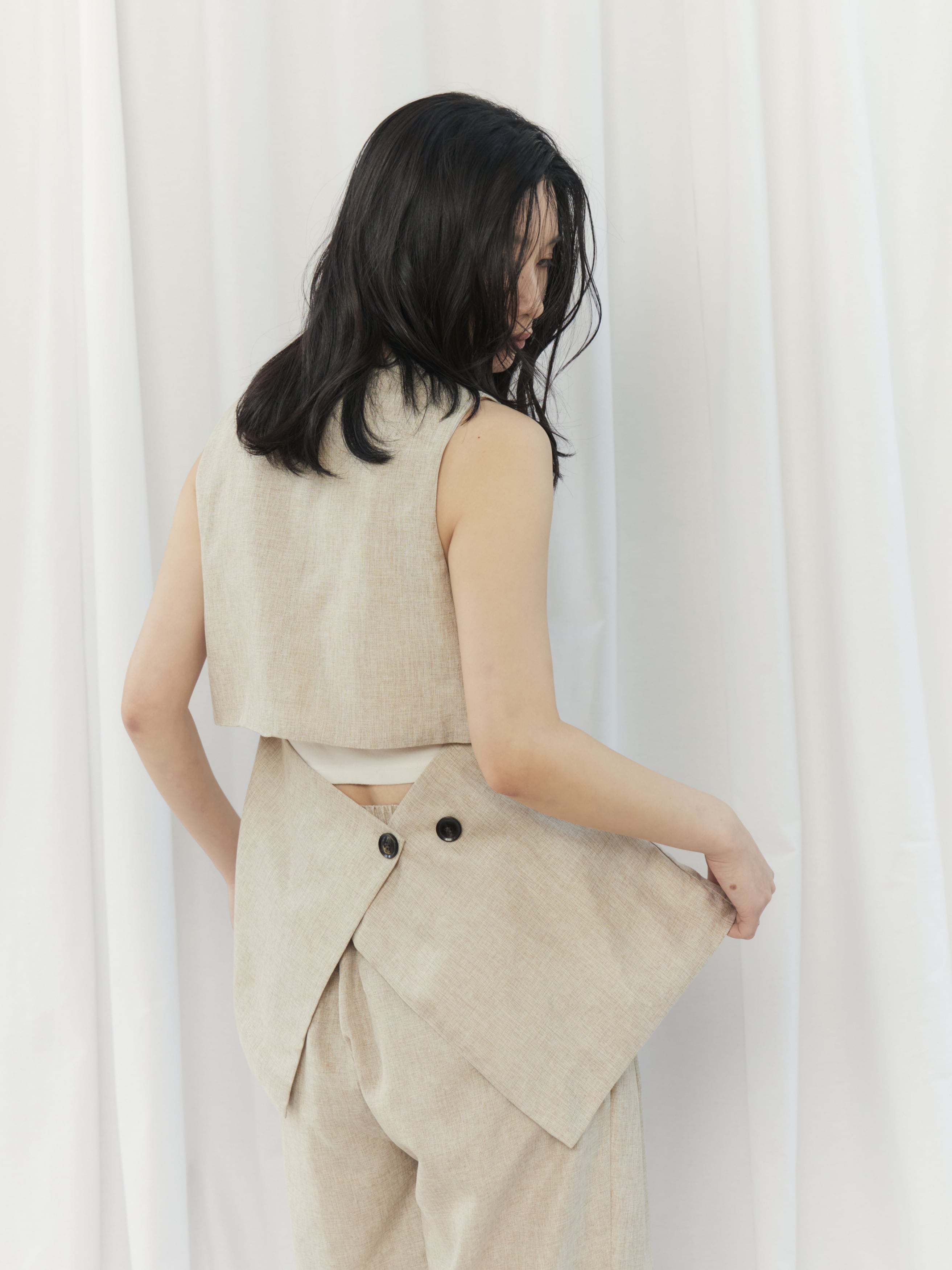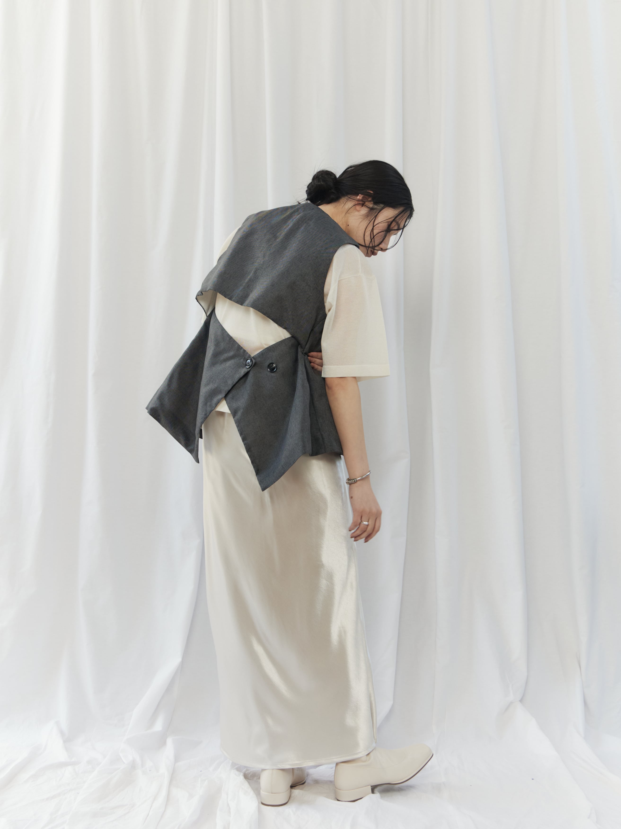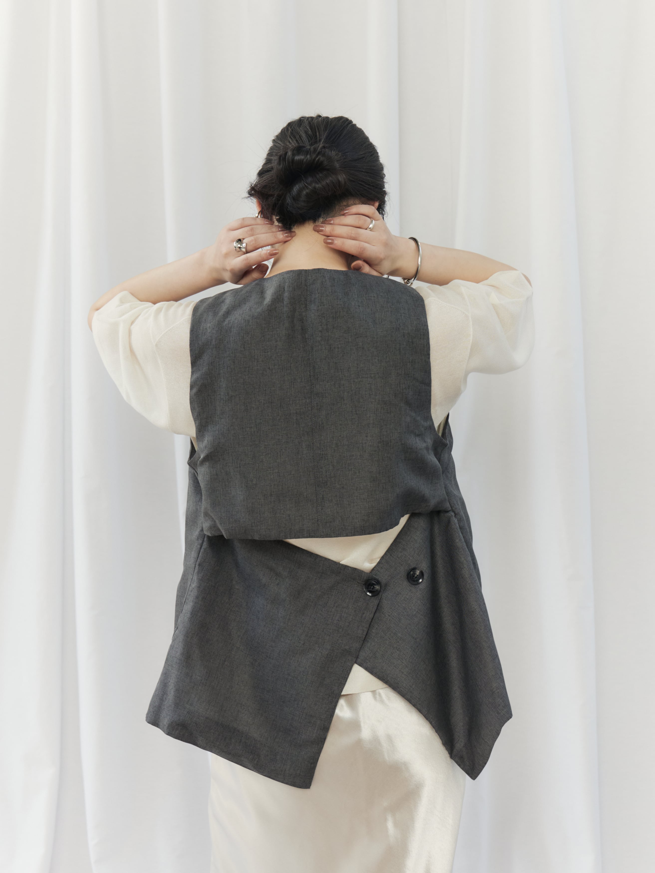 洗練されたミニマルデザインに、さりげない抜け感と動きのあるバックスタイルが印象的なベスト。フロントはすっきりとしたVネックで、ボタンの間隔や着丈のバランスまで計算された一着です。程よいハリと落ち感のある素材が体のラインを拾いすぎず、レイヤードスタイルを上品に引き締めます。シンプルながら着るだけでスタイリングに奥行きが生まれる主役アイテムです。