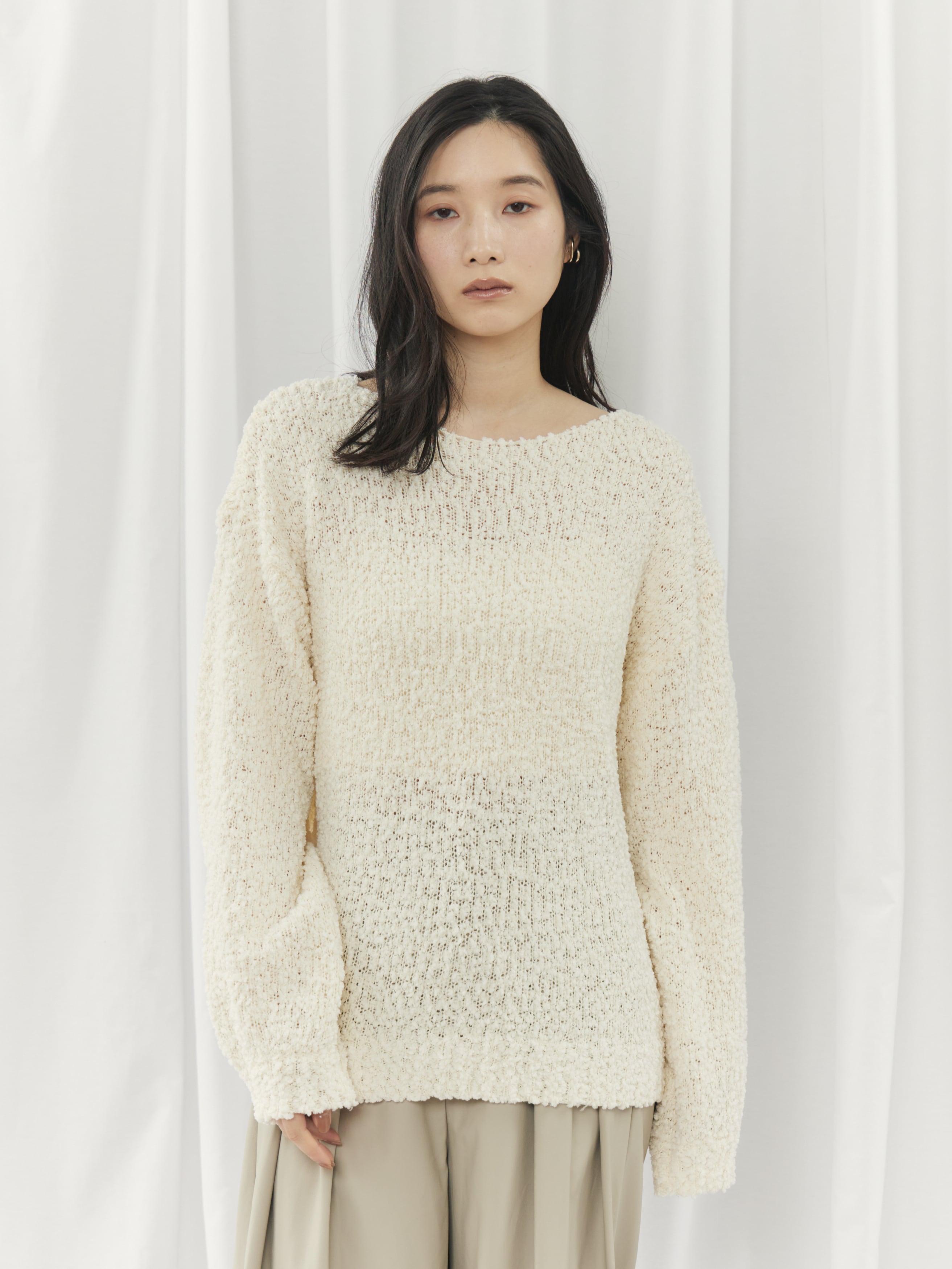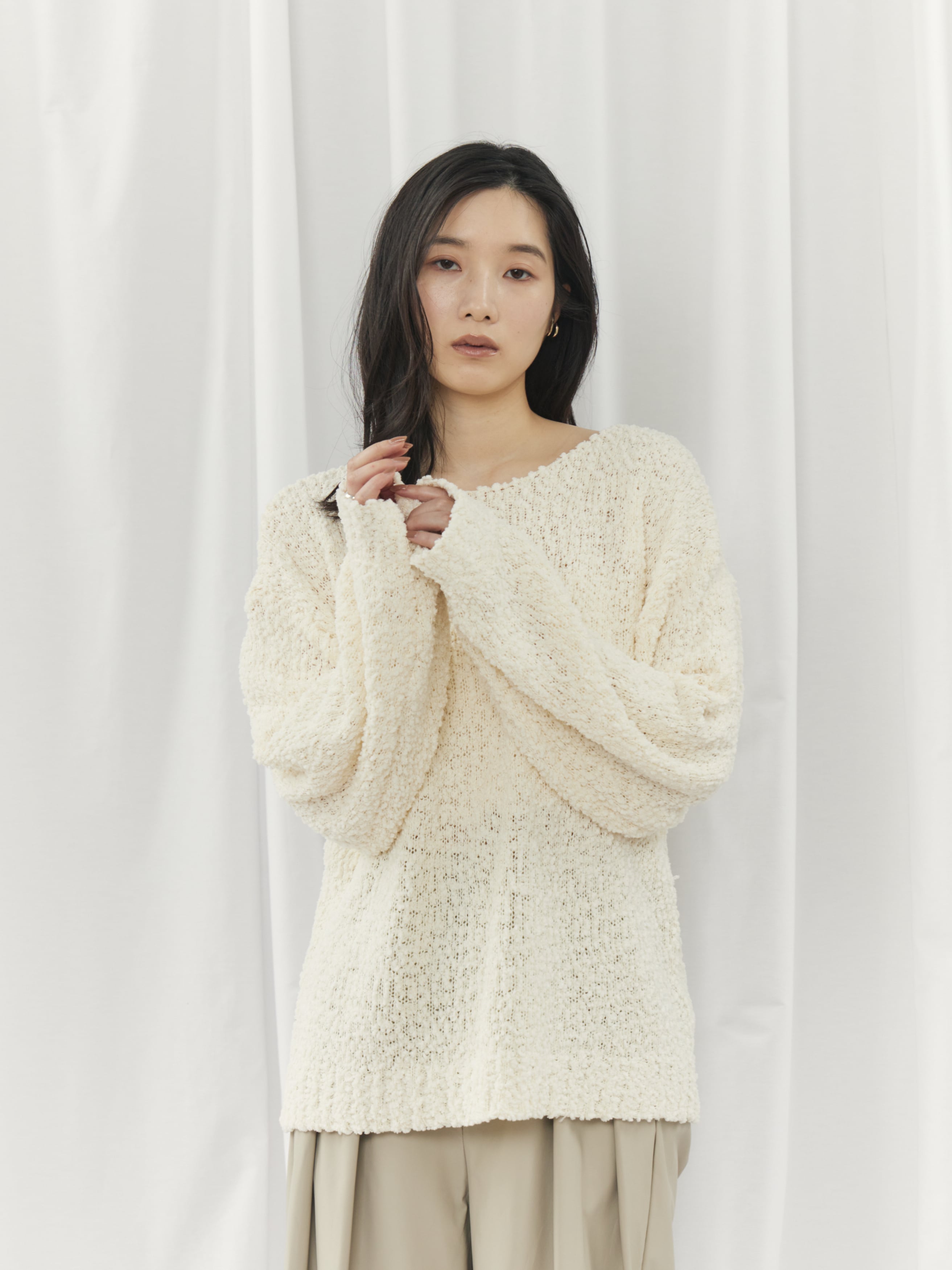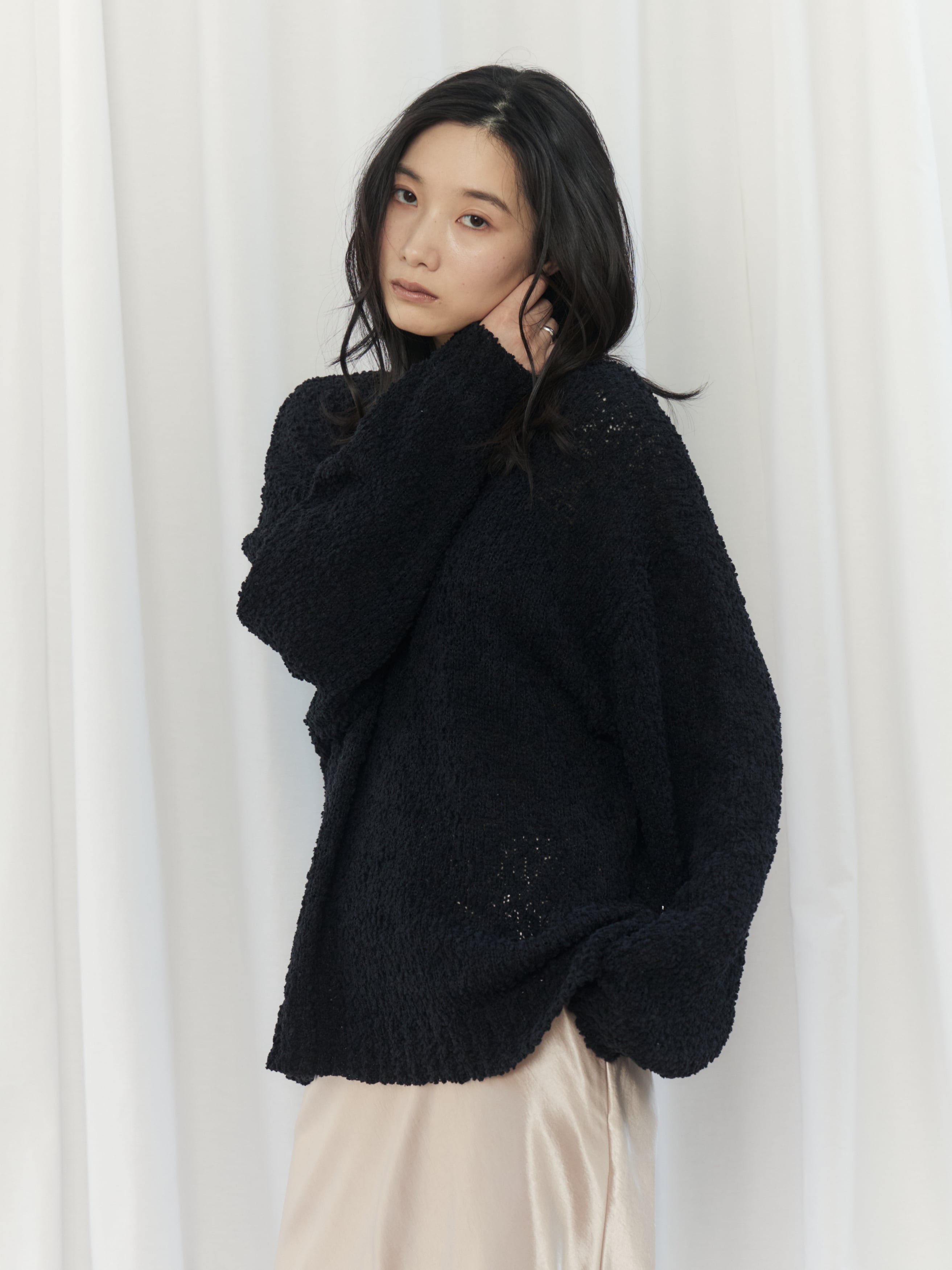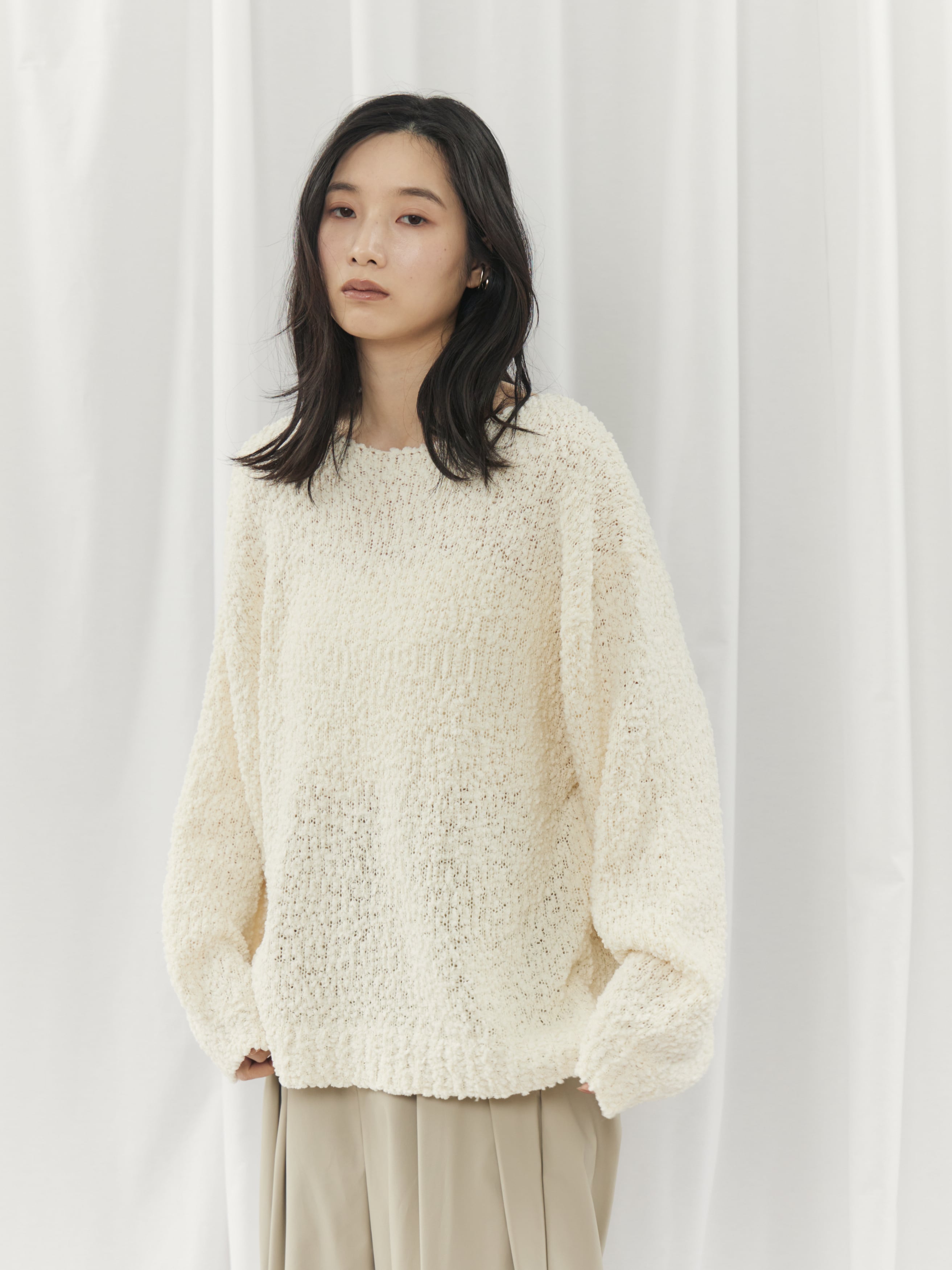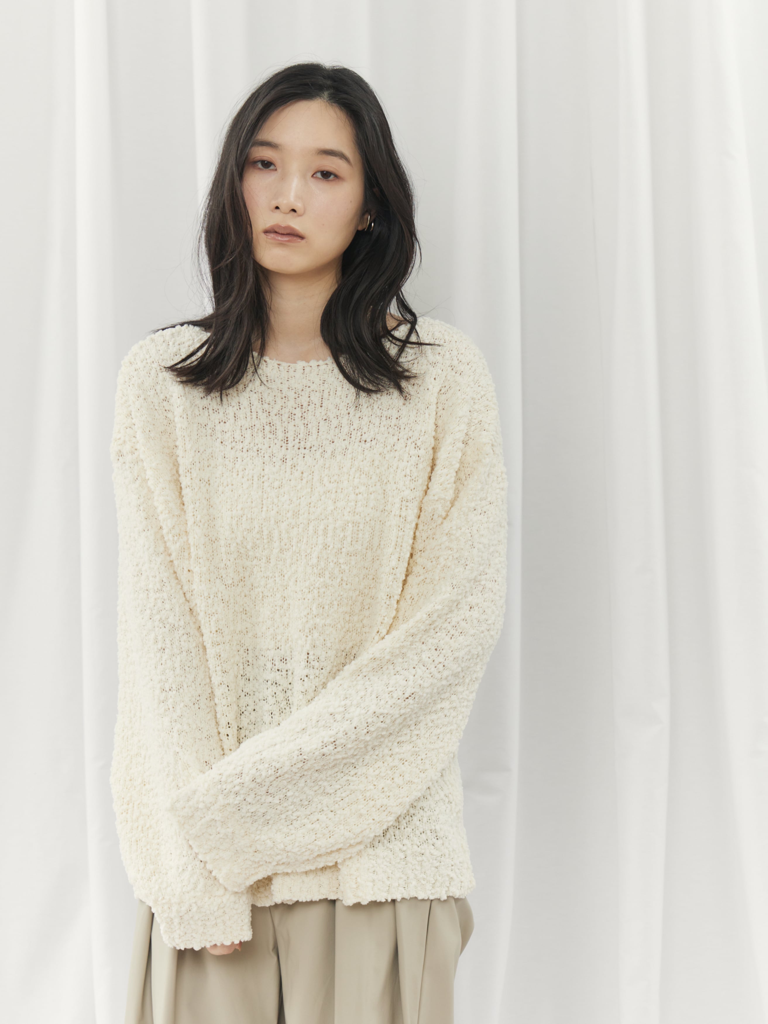 やわらかな風合いが魅力の、ブークレ調ニットプルオーバー。空気を含んだような軽やかな編み地で、見た目にもあたたかみがありながら、着心地はふんわりと軽やか。ほどよくゆとりのあるシルエットとドロップショルダーのデザインが、肩まわりをやさしく包み込み、抜け感のある大人のリラックススタイルを演出します。ヒップにかかる安心感のある着丈で、パンツにもスカートにもバランスよく合わせられる一枚。シンプルながらも素材感で魅せる主役級ニットです。