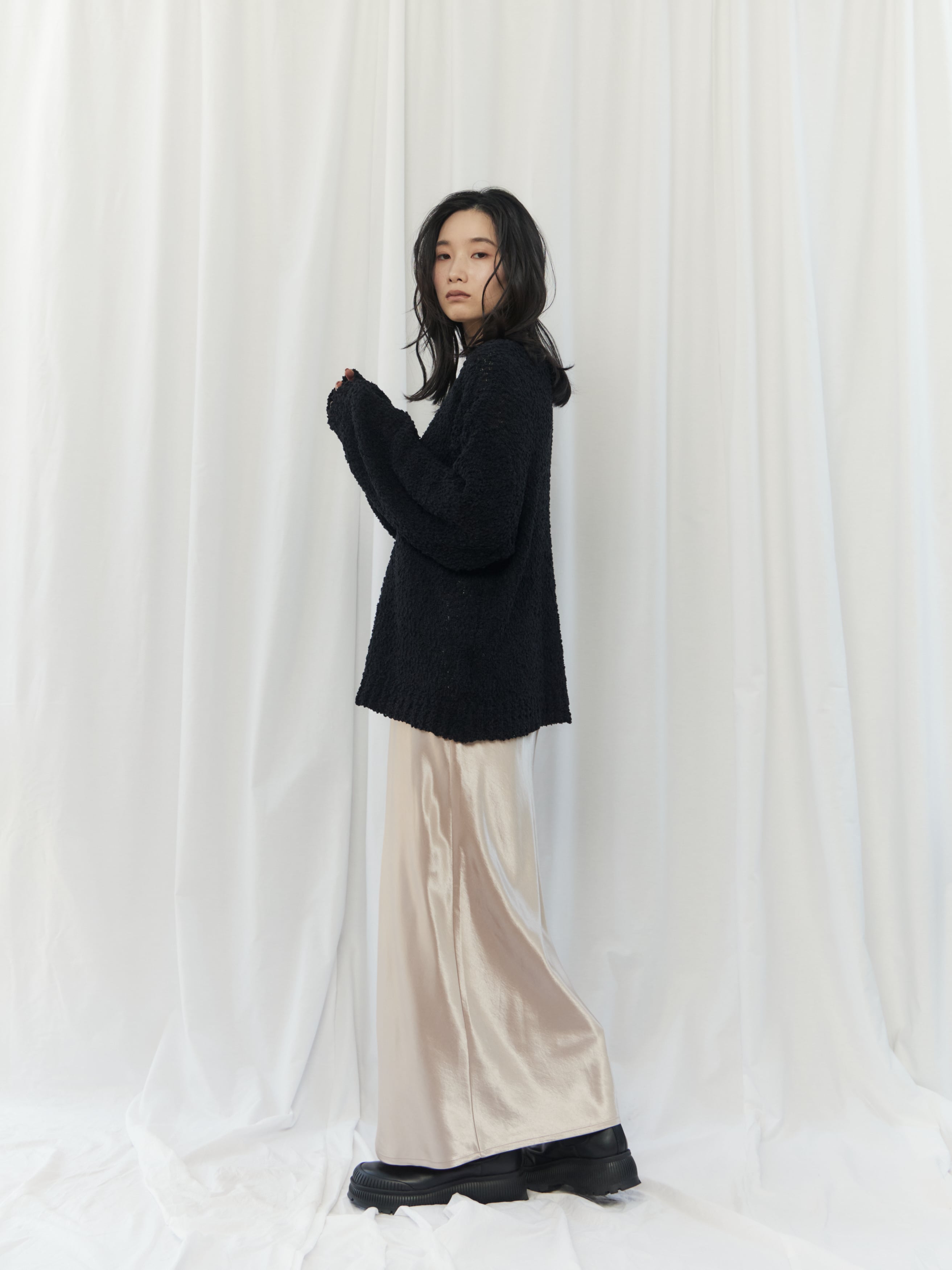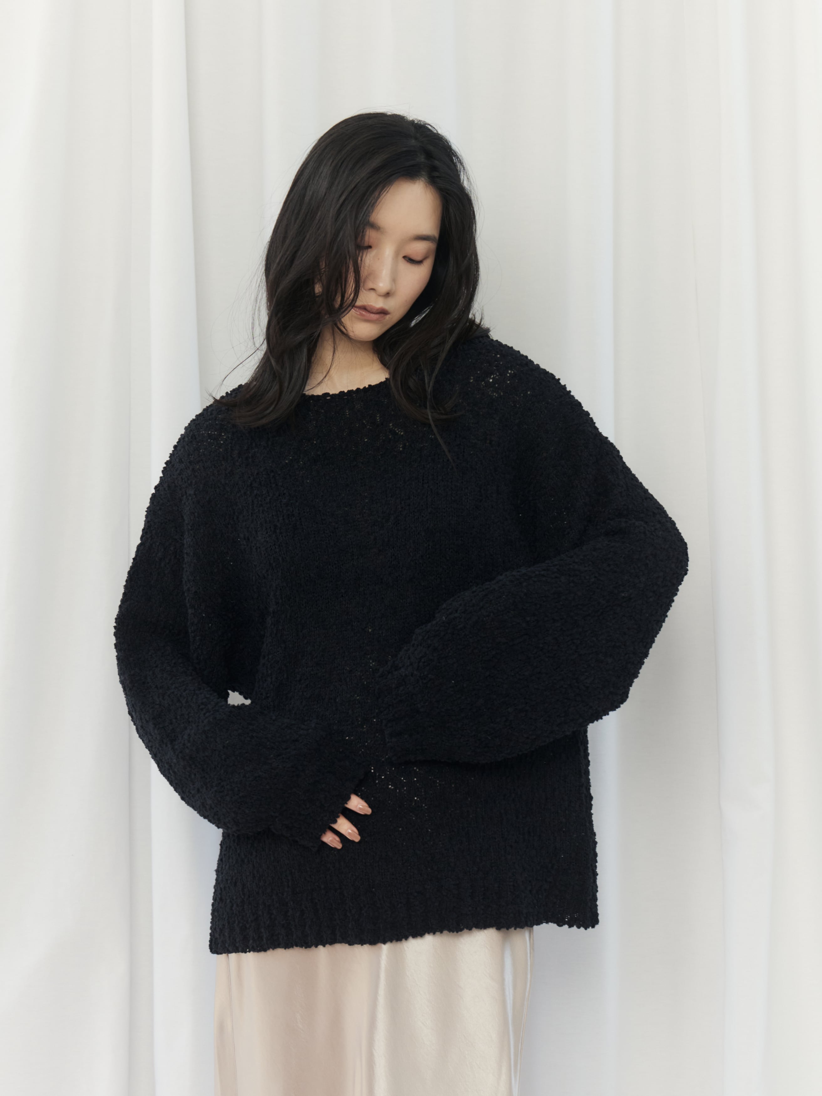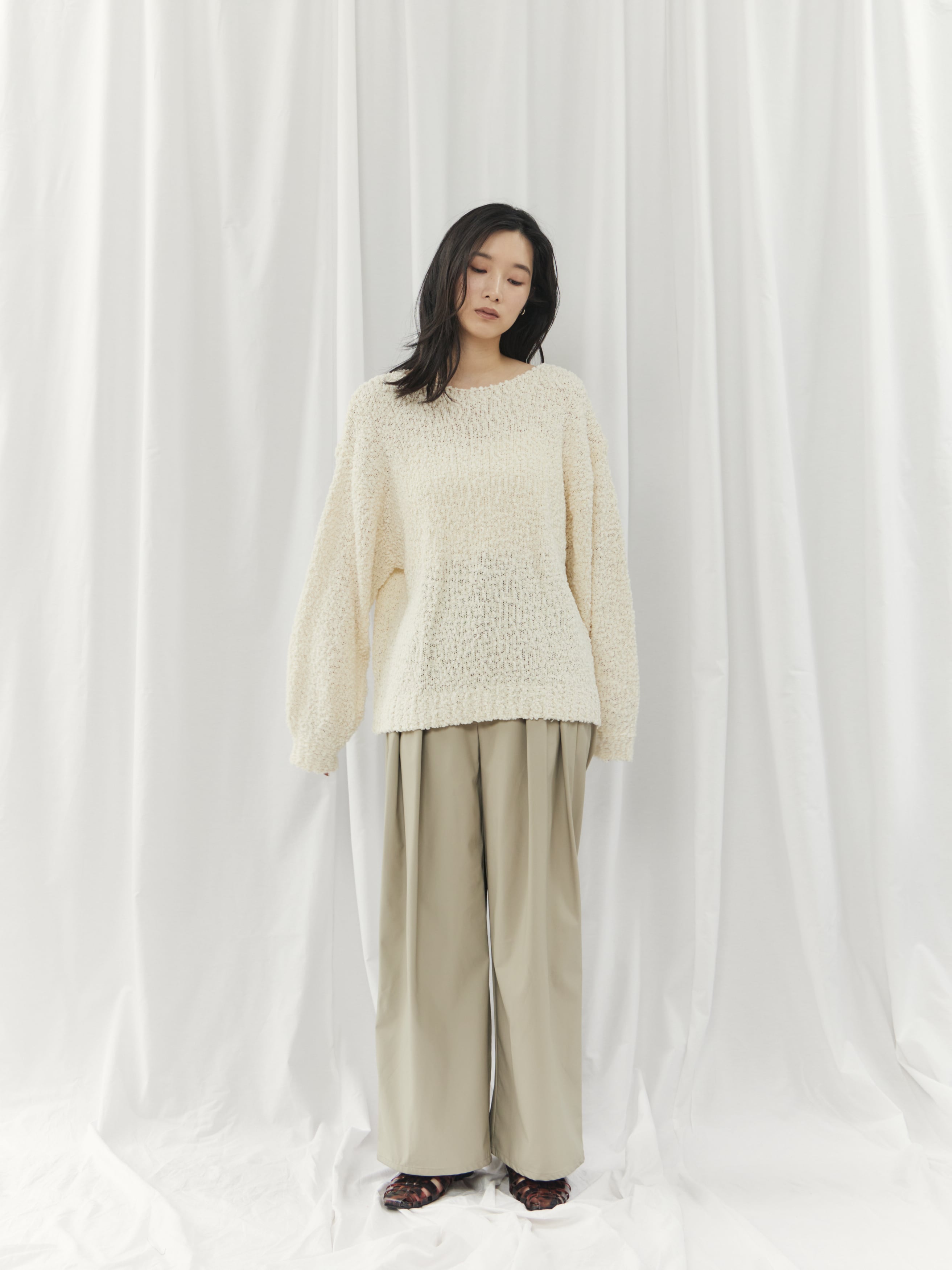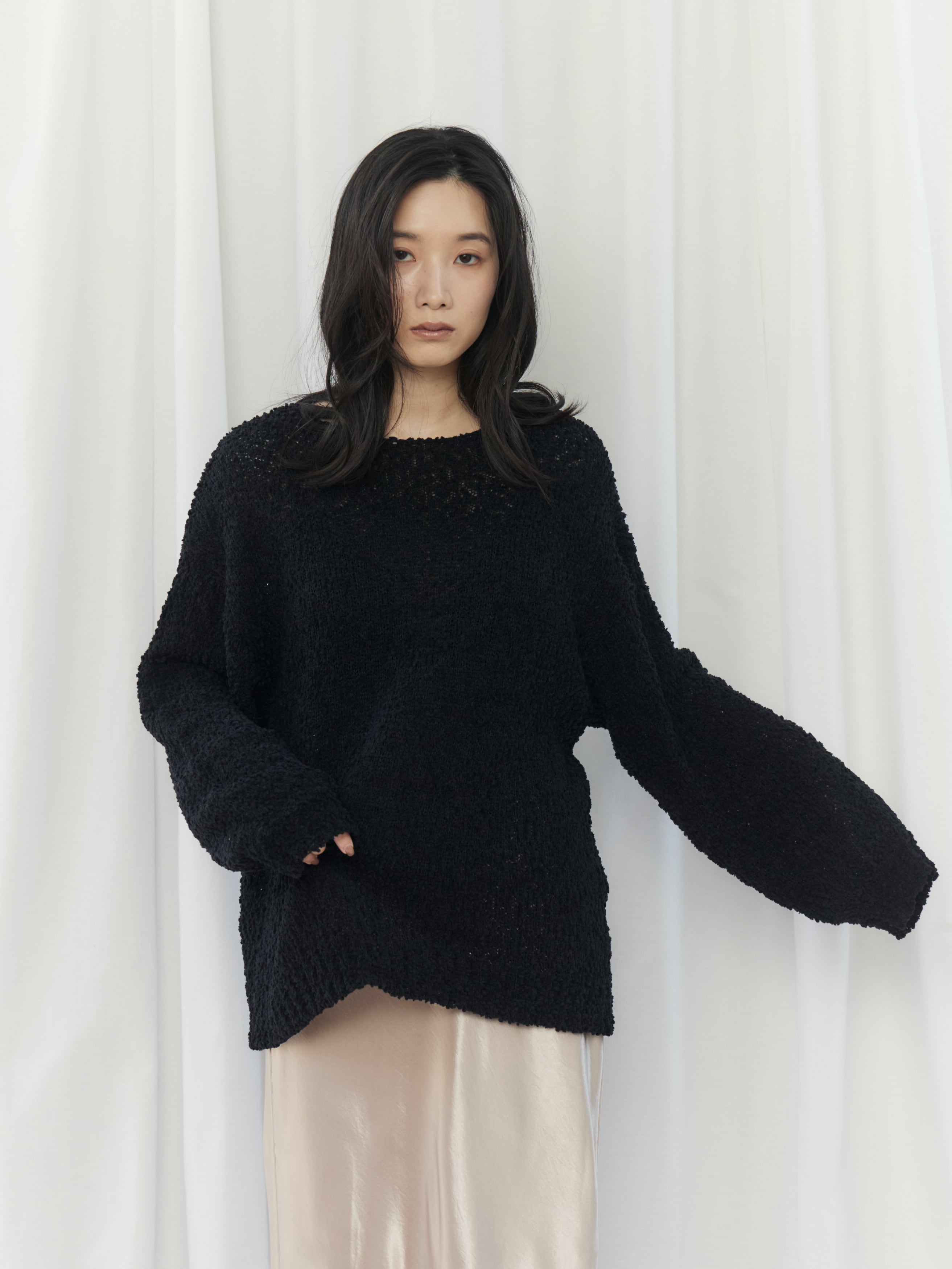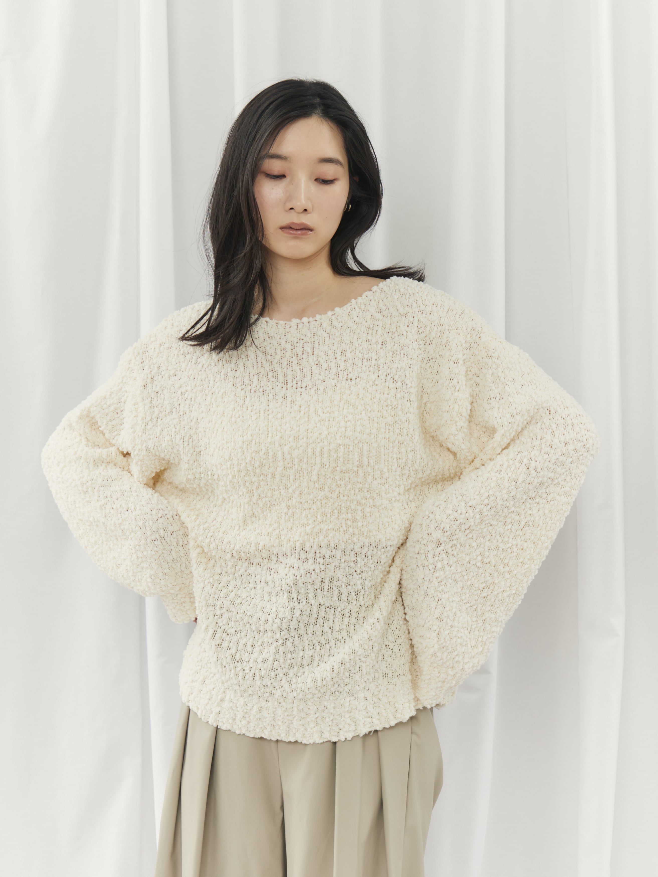 やわらかな風合いが魅力の、ブークレ調ニットプルオーバー。空気を含んだような軽やかな編み地で、見た目にもあたたかみがありながら、着心地はふんわりと軽やか。ほどよくゆとりのあるシルエットとドロップショルダーのデザインが、肩まわりをやさしく包み込み、抜け感のある大人のリラックススタイルを演出します。ヒップにかかる安心感のある着丈で、パンツにもスカートにもバランスよく合わせられる一枚。シンプルながらも素材感で魅せる主役級ニットです。