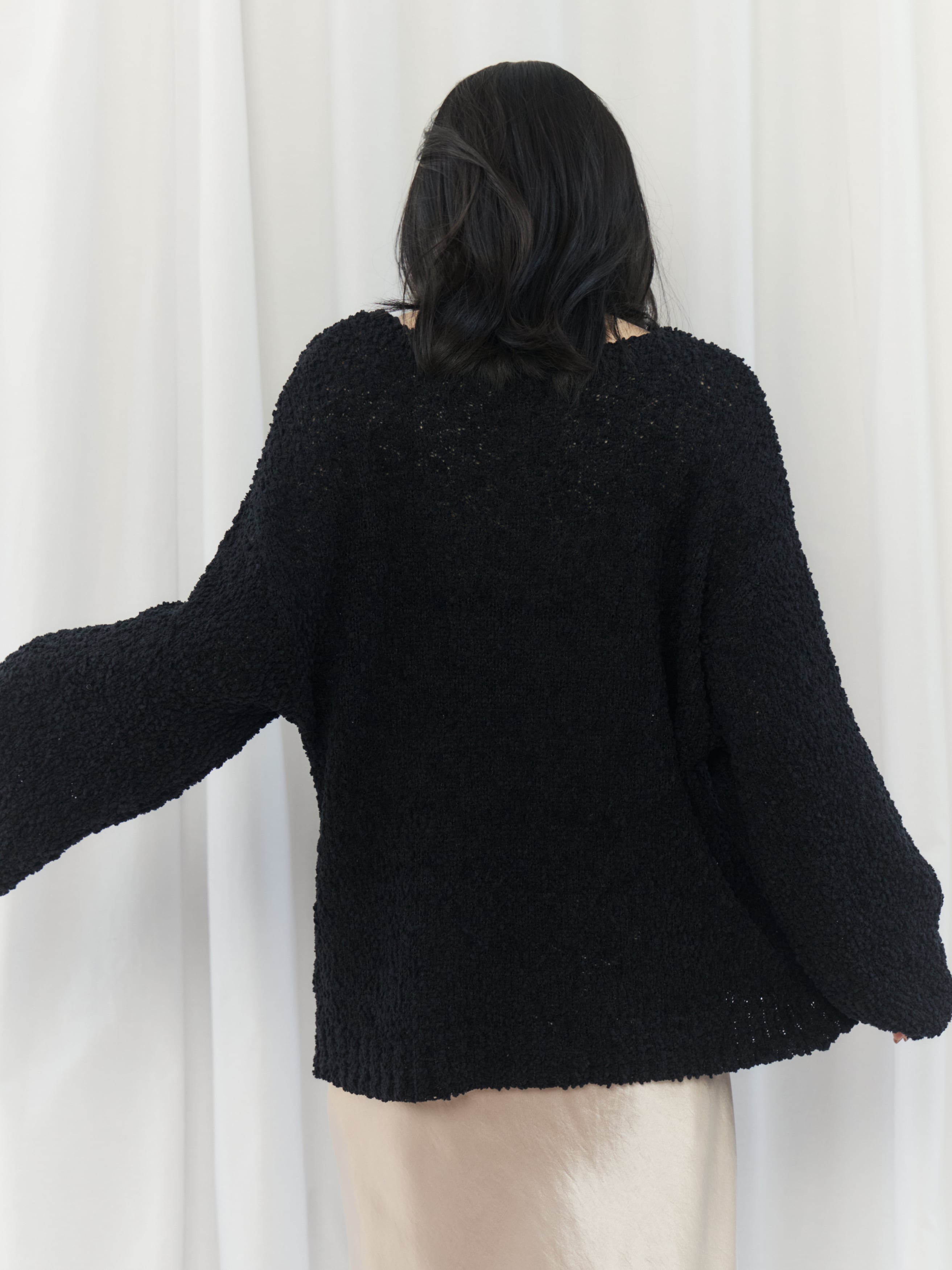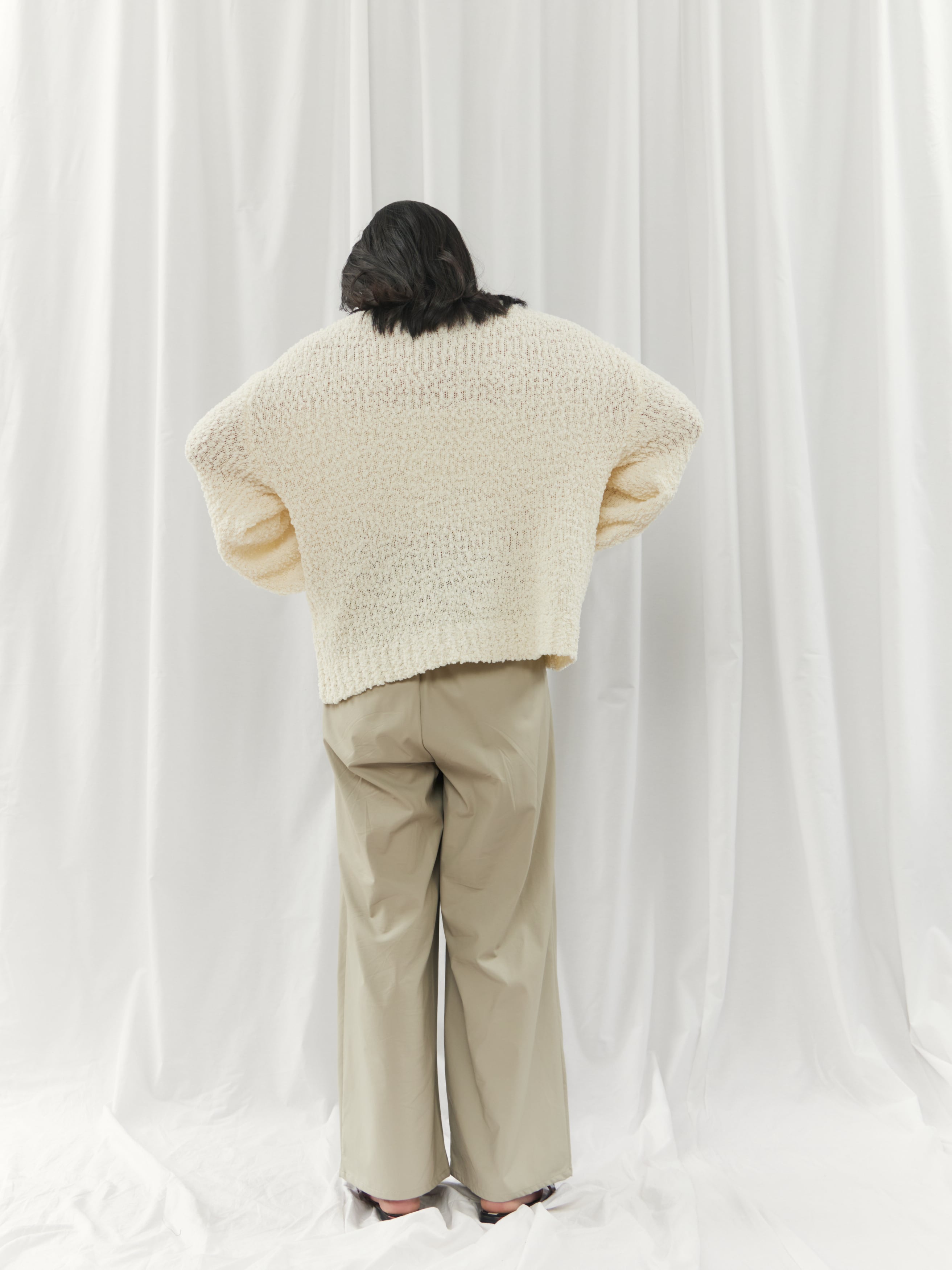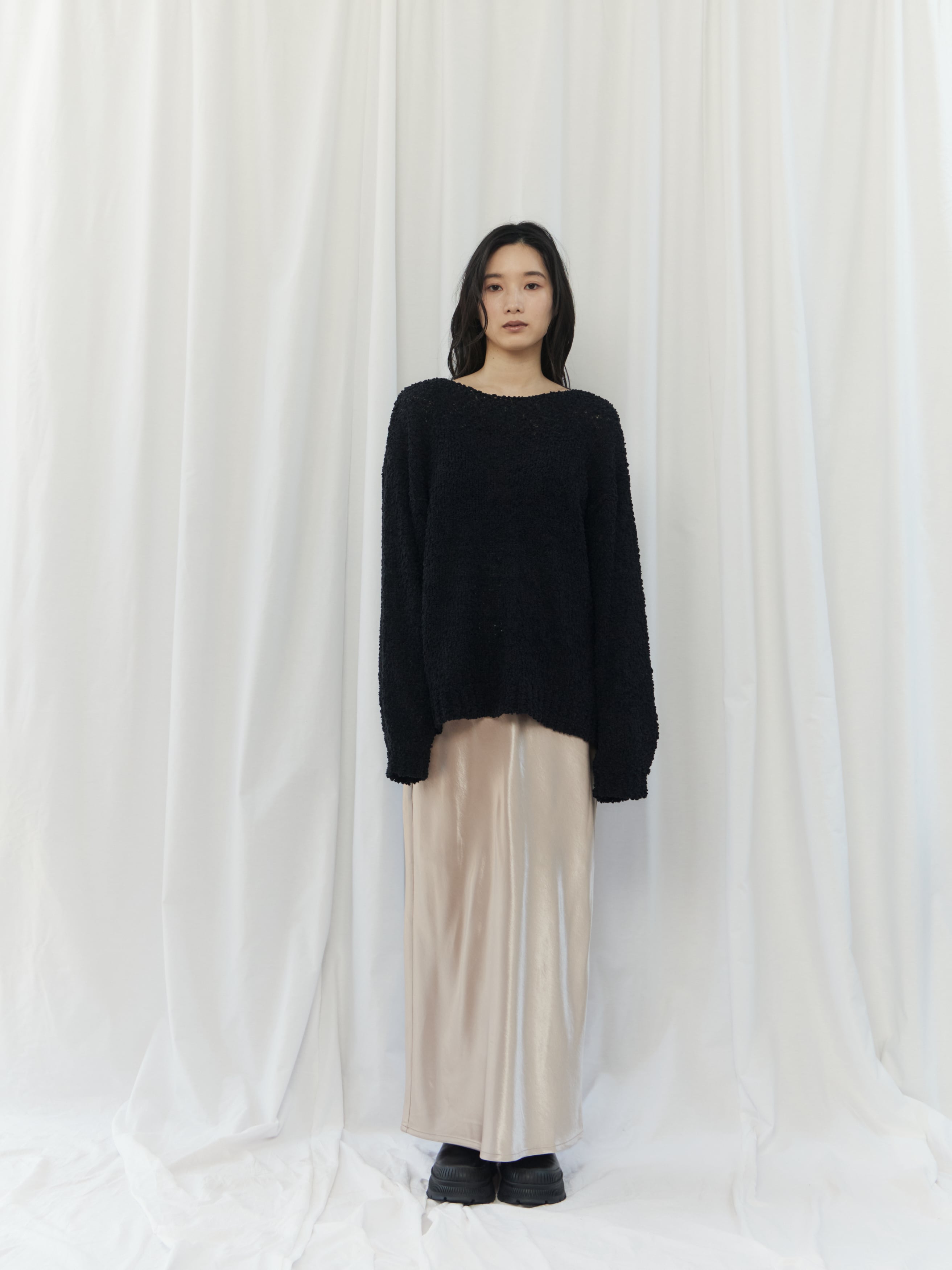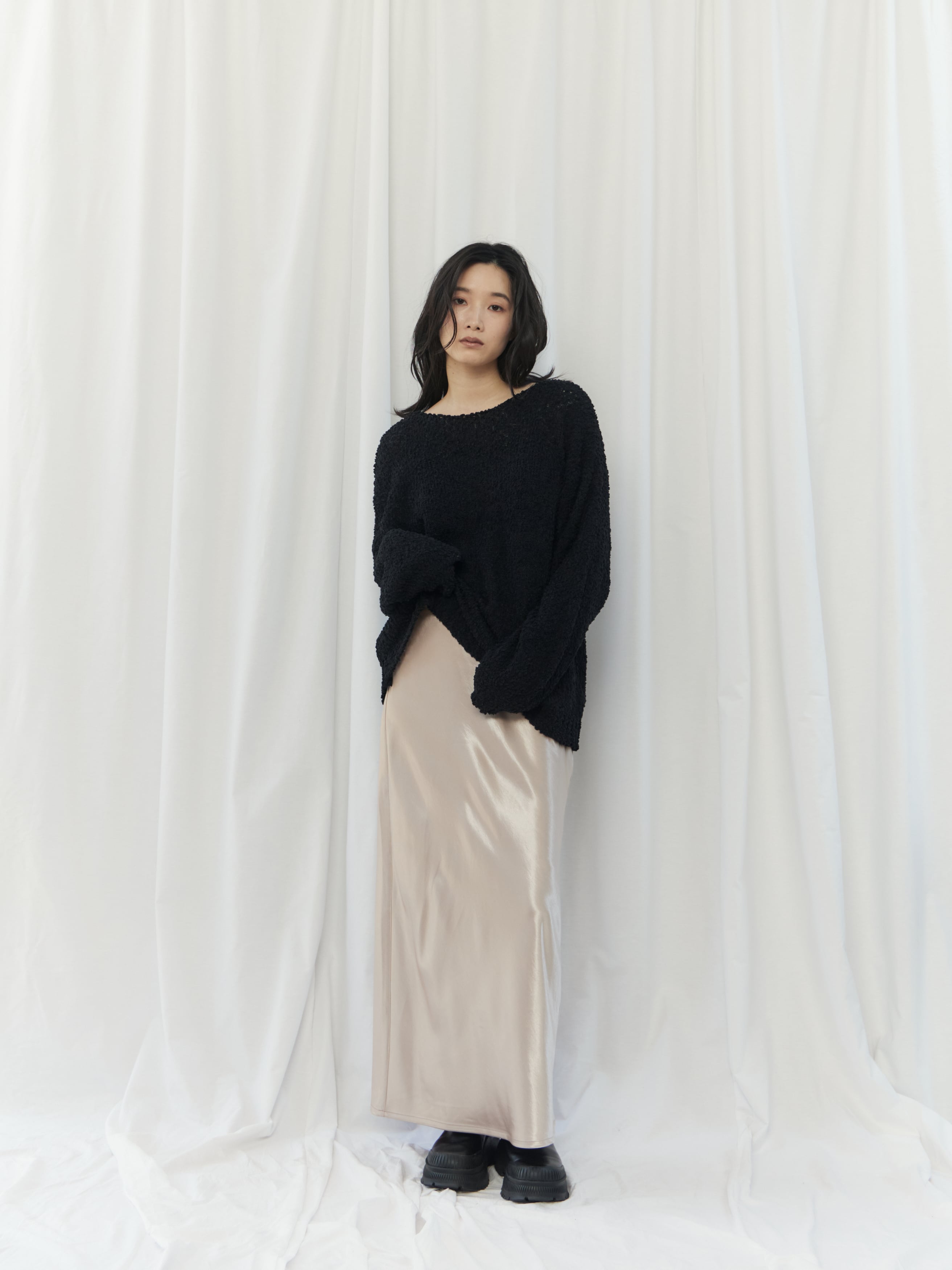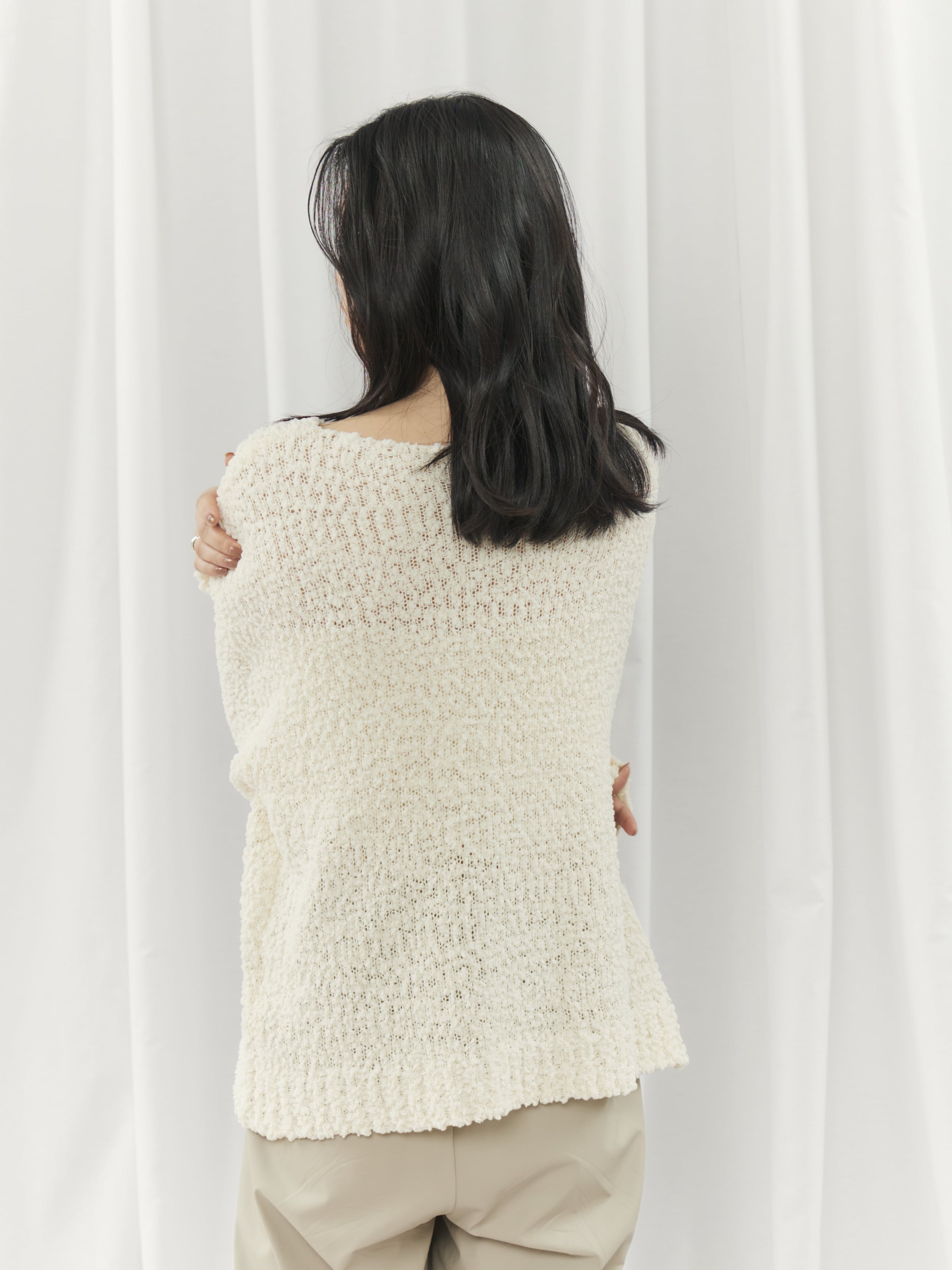 やわらかな風合いが魅力の、ブークレ調ニットプルオーバー。空気を含んだような軽やかな編み地で、見た目にもあたたかみがありながら、着心地はふんわりと軽やか。ほどよくゆとりのあるシルエットとドロップショルダーのデザインが、肩まわりをやさしく包み込み、抜け感のある大人のリラックススタイルを演出します。ヒップにかかる安心感のある着丈で、パンツにもスカートにもバランスよく合わせられる一枚。シンプルながらも素材感で魅せる主役級ニットです。