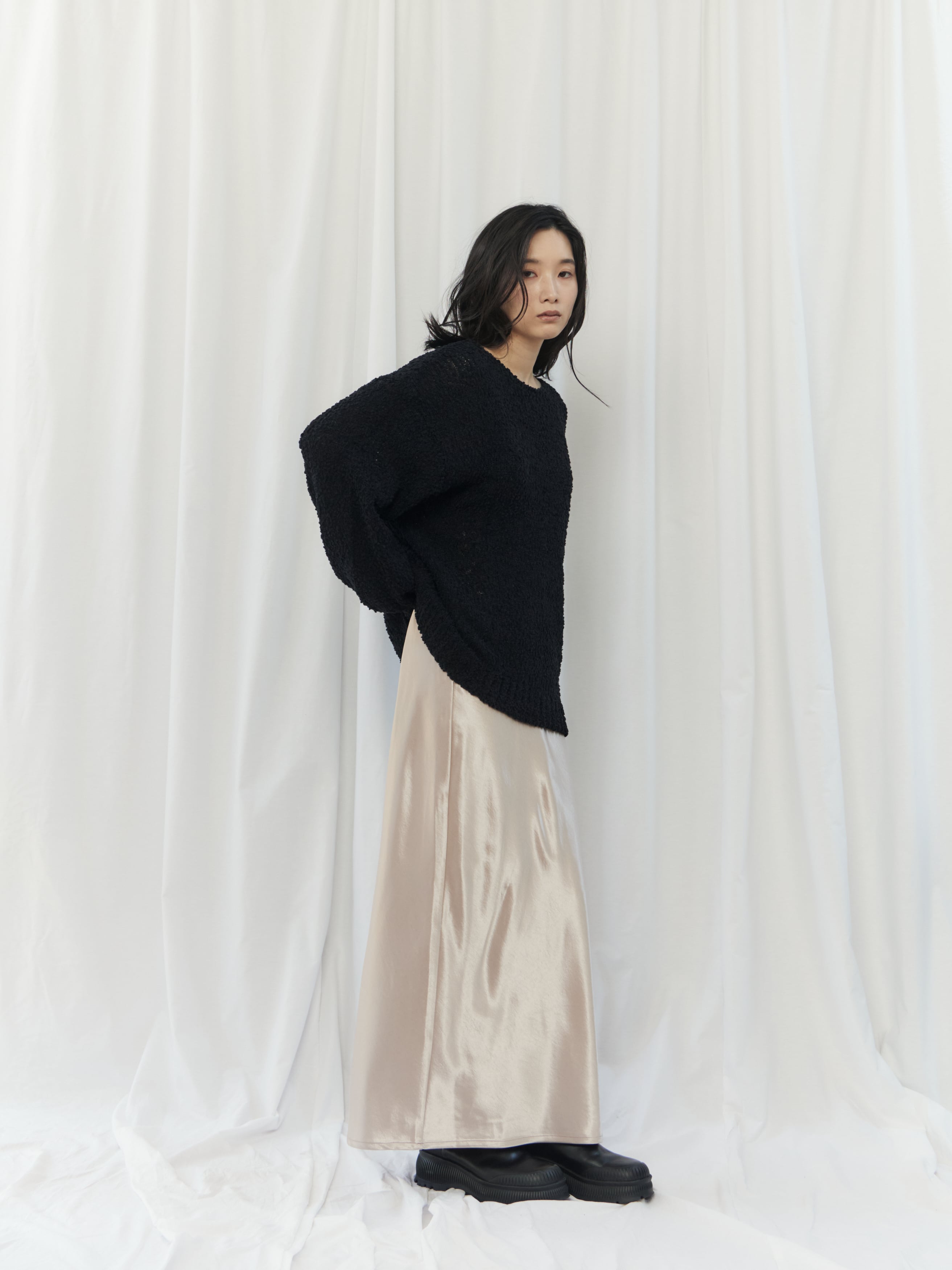 ウエストインやベルトマークで重心を上げるとスタイルアップ効果が高まります。とろみ素材のスカートや細身のパンツと合わせて、やわらかな質感を活かすコーディネートがおすすめです。