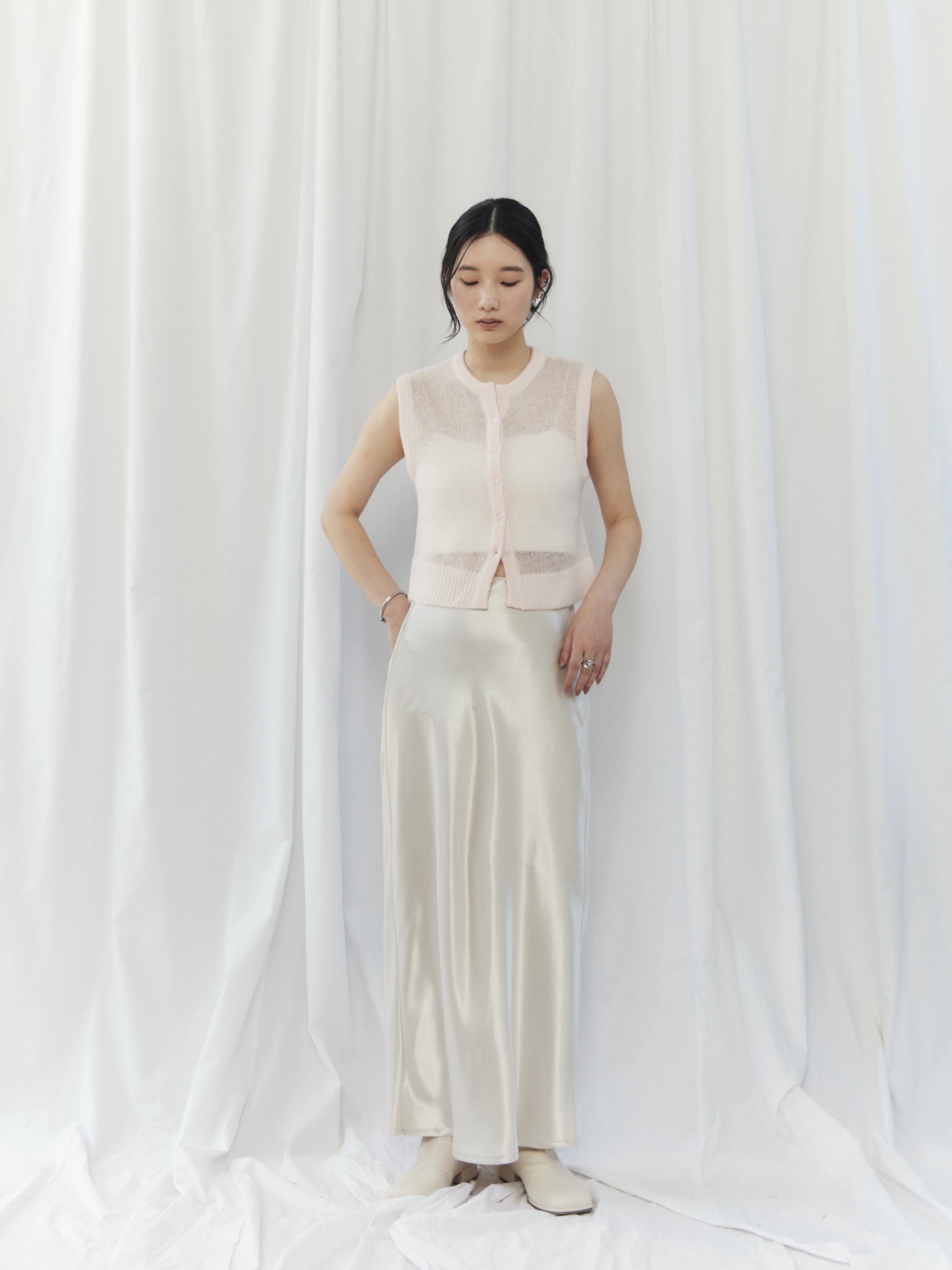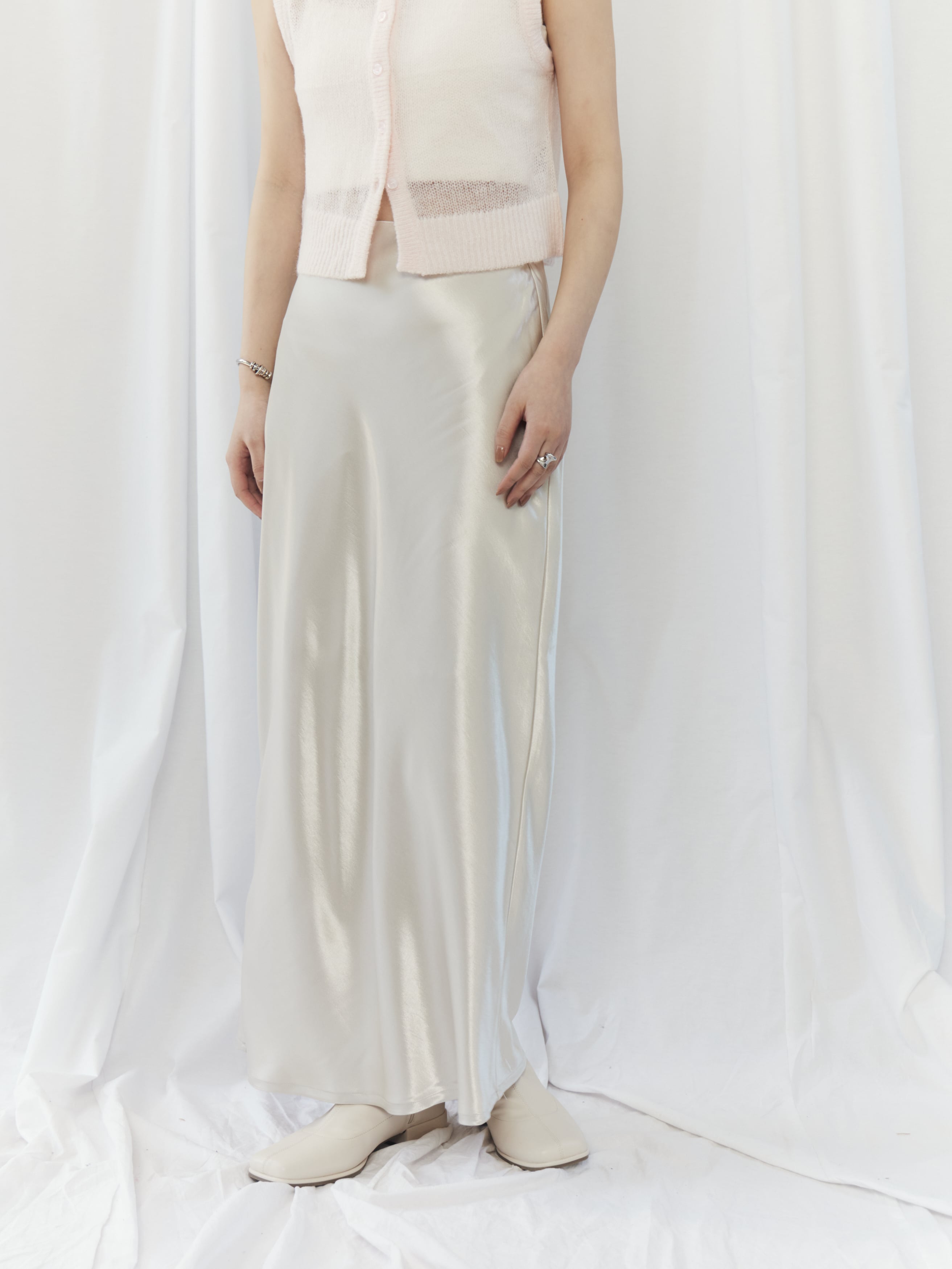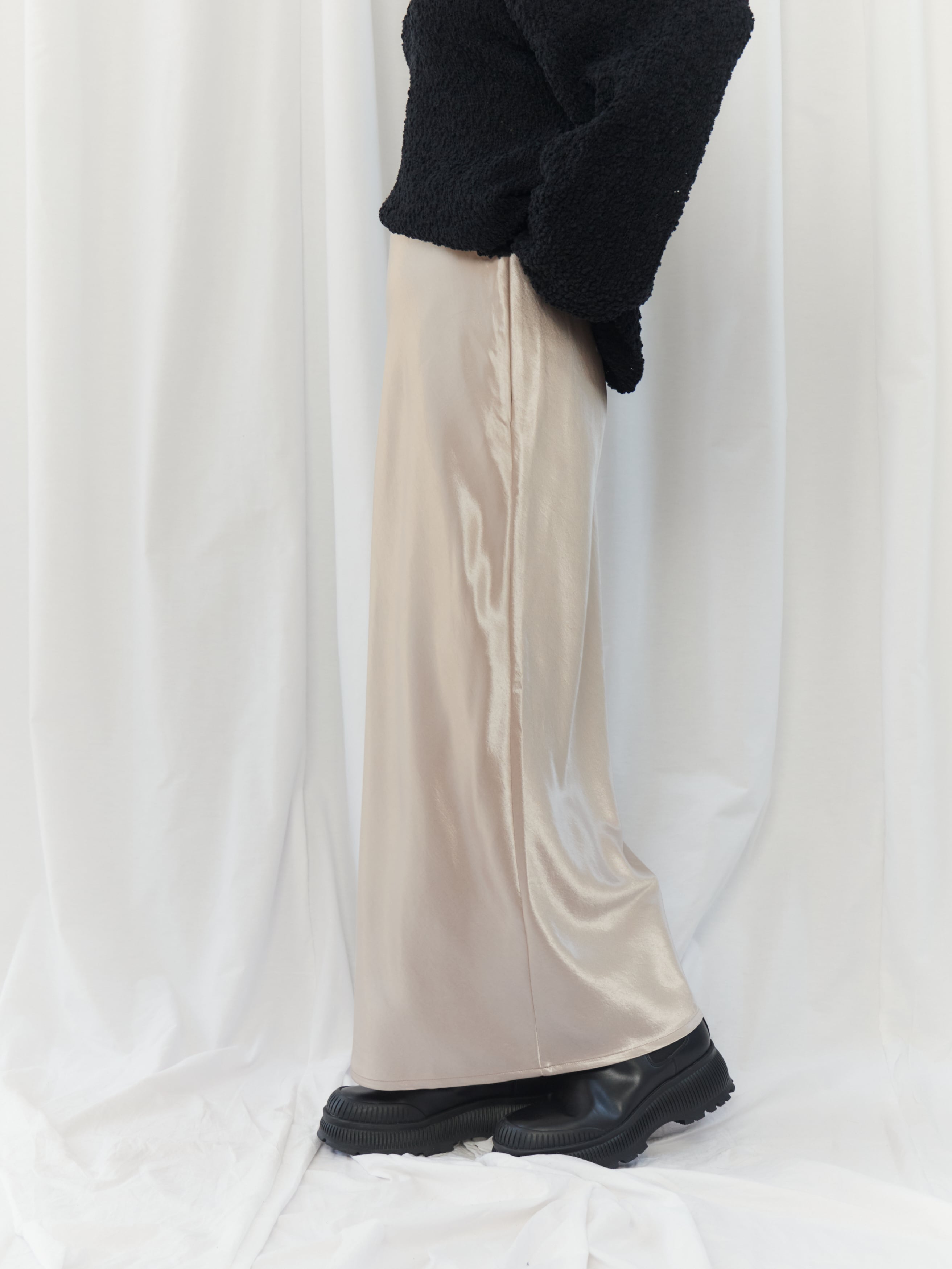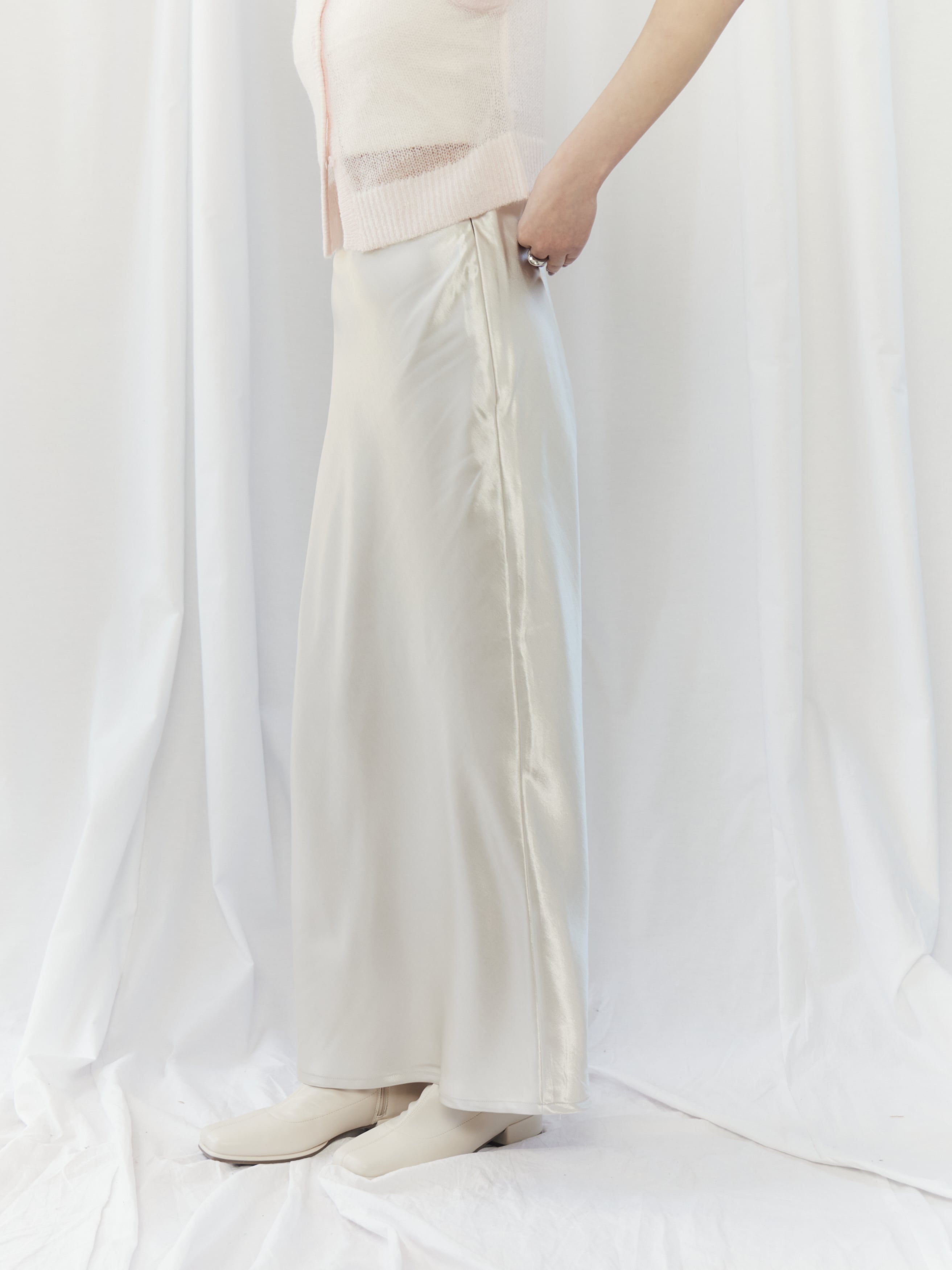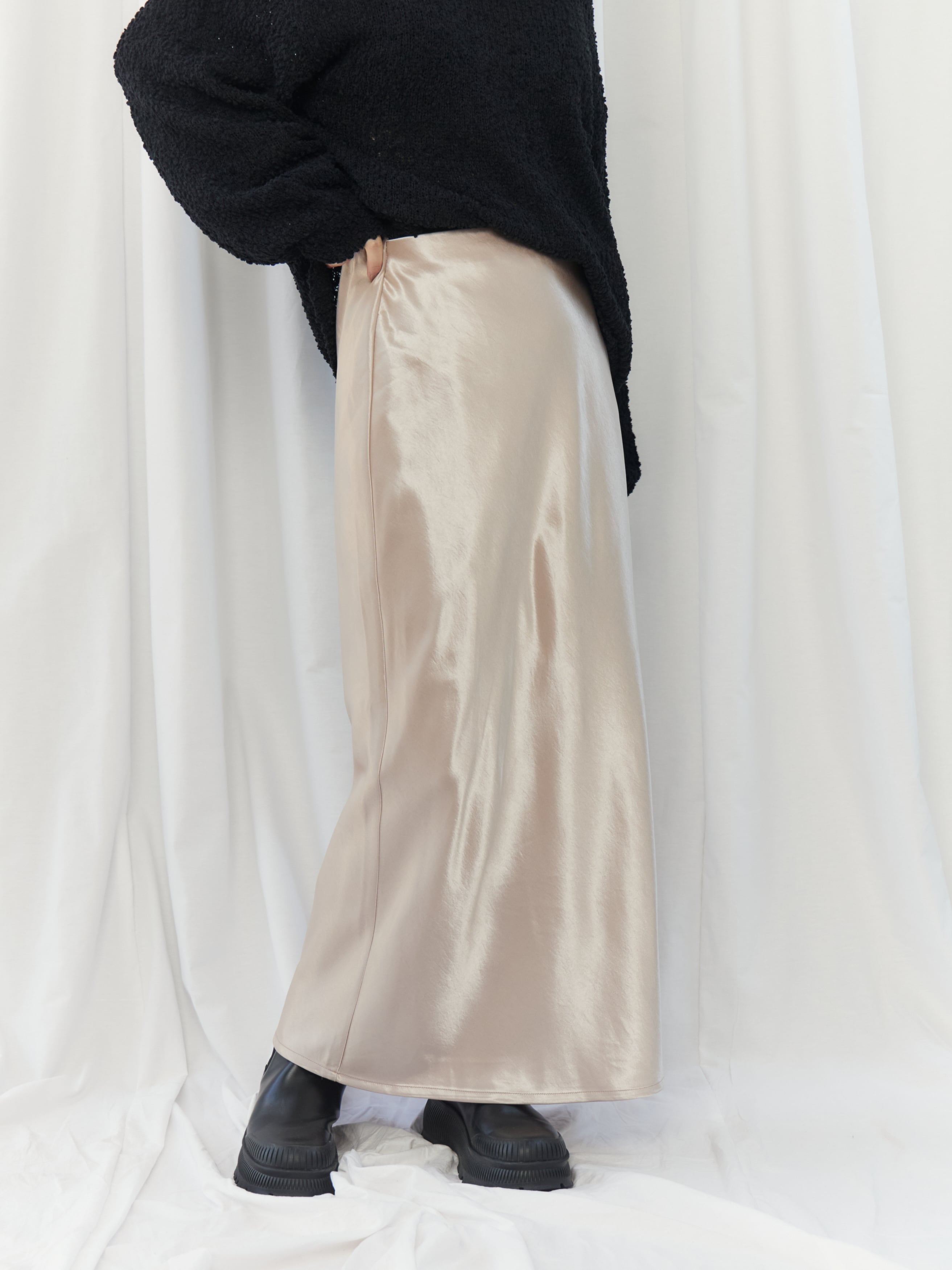 上品な光沢が魅力のサテンロングスカート。なめらかに落ちる生地が縦のラインを美しく描き、歩くたびにさりげなく揺れて女性らしい印象を演出します。すっきりとしたIラインシルエットでありながら、ウエストは後ろゴム仕様で快適なフィット感を実現。さらにサイドファスナー付きで、着脱のしやすさとフロントのフラットな見え感を両立しています。トップスをインした際もウエストまわりがもたつかず、きれいめにもカジュアルにも着回せる一着です。シーズンレスで活躍し、デイリーからちょっとしたお出かけまで幅広いシーンに寄り添います。