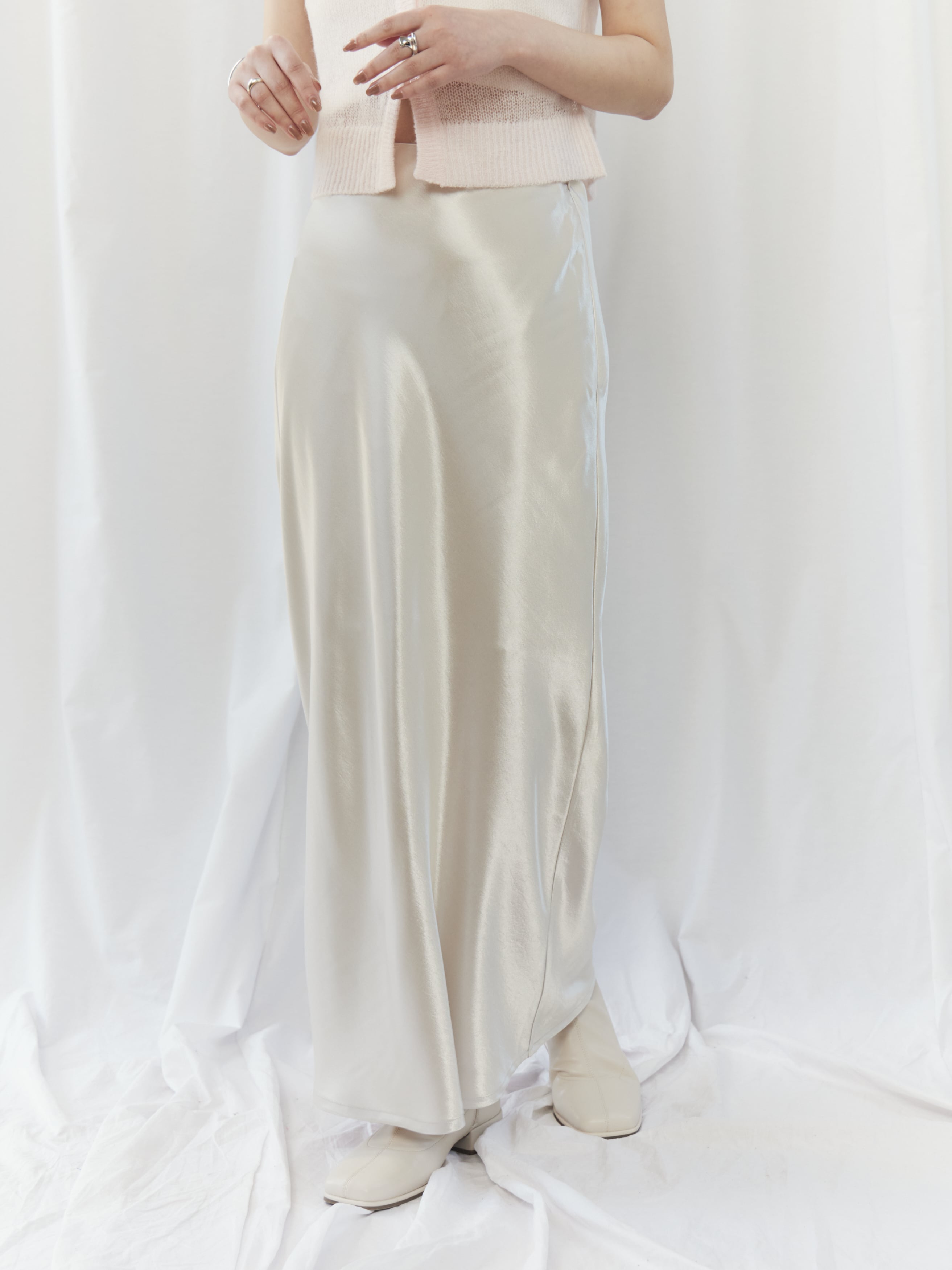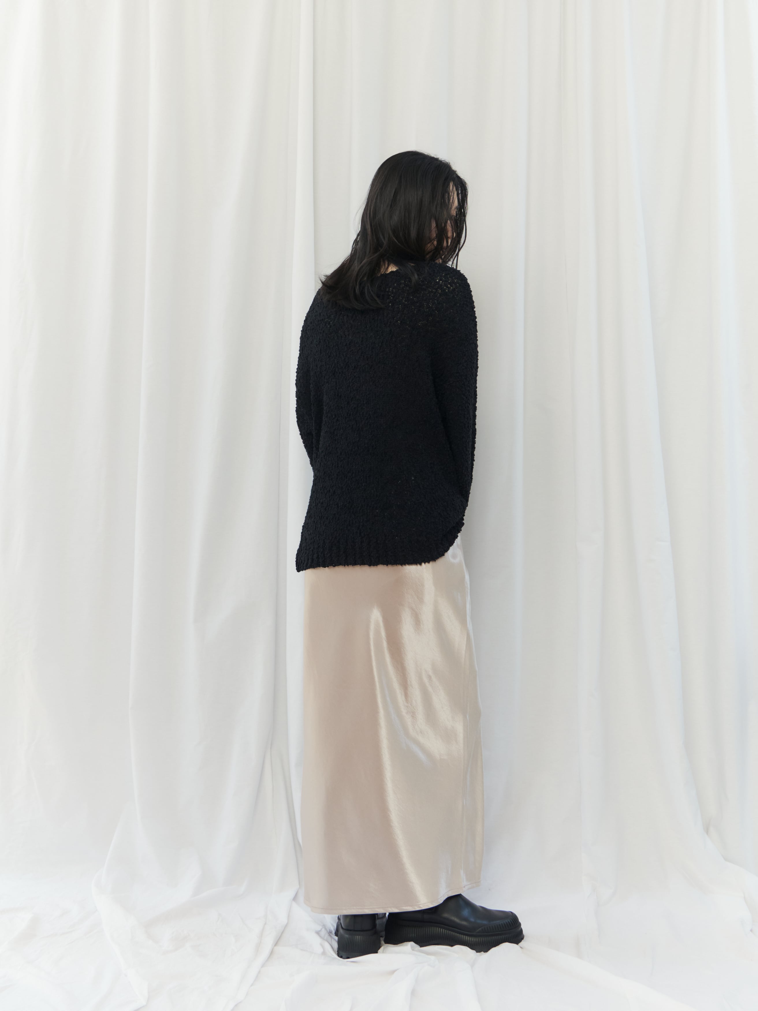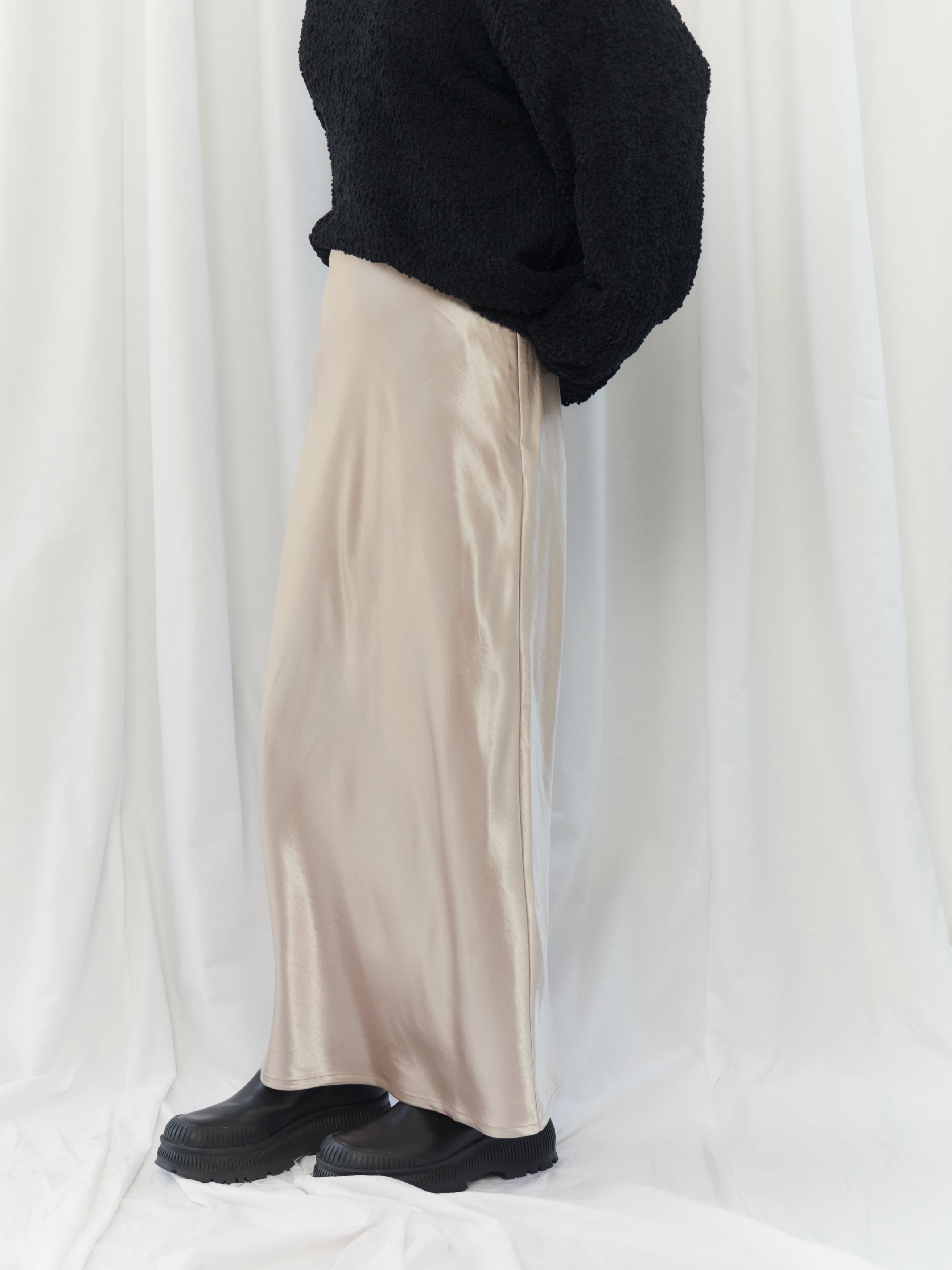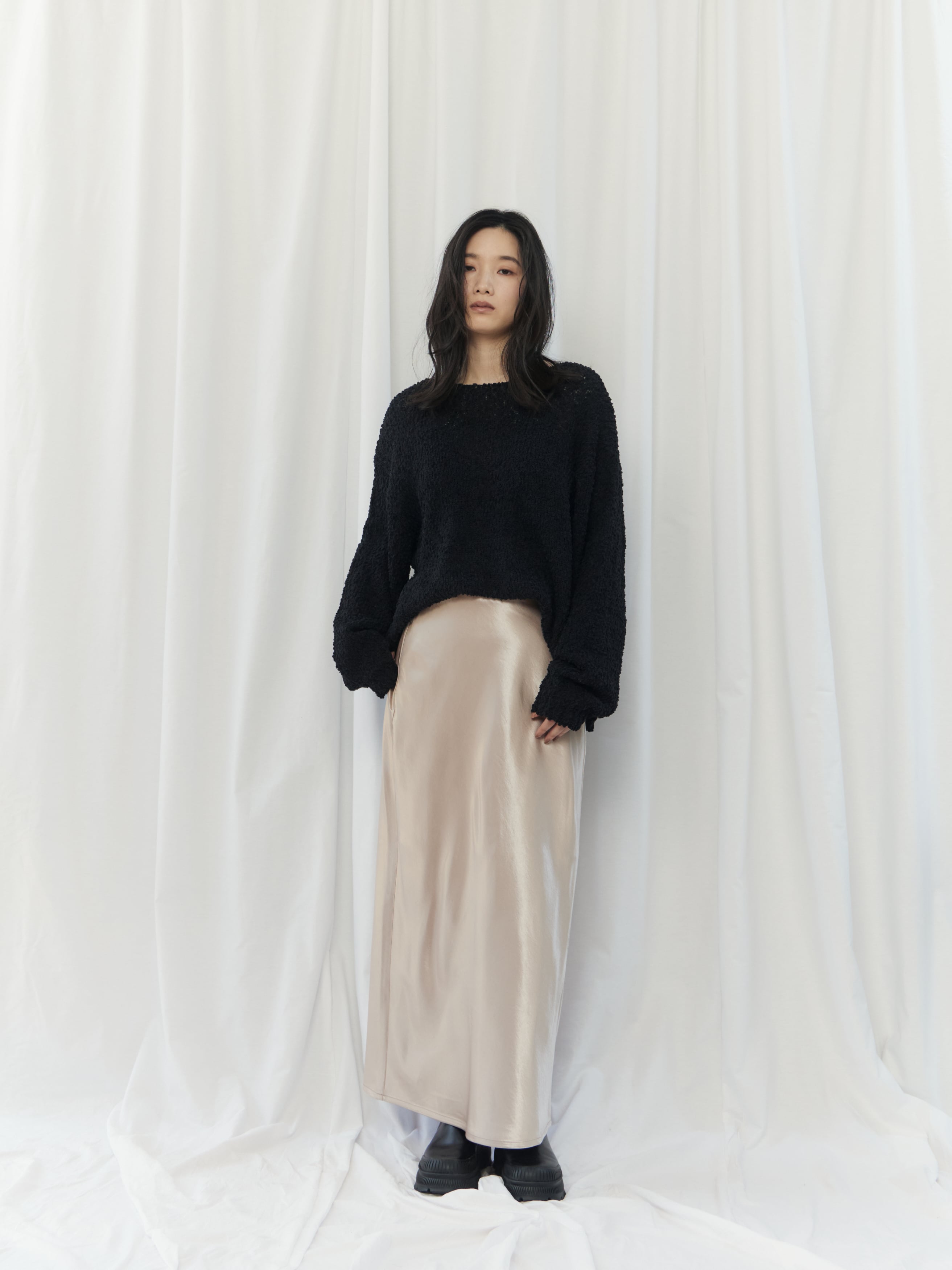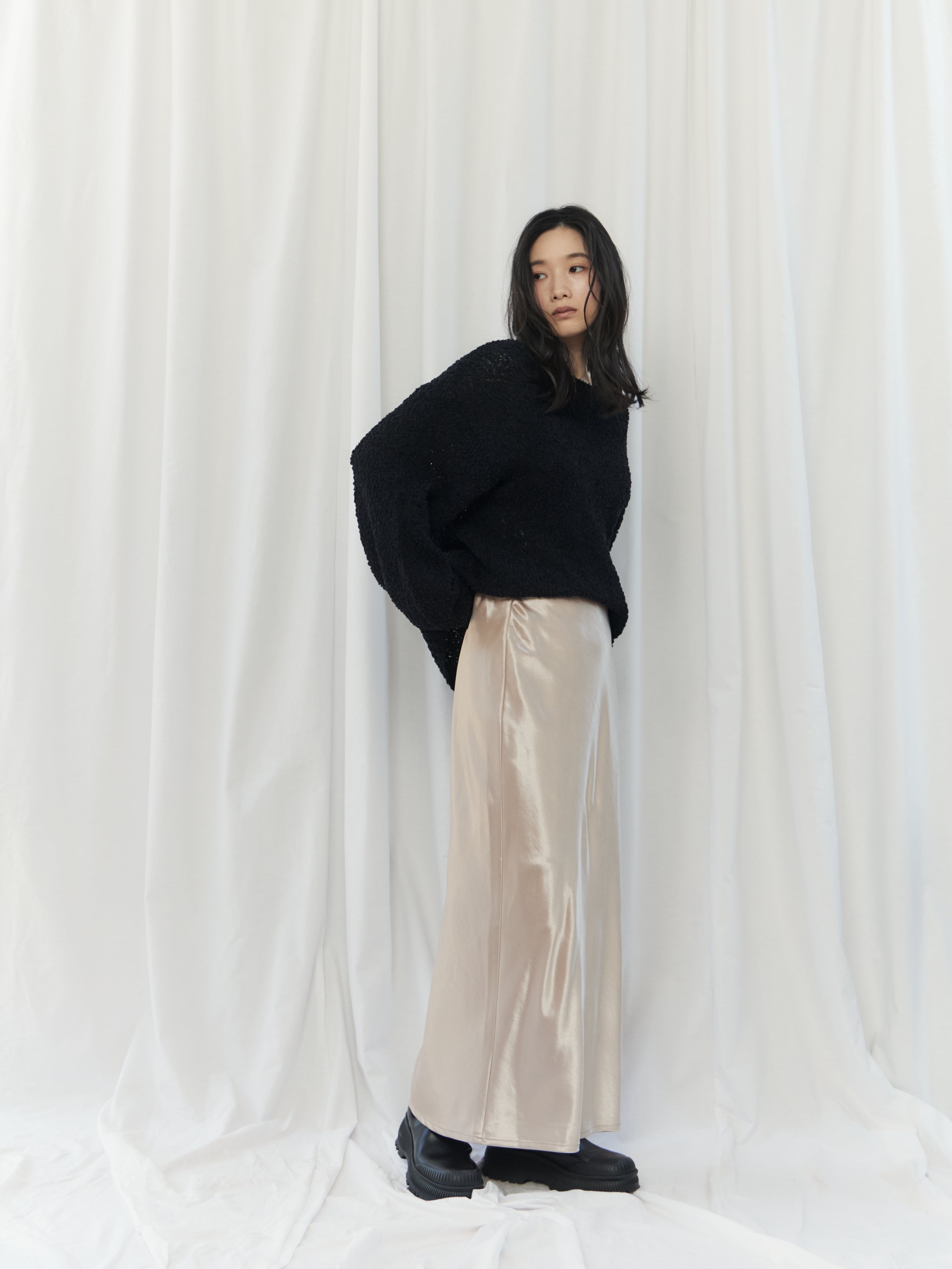 ざっくりとしたニットやスウェットと合わせて素材のコントラストを楽しむのがおすすめ。ボリュームトップスと組み合わせることで、スカートの落ち感がより引き立ち、バランスの取れた着こなしに仕上がります。コンパクトなリブニットやブラウスをインすれば、よりきれいめで洗練された印象に。足元はフラットシューズで抜け感を出したり、ブーツで引き締めたりと、合わせるアイテム次第で雰囲気を自在に変えられます。