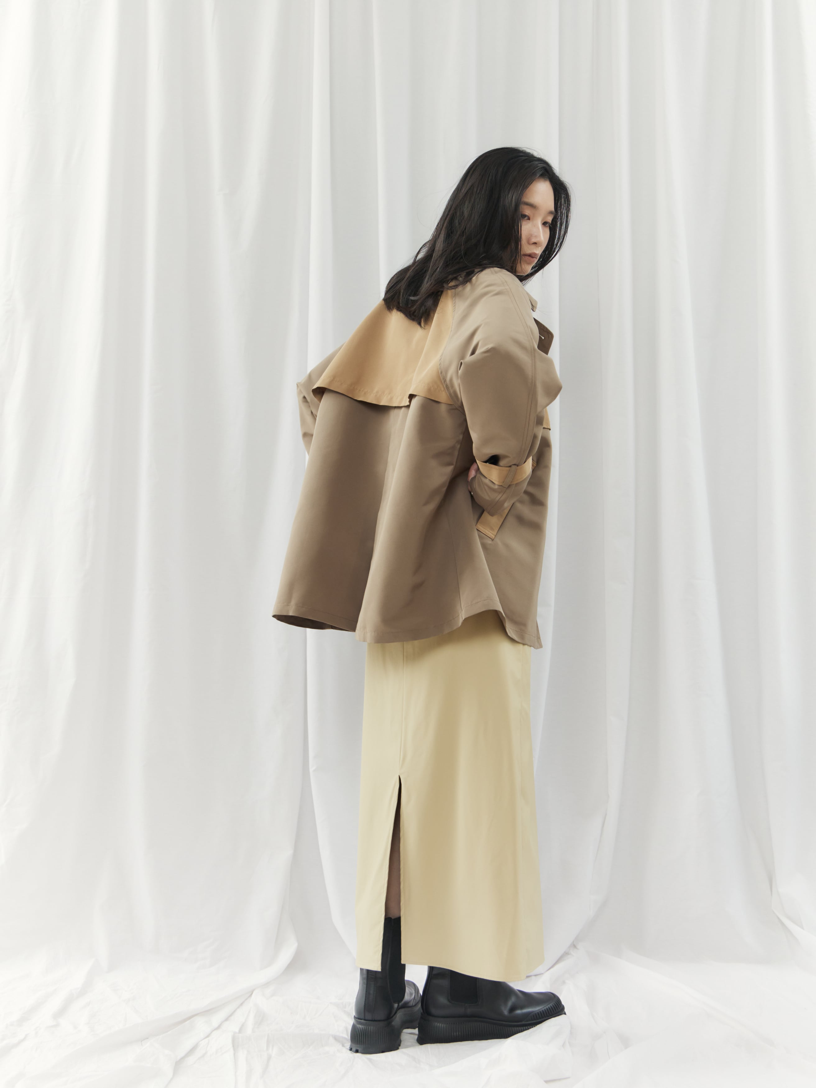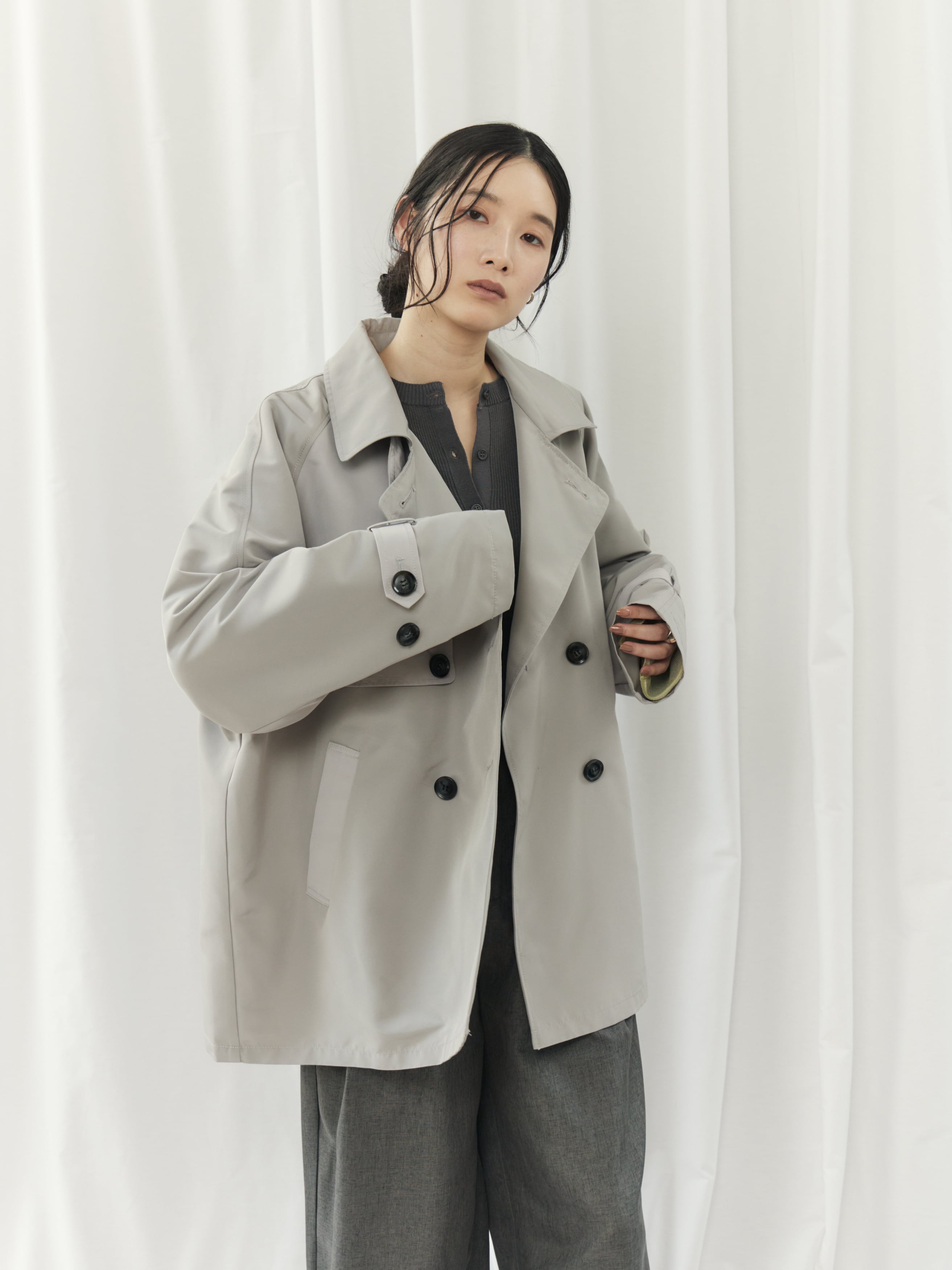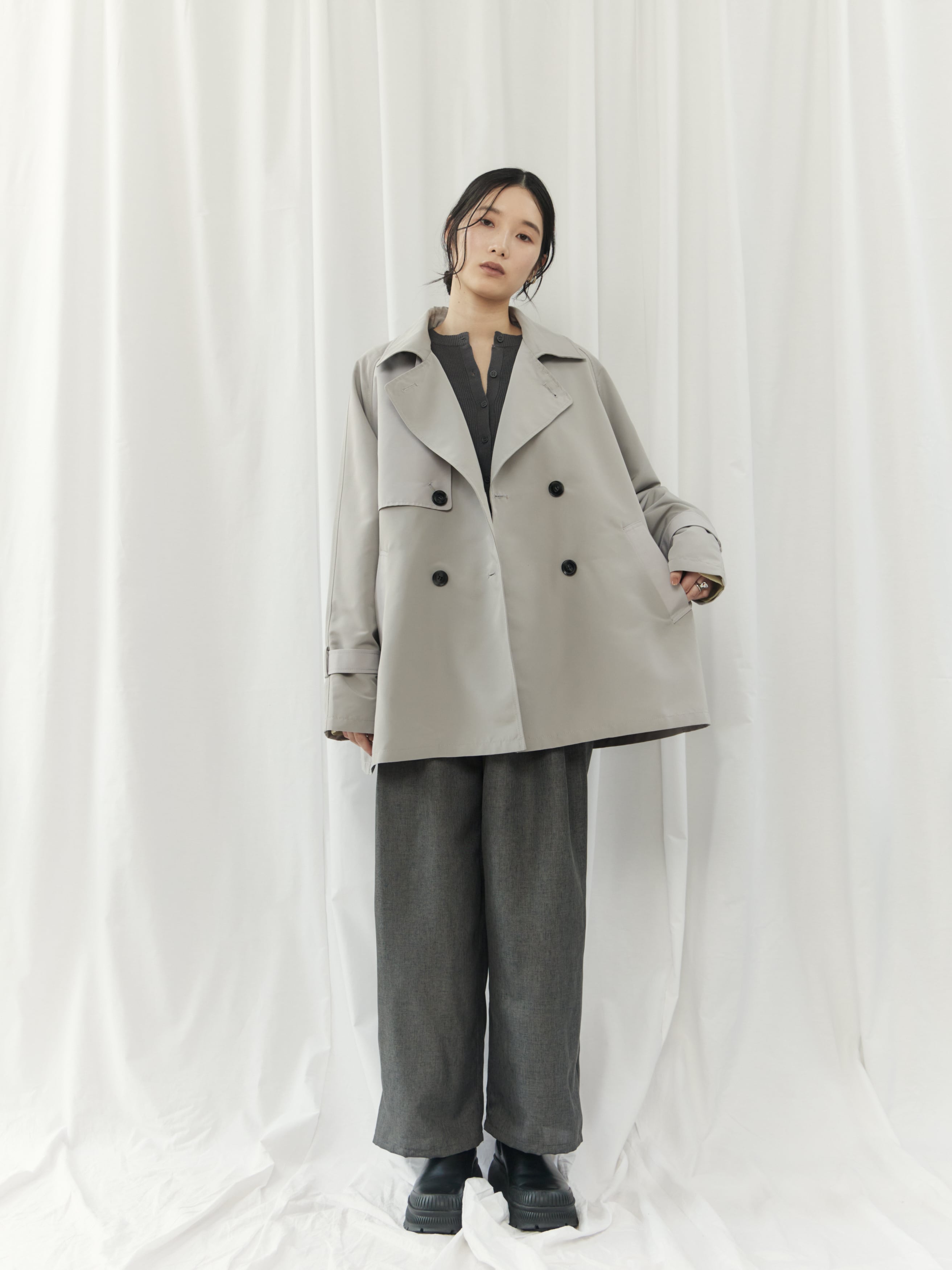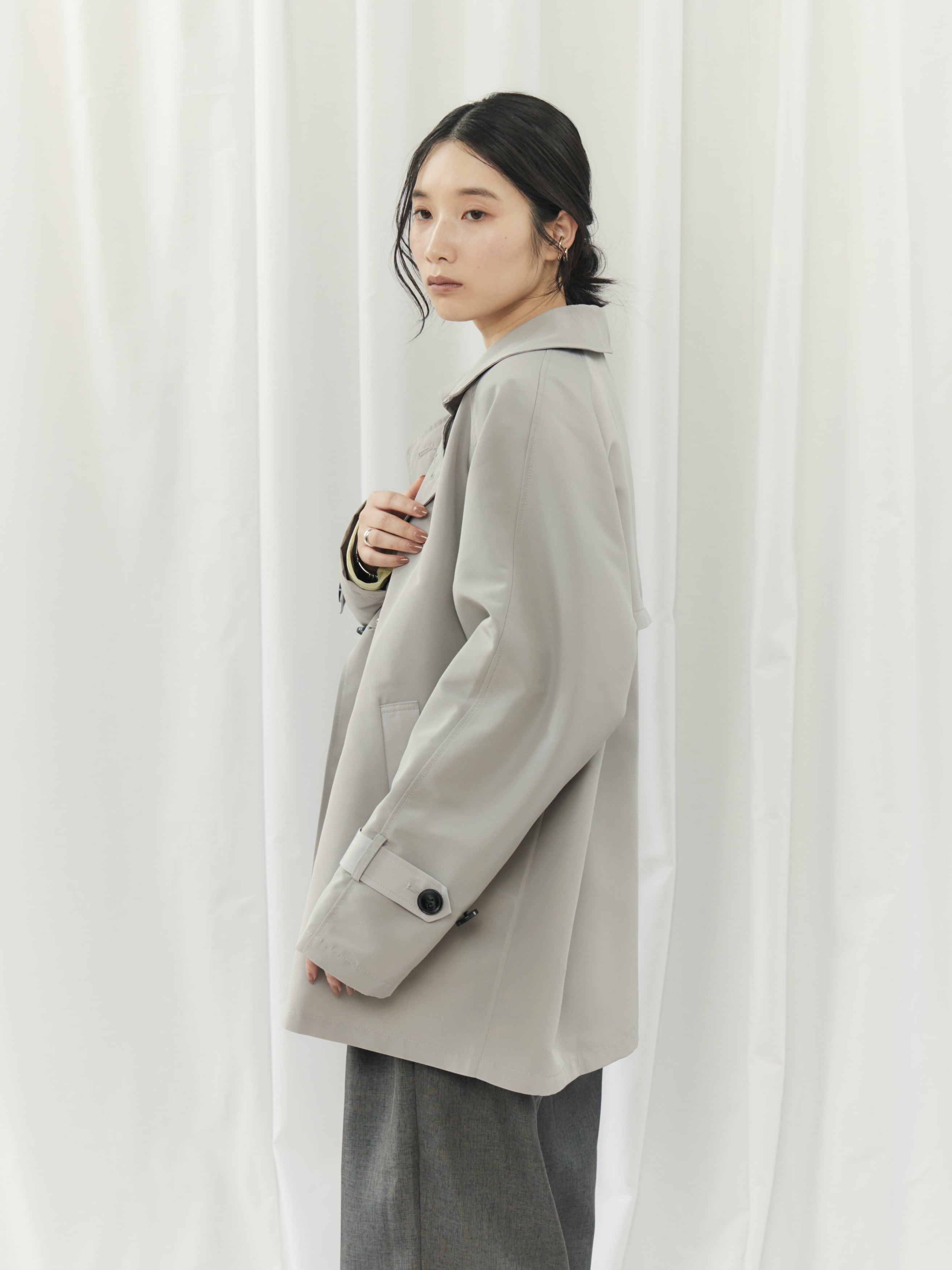 配色の切り替えが印象的な、モダンなショート丈トレンチコート。クラシックなトレンチディテールをベースに、バイカラーデザインと立体感のあるシルエットで今っぽくアップデート。程よくハリのある素材がフォルムを美しく保ち、羽織るだけで洗練された印象に。ショート丈なので重く見えず、パンツ・スカート問わずバランス良く着こなせます。カジュアルからきれいめまで幅広く対応できる、シーズンの主役アウターです。