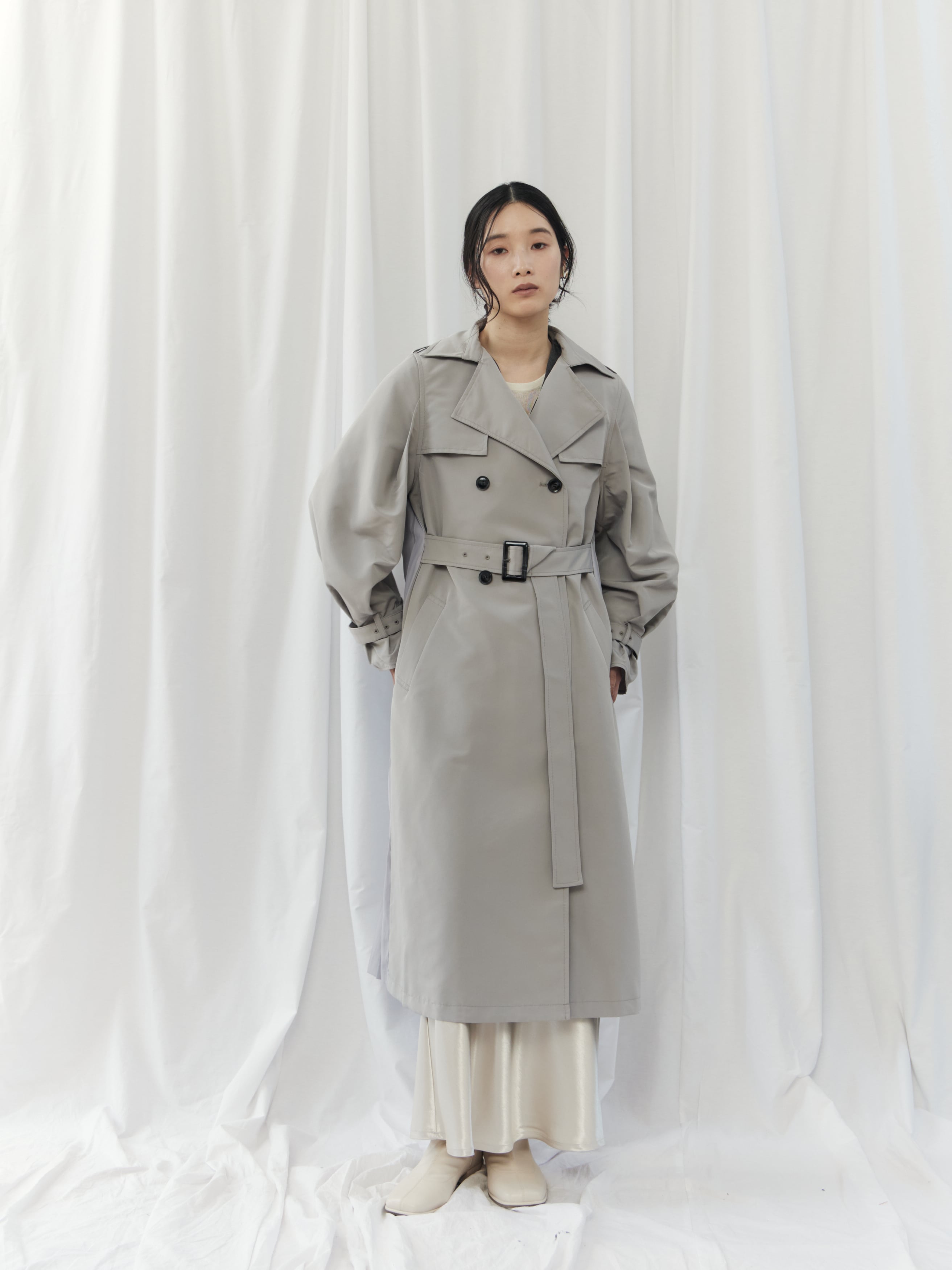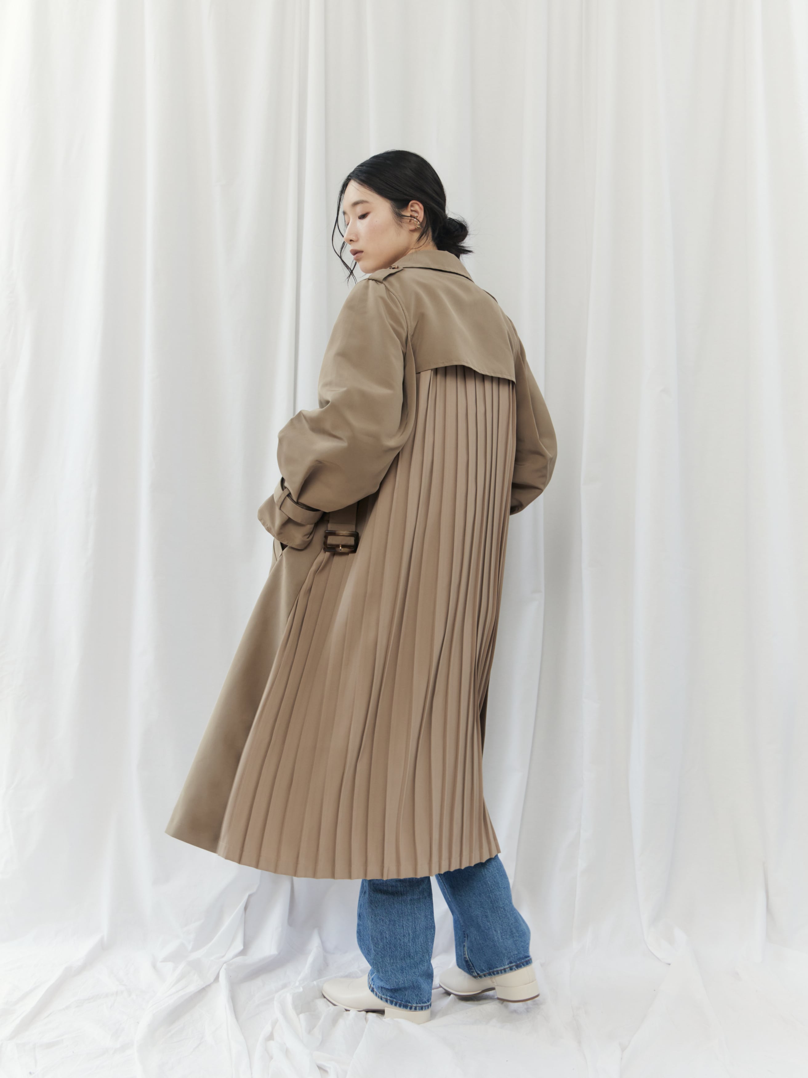 動くたびに美しく揺れるバックプリーツが印象的なロングトレンチコート。クラシックなトレンチの端正な佇まいに、背面のプリーツデザインが軽やかさと女性らしさをプラスします。程よいハリ感のある素材がシルエットを美しく保ち、ロング丈でも重たく見えないのが魅力。前からはシンプルで洗練された印象、後ろ姿は華やかに映える、360度美しい一着です。オンオフ問わず活躍し、羽織るだけでコーディネートを格上げしてくれる主役アウターです。