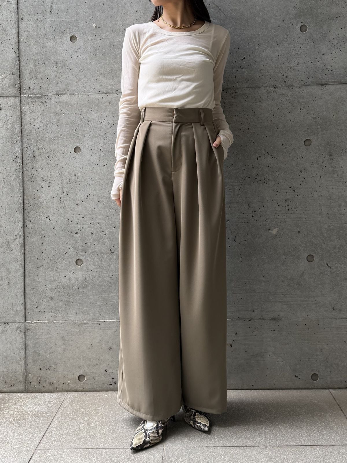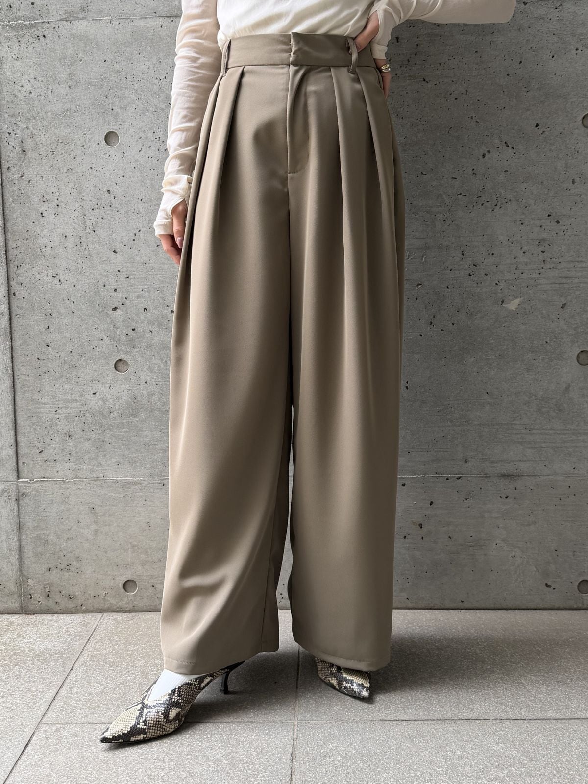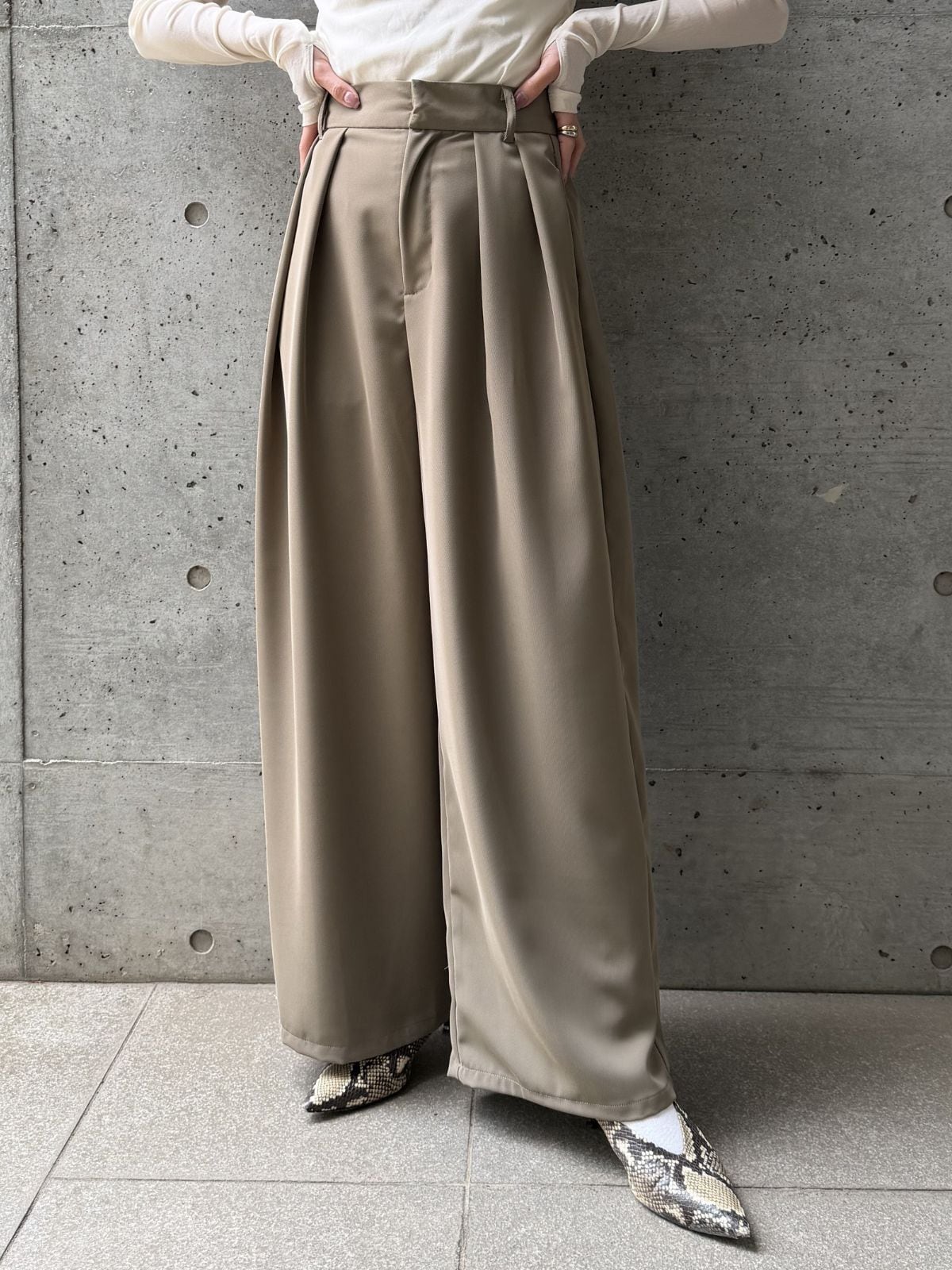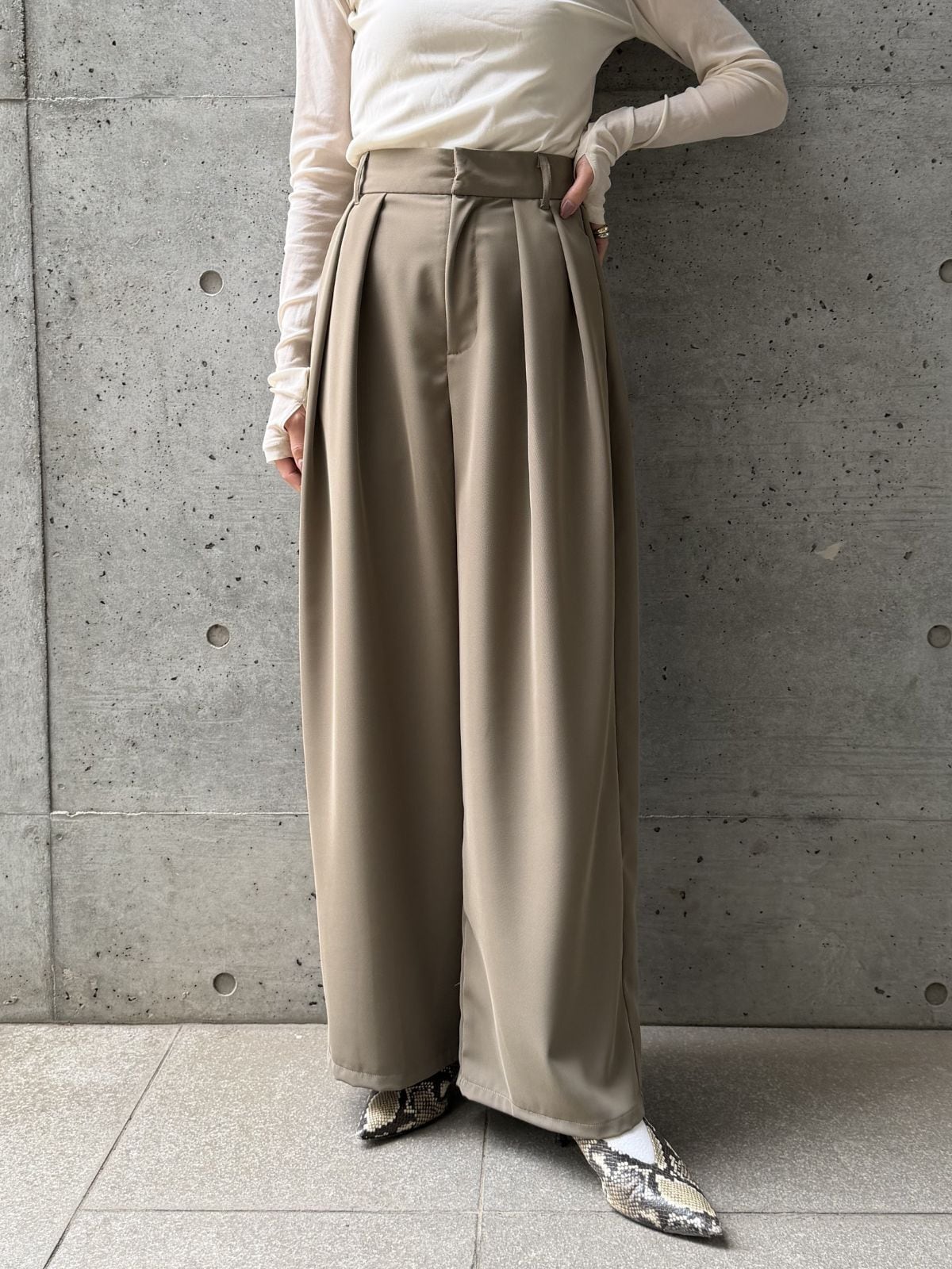 ハイウエストのデザインとタックでスタイルアップ効果◎トップスをインして重心を上げるとバランス良く着こなせます。