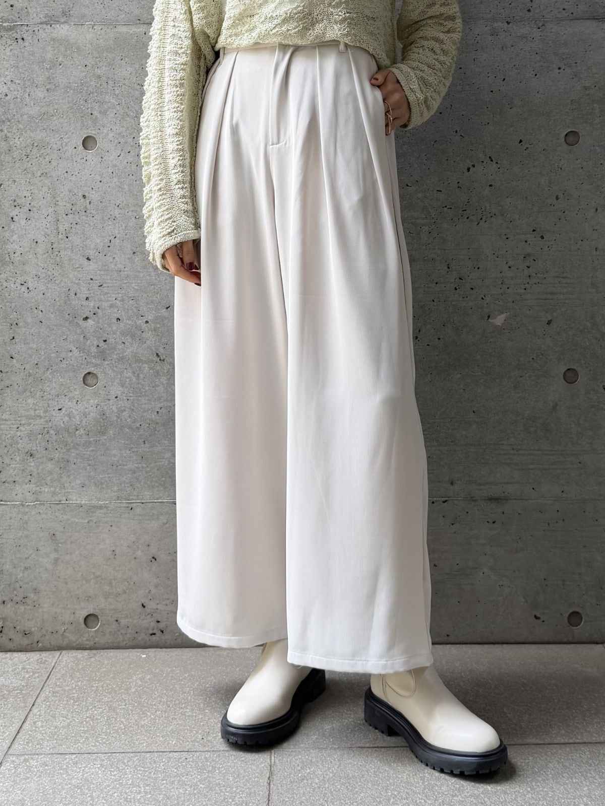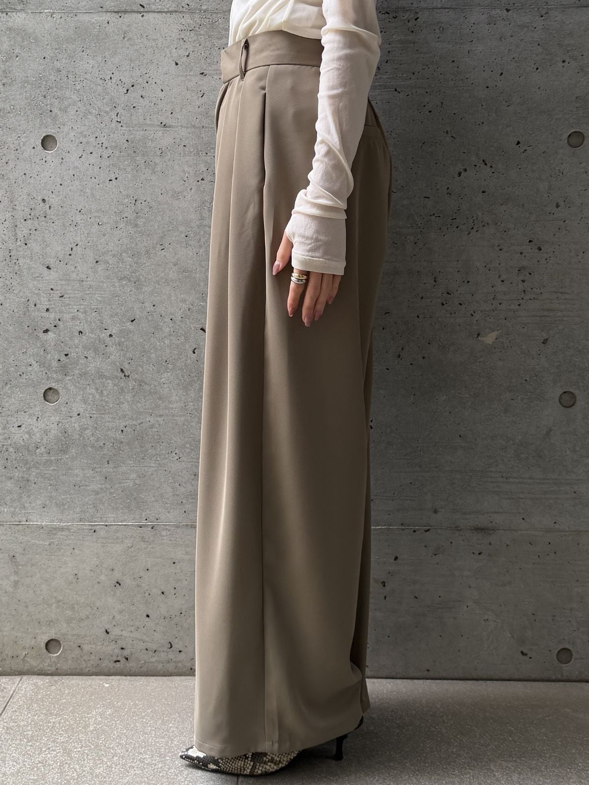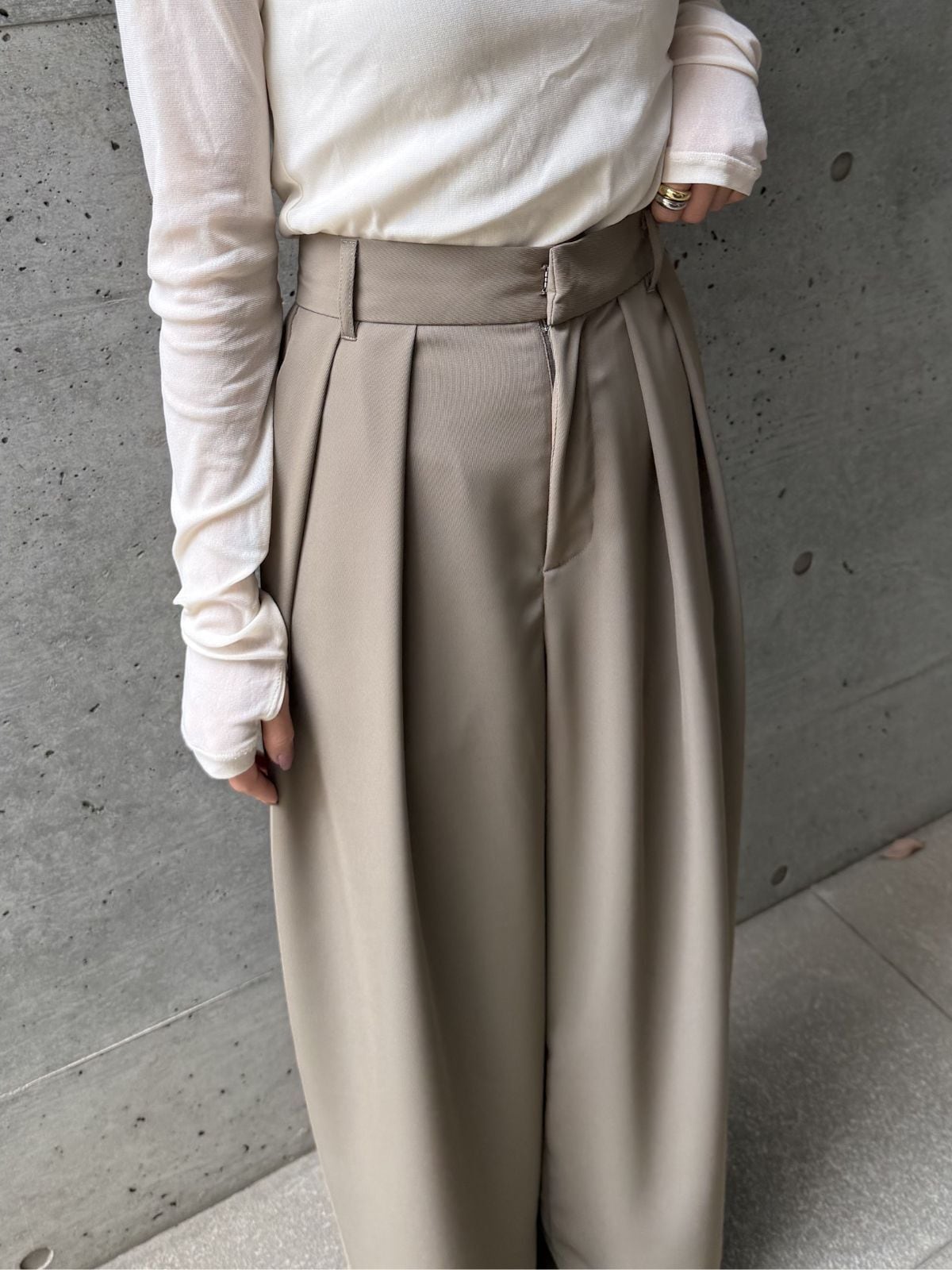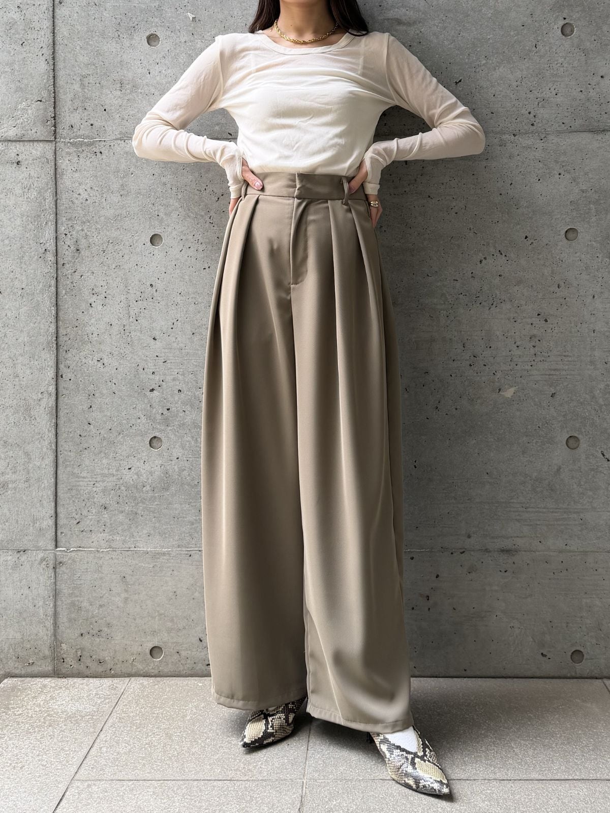 ハイウエストのデザインとタックでスタイルアップ効果◎トップスをインして重心を上げるとバランス良く着こなせます。