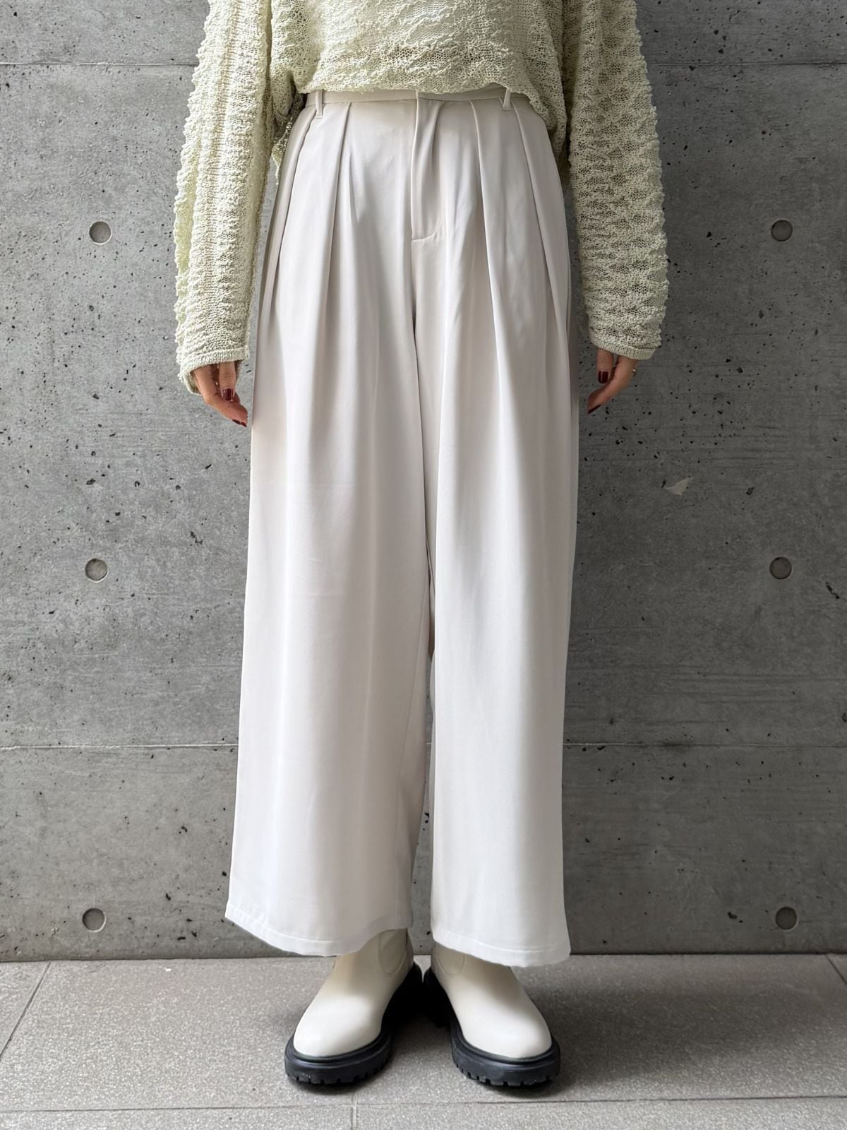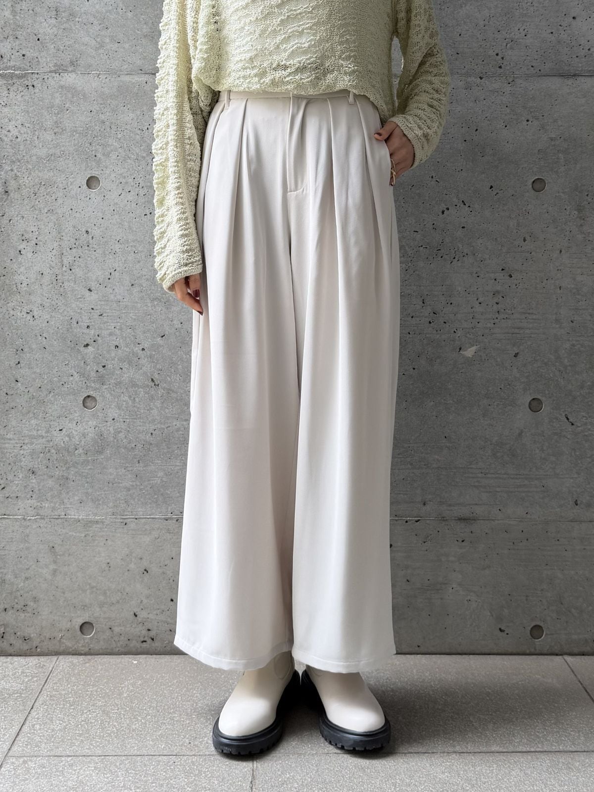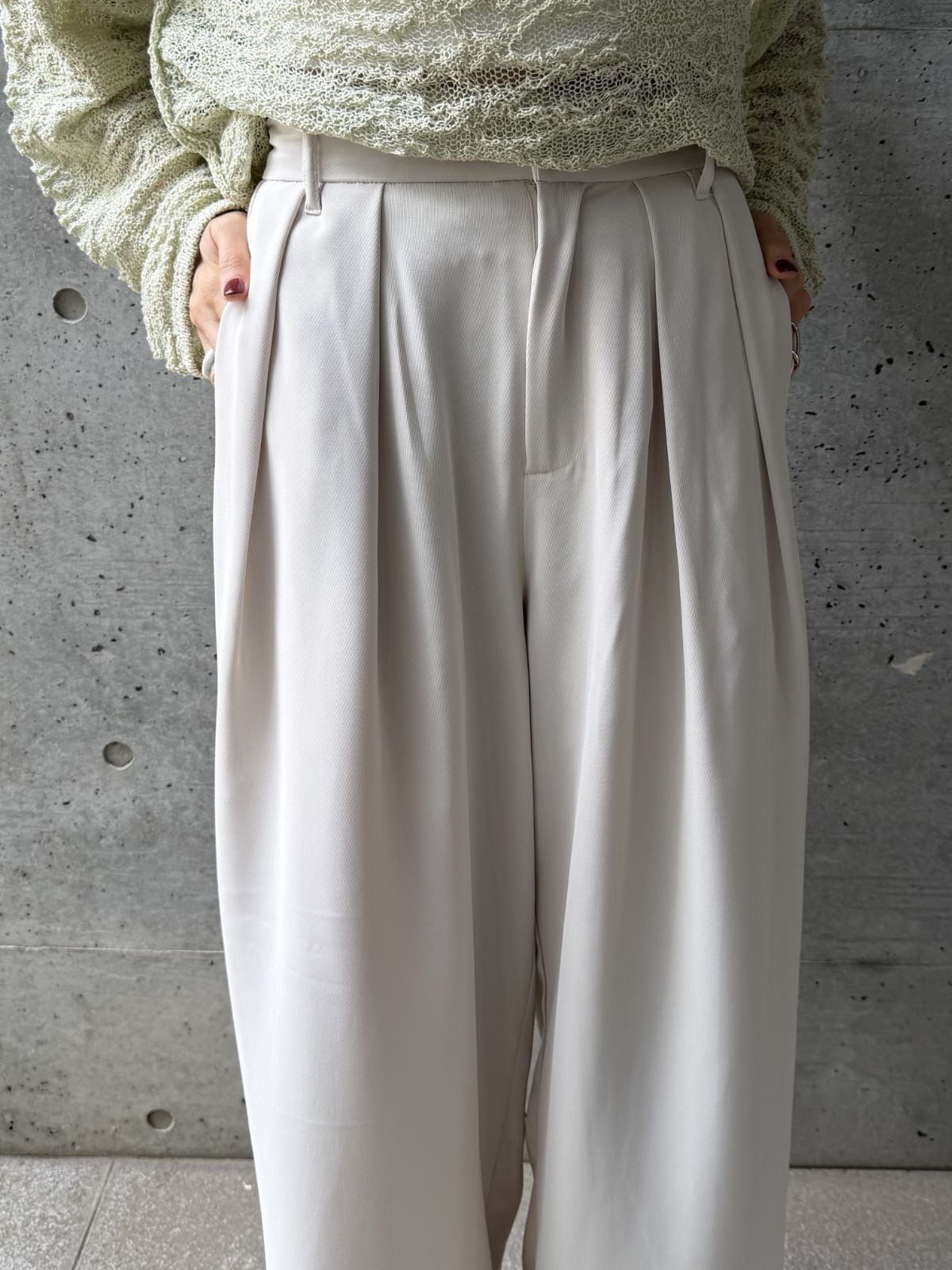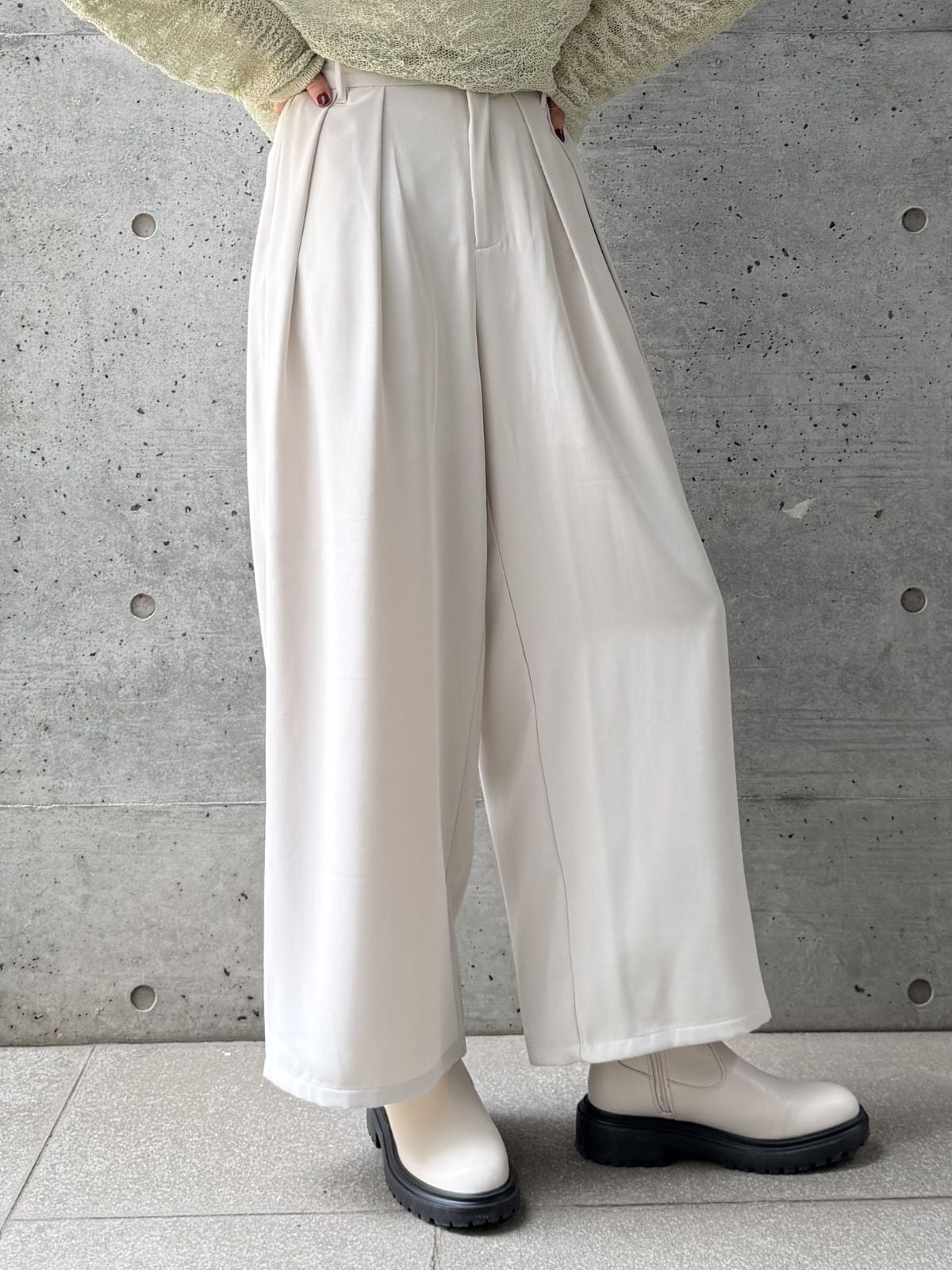 ハイウエストのデザインとタックでスタイルアップ効果◎トップスをインして重心を上げるとバランス良く着こなせます。