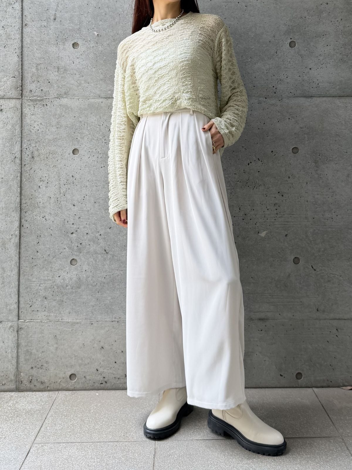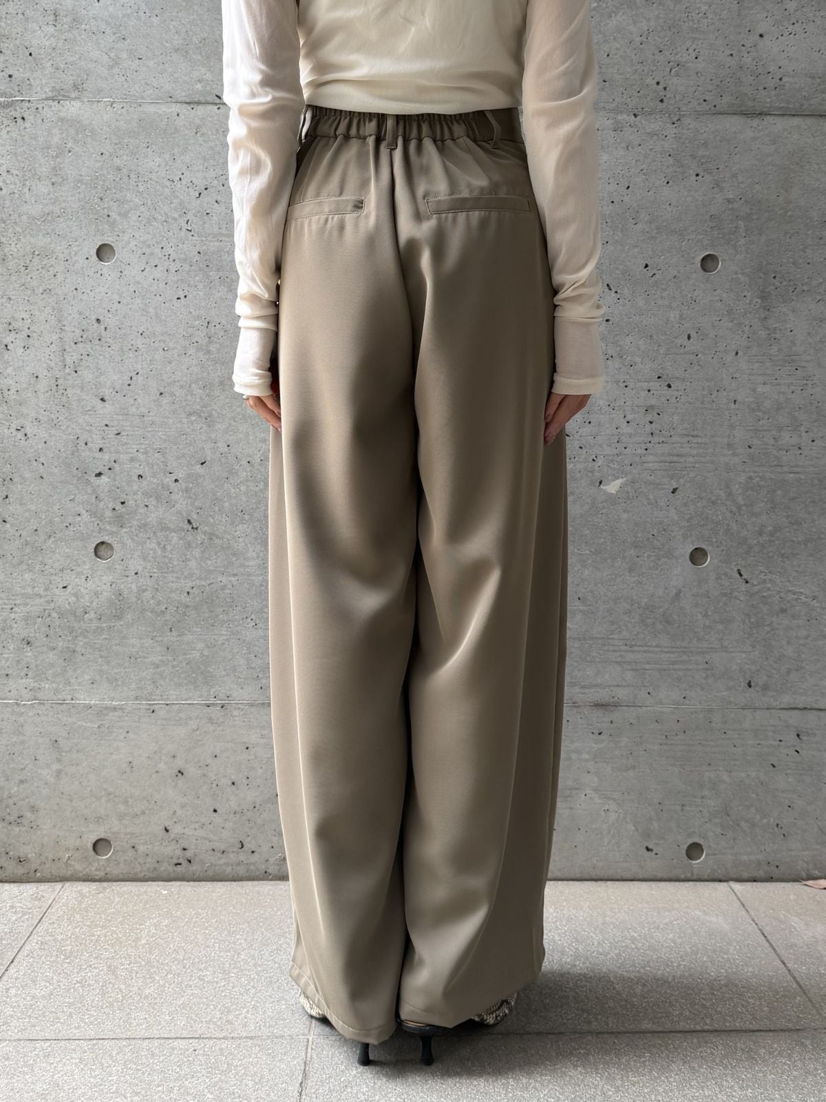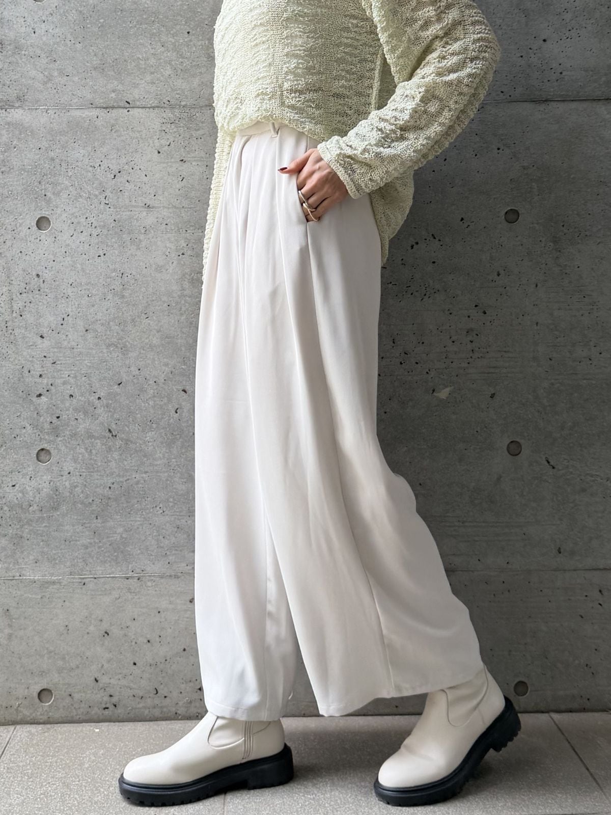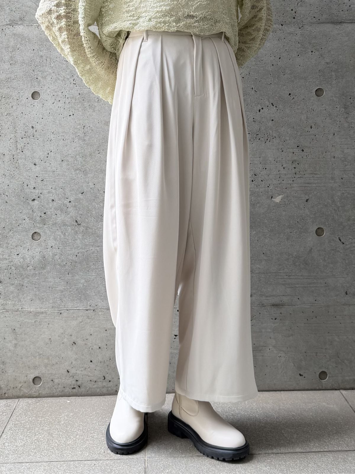 ハイウエストのデザインとタックでスタイルアップ効果◎トップスをインして重心を上げるとバランス良く着こなせます。