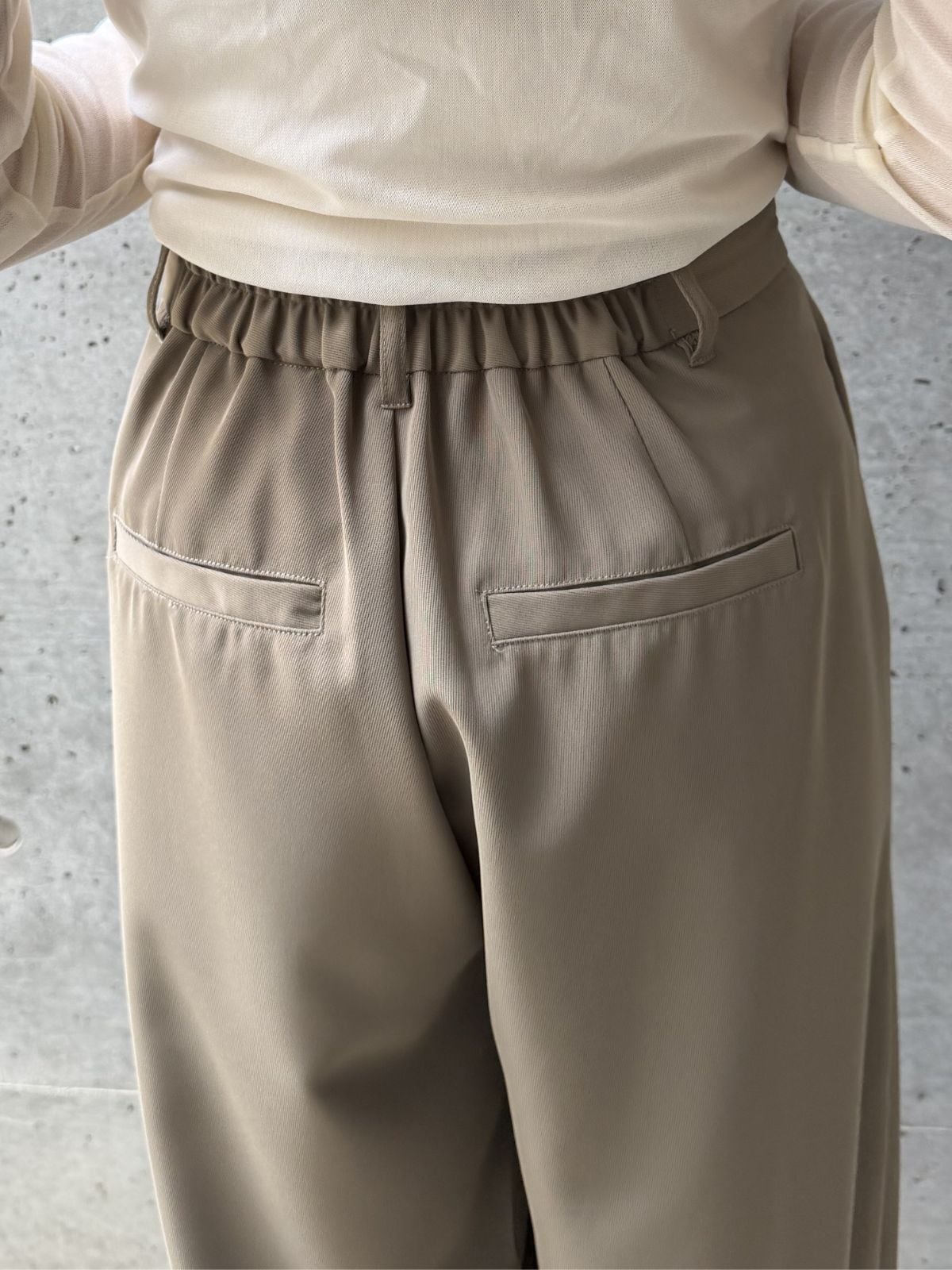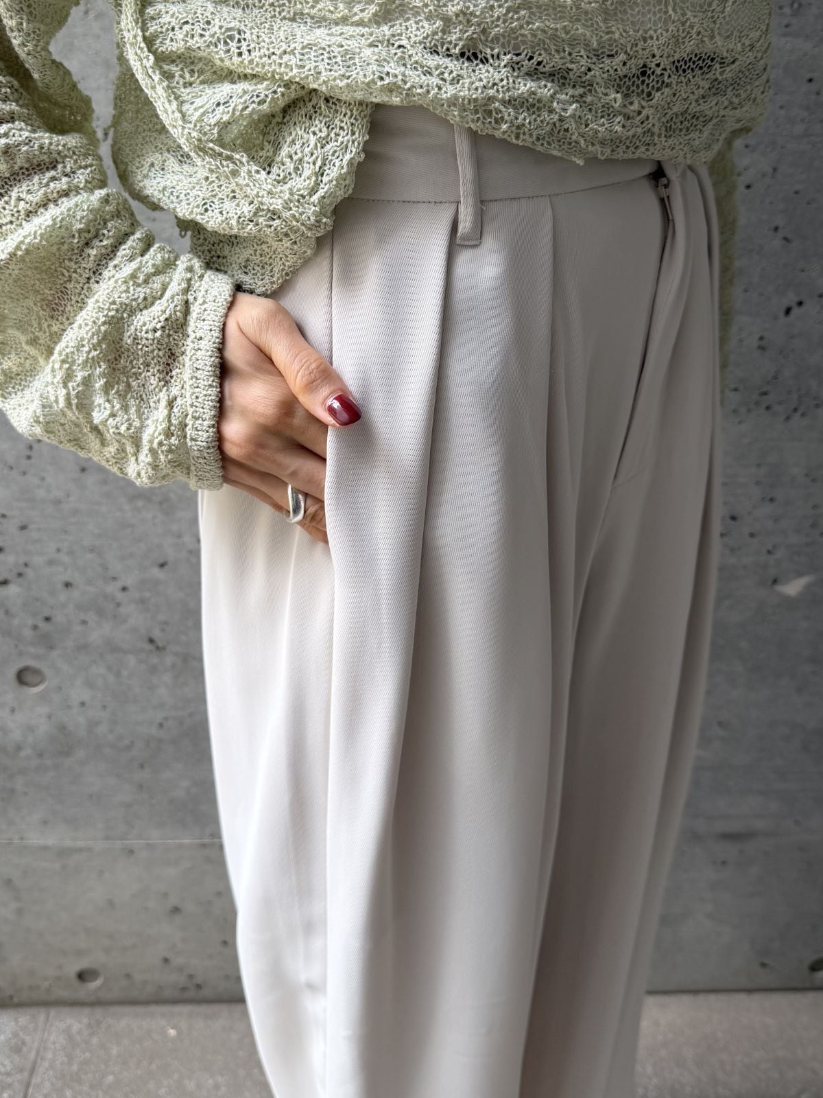 コンパクトなニットやカーディガンを合わせることで、ウエストまわりをすっきり見せたメリハリのある着こなしが完成します。ややゆとりのあるトップスを合わせれば、程よく抜け感のある大人のリラックススタイルに。ジャケットを羽織ればきちんと感が加わり、通勤やお出かけシーンにも自然になじみます。同系色でまとめると、柔らかく上品な印象に仕上がり、パンツの美しいラインがより引き立ちます。