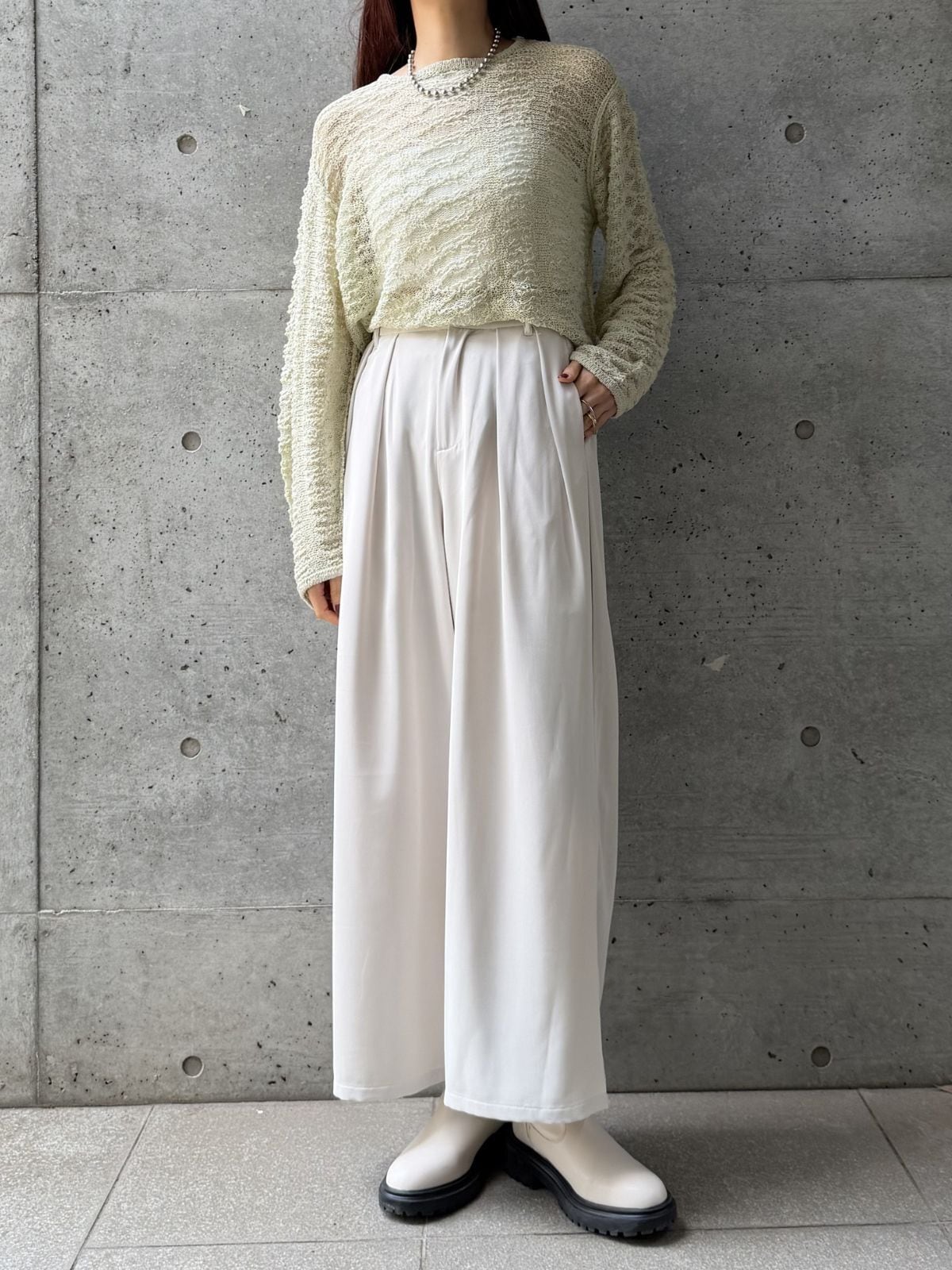 ゆとりのあるワイドシルエットが自然にフィット。ざっくりニットやオーバーサイズトップスと合わせたラフな着こなしもおすすめです。