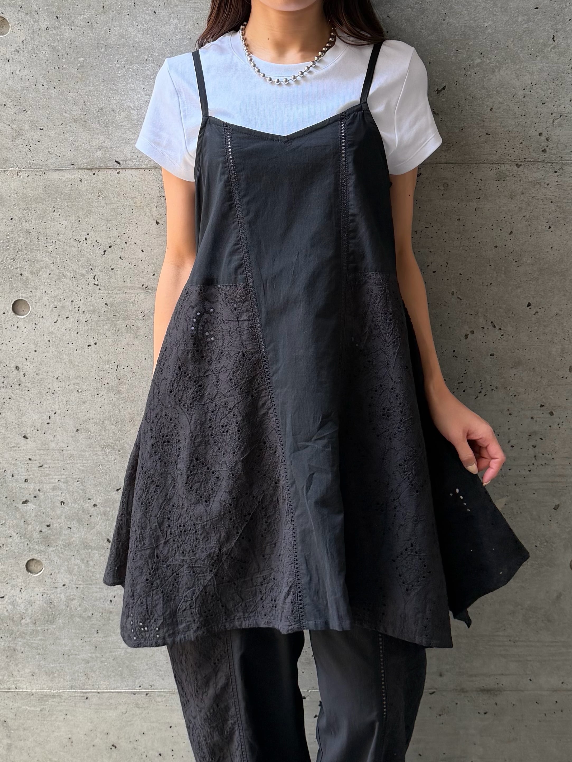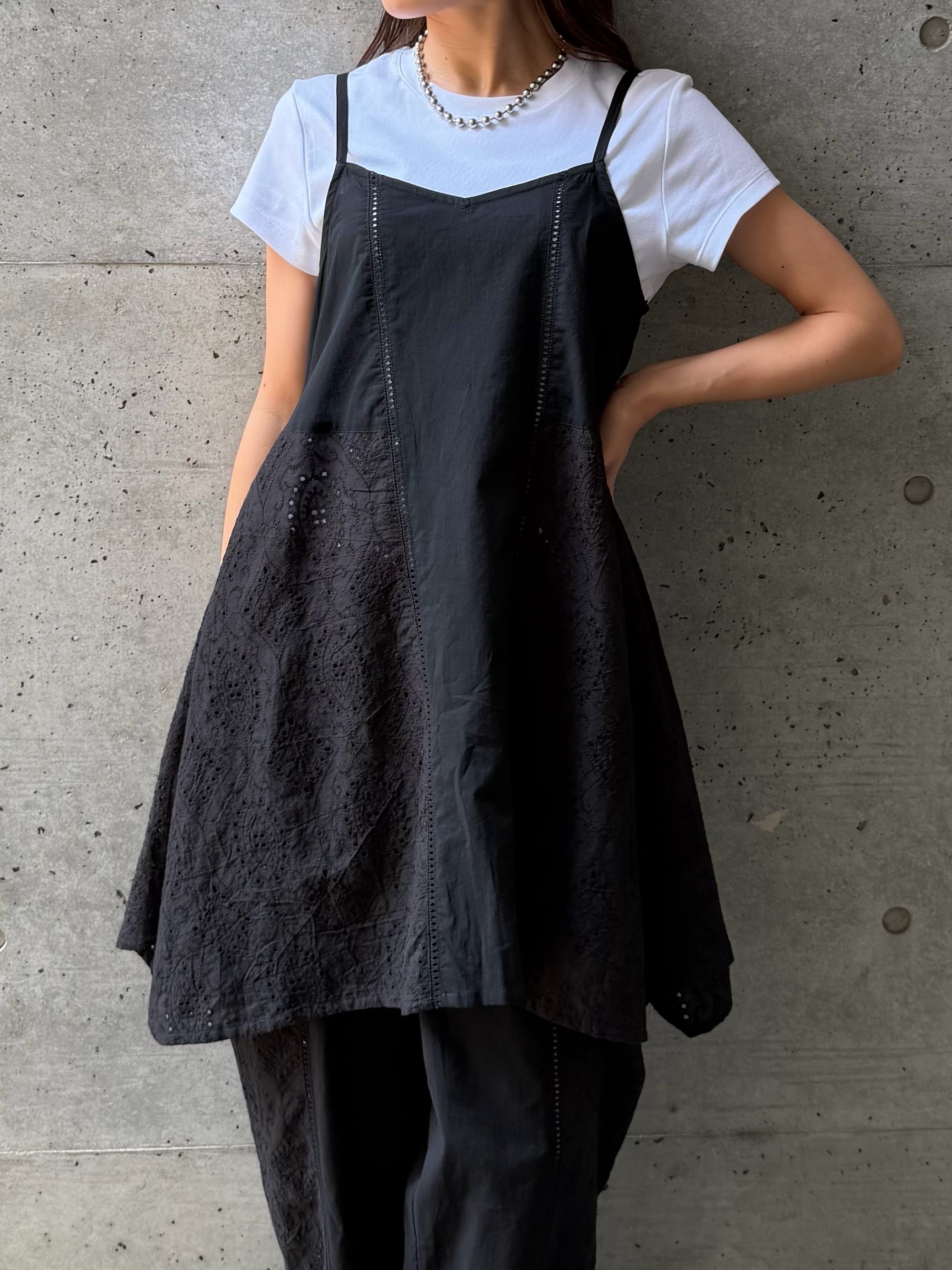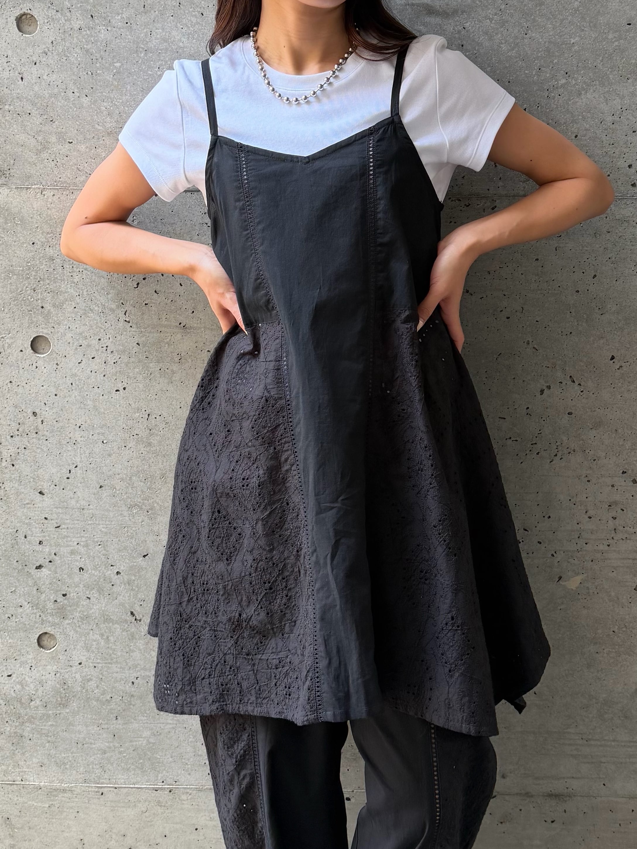 さりげなく縦に入ったレースデザインが、シンプルながらも表情のある一枚に仕上げています。ふんわりと広がるAラインシルエットが女性らしく、身体のラインを優しくカバーしてくれるのも嬉しいポイント。華奢なストラップが抜け感を演出し、ヘルシーで軽やかな印象に導きます。ヒップにかかる丈感で安心感がありつつ、レイヤード次第でロングシーズン活躍。同素材のシャツやパンツとのセットアップスタイルも楽しめる、着回し力の高いアイテムです。