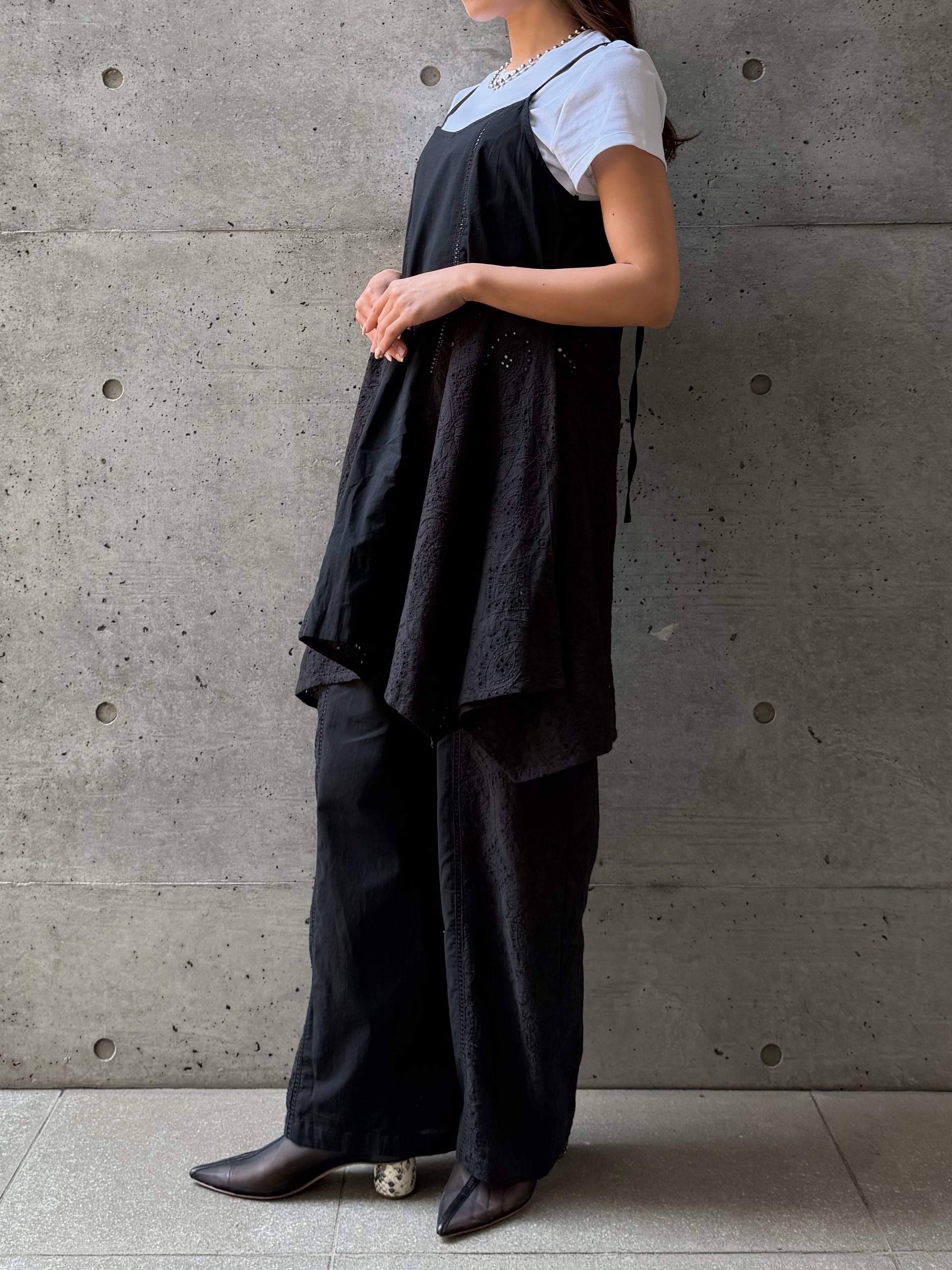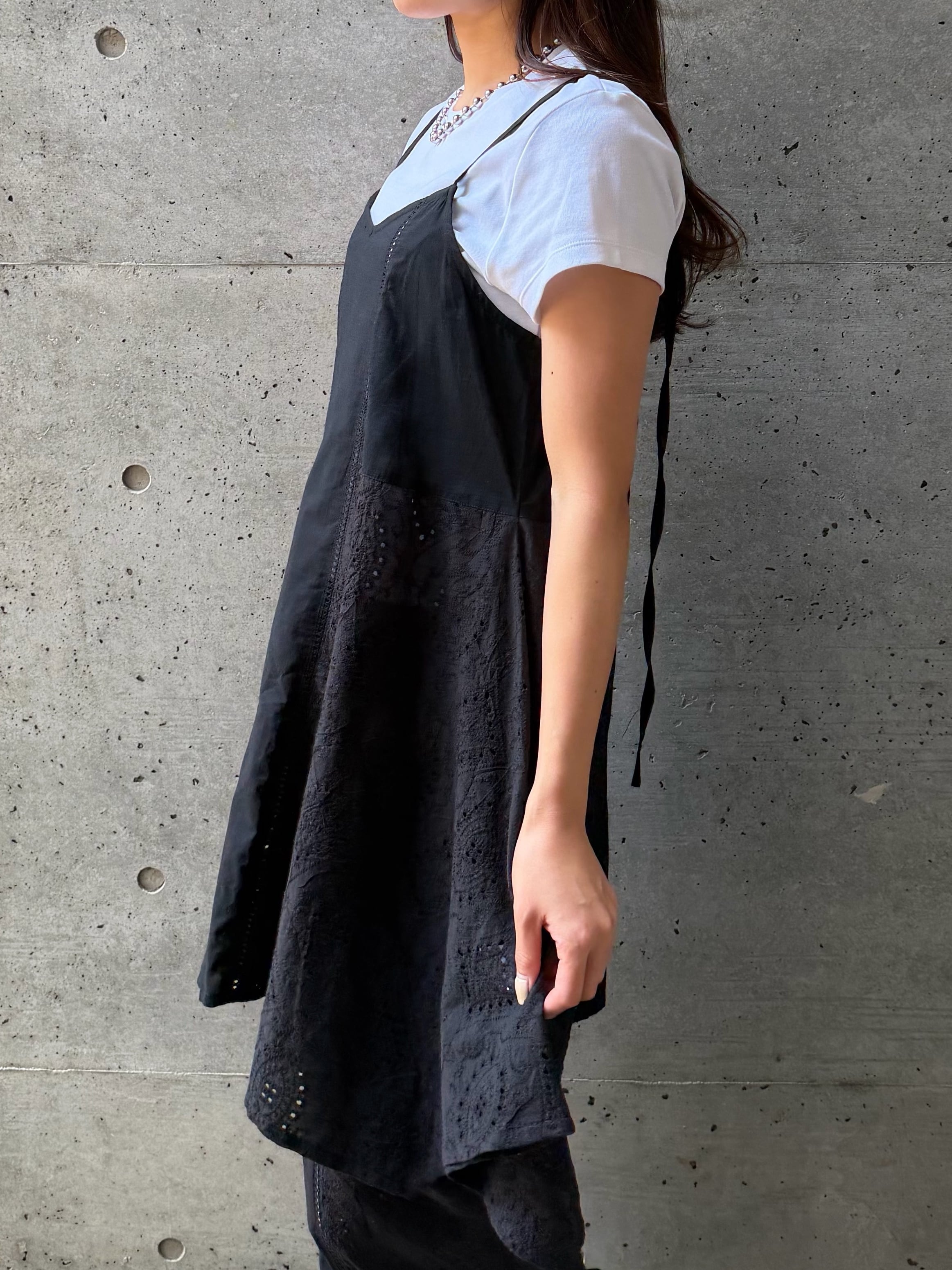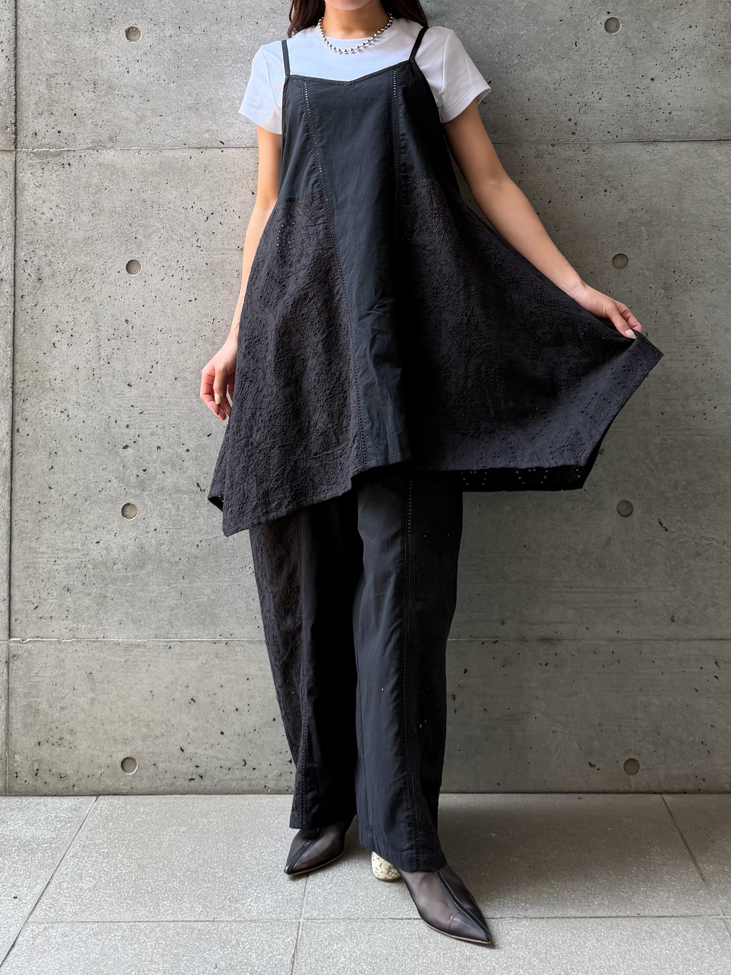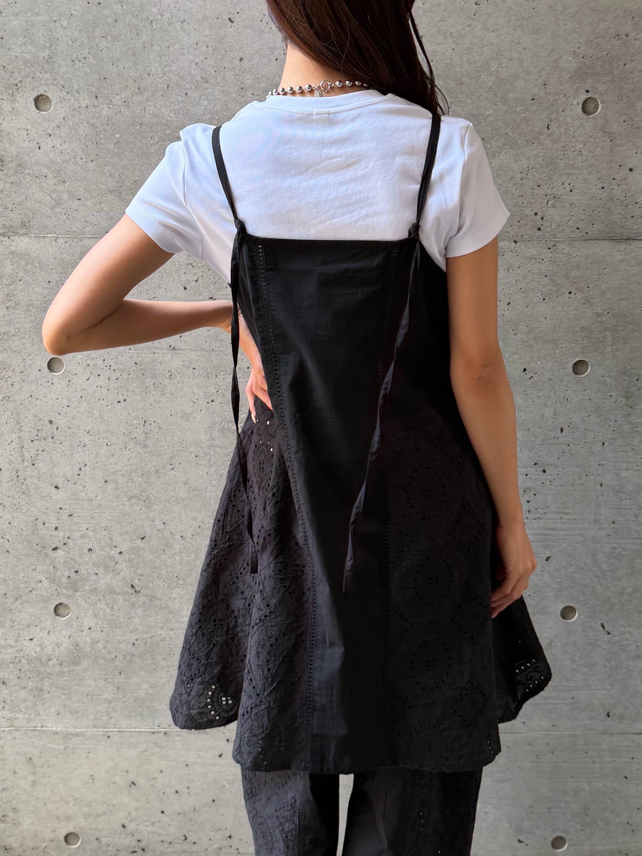 さりげなく縦に入ったレースデザインが、シンプルながらも表情のある一枚に仕上げています。ふんわりと広がるAラインシルエットが女性らしく、身体のラインを優しくカバーしてくれるのも嬉しいポイント。華奢なストラップが抜け感を演出し、ヘルシーで軽やかな印象に導きます。ヒップにかかる丈感で安心感がありつつ、レイヤード次第でロングシーズン活躍。同素材のシャツやパンツとのセットアップスタイルも楽しめる、着回し力の高いアイテムです。