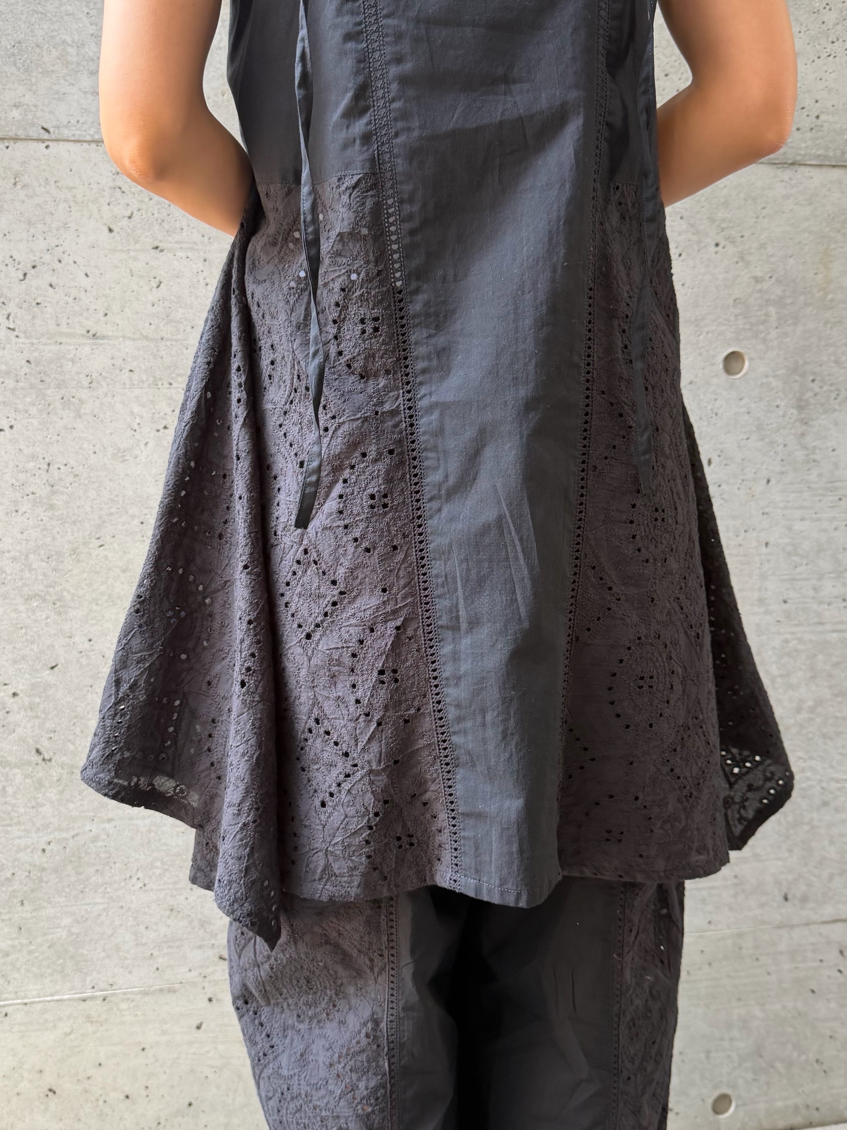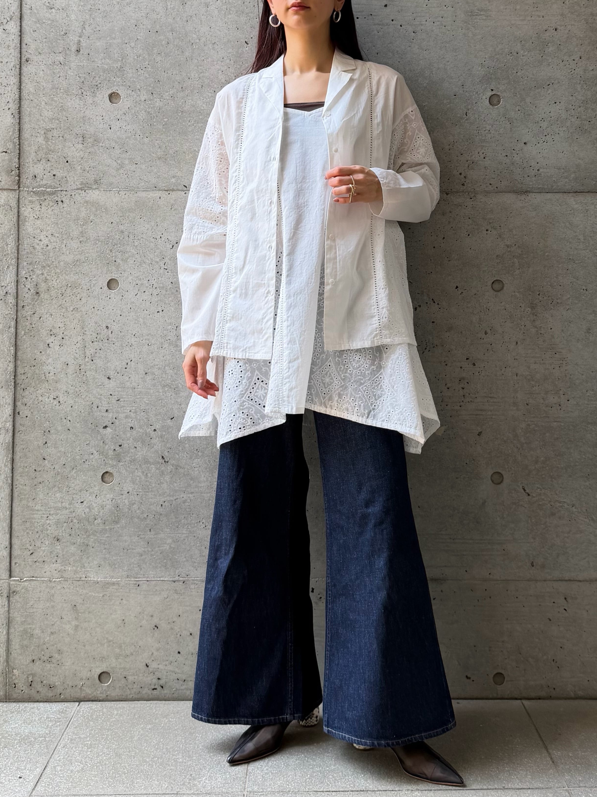 同素材の[LAWN LACE OPEN COLLAR SHIRT(ローンレースオープンカラーシャツ)【3376100】][LAWN LACE EASY PANTS(ローンレースイージーパンツ)【3776101】]を合わせた3ピースのスタイリングは、ナチュラルで洗練されたムードを演出できるおすすめの着こなし。インナーにキャミを仕込み、シャツを軽く羽織ることで、奥行きのあるレイヤードスタイルが完成します。また、シンプルなデニムや細身のパンツと合わせることで、チュニックのふんわりとしたシルエットが引き立ち、メリハリのあるバランスに。インナーにTシャツをレイヤードすれば、カジュアルダウンした着こなしも楽しめます。シアートップスやタンクトップとのレイヤードで、季節感のある軽やかなスタイリングに仕上げるのもおすすめ。合わせるアイテム次第で幅広いテイストに対応してくれる一枚です。