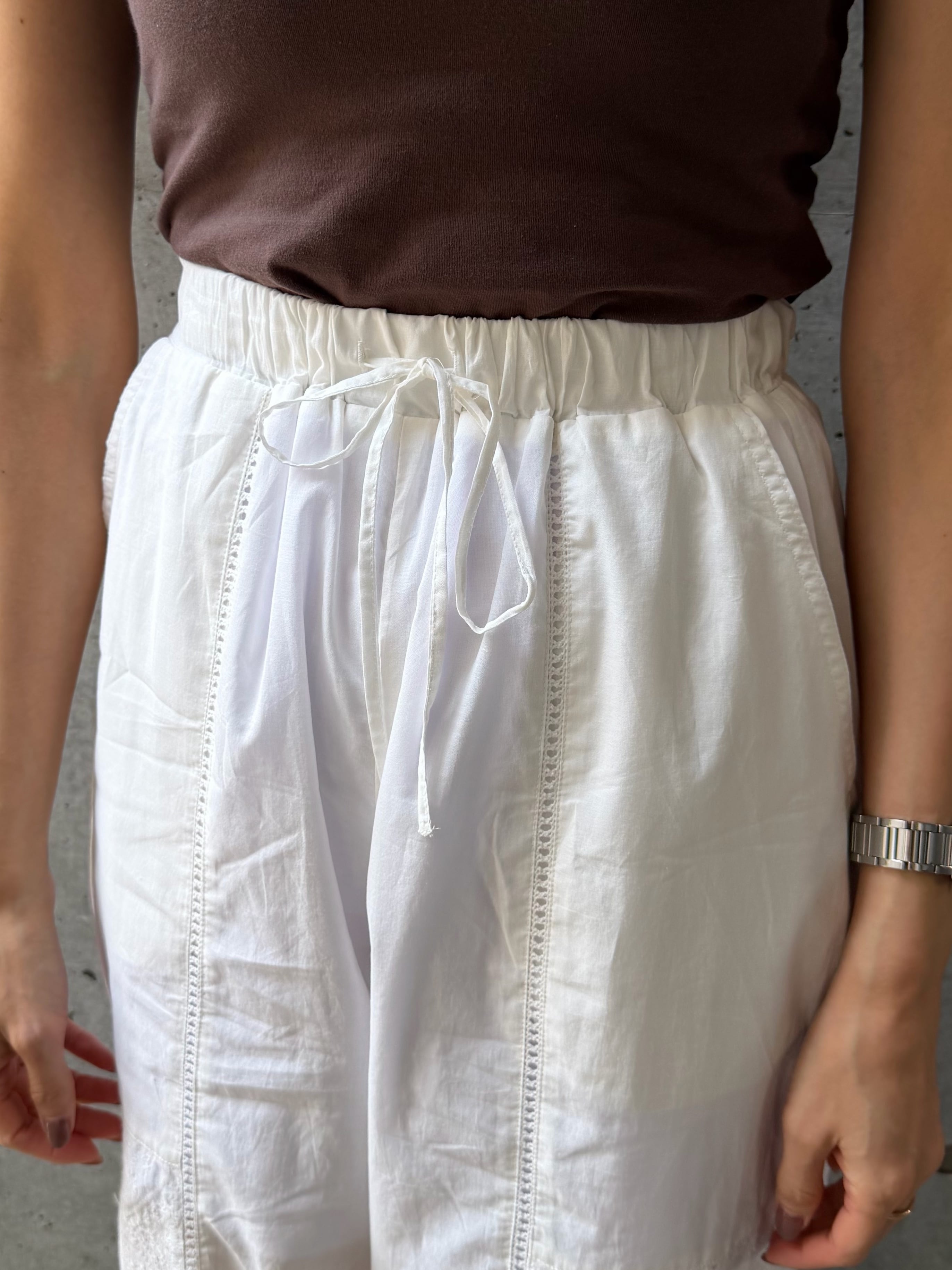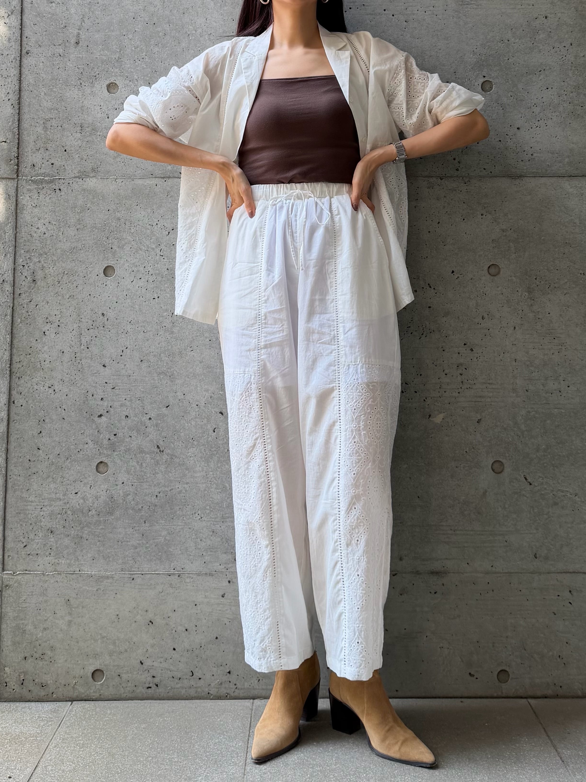 同素材の[LAWN LACE OPEN COLLAR SHIRT(ローンレースオープンカラーシャツ)【3376100】][LAWN LACE TUNIC CAMI(ローンレースチュニックキャミ)【3276101】]と合わせたセットアップスタイルは、ナチュラルで洗練された雰囲気を簡単に作れるおすすめの着こなし。全体をワントーンでまとめることで、リラックス感がありながらも大人っぽくまとまります。単品で着る場合は、コンパクトなトップスやタンクトップを合わせることで、パンツの程よいボリューム感が引き立ち、バランスの良いシルエットに。シンプルなTシャツと合わせても、レースのディテールがコーディネートに奥行きを出してくれます。足元はフラットサンダルで抜け感を出したり、あえてスニーカーでカジュアルダウンするのも◎。シーンに合わせて雰囲気を変えられる、着回し力の高い一着です。