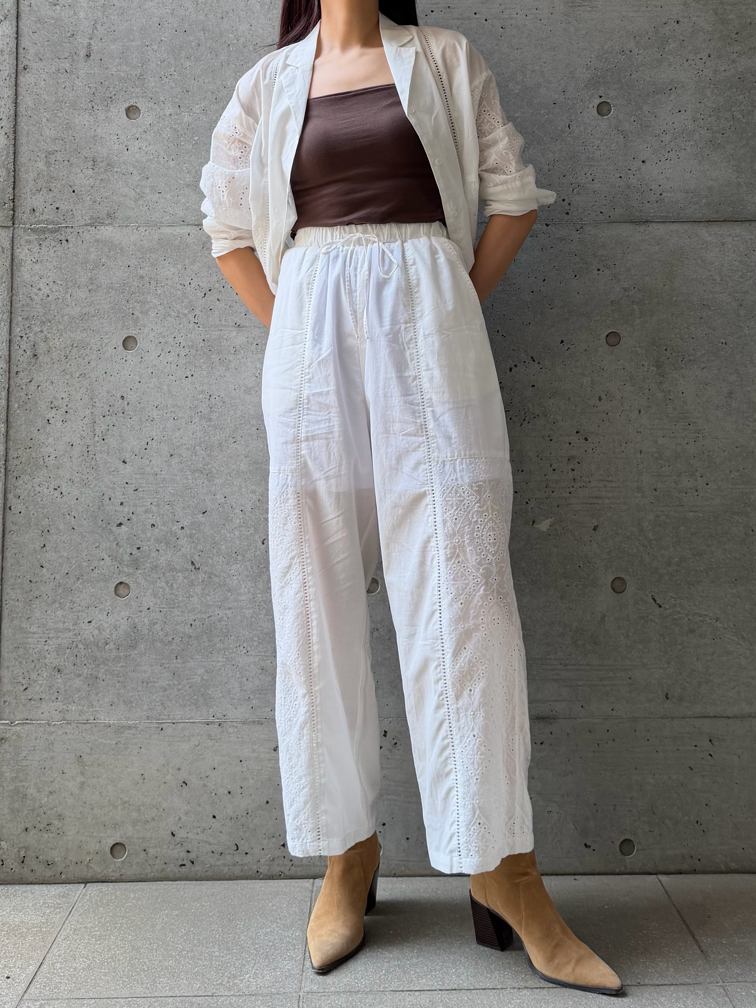 軽やかなローン素材に繊細なレースを施した、ナチュラルな雰囲気漂うイージーパンツ。柔らかく肌あたりの良い生地感で、リラックスした履き心地を叶えながらも、縦に入ったレースデザインがさりげなくスタイルアップを演出してくれます。ウエストはゴム仕様でストレスフリーな着用感。程よくゆとりのあるシルエットが脚のラインを拾いすぎず、抜け感のあるバランスに仕上げてくれます。シンプルながらも素材とディテールで魅せる一着で、同素材のシャツとのセットアップはもちろん、単品使いでもコーディネートに軽やかさをプラスしてくれるアイテムです。