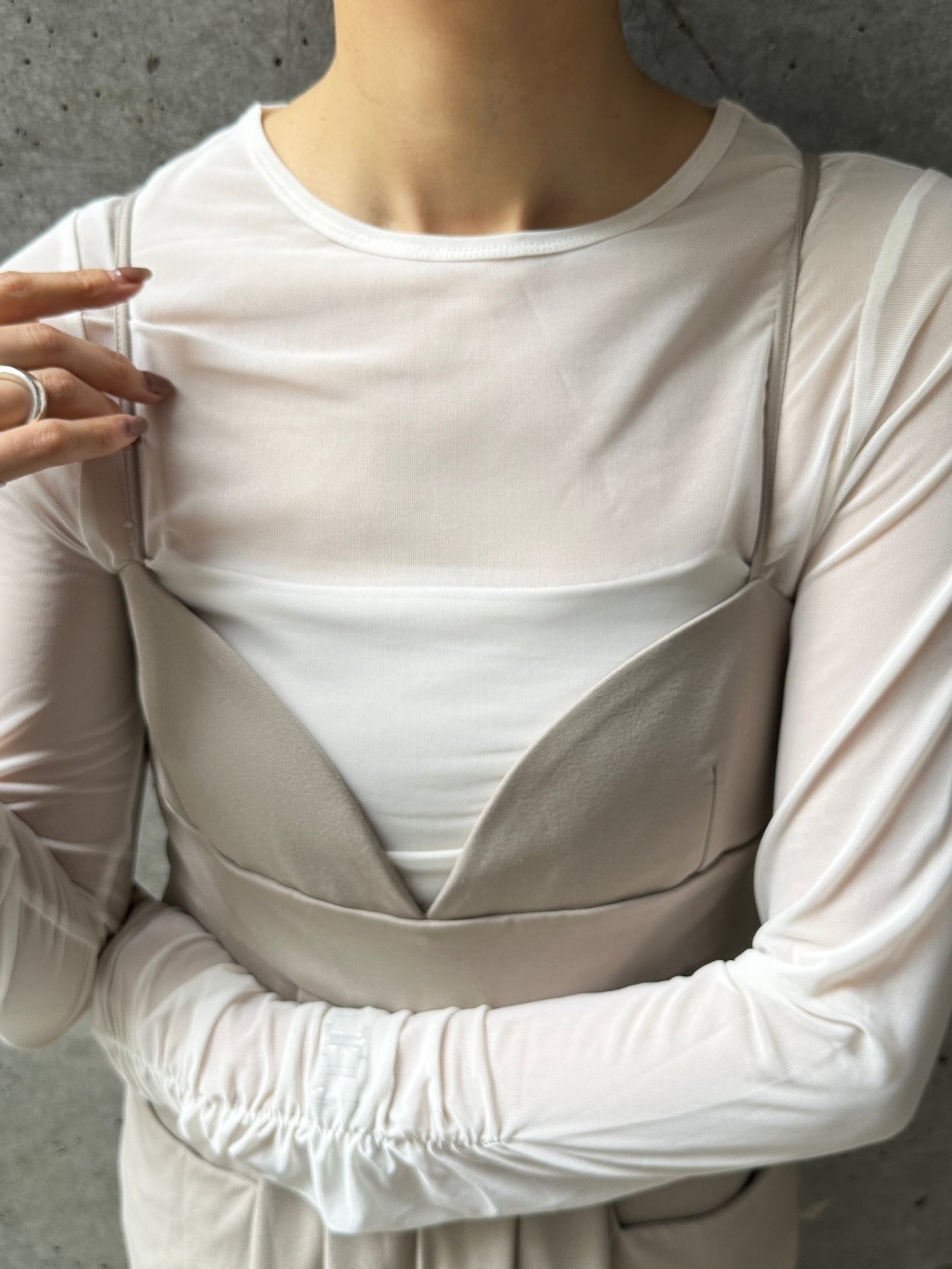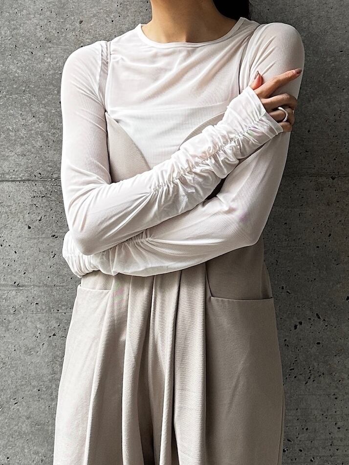 キャミソールやブラトップをインナーに合わせたヘルシーなスタイリングがおすすめ。デニムやスラックスと合わせるだけで、抜け感のある大人カジュアルが完成します。また、タイトスカートやマーメイドスカートと合わせれば、女性らしさを引き立てたきれいめコーデにも◎。スリーブデザインがアクセントになるため、シンプルなボトムと合わせるだけでもスタイリングが華やかに見えます。ジャケットやジレのインナーとして取り入れることで、袖のデザインを活かしたレイヤードスタイルも楽しめる一枚です。
