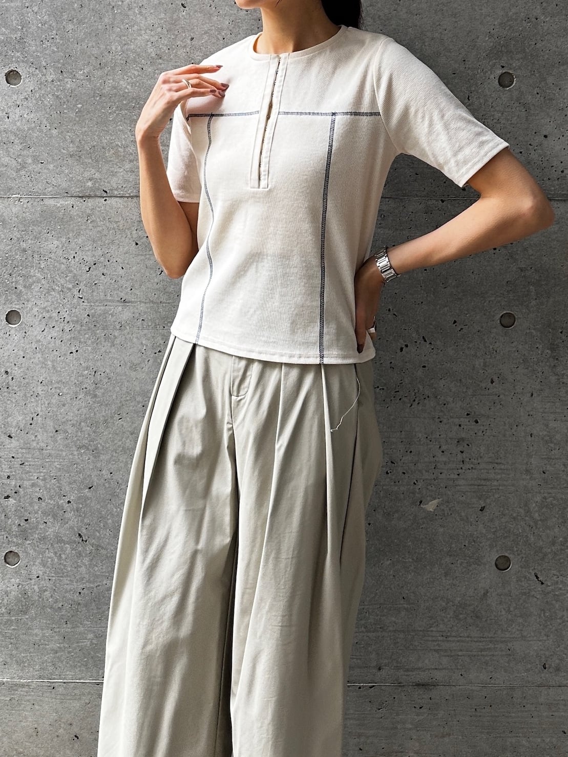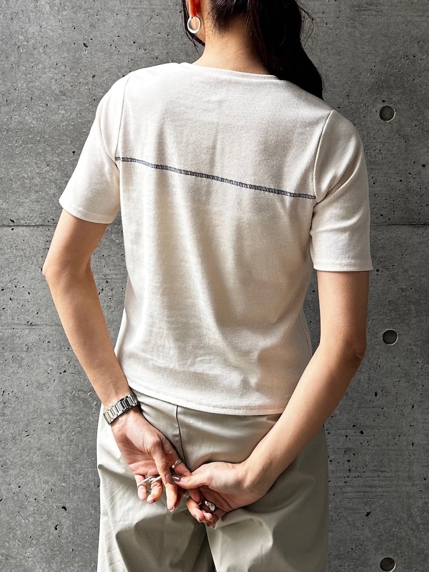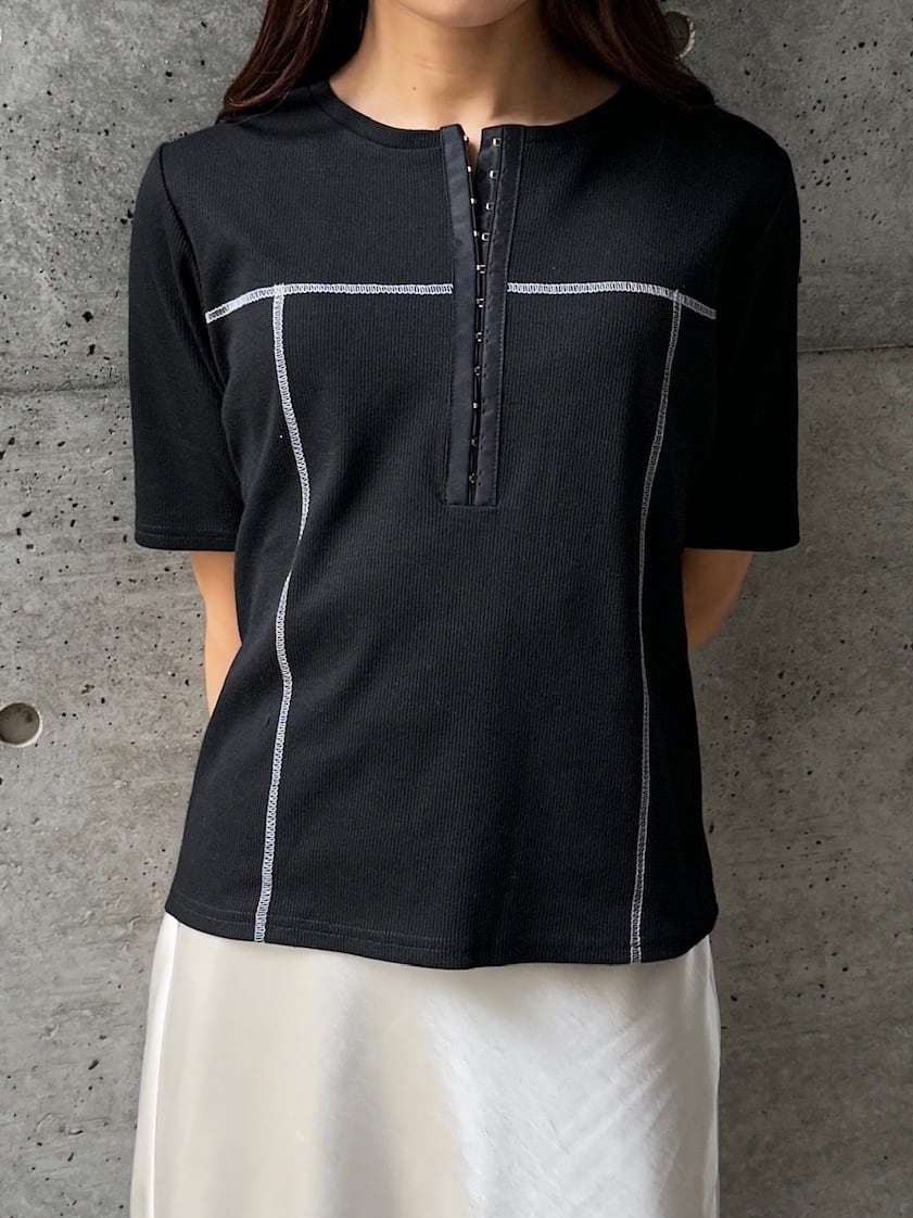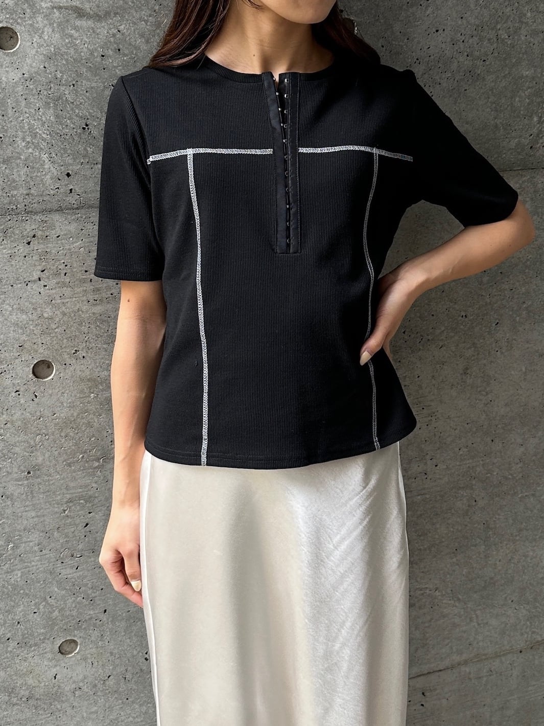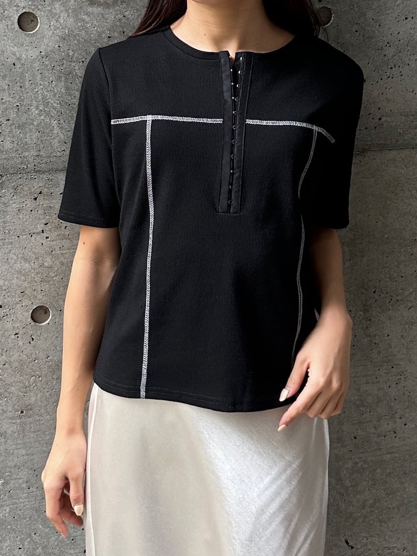 配色ステッチがアクセントになった、ミニマルなリブトップス。すっきりとしたシルエットに、フロントの切り替えやホック使いのヘンリーネックでトレンド感を効かせることで、シンプルながらも一枚でサマになるデザインに仕上げています。程よく身体にフィットするリブ素材が、女性らしいラインを引き立てつつ、ストレスフリーな着心地を実現。でコンパクトなサイズ感で、ボトムを選ばず幅広いスタイリングに取り入れやすいのも魅力です。