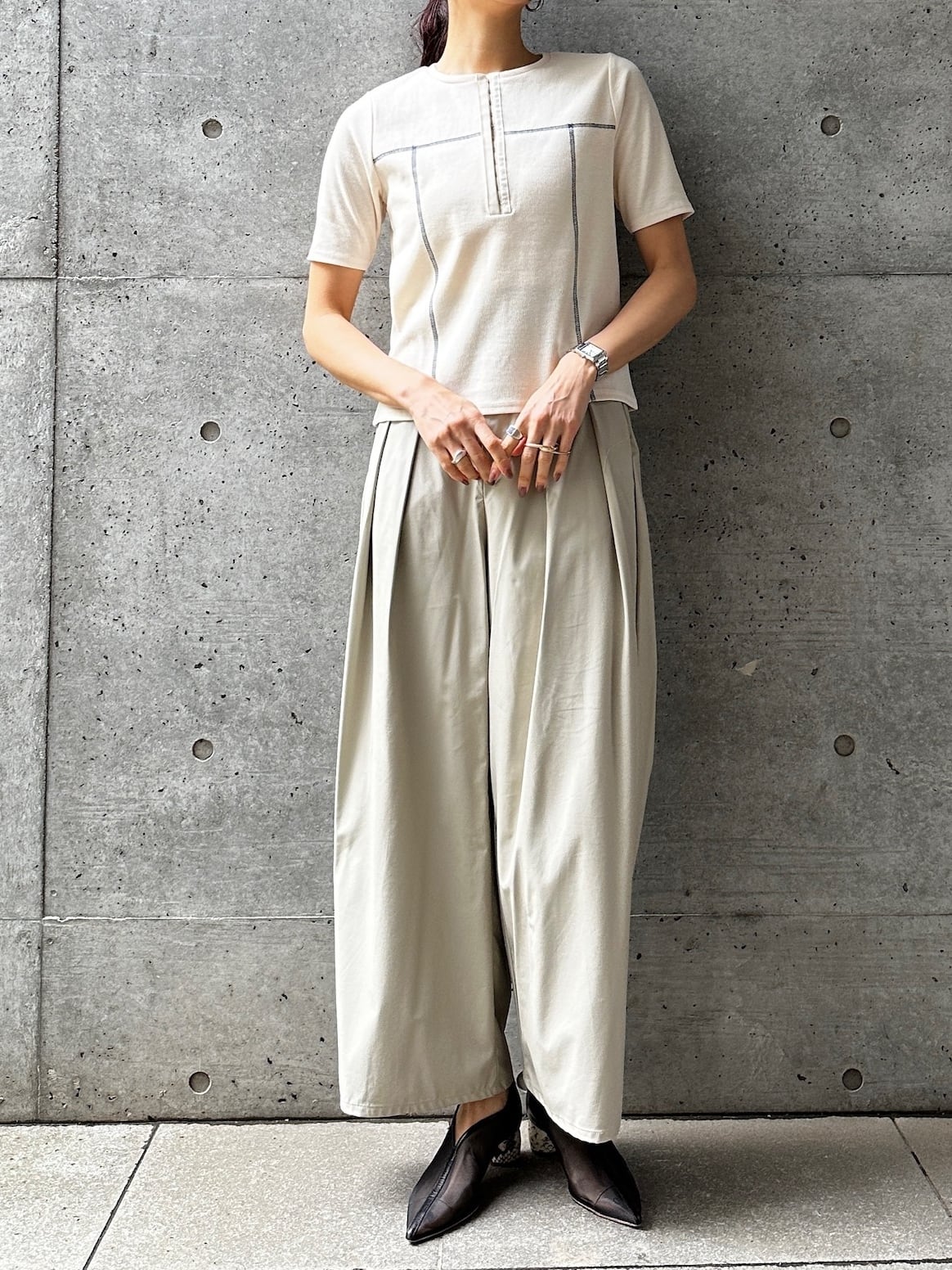 コンパクトなトップスは、ややゆとりのあるボトムと合わせてバランスを取るのがポイント。ワイドパンツやラフな素材感のアイテムと合わせることで、こなれ感のあるスタイルに仕上がります。