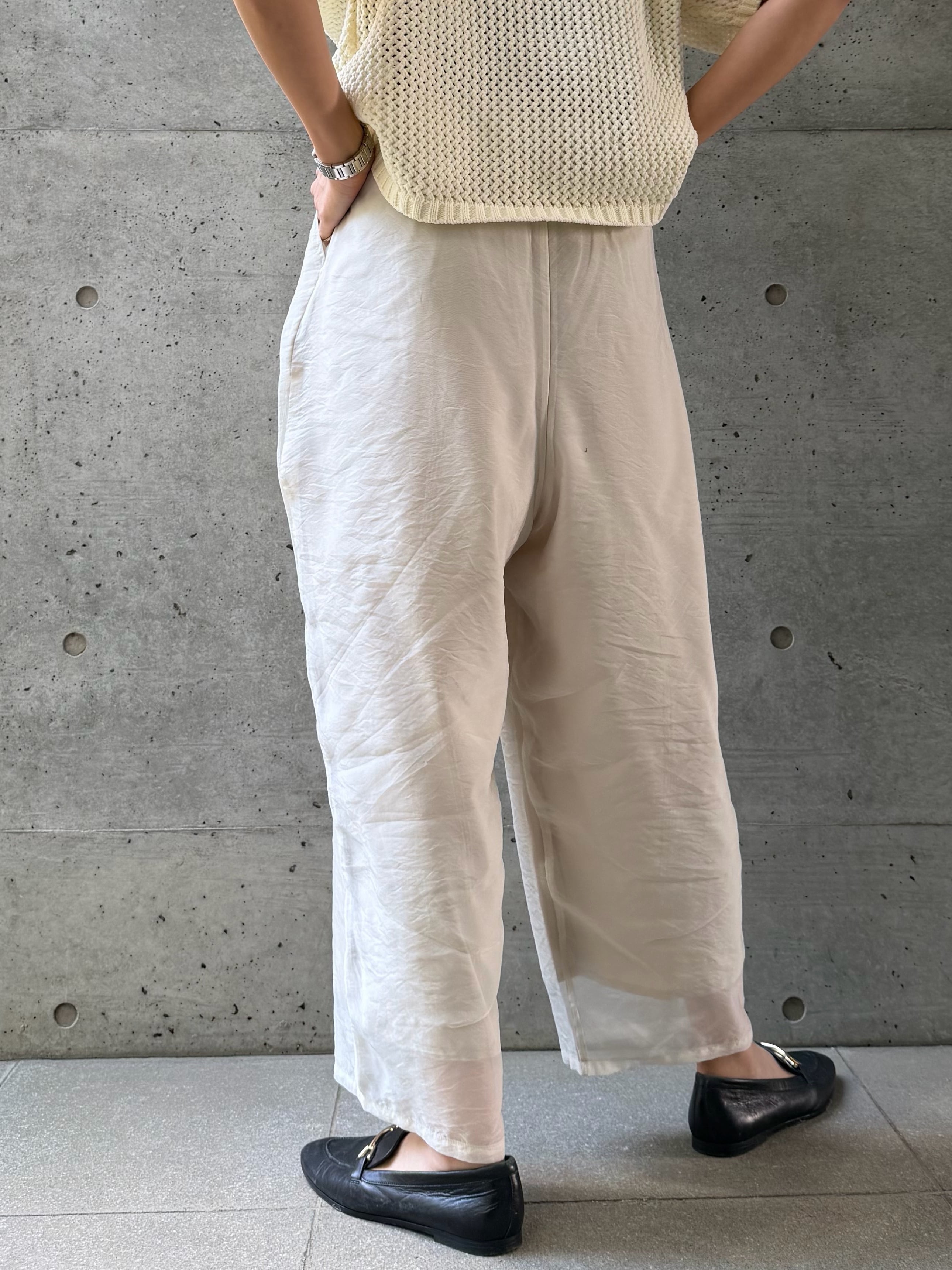 トップスはシンプルにまとめるのがおすすめ。コンパクトなリブニットやタンクトップを合わせることで、パンツの立体的なシルエットと素材感が引き立ち、バランスの良いスタイリングに仕上がります。シャツやジャケットを羽織れば、きちんと感のあるモードな印象に。裾の透け感が重たさを軽減してくれるため、ワントーンコーデでも抜け感のある着こなしが完成します。足元は華奢なサンダルで女性らしくまとめるのはもちろん、スニーカーでカジュアルダウンするのもおすすめです。