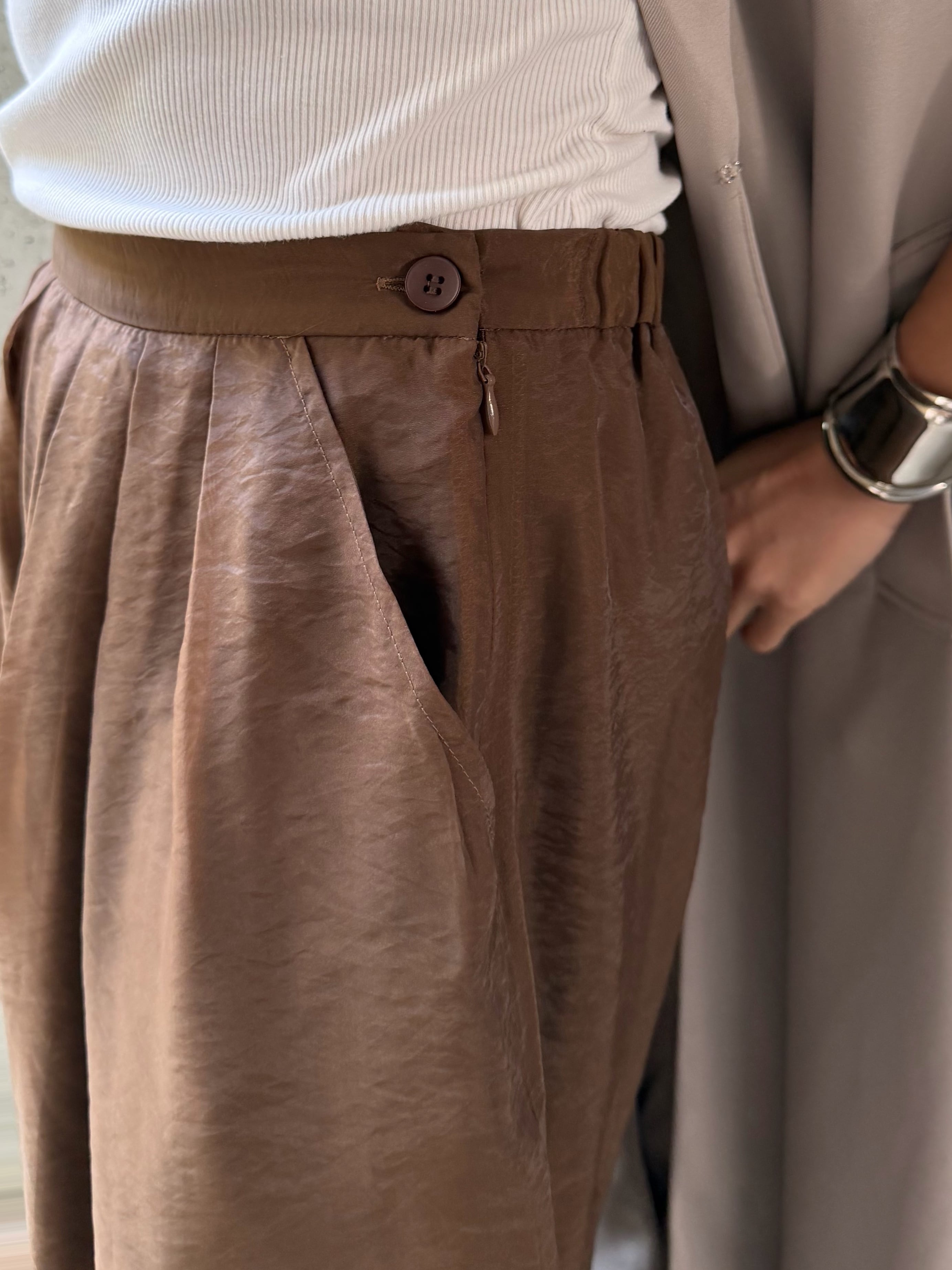 ゆったりとしたシルエットを活かし、オーバーサイズのシャツやラフなトップスと合わせた抜け感のあるスタイリングが◎。素材のコントラストを楽しみながら、リラックス感のある着こなしに仕上げると雰囲気よくまとまります。