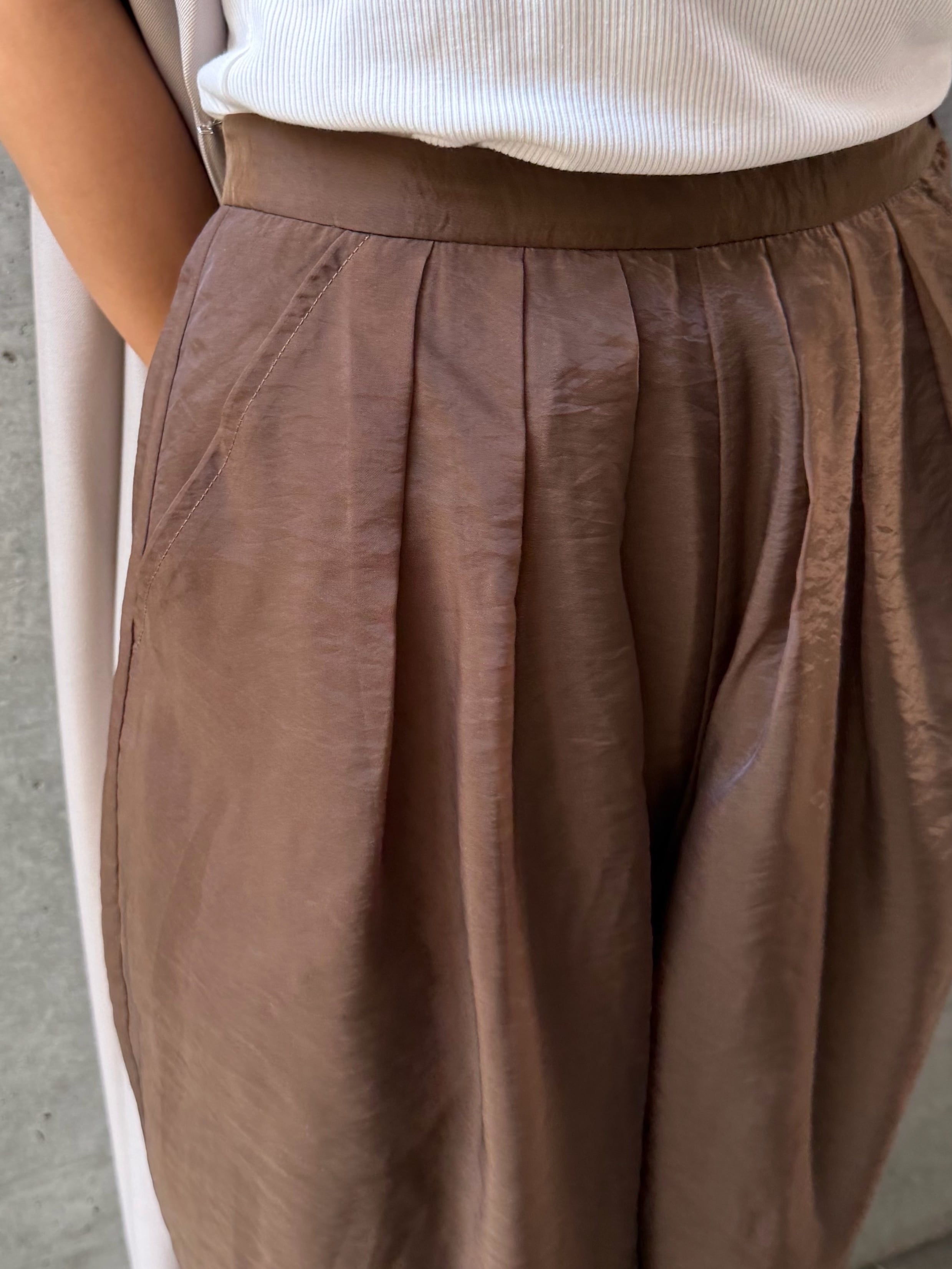 軽やかなシアーオーガンジーをレイヤードした、存在感のあるワイドパンツ。裾にかけてほんのり透けるデザインが、動くたびに抜け感と女性らしさを演出します。シルエットは今季注目のバレルレッグ。丸みのあるフォルムがこなれた印象を与えつつ、気になるラインを拾いにくいのも嬉しいポイントです。腰回りにはツータックを施し、立体感のある美しいシルエットに。程よいゆとりが生まれることで、ウエスト周りをすっきりと見せながら快適な着用感を叶えます。サイドファスナー仕様ですっきりとした見た目に仕上げつつ、後ろはゴム仕様でリラックス感もプラス。きちんと感と穿き心地を両立した一着です。