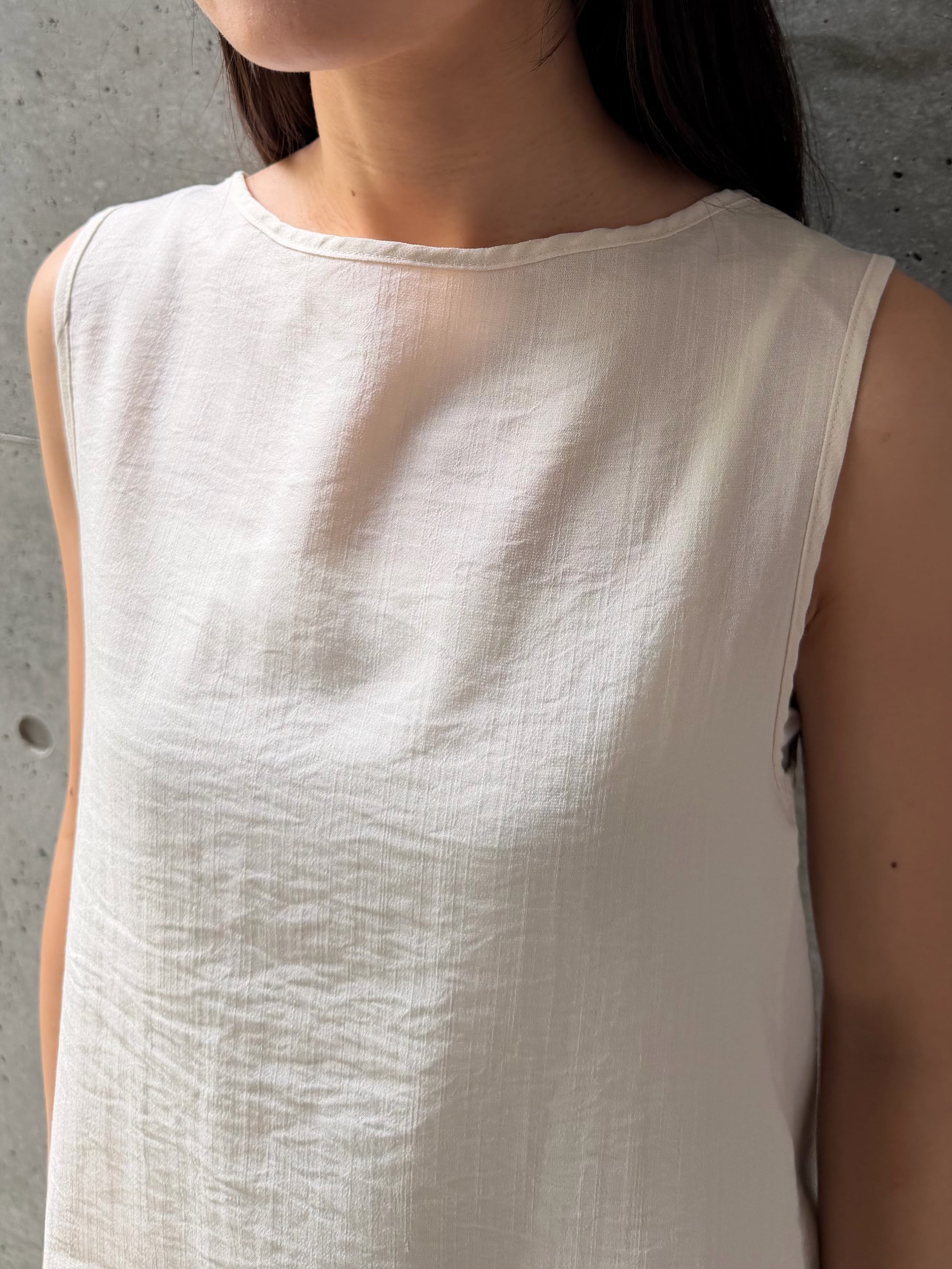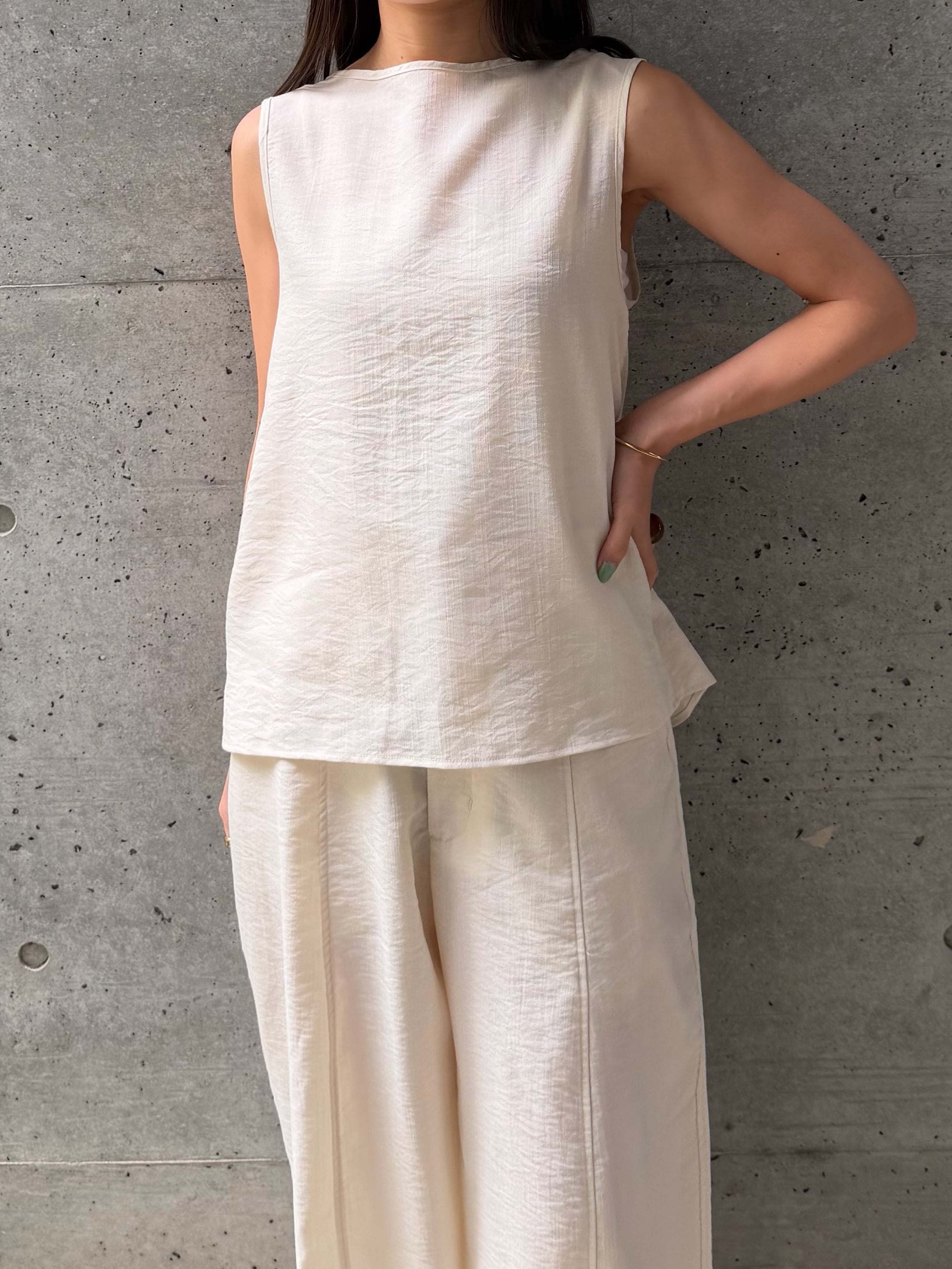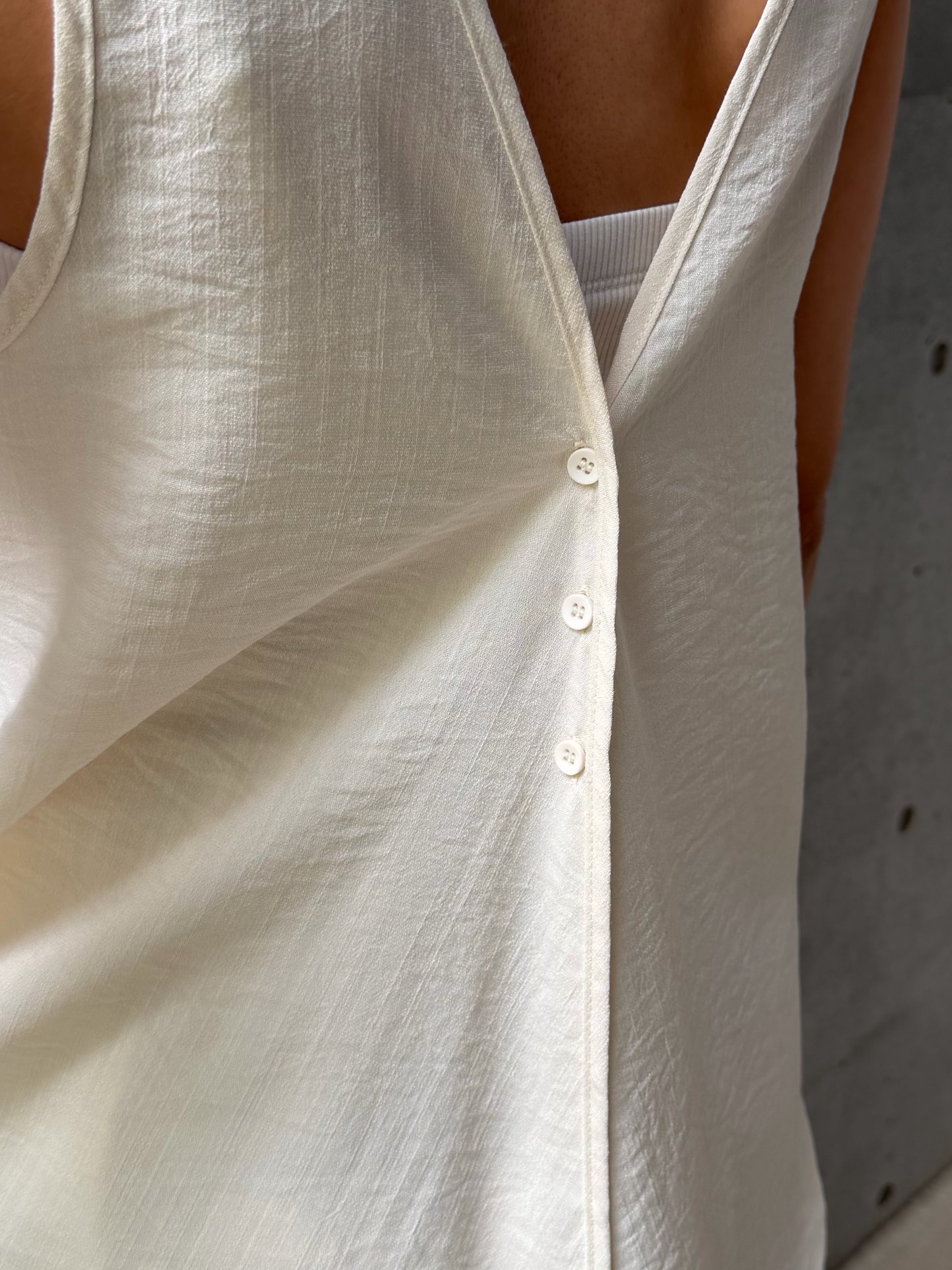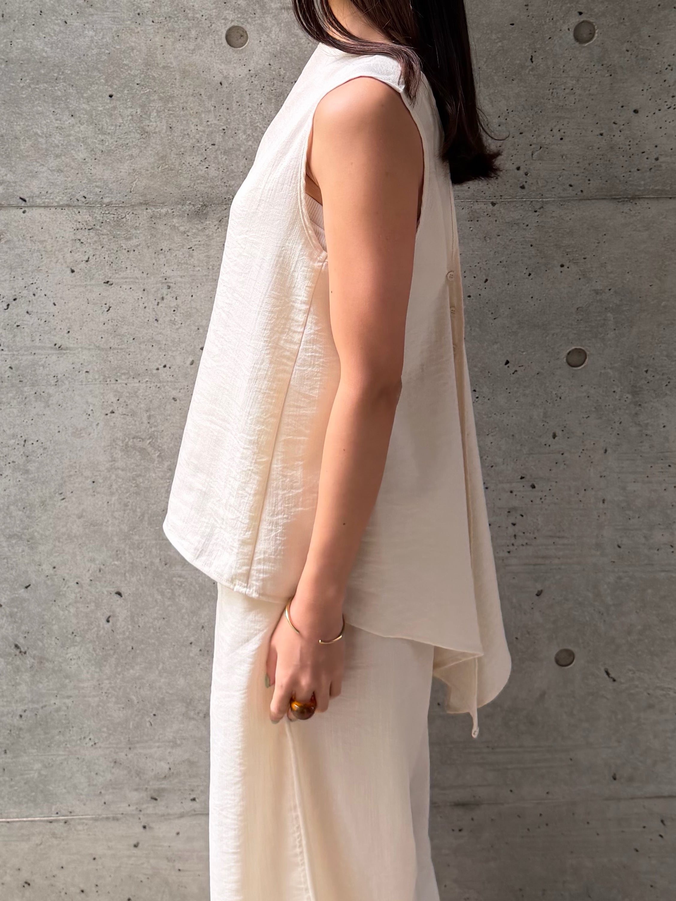 前後2WAYで着こなしを楽しめる、着回し力抜群のノースリーブトップス。フロントはシンプルでミニマルな印象、バックスタイルは深めのVデザインと揺れ感のあるイレギュラーヘムで、さりげない抜け感を演出してくれます。前後を逆にして着用すると、ボタンデザインがアクセントになったロングジレ風の着こなしも可能。気分やスタイリングに合わせて印象を変えられる、マルチWAY仕様が魅力です。程よく落ち感のある素材を使用し、身体のラインを拾いすぎず、涼しげで軽やかな着心地に。同素材のパンツと合わせたセットアップスタイルはもちろん、デニムやスラックスと合わせた単品使いもおすすめです。
